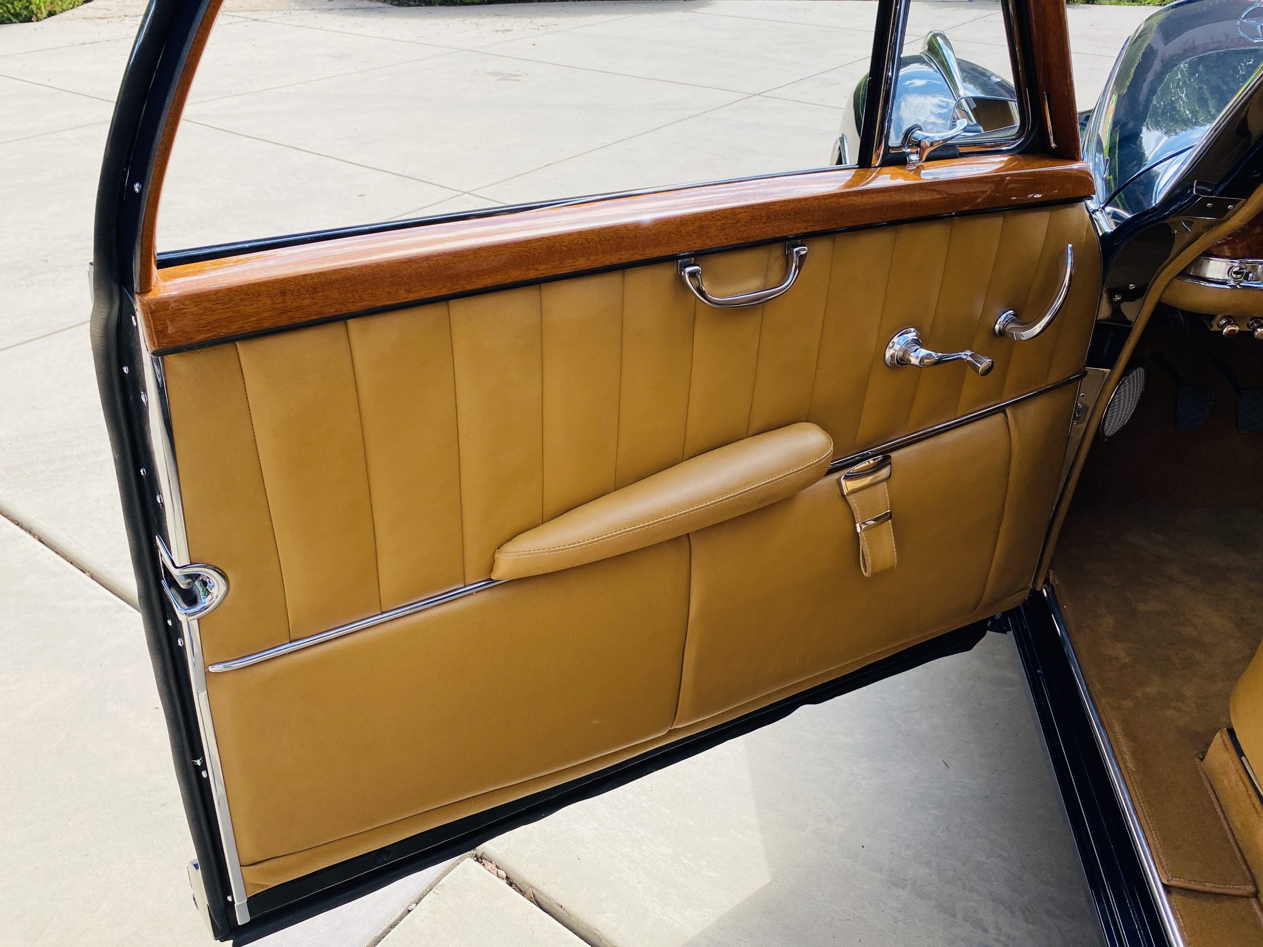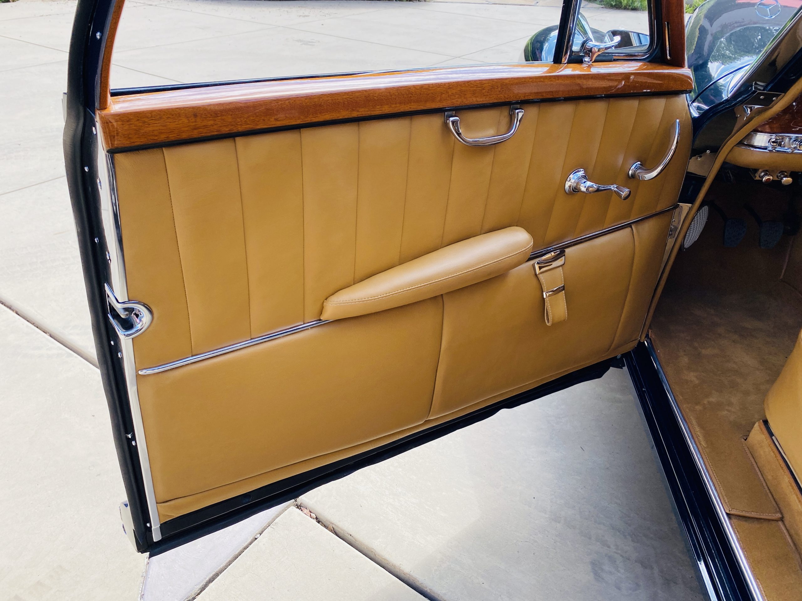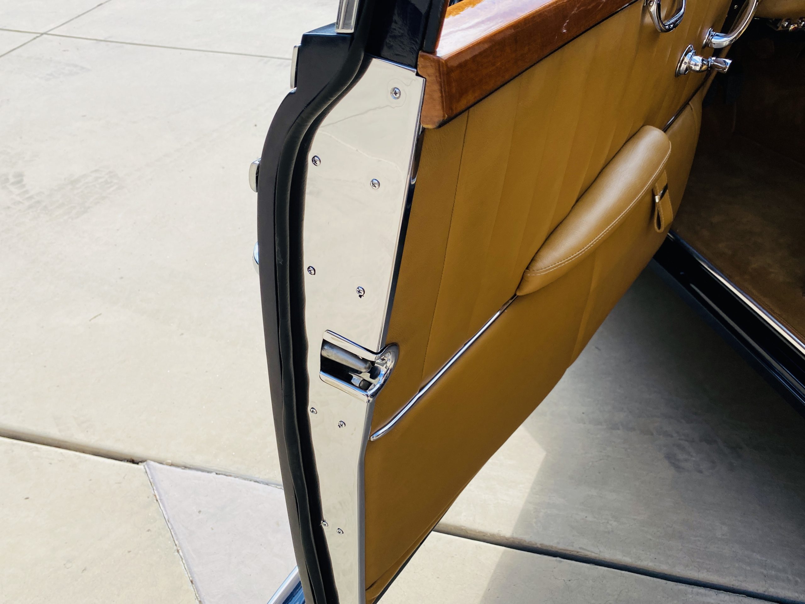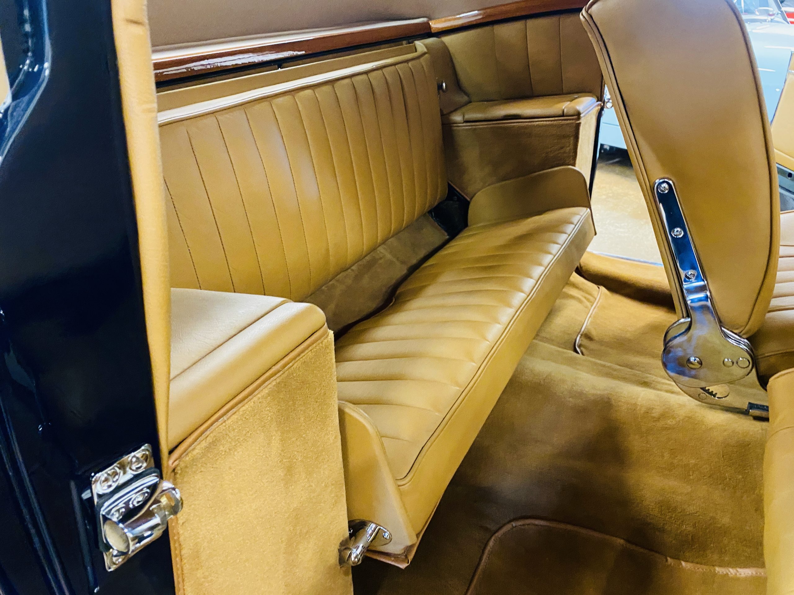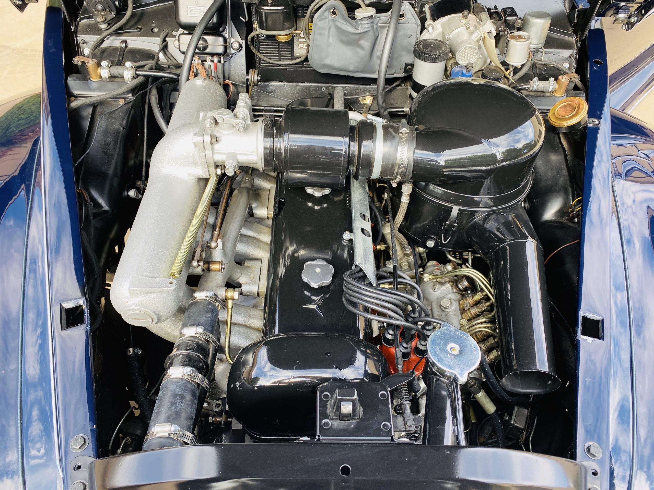 The vehicle offered here is a beautiful example that has been subject to a complete no-expense spared restoration. The livery is finished in a deep dark blue and the body retains all the original chrome work, which was individually made to fit each car. Inside, the deep tan leather is matched with original handles and fittings capped off with the carefully restored walnut dashboard. The rear compartment includes a purpose-built stowage compartment, and the spare wheel and tools are in excellent condition. The tan leather luggage is in the trunk and really sets the motorcar apart as the ultimate touring machine.