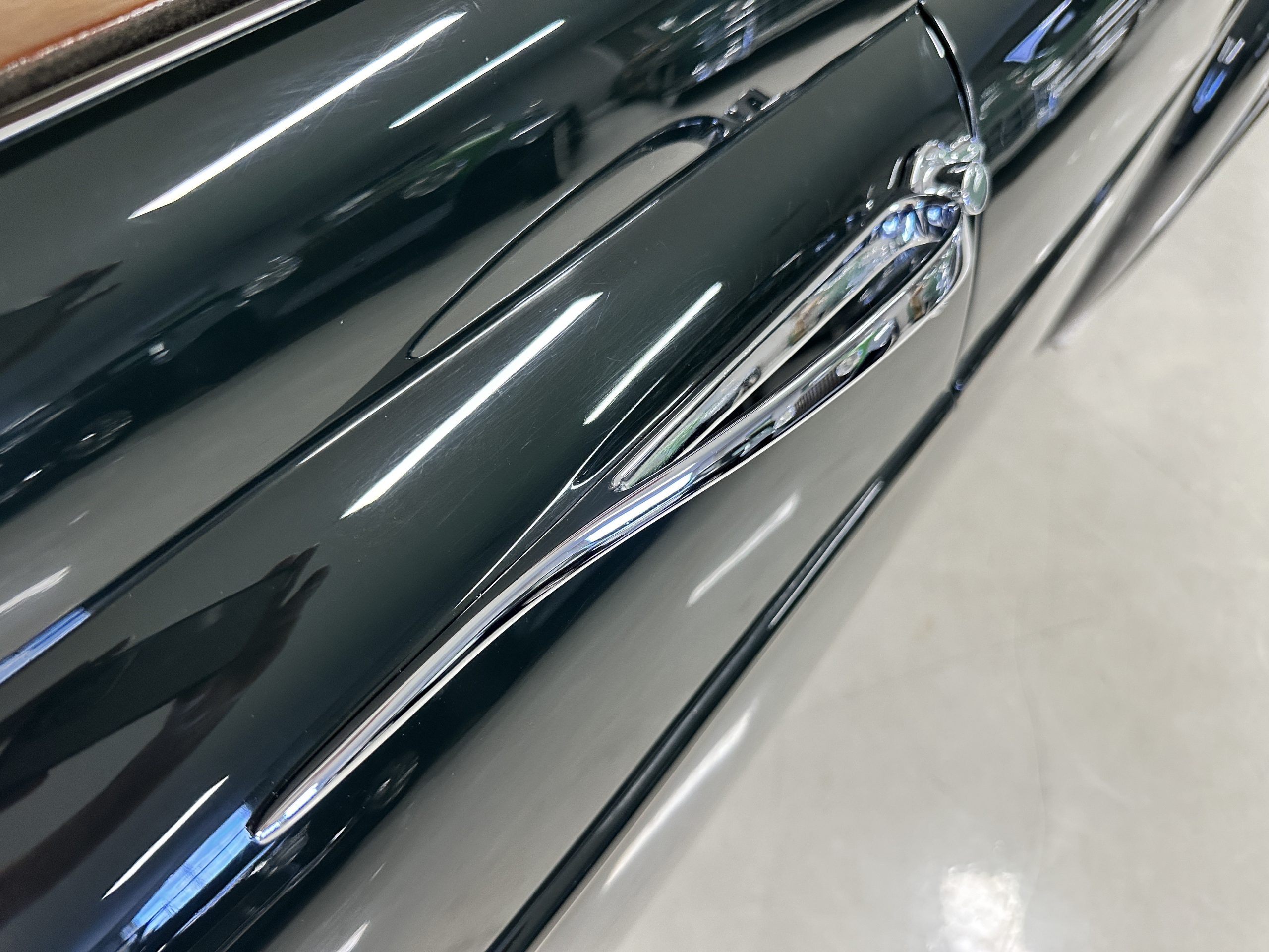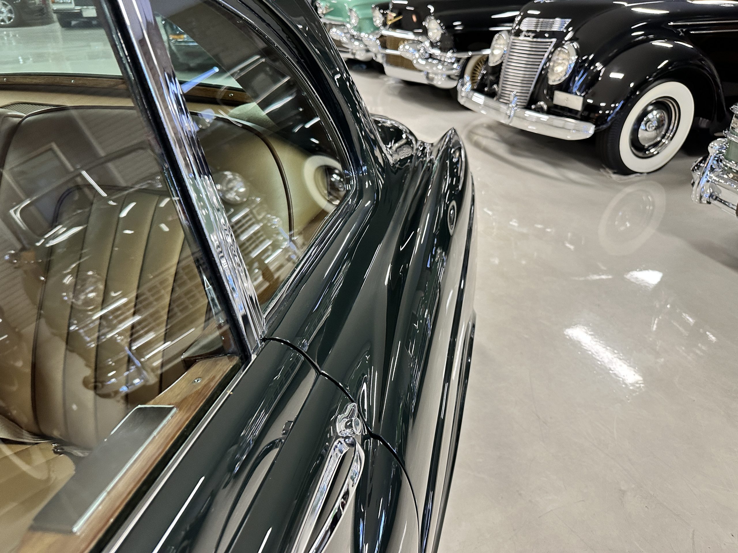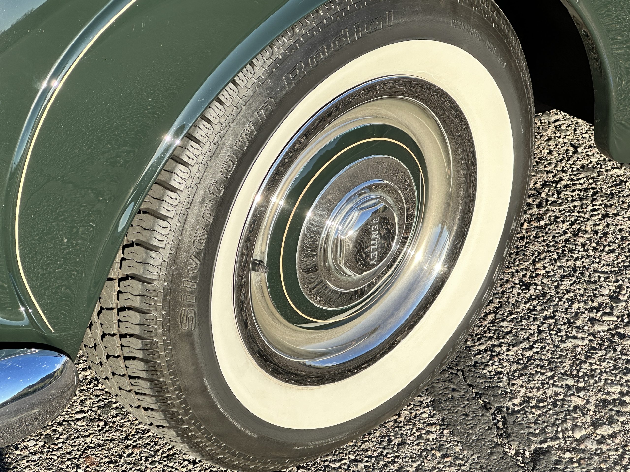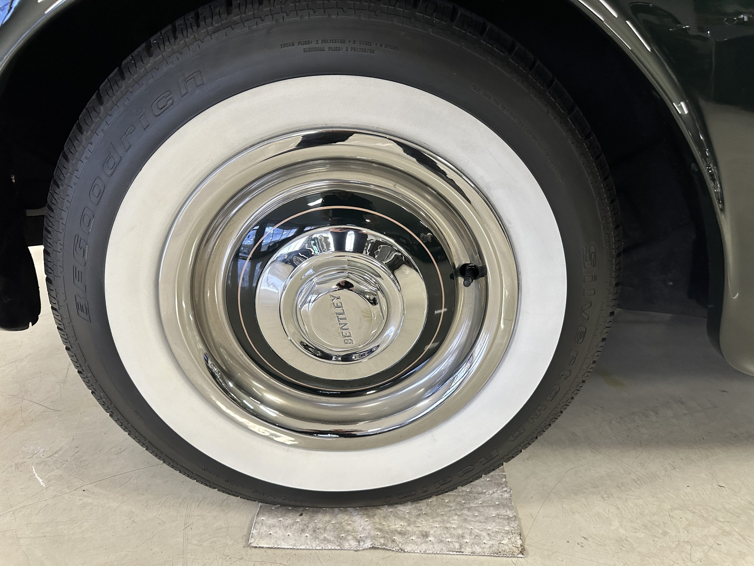 The Continental is featured in a gorgeous Velvet Green, which appears nearly black unless it is in the sunlight. It is a deep and rich dark green that is in wonderful condition today with excellent shine and luster. The chrome and stainless-steel trim are also in excellent condition. The wide white walled radials look terrific and compliment the darker livery well. Overall, the exterior is in concours quality condition.