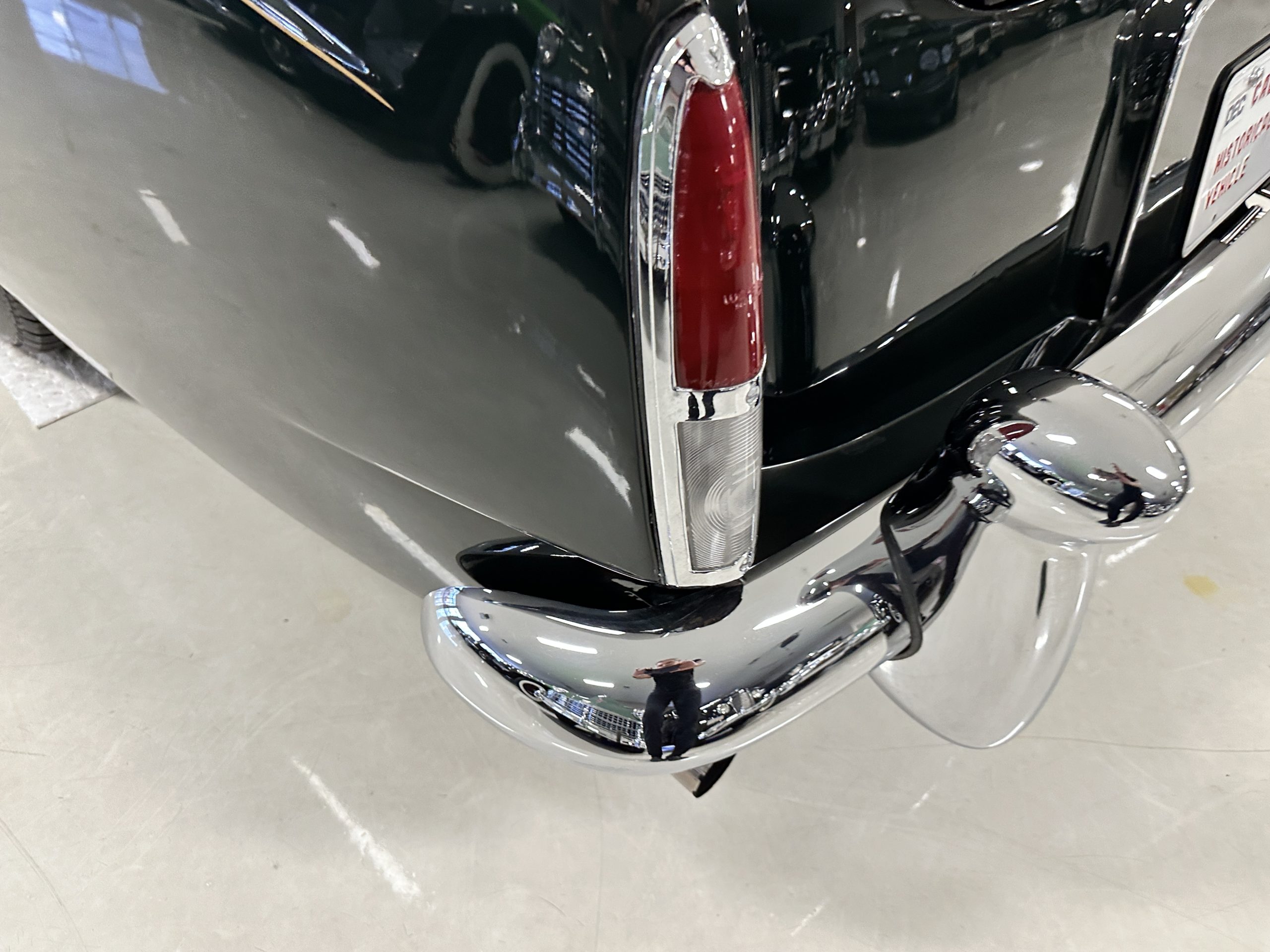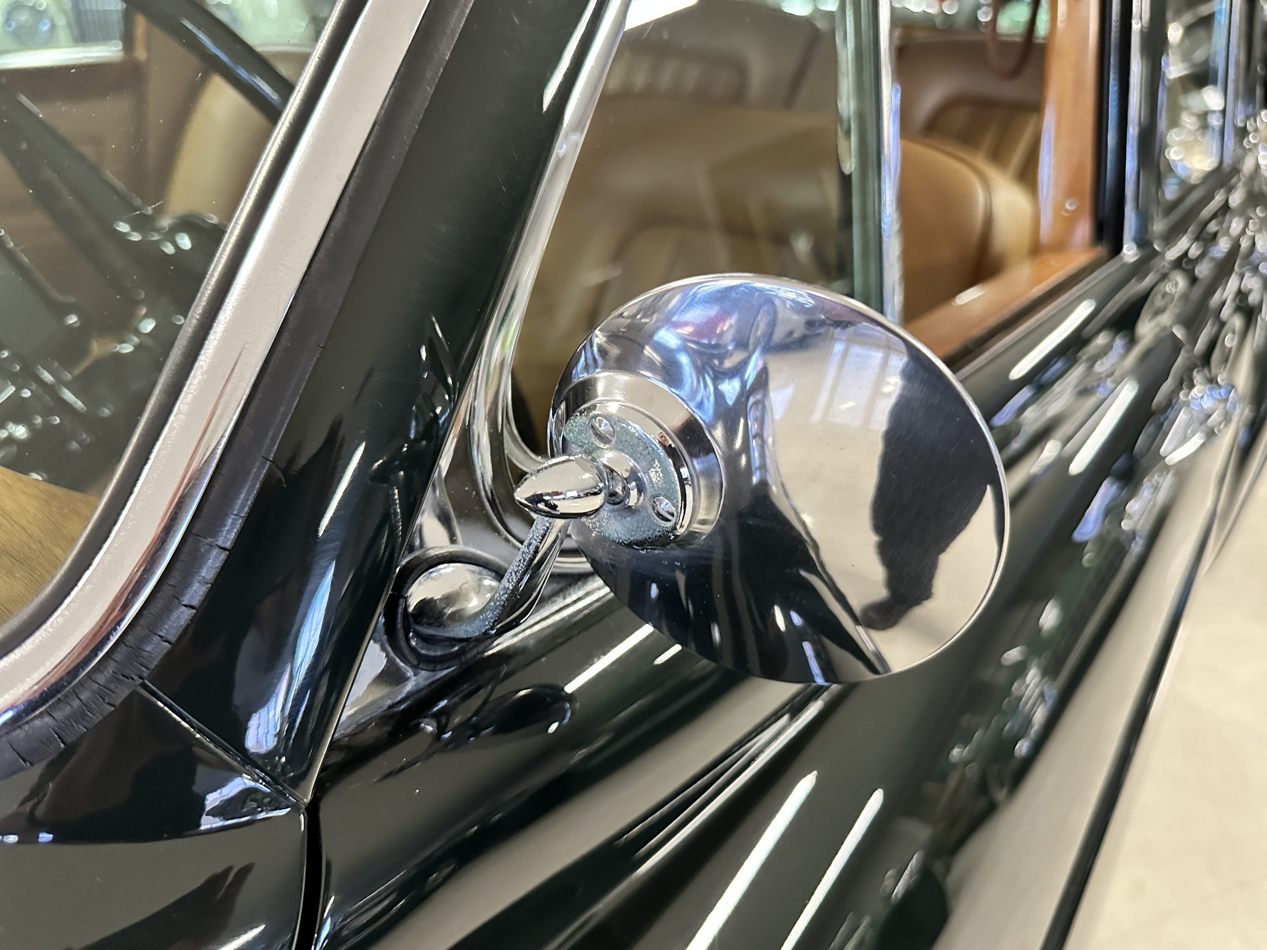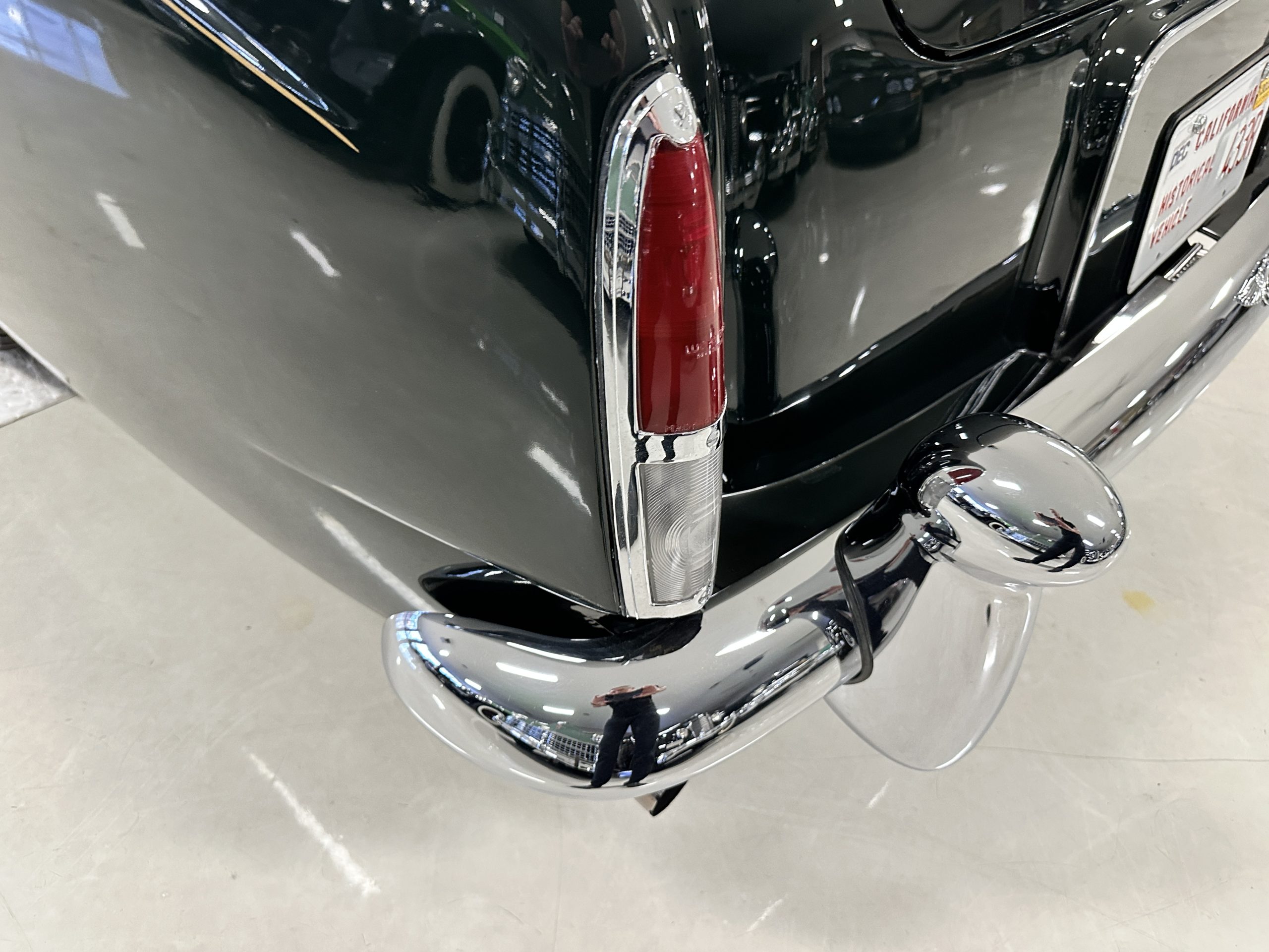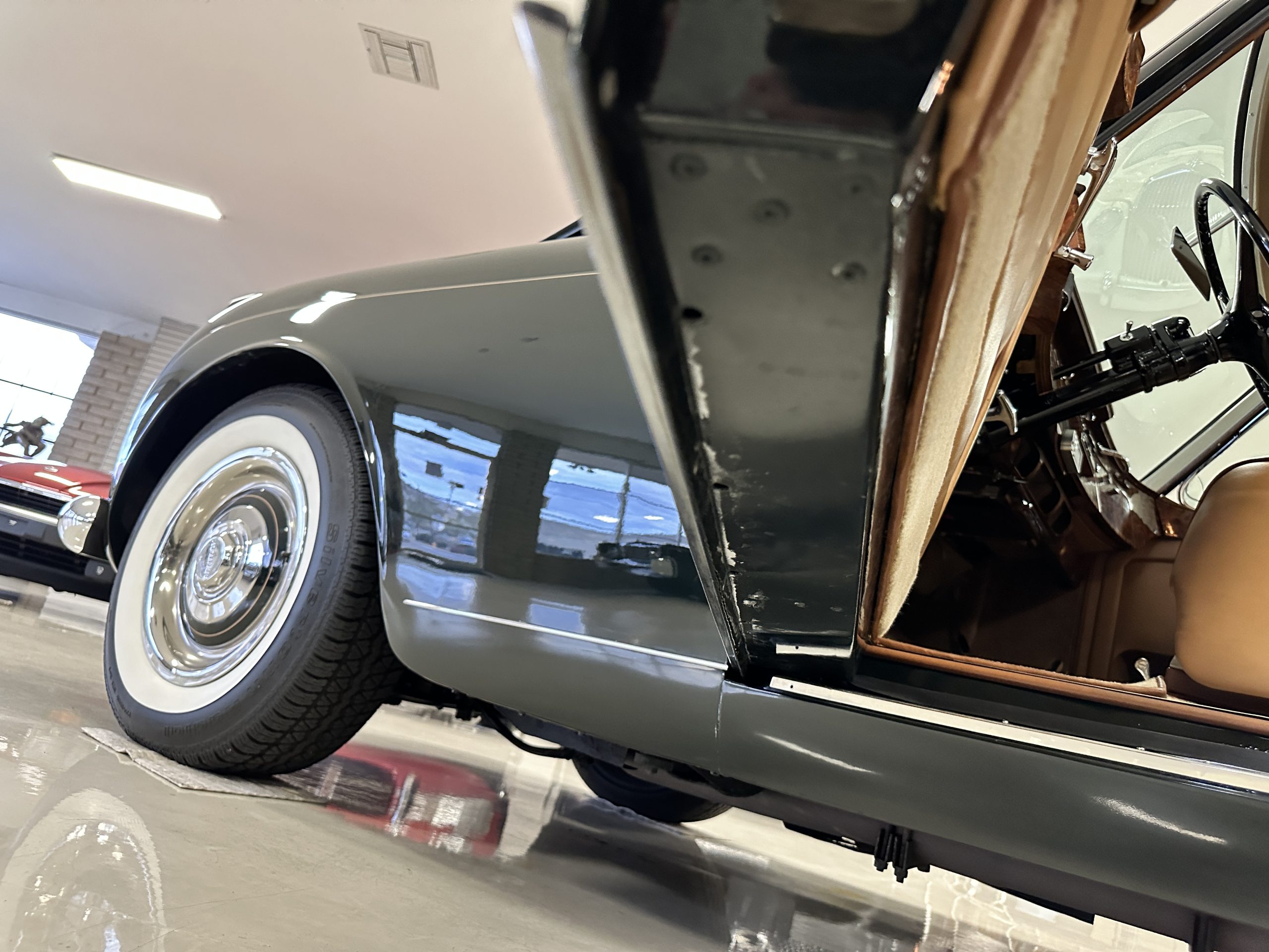 The Continental is featured in a gorgeous Velvet Green, which appears nearly black unless it is in the sunlight. It is a deep and rich dark green that is in wonderful condition today with excellent shine and luster. The chrome and stainless-steel trim are also in excellent condition. The wide white walled radials look terrific and compliment the darker livery well. Overall, the exterior is in concours quality condition.