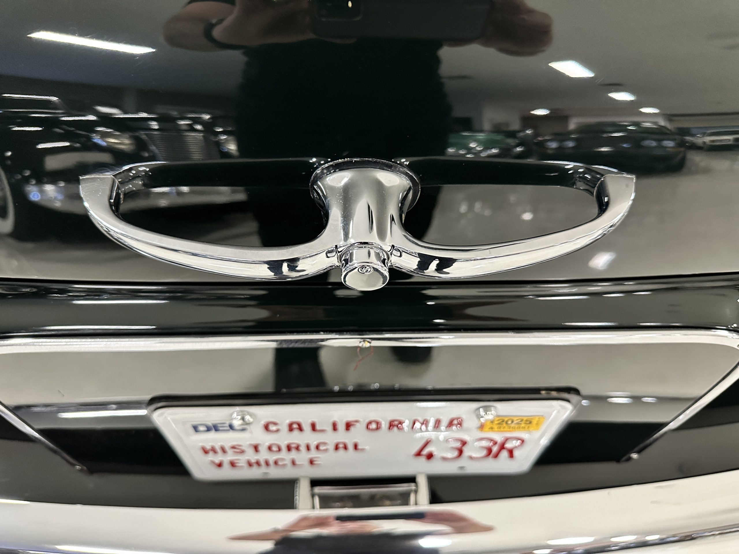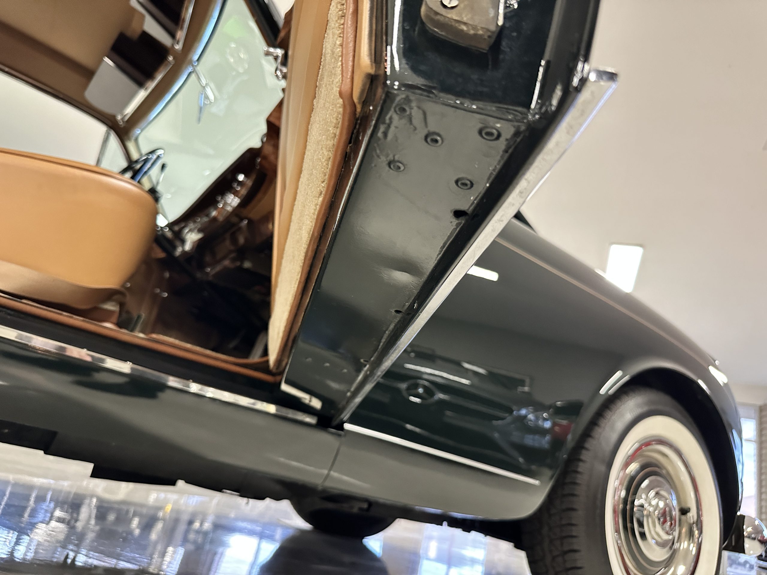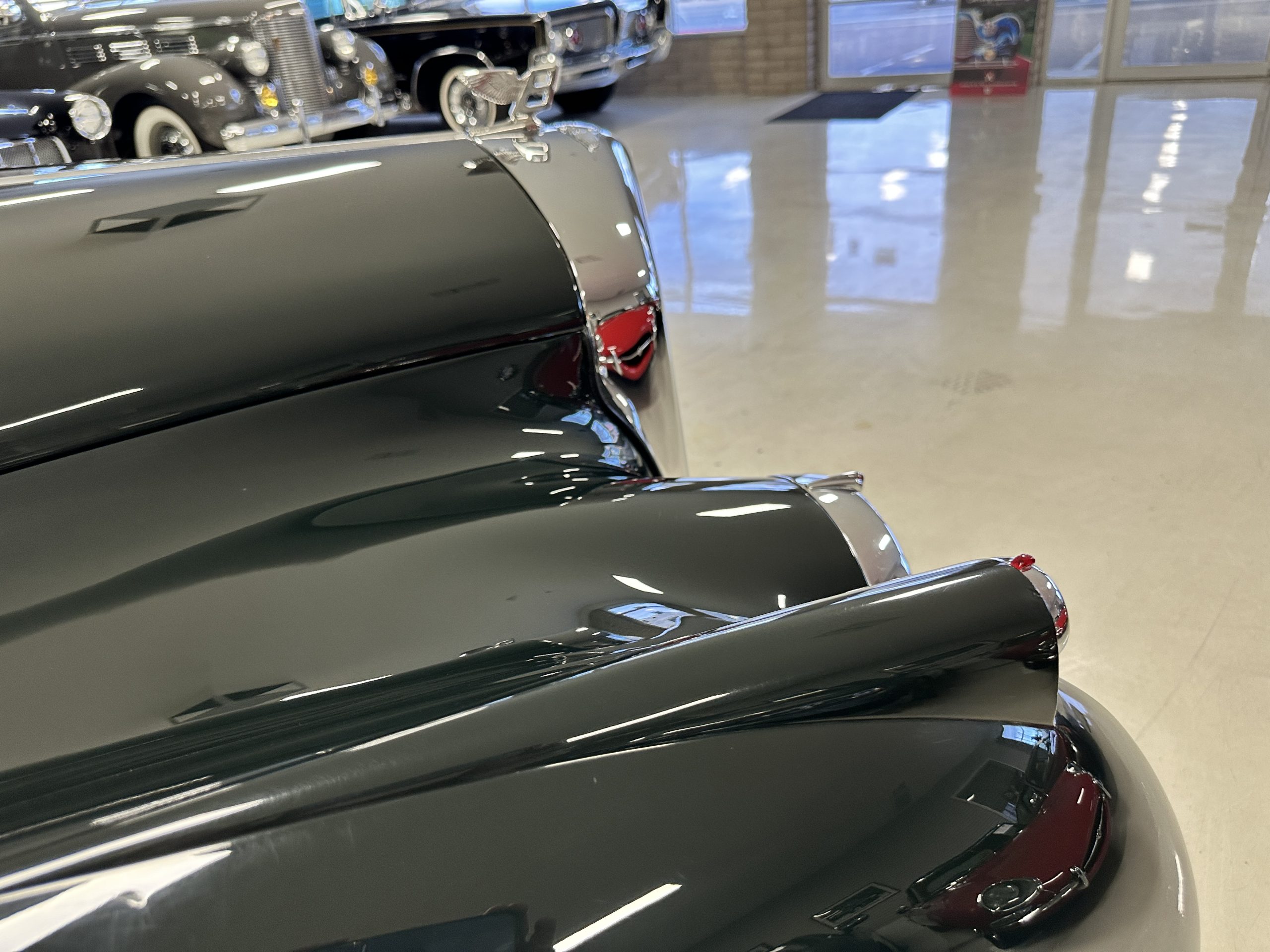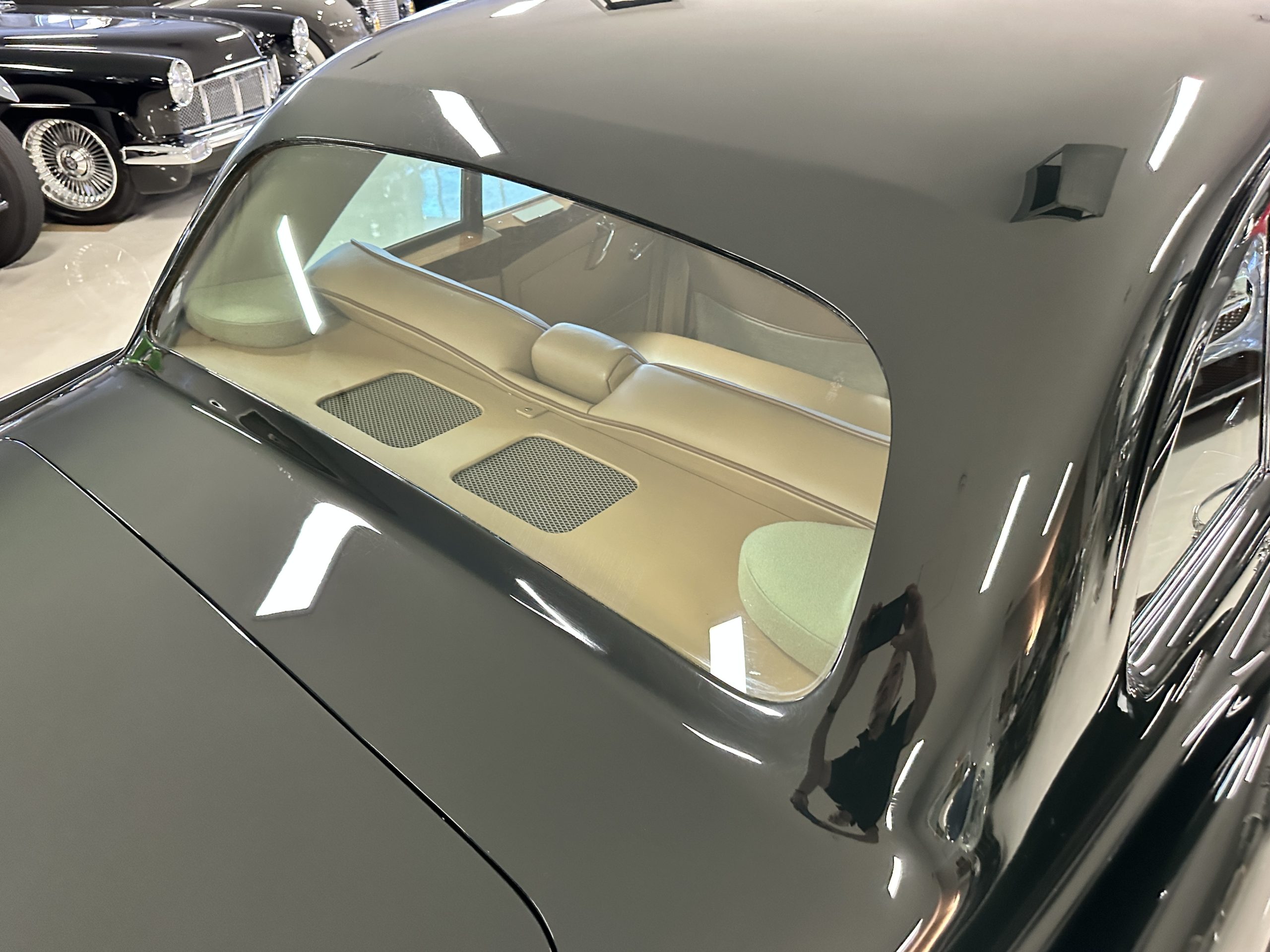 The Continental is featured in a gorgeous Velvet Green, which appears nearly black unless it is in the sunlight. It is a deep and rich dark green that is in wonderful condition today with excellent shine and luster. The chrome and stainless-steel trim are also in excellent condition. The wide white walled radials look terrific and compliment the darker livery well. Overall, the exterior is in concours quality condition.