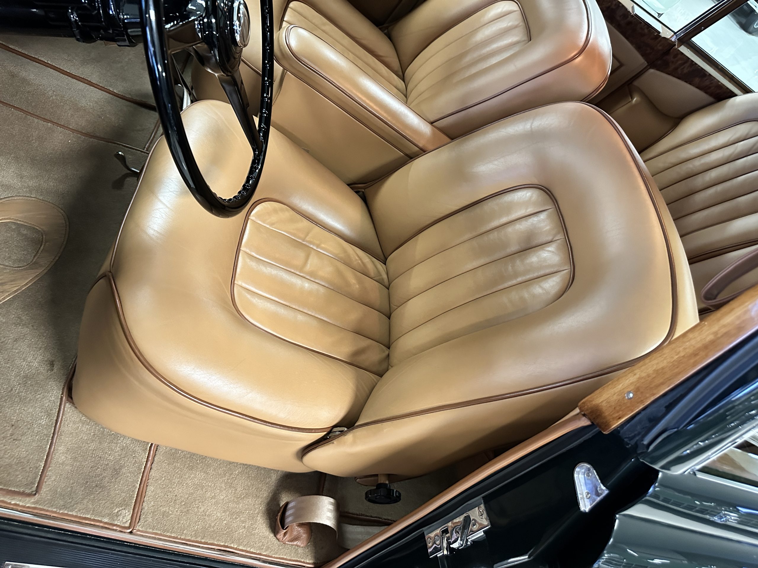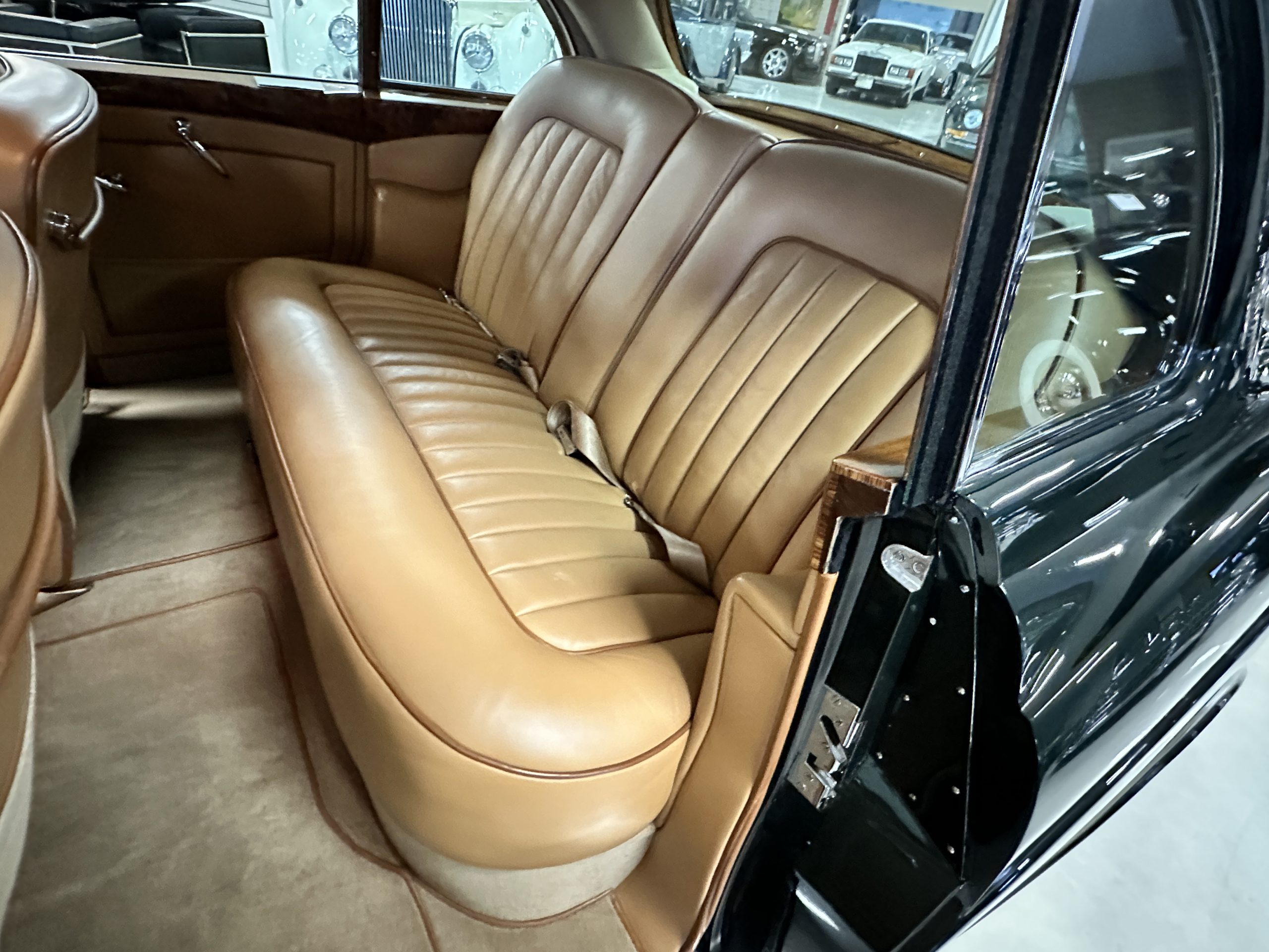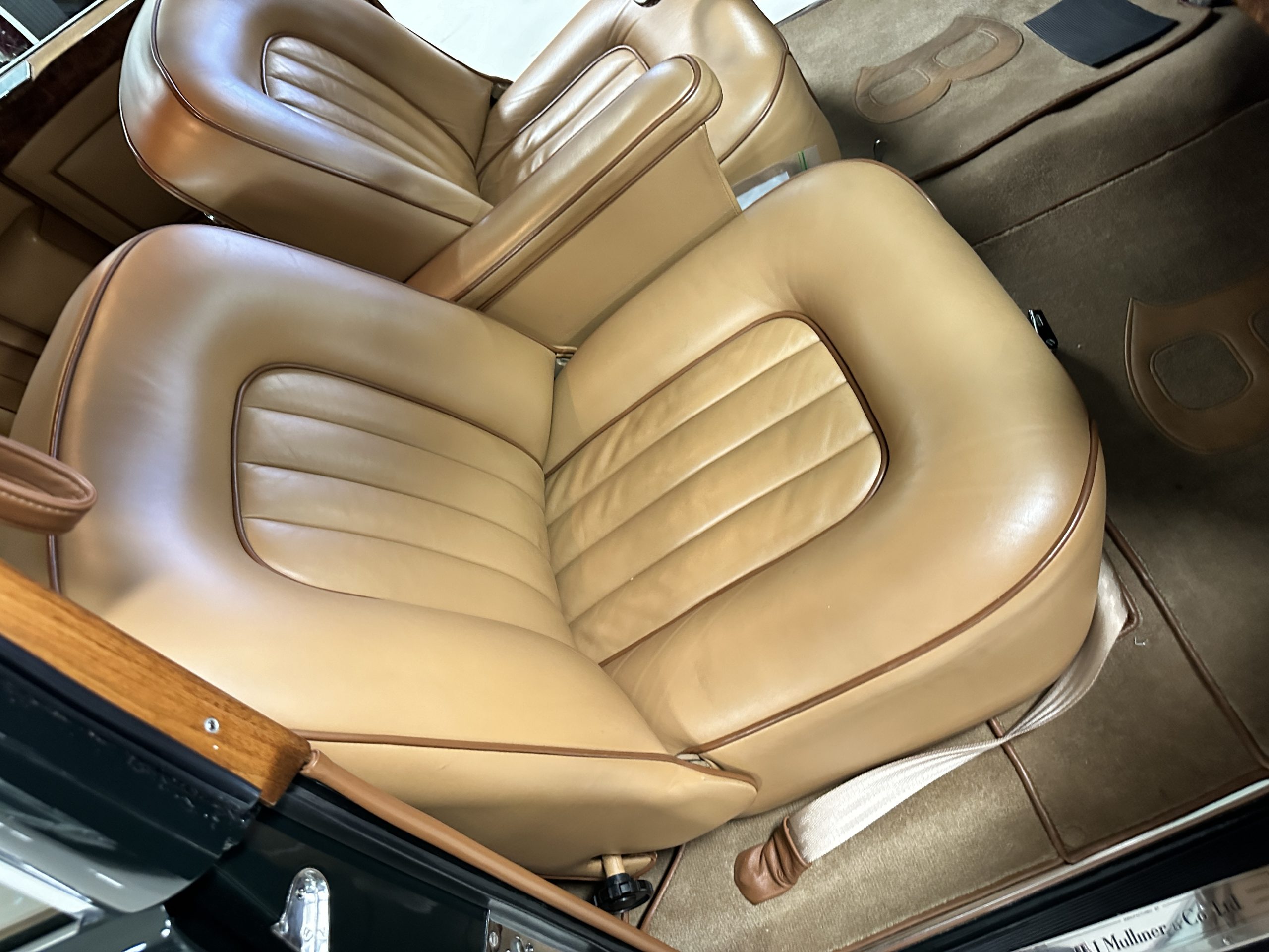 The interior is a deep and luscious Biscuit Tan Leather with Dark Green piping. The leather is very soft and supple and in excellent condition overall. The Tan Wilton wool carpeting is also in very nice condition and benefits from Bentley logo overlays for daily use. The H.J. Mulliner burl walnut veneer is spectacular. The Flying Spurs are well known for the gorgeous woodwork. It surrounds the passenger compartment and is truly stunning. The Bentley has benefitted from updated stereo systems and added seat belts.