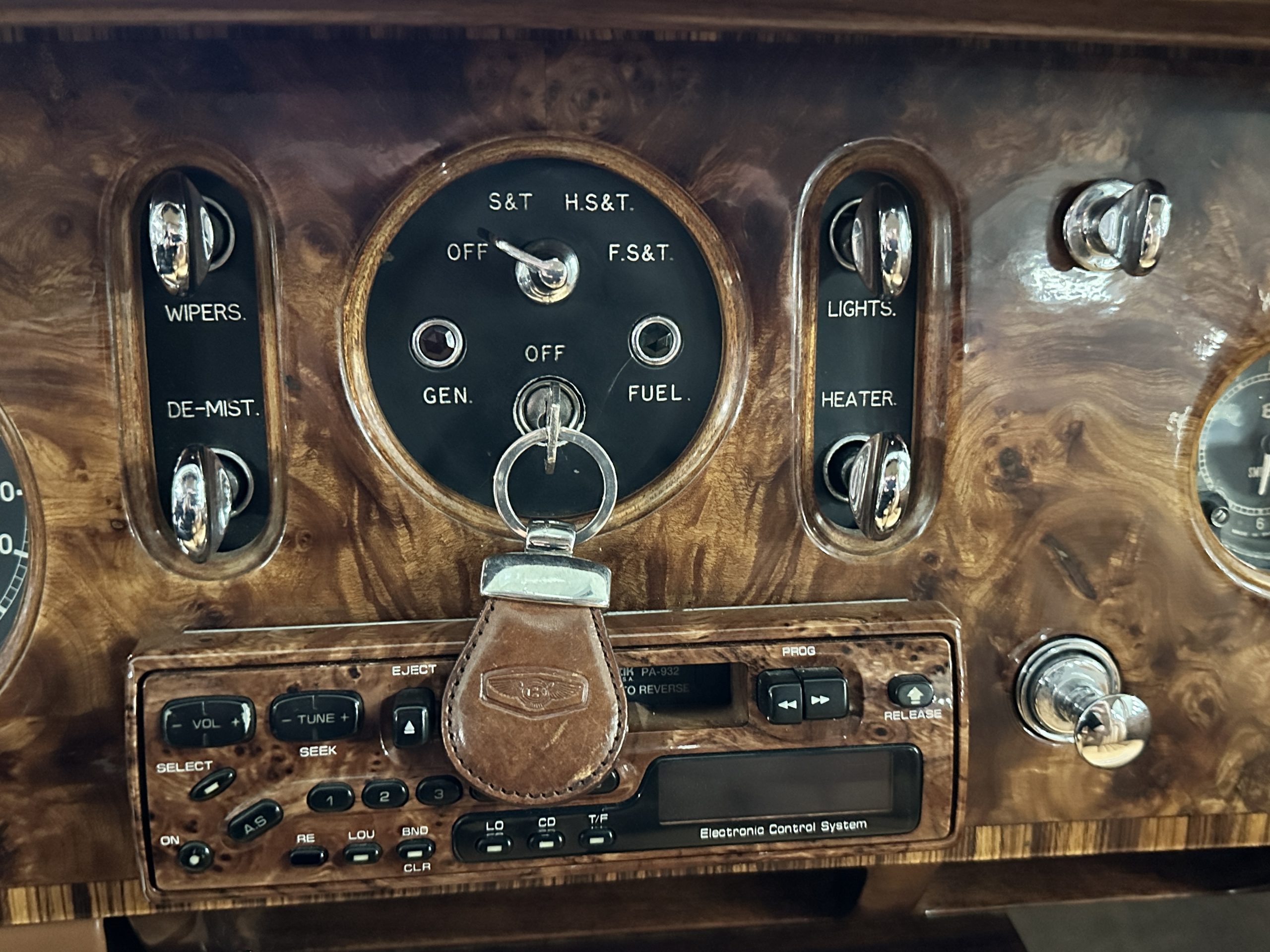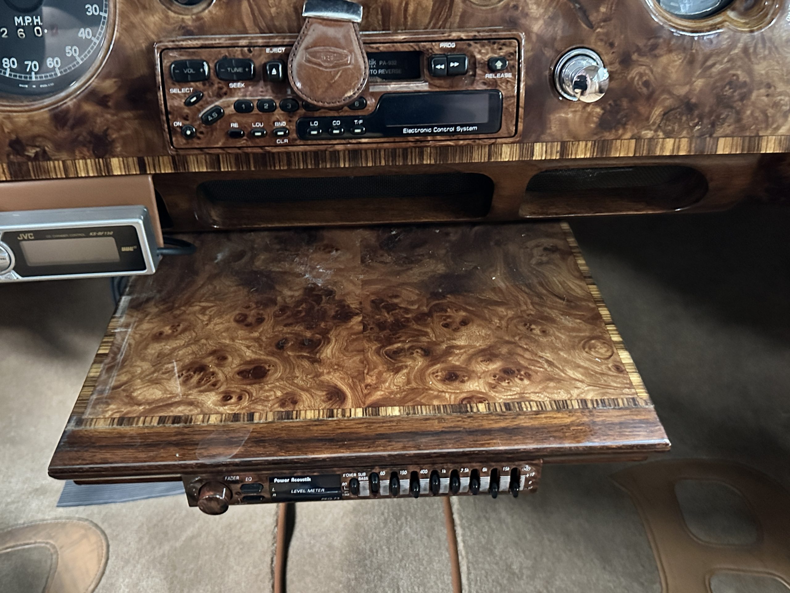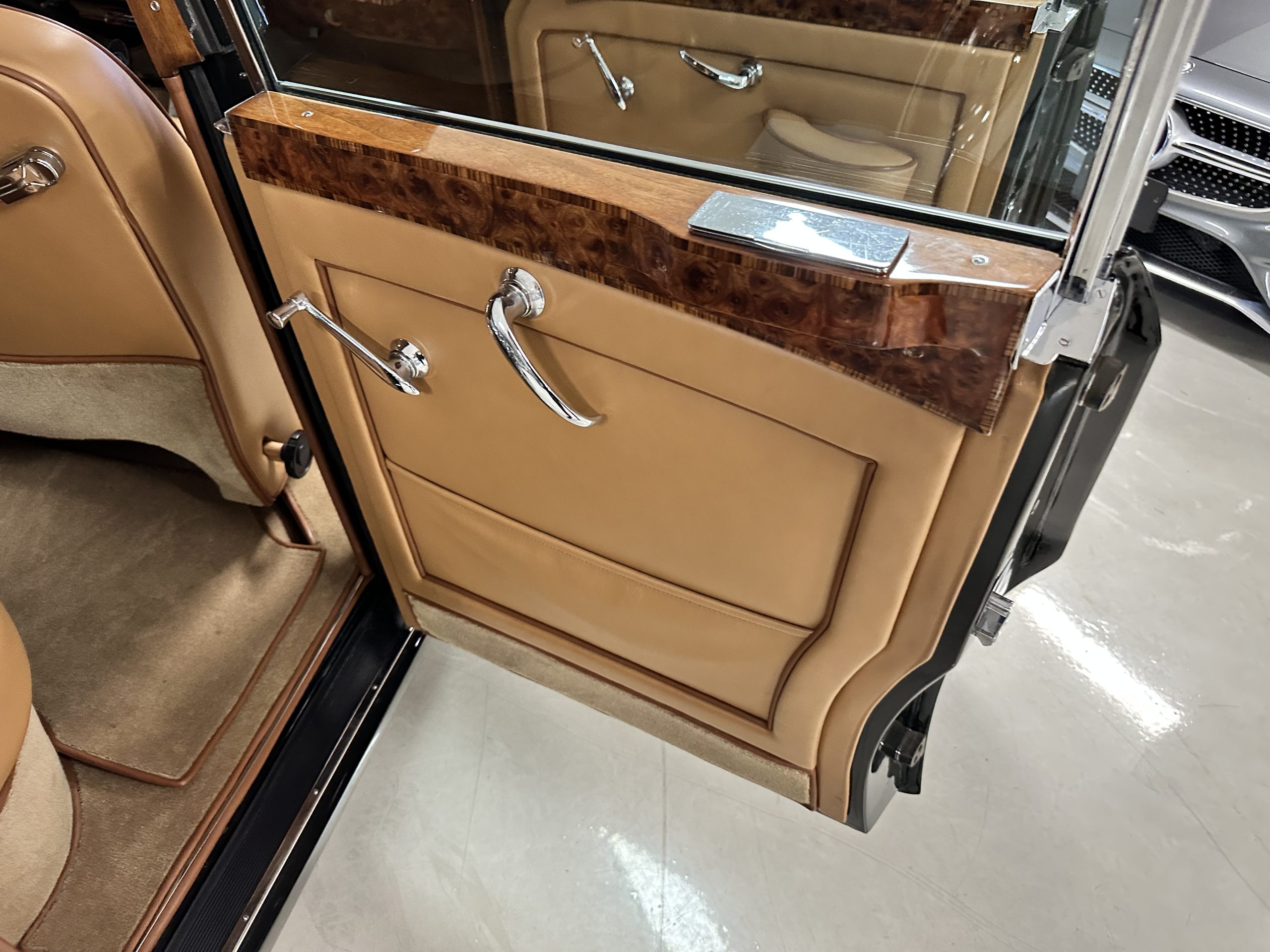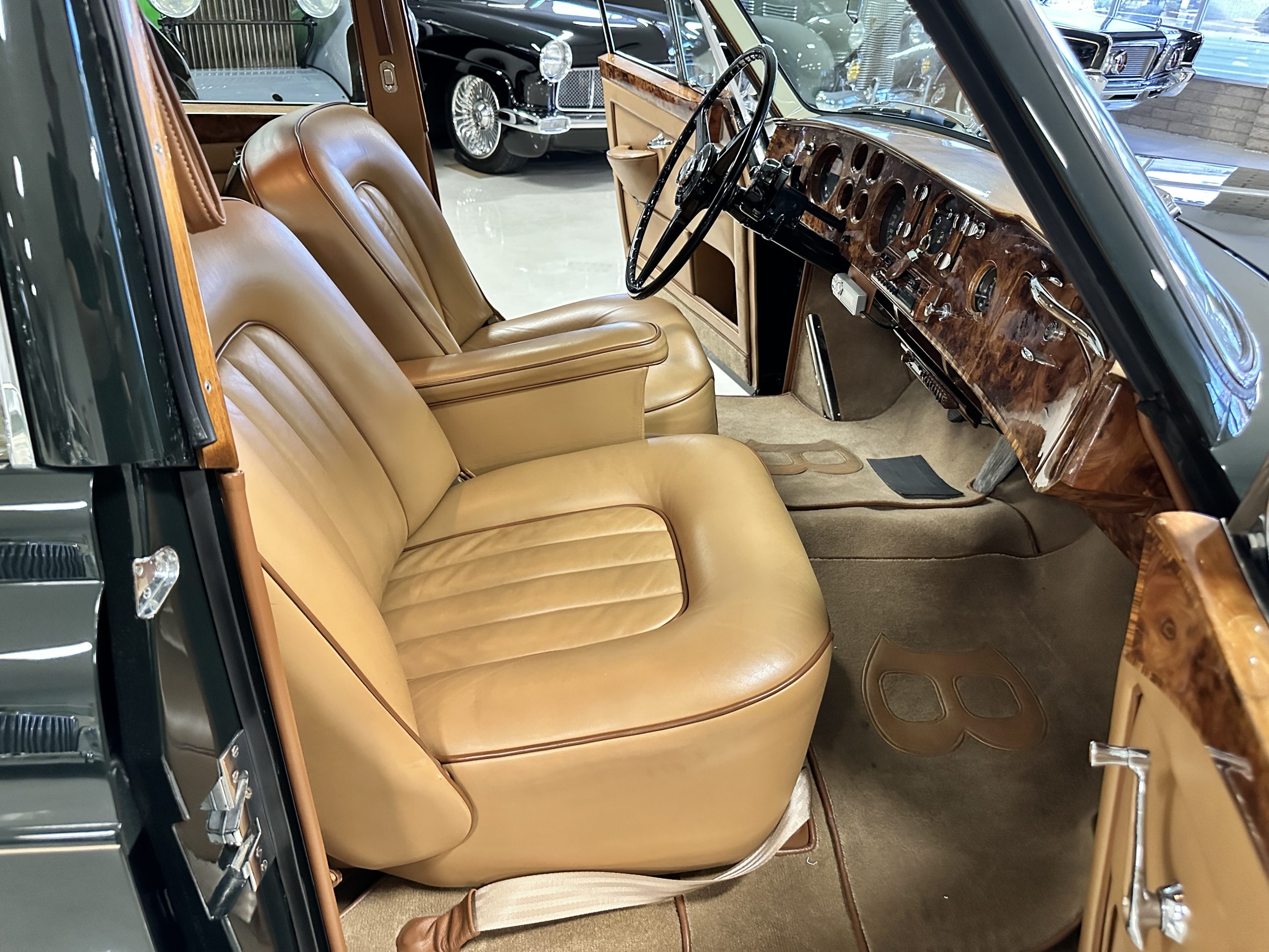 The interior is a deep and luscious Biscuit Tan Leather with Dark Green piping. The leather is very soft and supple and in excellent condition overall. The Tan Wilton wool carpeting is also in very nice condition and benefits from Bentley logo overlays for daily use. The H.J. Mulliner burl walnut veneer is spectacular. The Flying Spurs are well known for the gorgeous woodwork. It surrounds the passenger compartment and is truly stunning. The Bentley has benefitted from updated stereo systems and added seat belts.