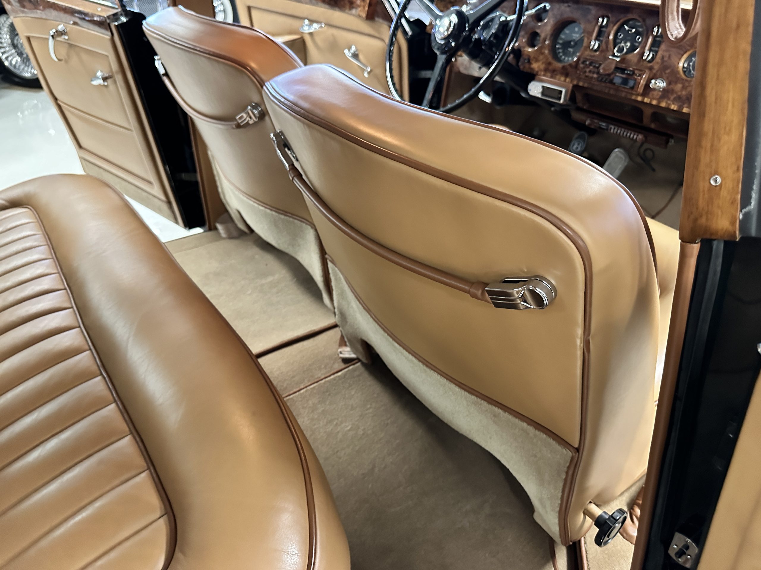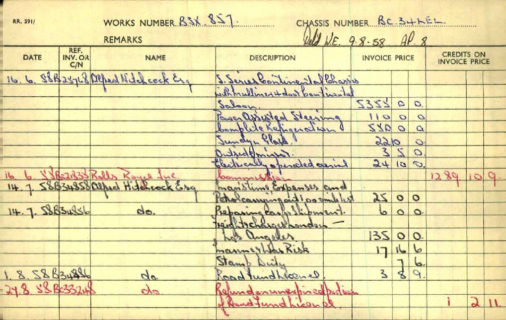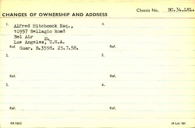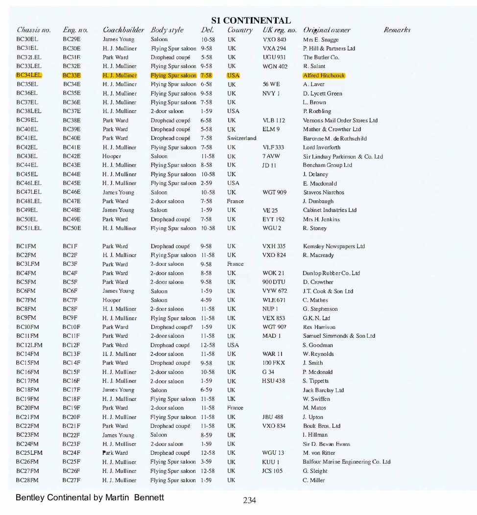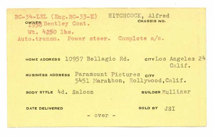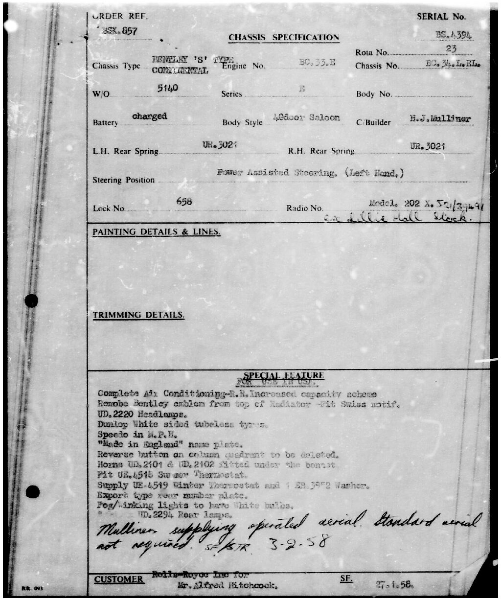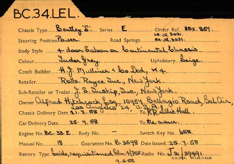BC34LEL was ordered directly with Rolls-Royce, Inc. in New York for Alfred Hitchcock on January 27, 1958. The guarantee was issued on July 25th, 1958 and it was transport from London to Los Angeles aboard the “Loch Garth” on the 30th of July, 1958. Mr. Hitchcock ordered the H.J. Mulliner “six light” Flying Spur design no. 7443 on the S1 Continental chassis, of which a mere 16 were built in left-hand drive form. According to Sarah Holibaugh of the Rolls-Royce Foundation, at the time of its delivery he was working on the sixth season of Alfred Hitchcock Presents, and it is said that Cash Bentley, central character of the episode “O Youth and Beauty,” was named after this Bentley. Most recently, Alfred’s Bentley was in the renowned collection of Dr. Gail Reingold of Los Angeles, CA. Dr. Reingold retained D&D Classic Automobile Restoration of Covington, Ohio and well-known Michigan upholsterer Mark Larder to complete a restoration of the Bentley.