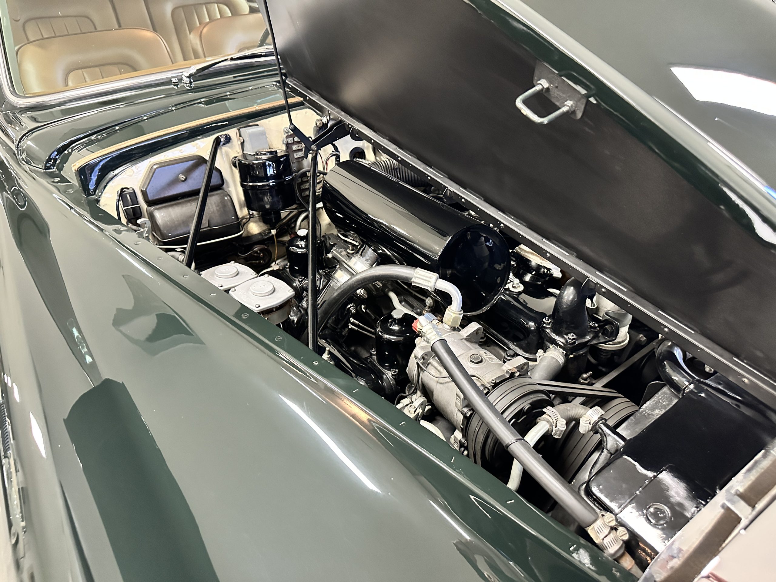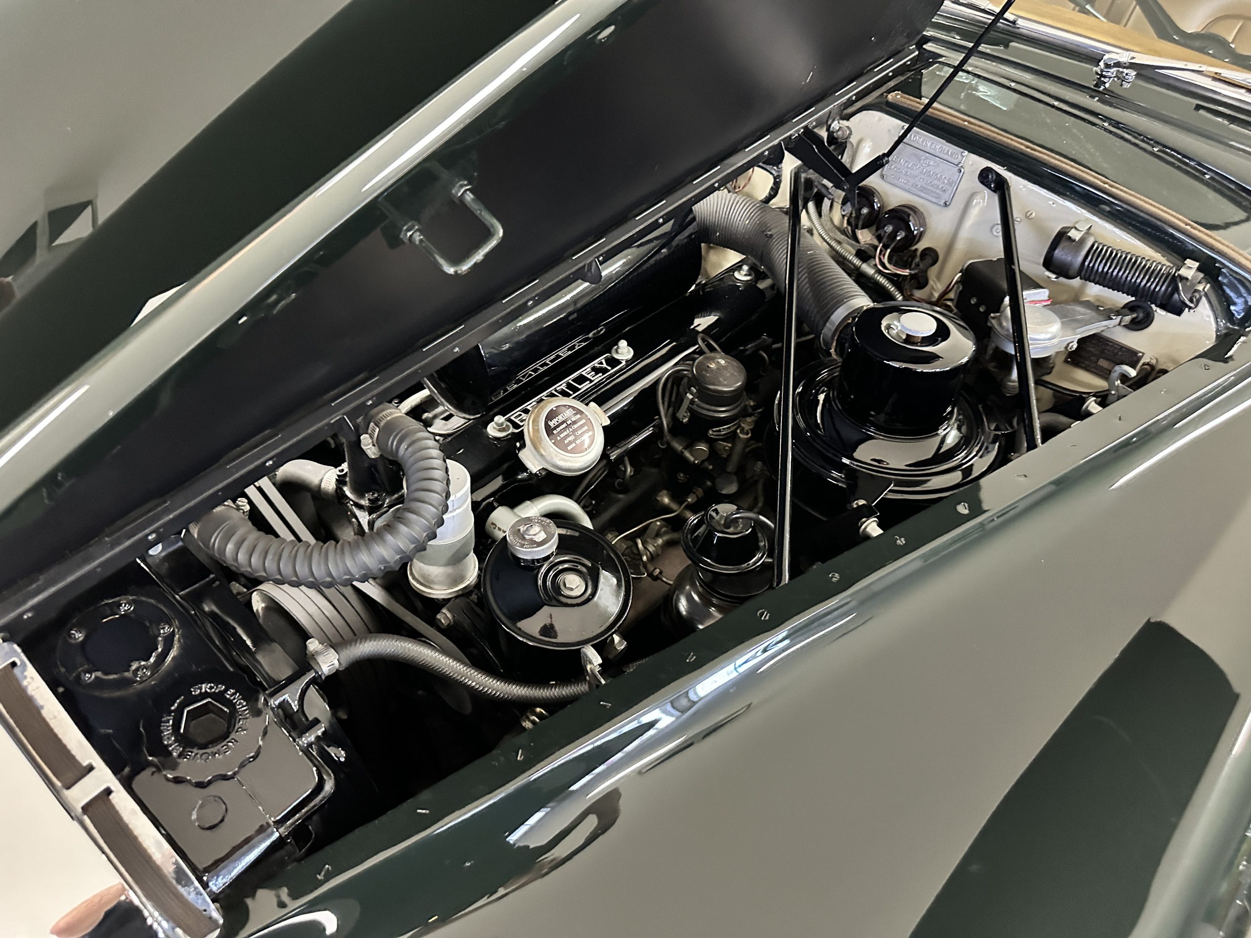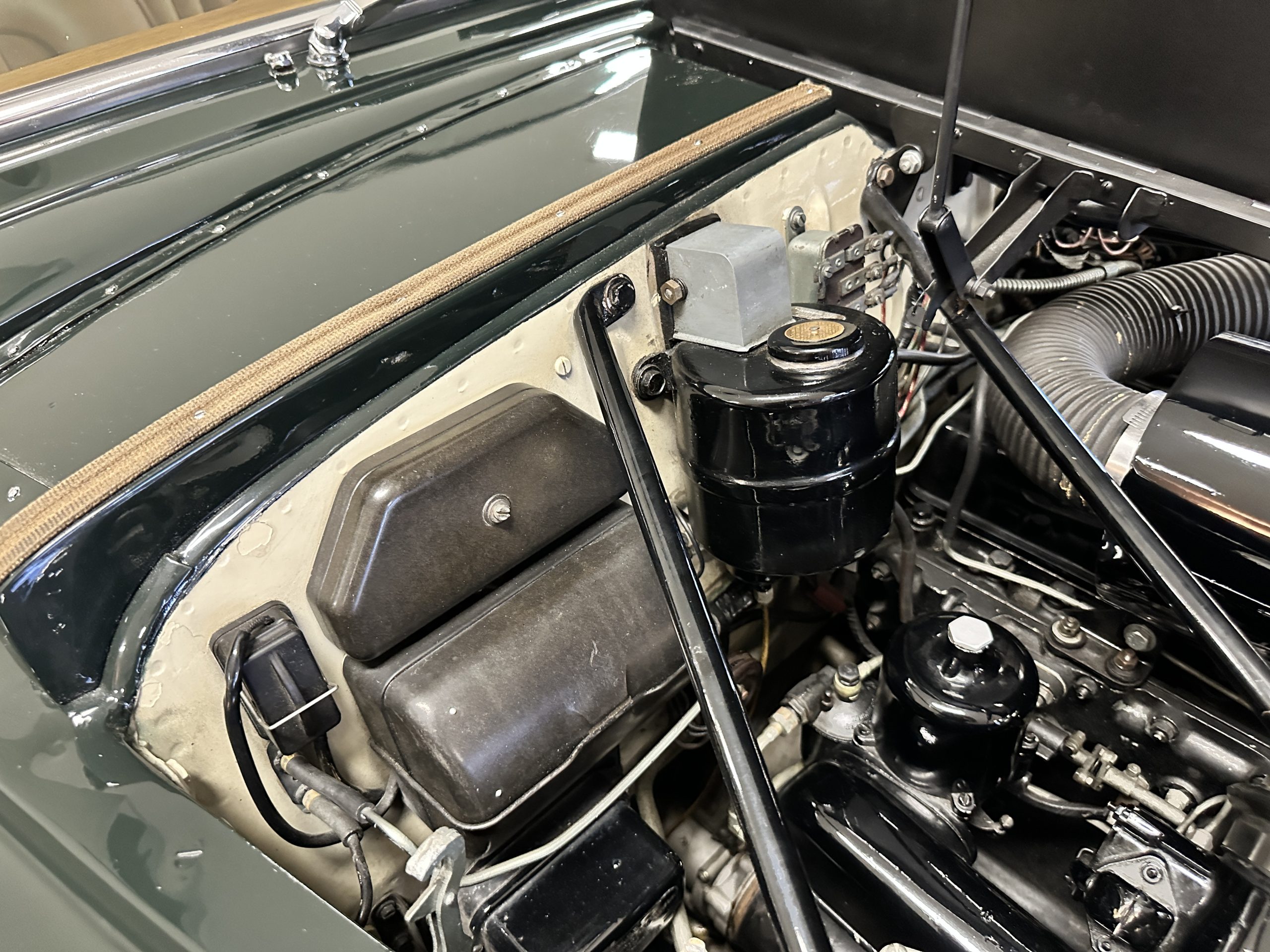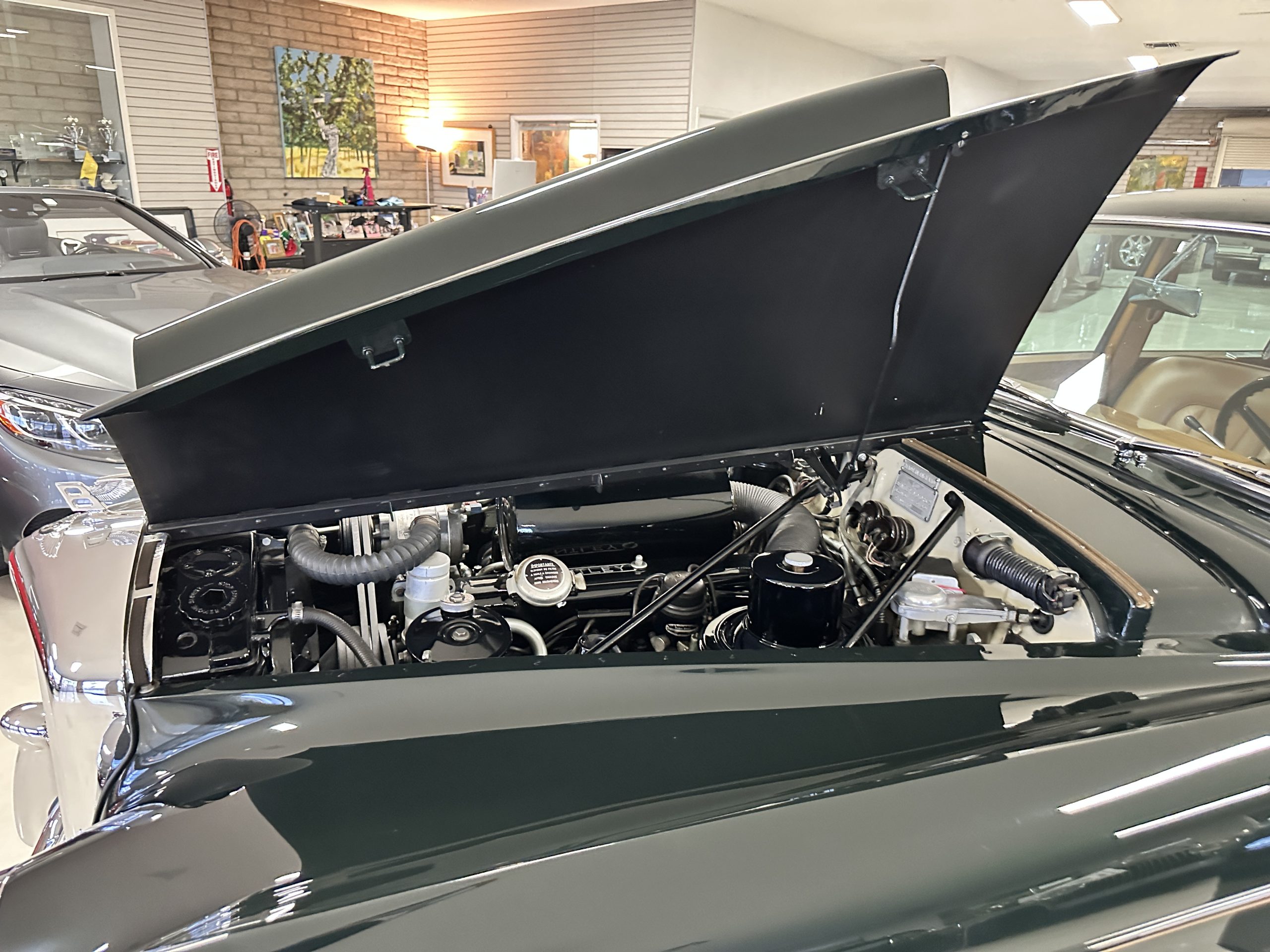 The engine compartment is exceptionally well detailed. The finishes are in excellent condition overall and is show quality. The venerable 4.9 liter straight six cylinder used dual SU carburetors and produced nearly 180 hp. This is connected to the four-speed automatic transmission, power steering and servo power assisted brakes. As elegant as the styling is, this Continental chassis was designed to be a high-speed touring car when new. The performance is striking.