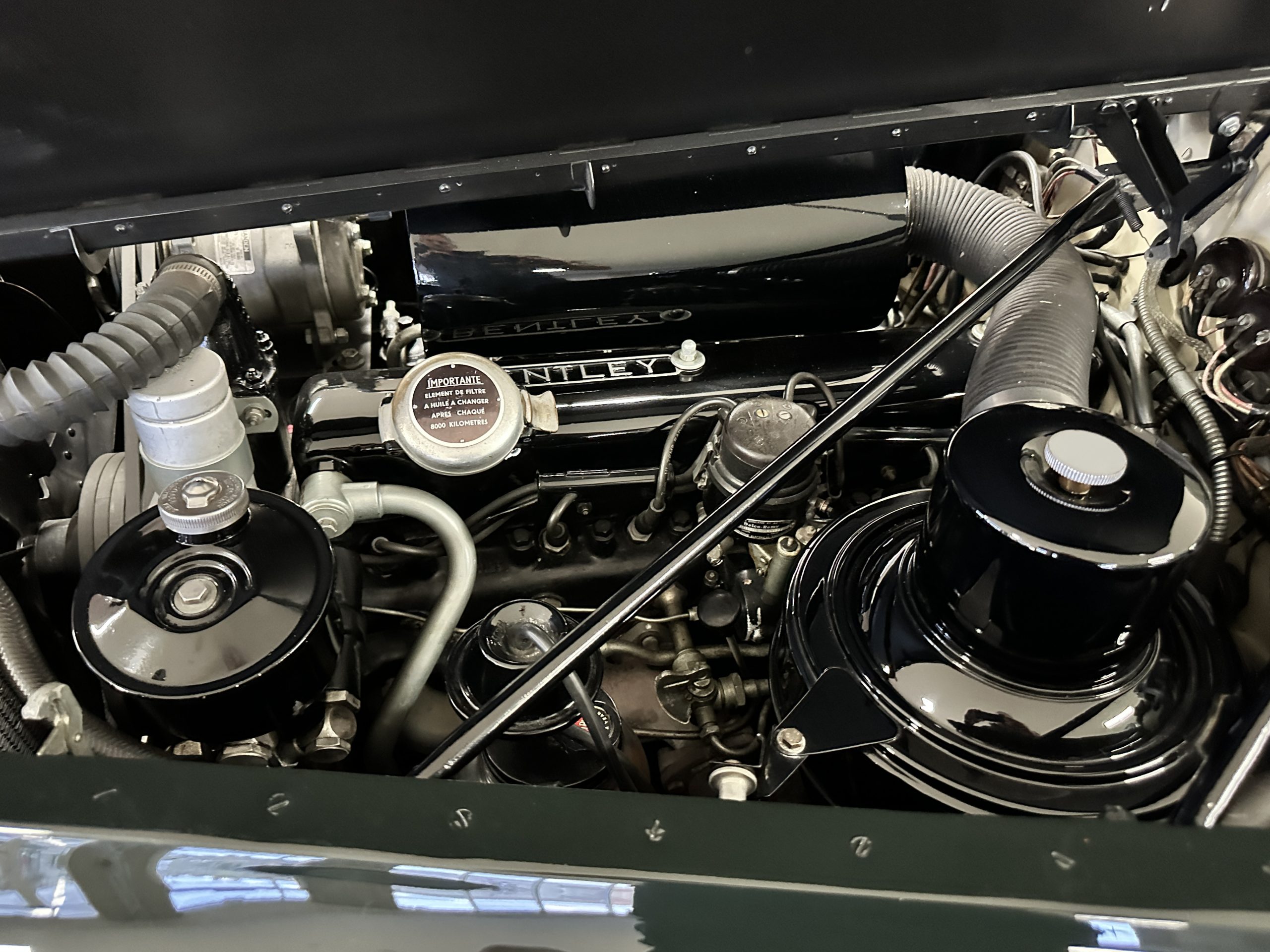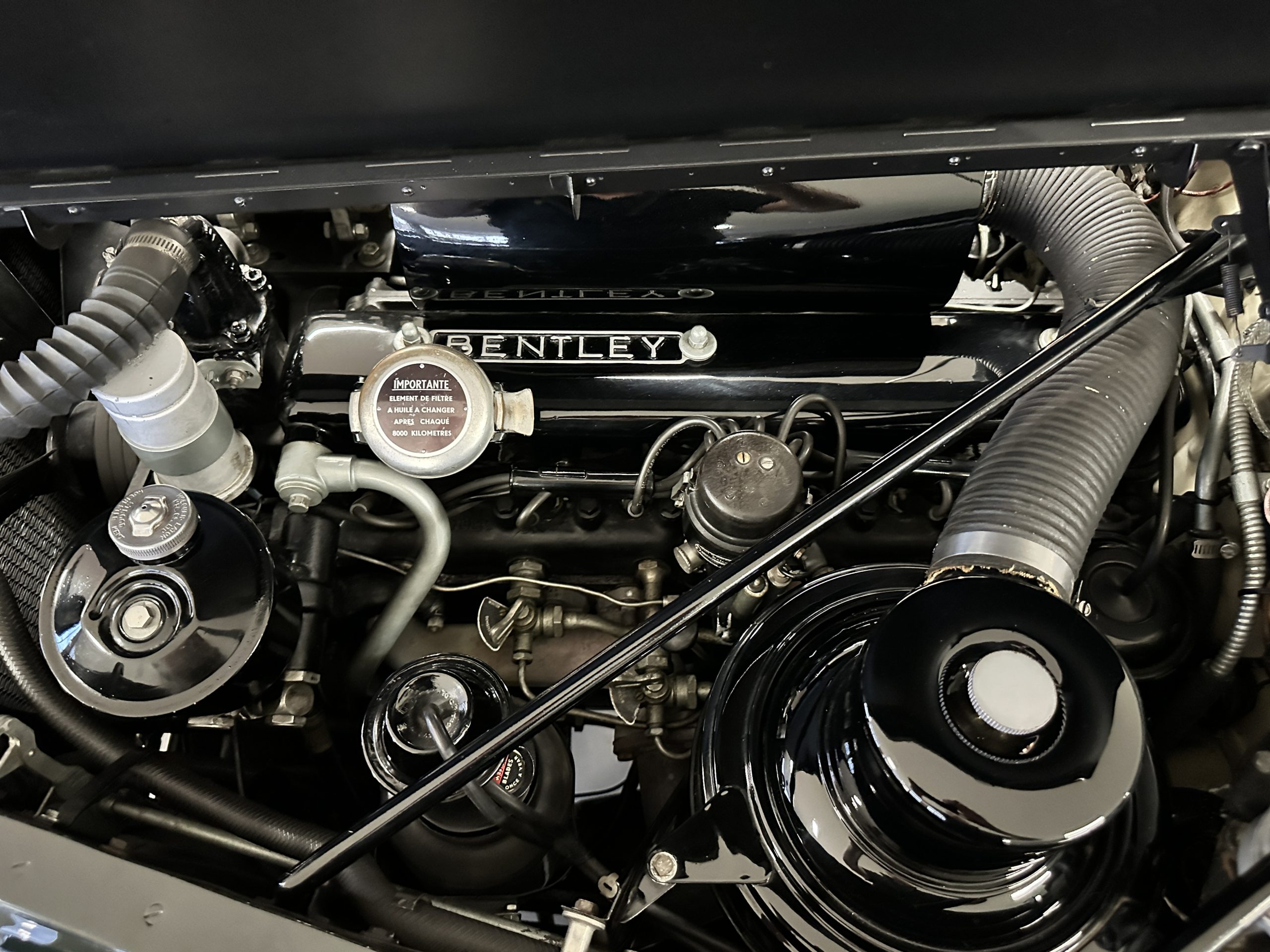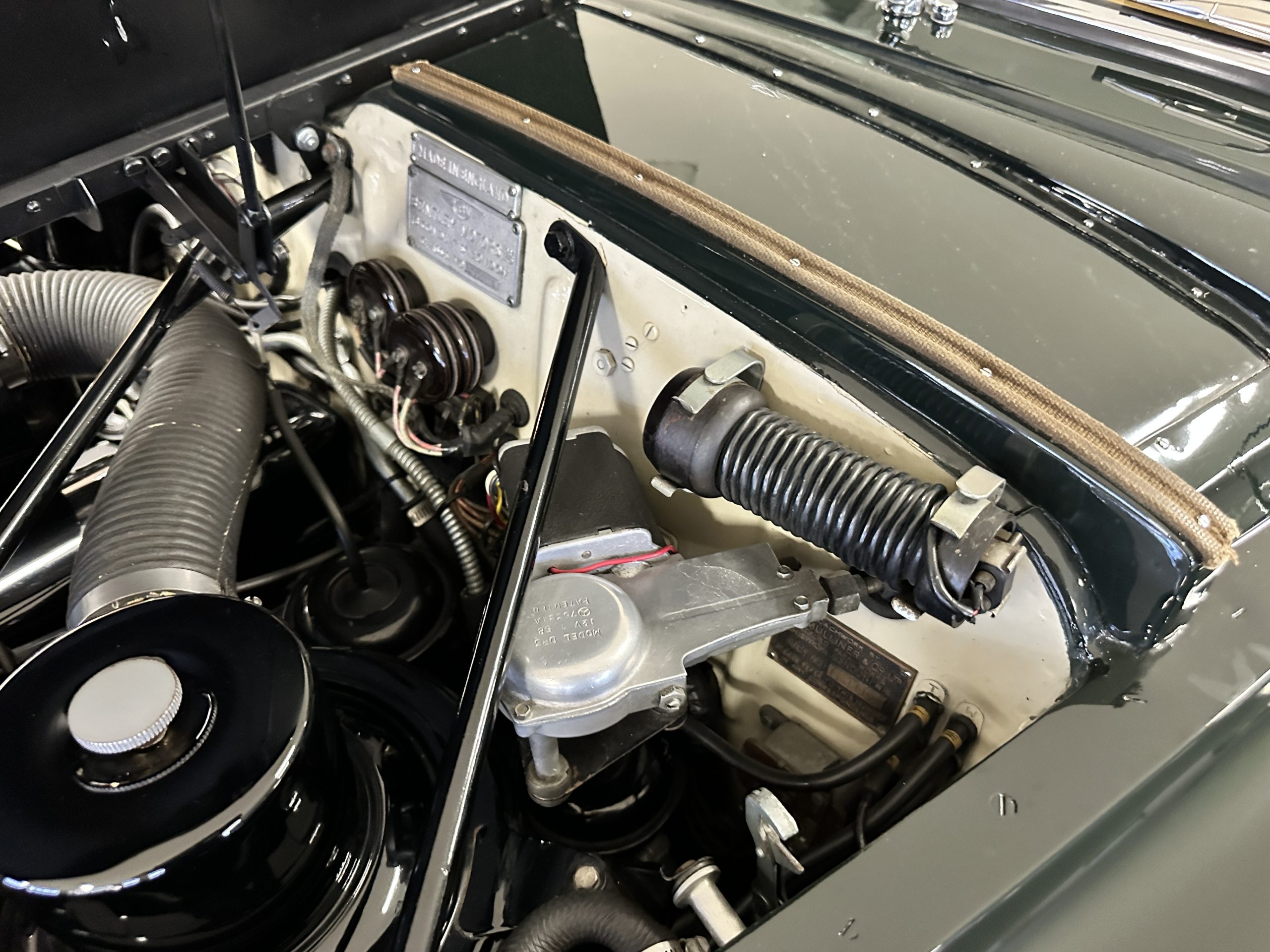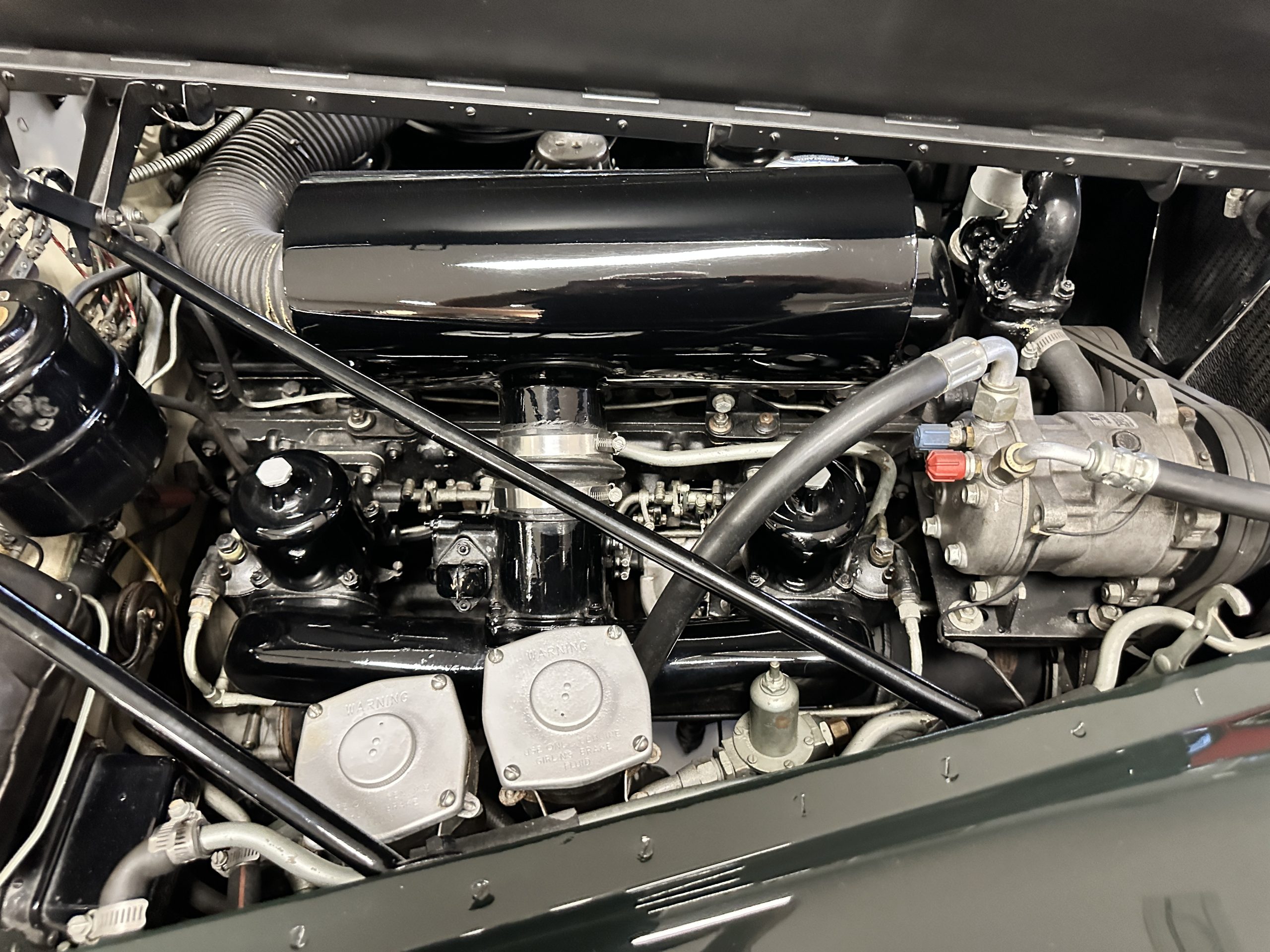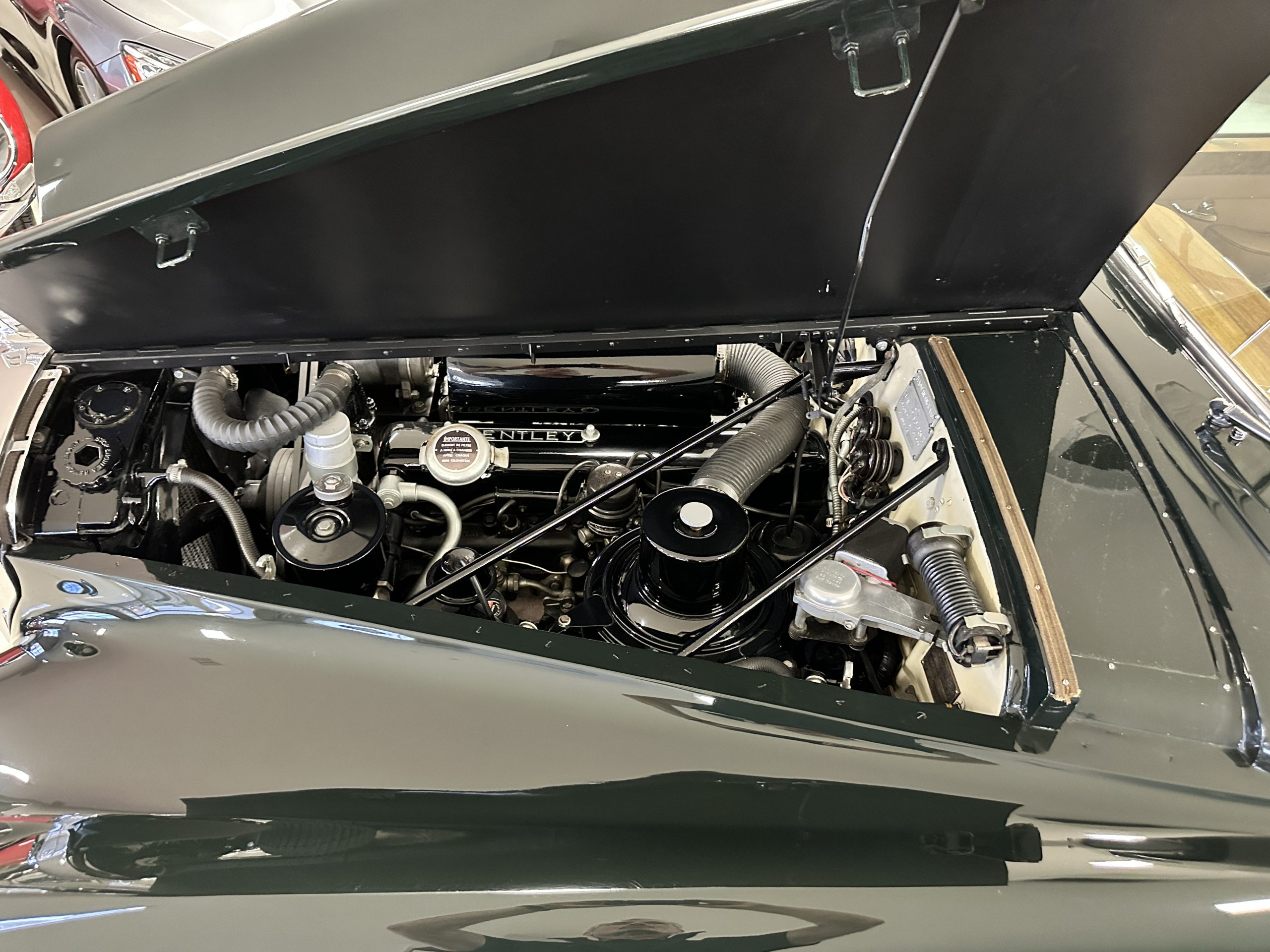 The engine compartment is exceptionally well detailed. The finishes are in excellent condition overall and is show quality. The venerable 4.9 liter straight six cylinder used dual SU carburetors and produced nearly 180 hp. This is connected to the four-speed automatic transmission, power steering and servo power assisted brakes. As elegant as the styling is, this Continental chassis was designed to be a high-speed touring car when new. The performance is striking.