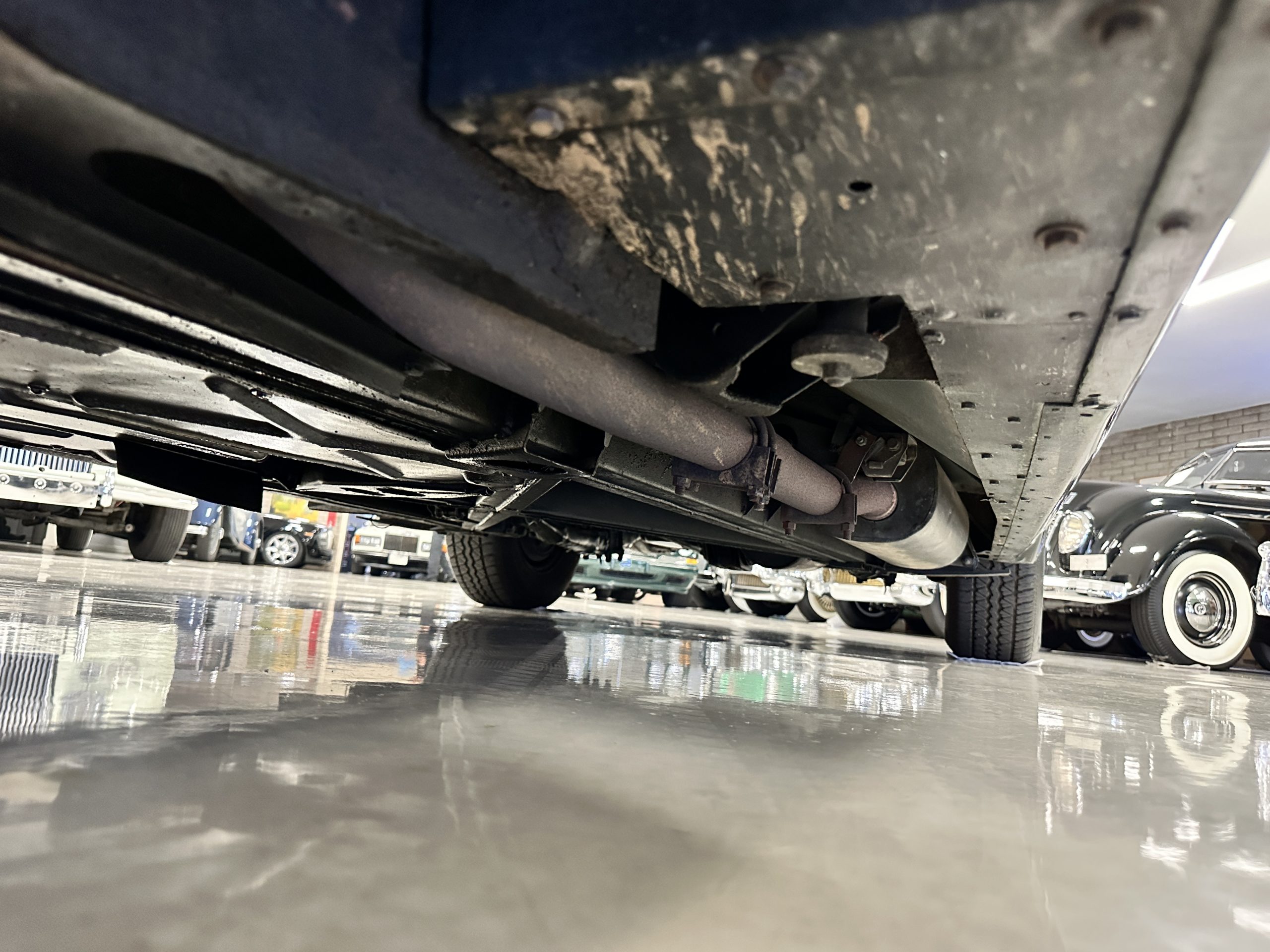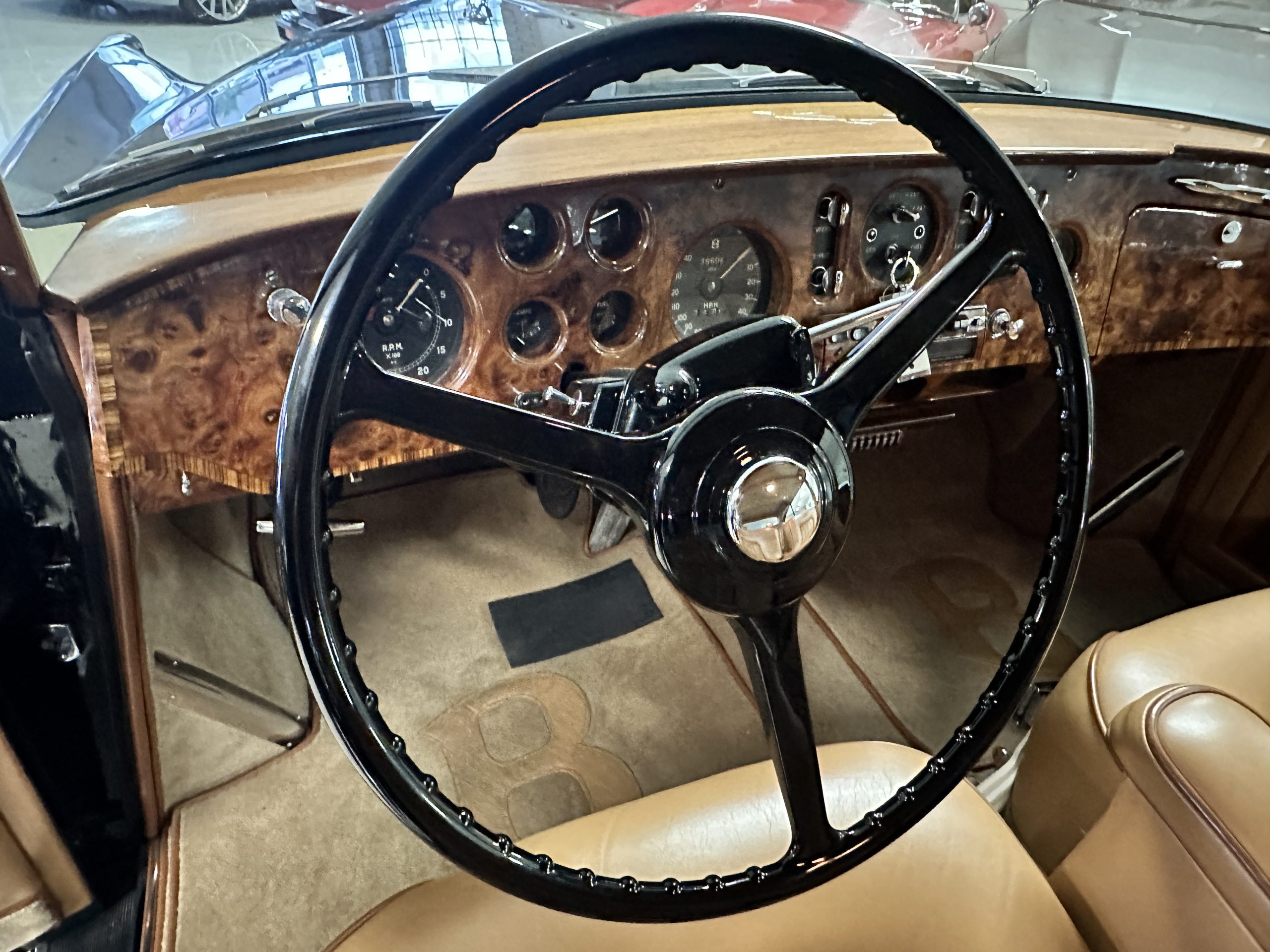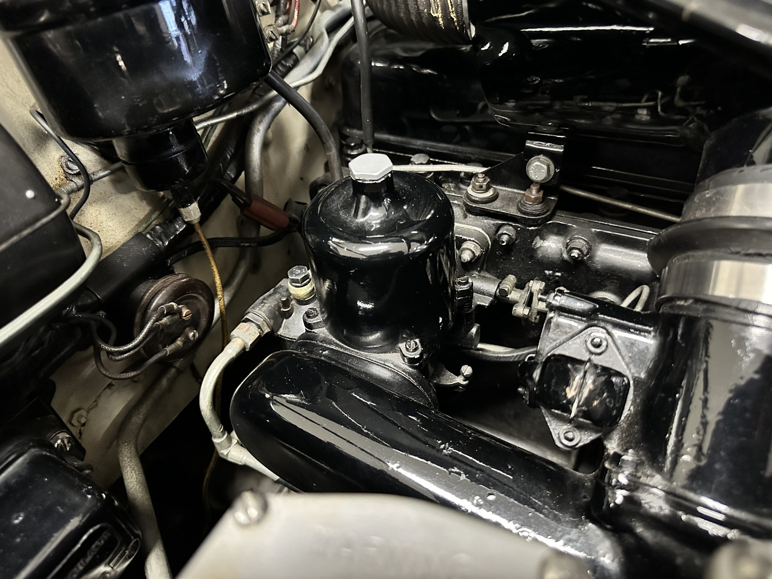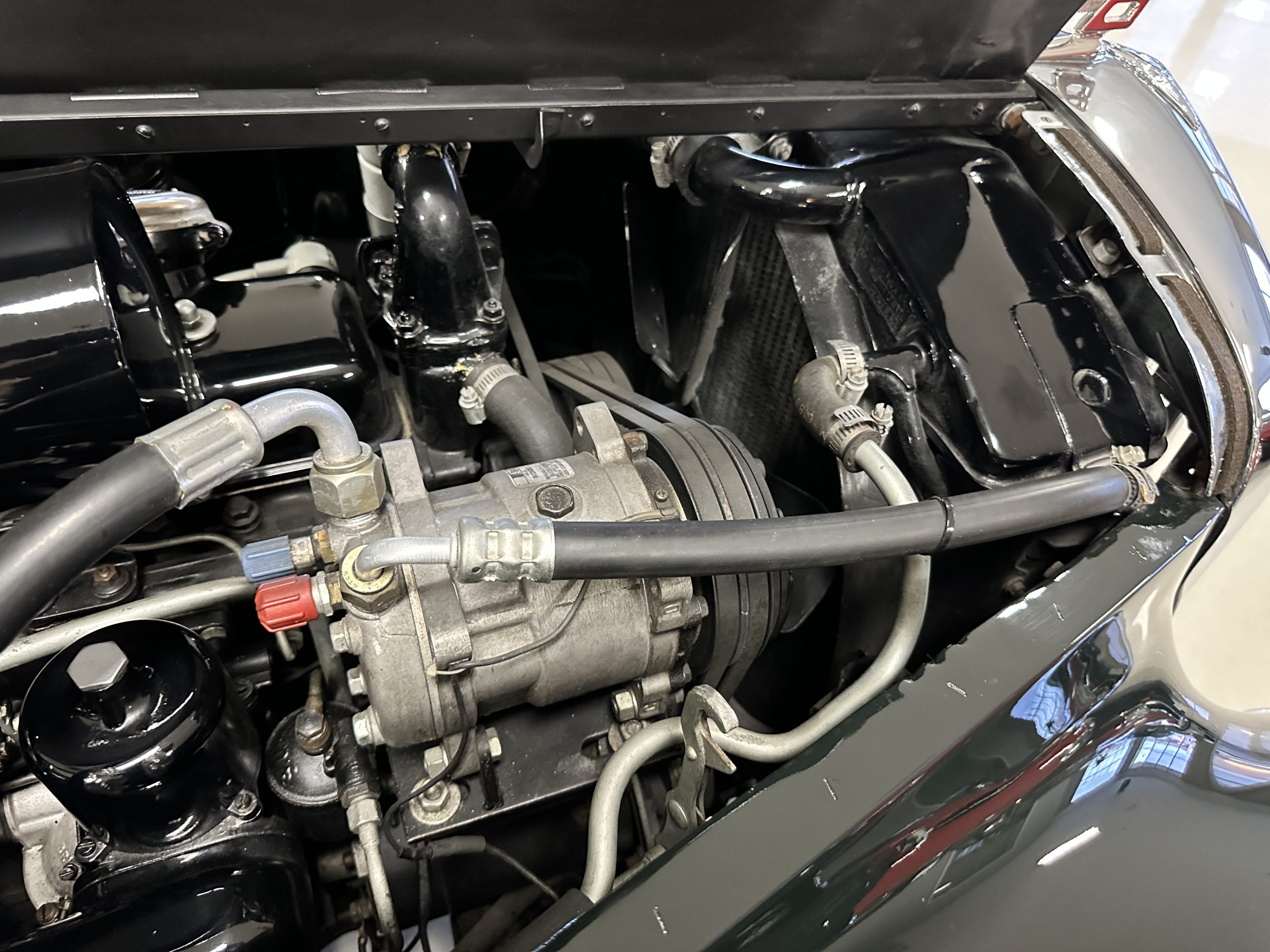 The engine compartment is exceptionally well detailed. The finishes are in excellent condition overall and is show quality. The venerable 4.9 liter straight six cylinder used dual SU carburetors and produced nearly 180 hp. This is connected to the four-speed automatic transmission, power steering and servo power assisted brakes. As elegant as the styling is, this Continental chassis was designed to be a high-speed touring car when new. The performance is striking.