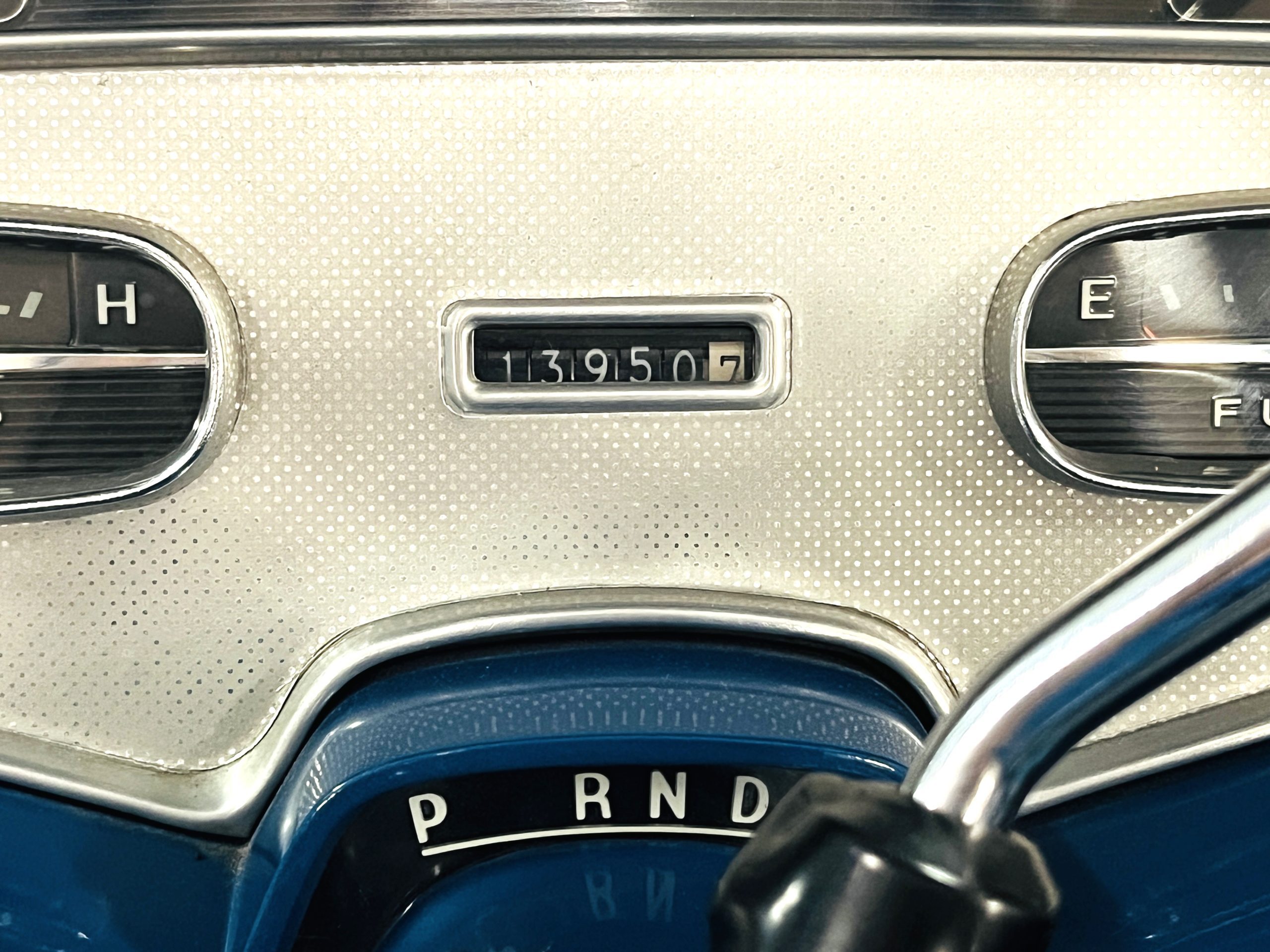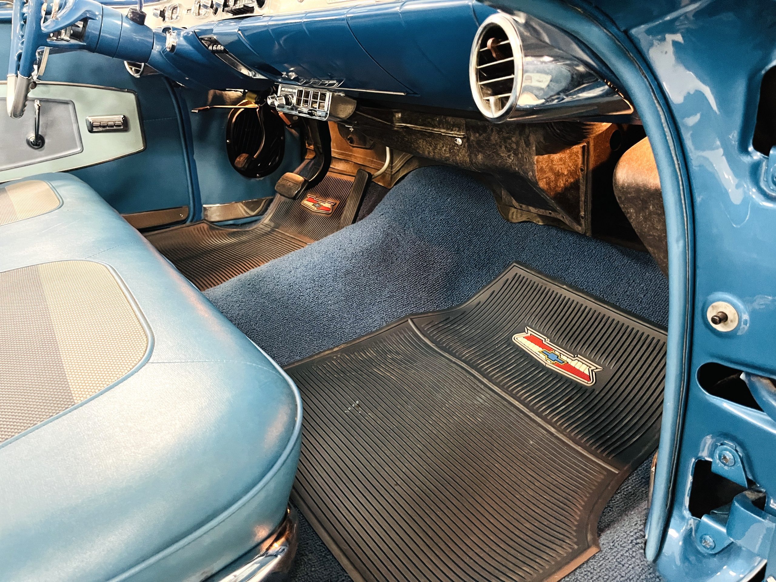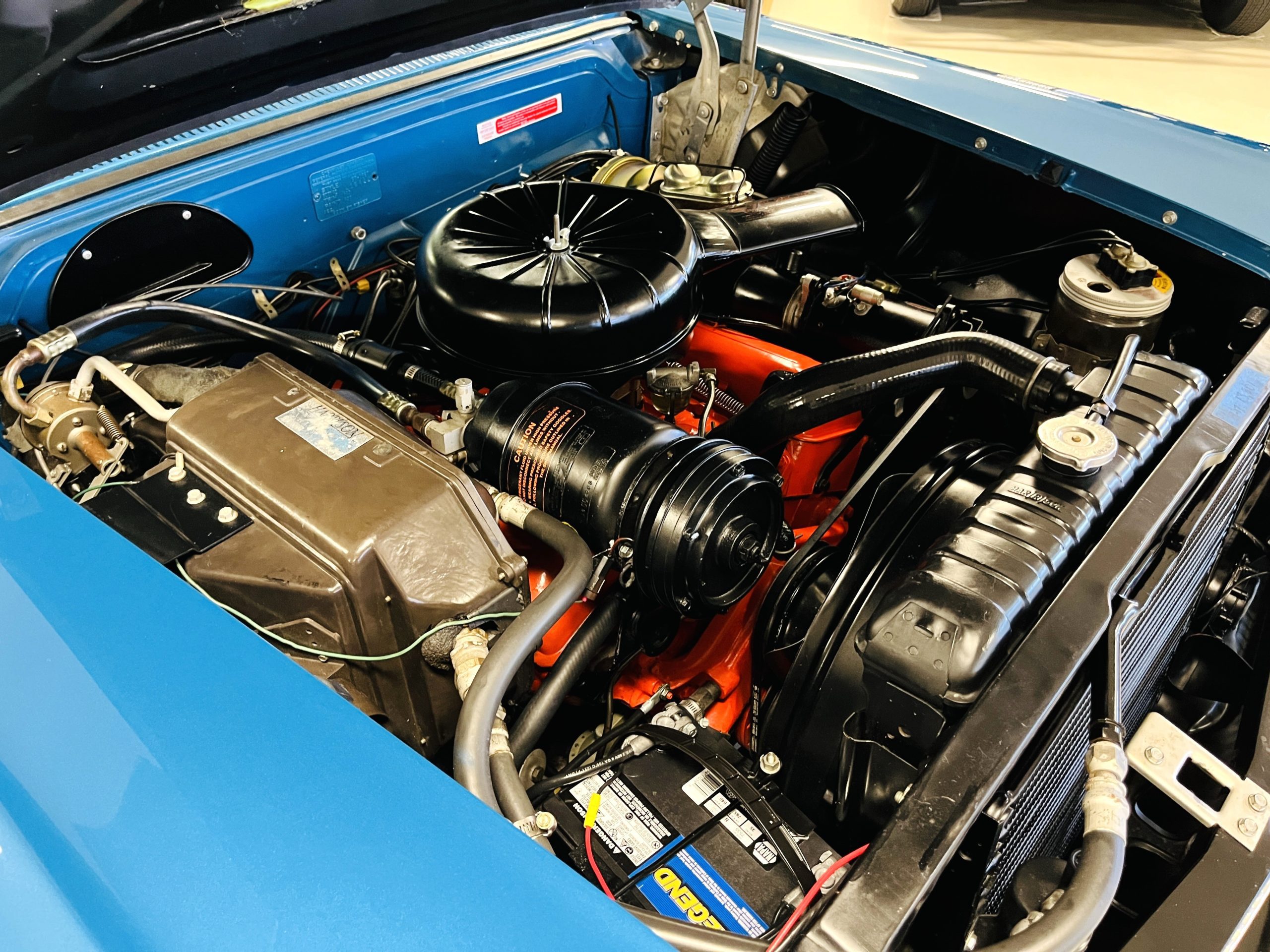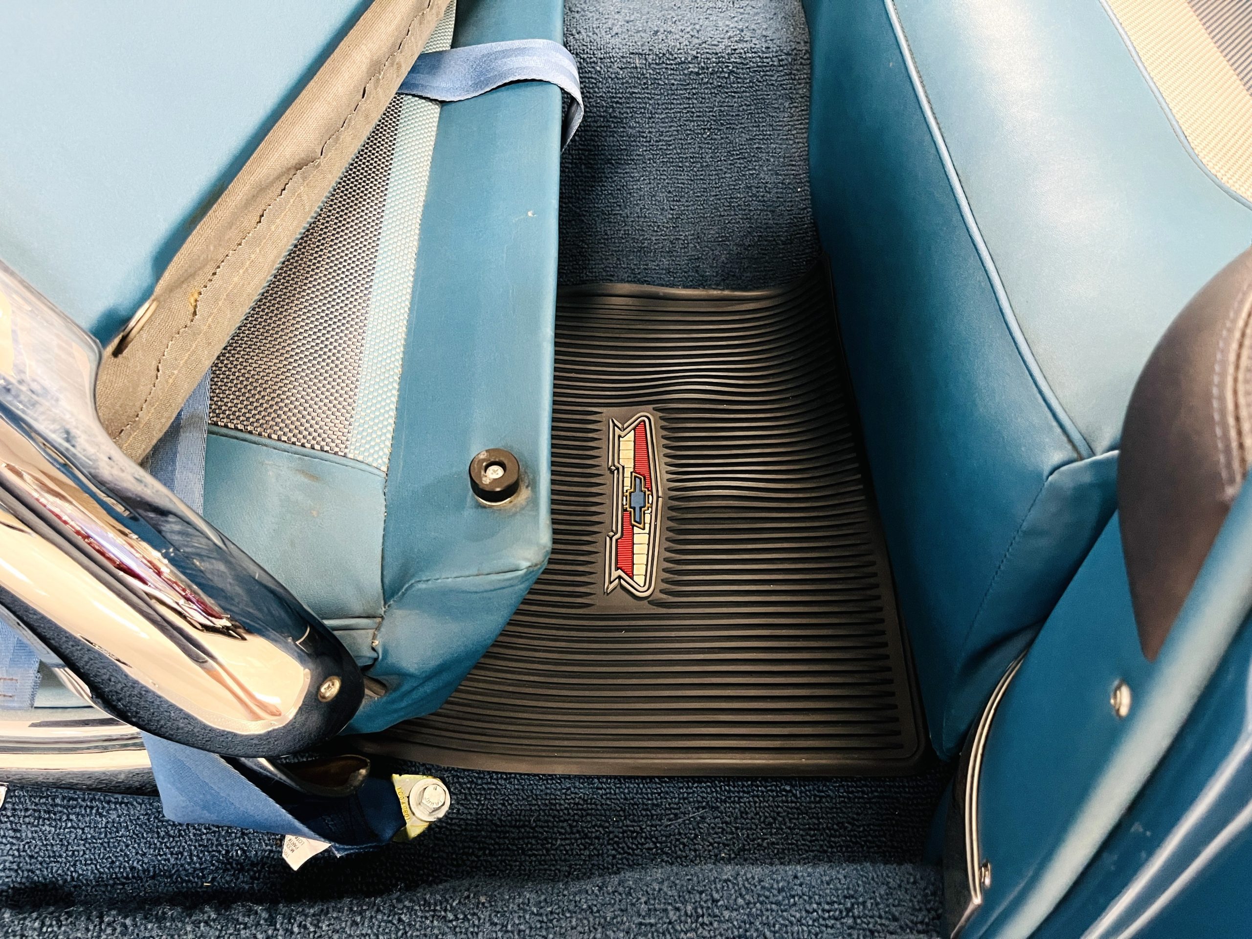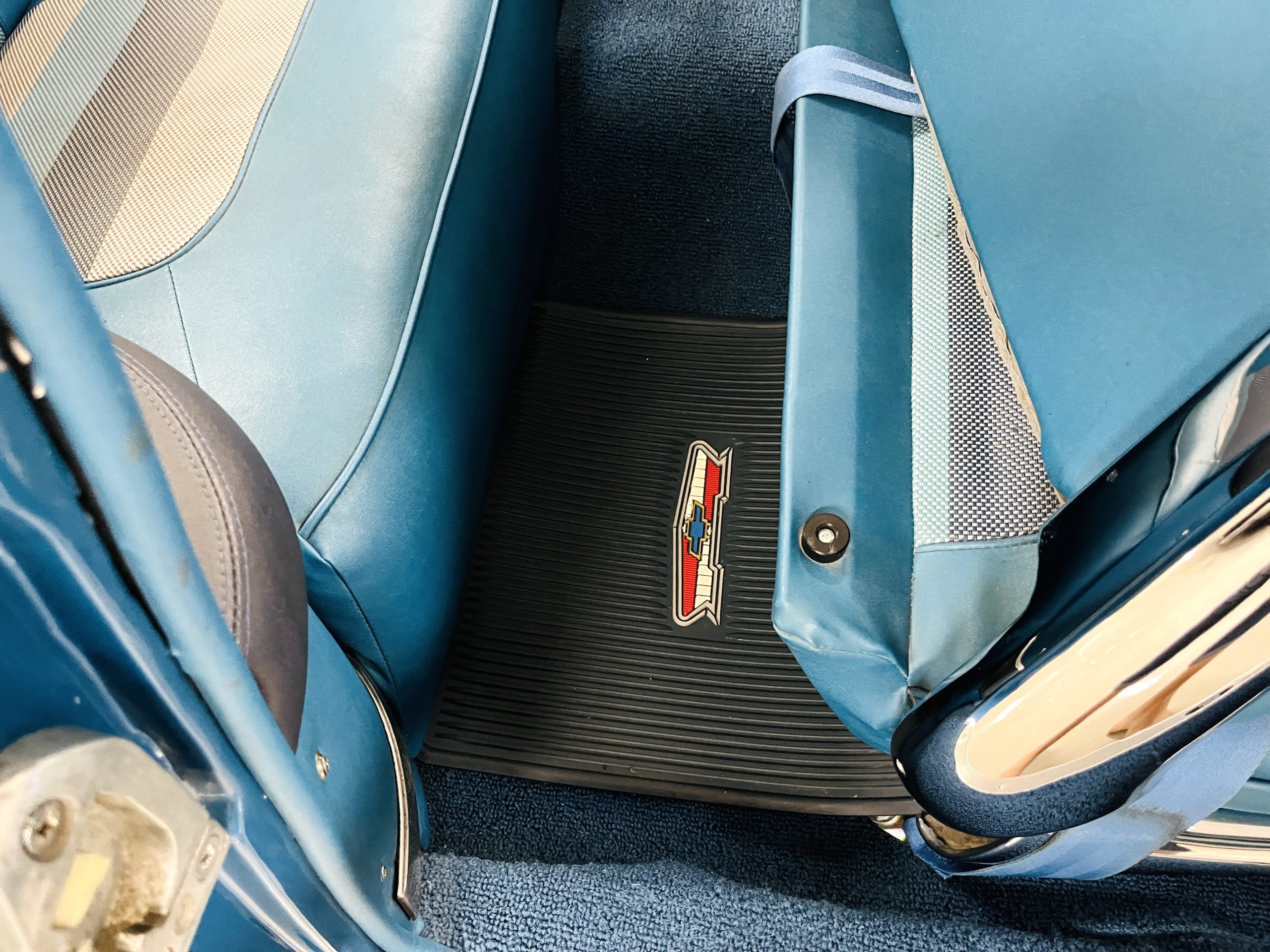 The interior is dressed in the original trim color gray/blue (trim code 823) cloth and vinyl and is in excellent condition. The carpeting is all as-new in a beautiful vibrant blue. The floor mats are in excellent condition. The front manual bench seat is equipped with seatbelts. All the gauges are functioning and the radio works. The dash is beautiful and comes with a built-in clock on the passenger side.