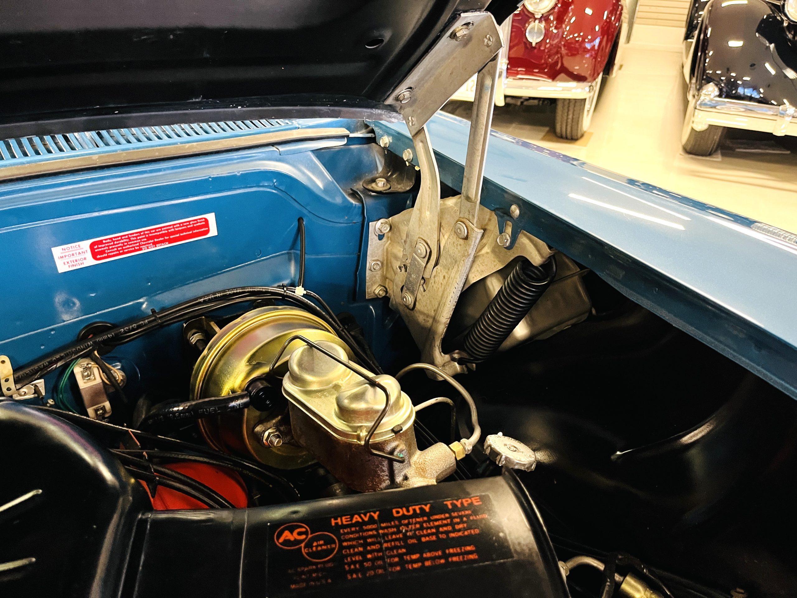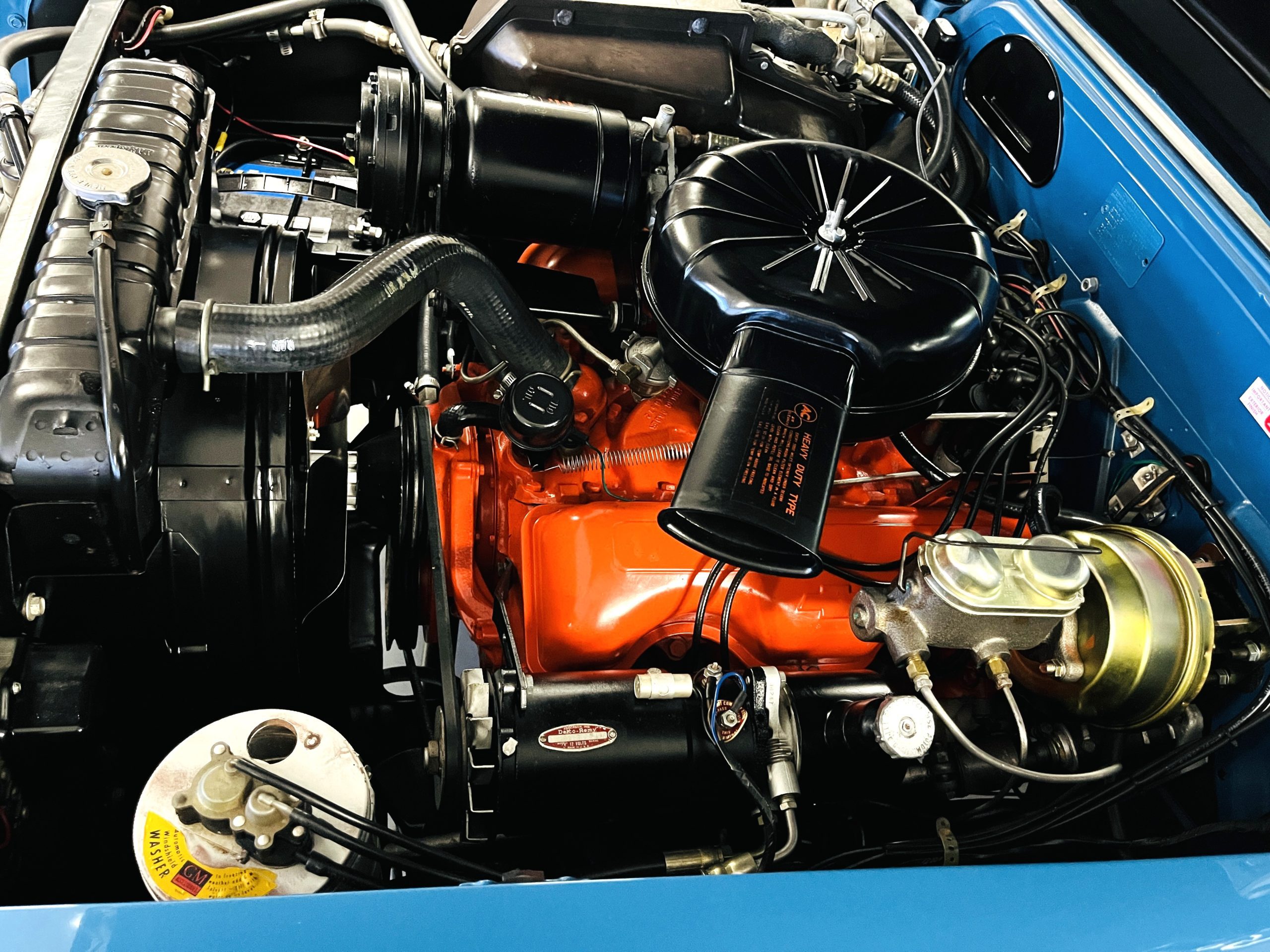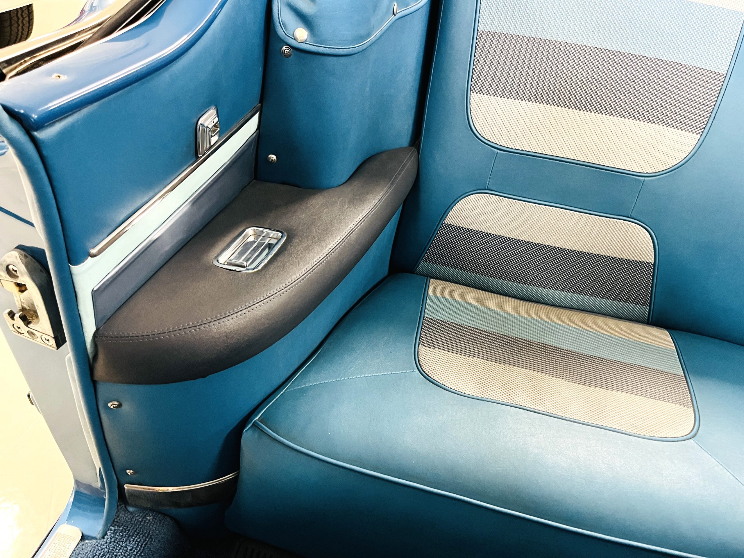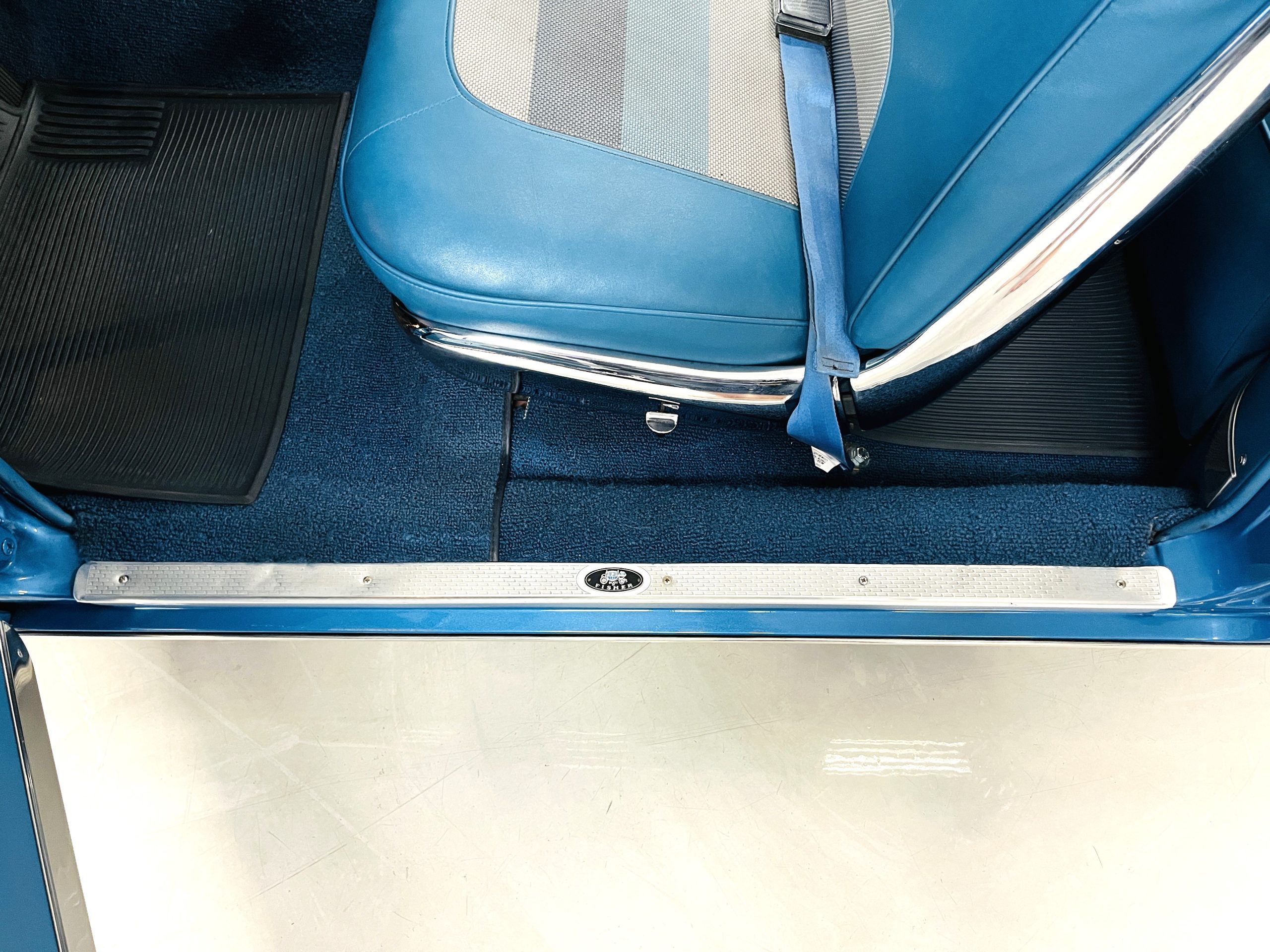 The interior is dressed in the original trim color gray/blue (trim code 823) cloth and vinyl and is in excellent condition. The carpeting is all as-new in a beautiful vibrant blue. The floor mats are in excellent condition. The front manual bench seat is equipped with seatbelts. All the gauges are functioning and the radio works. The dash is beautiful and comes with a built-in clock on the passenger side.