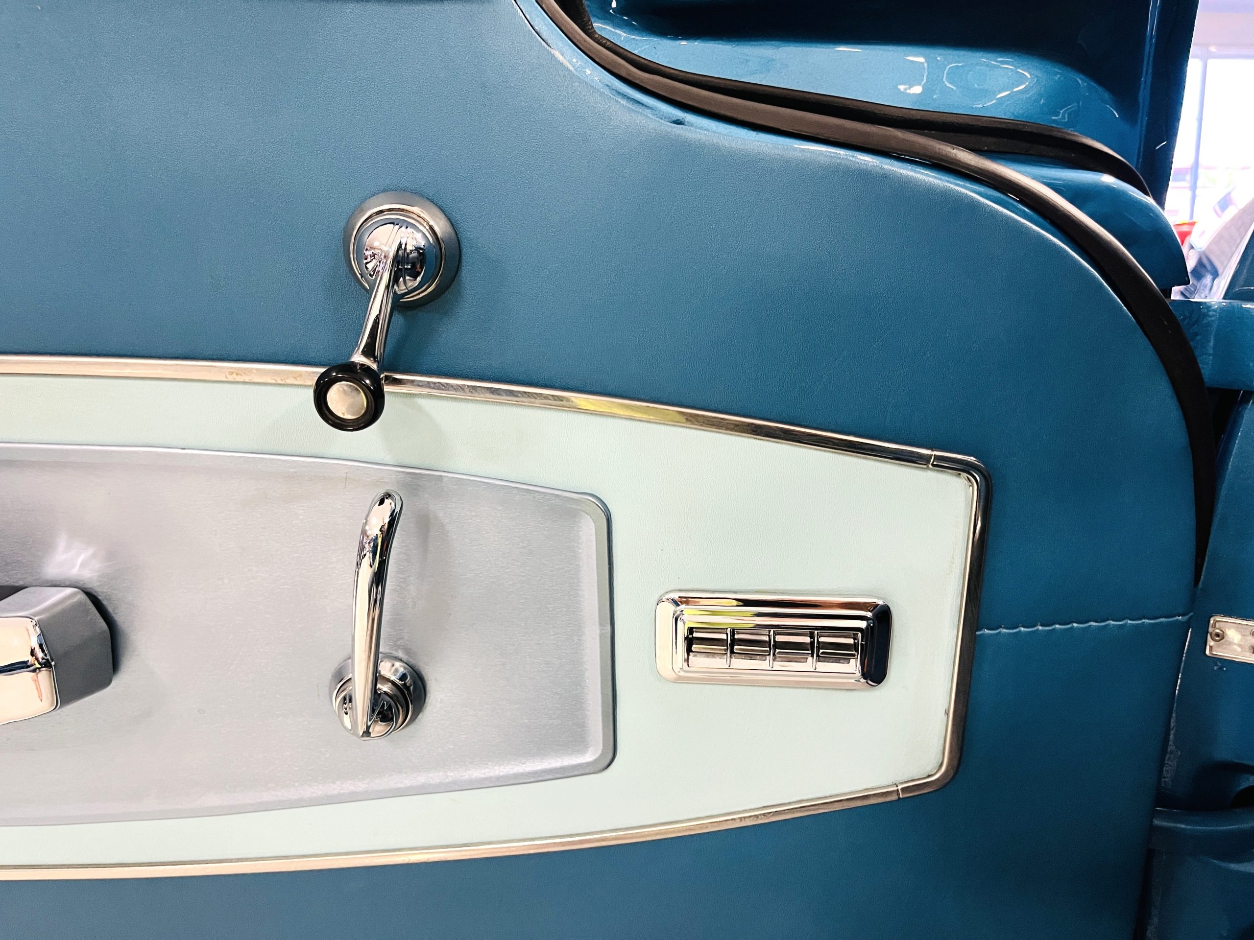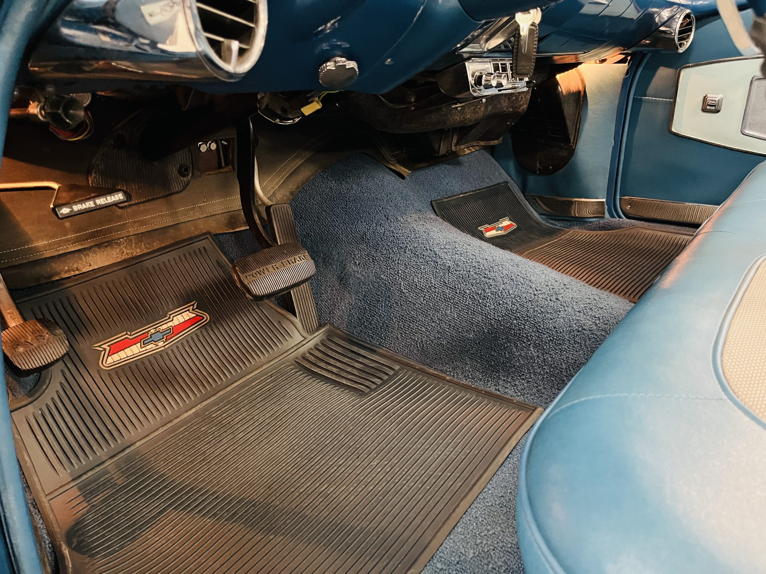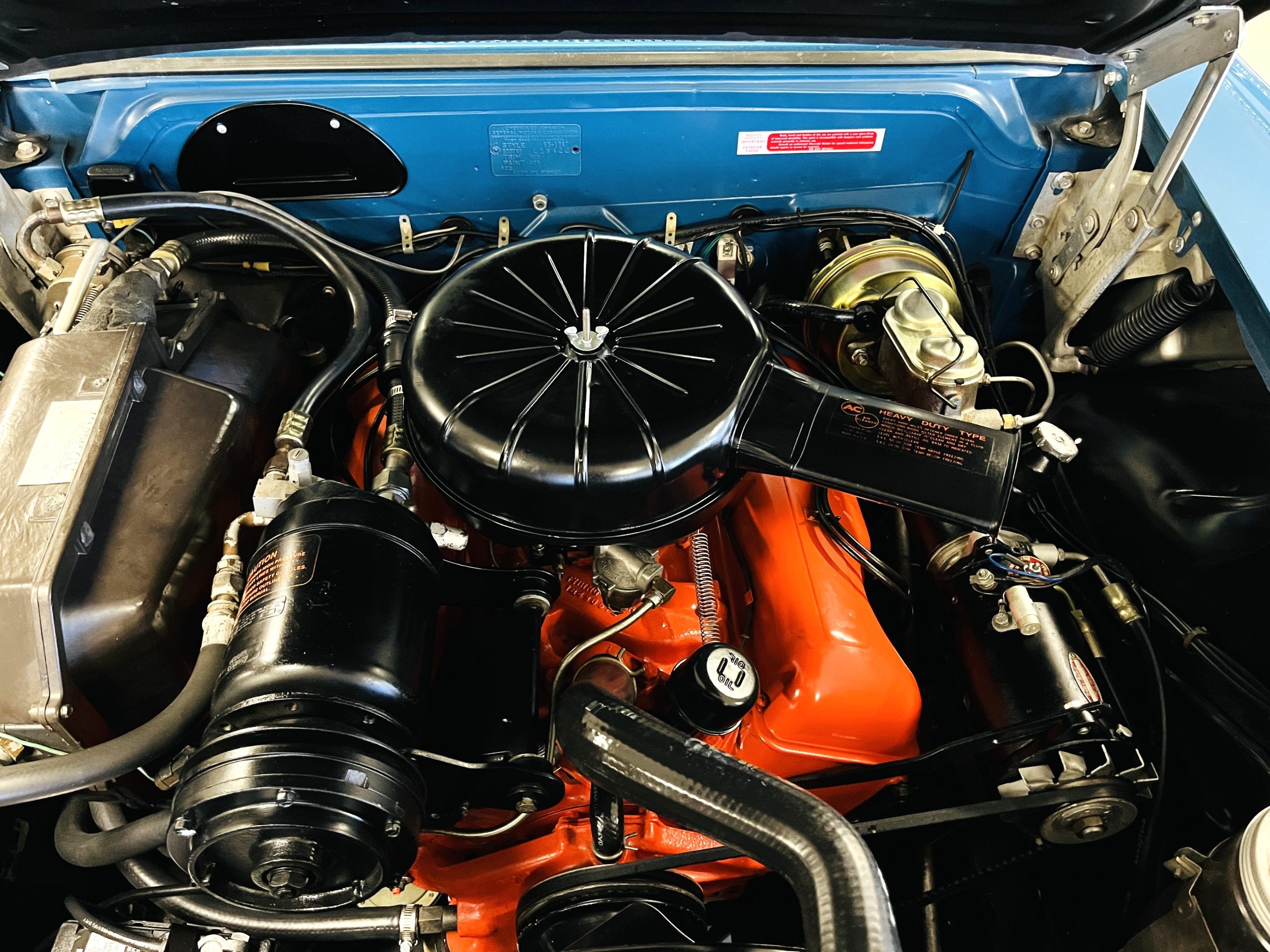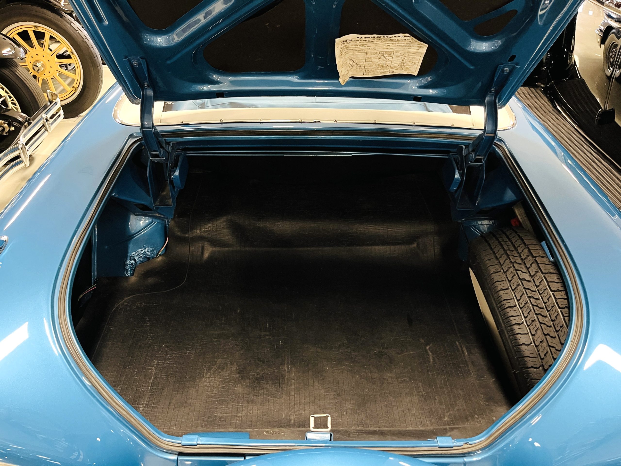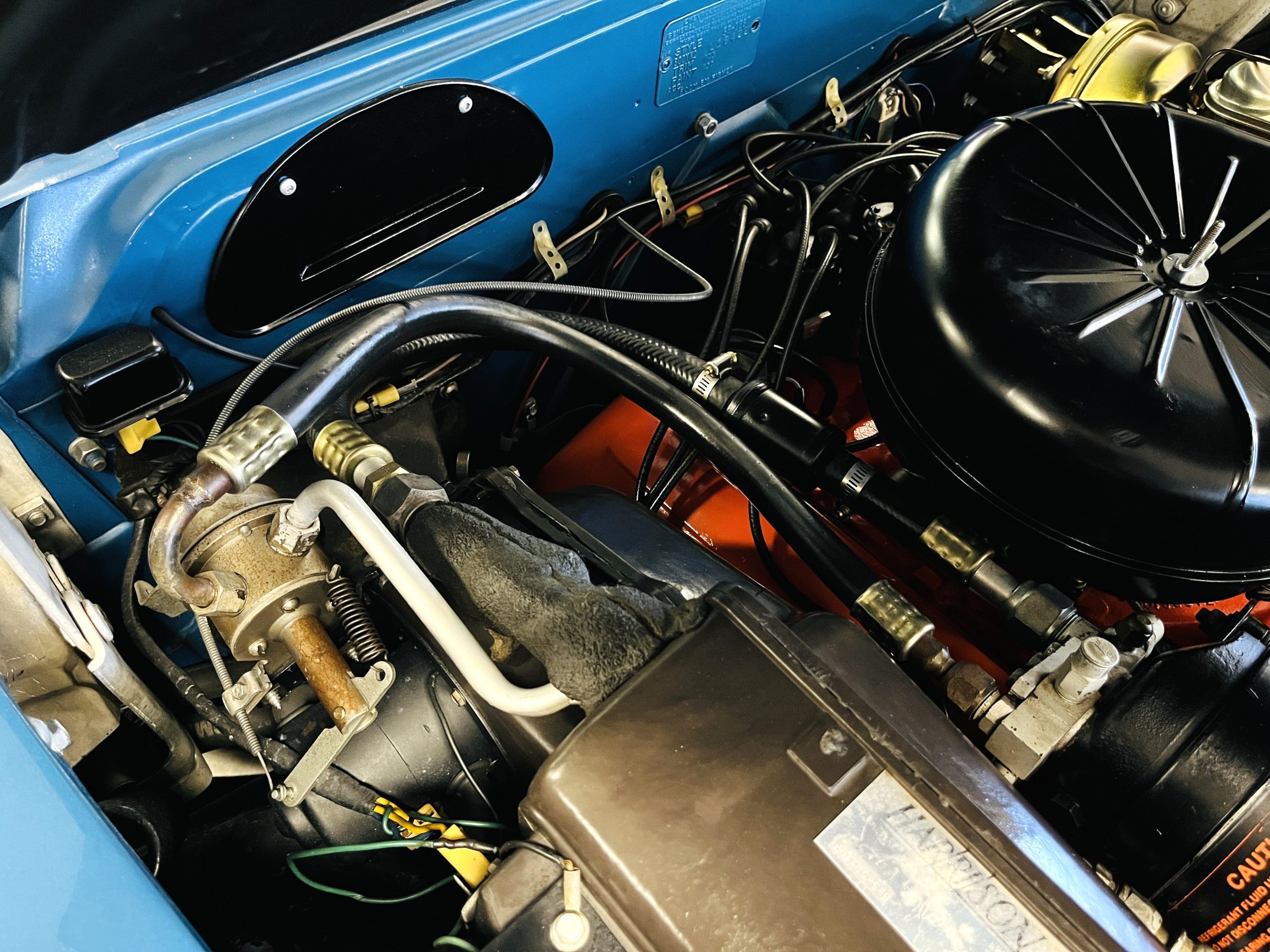The interior is dressed in the original trim color gray/blue (trim code 823) cloth and vinyl and is in excellent condition. The carpeting is all as-new in a beautiful vibrant blue. The floor mats are in excellent condition. The front manual bench seat is equipped with seatbelts. All the gauges are functioning and the radio works. The dash is beautiful and comes with a built-in clock on the passenger side.
