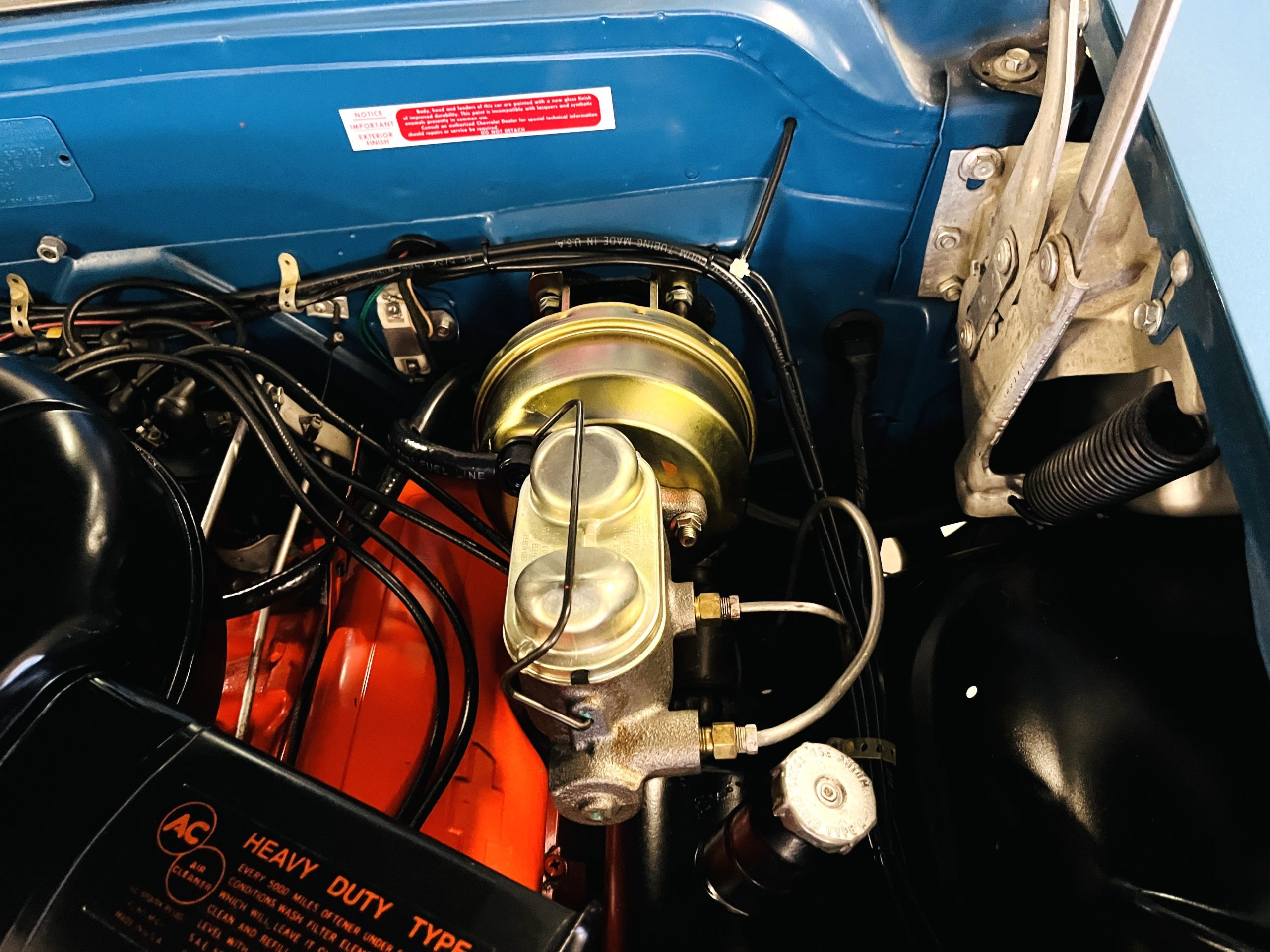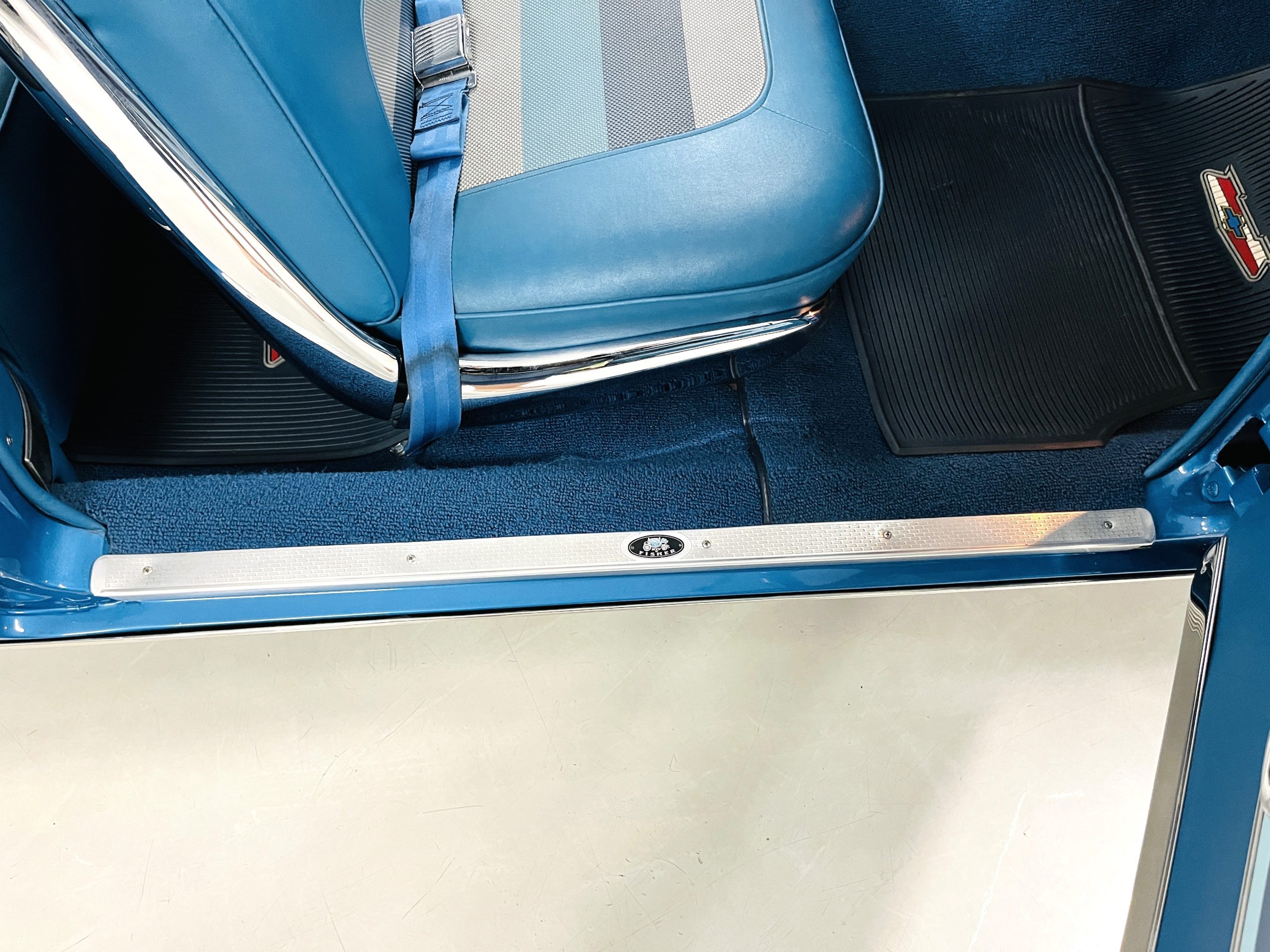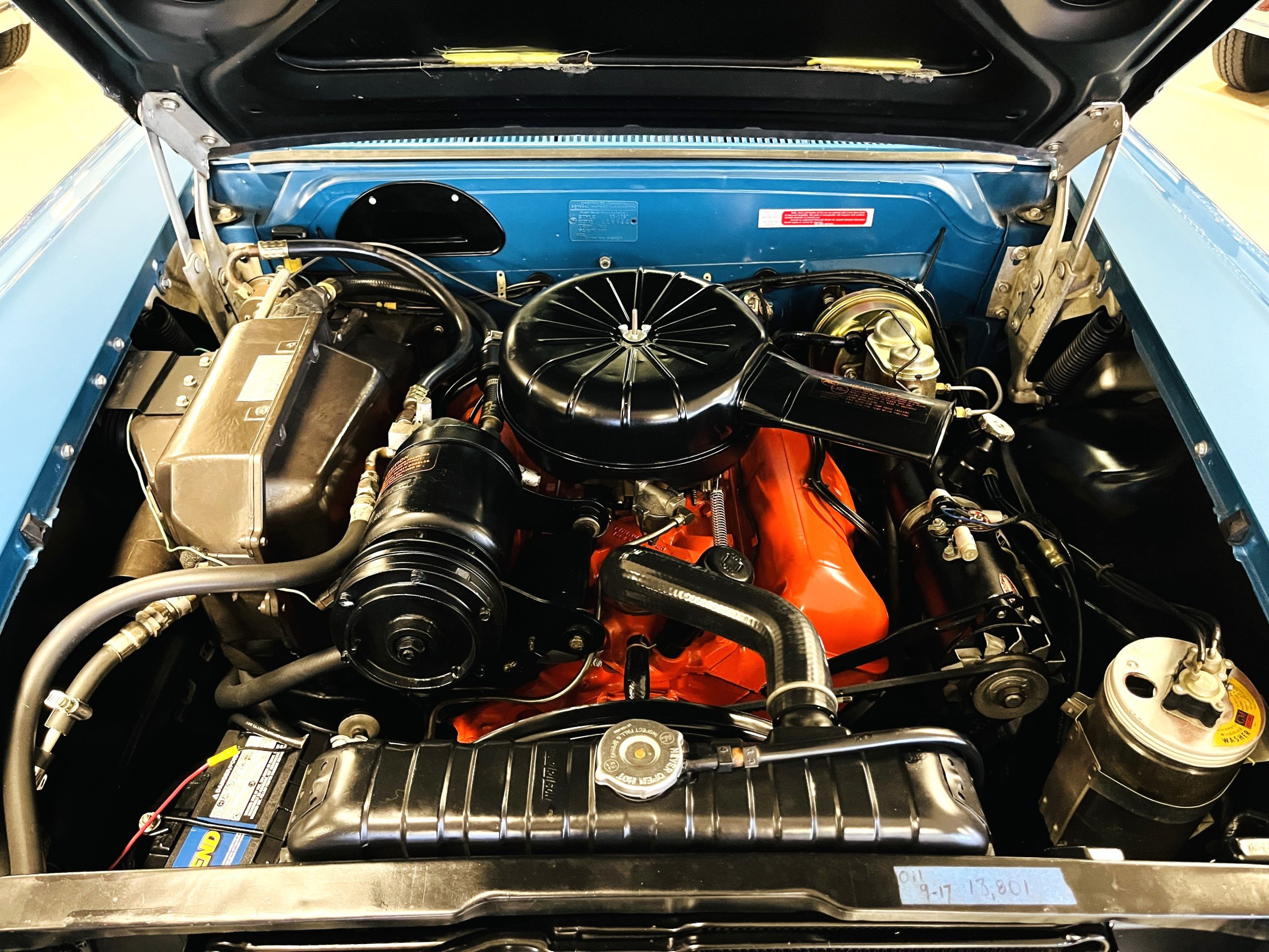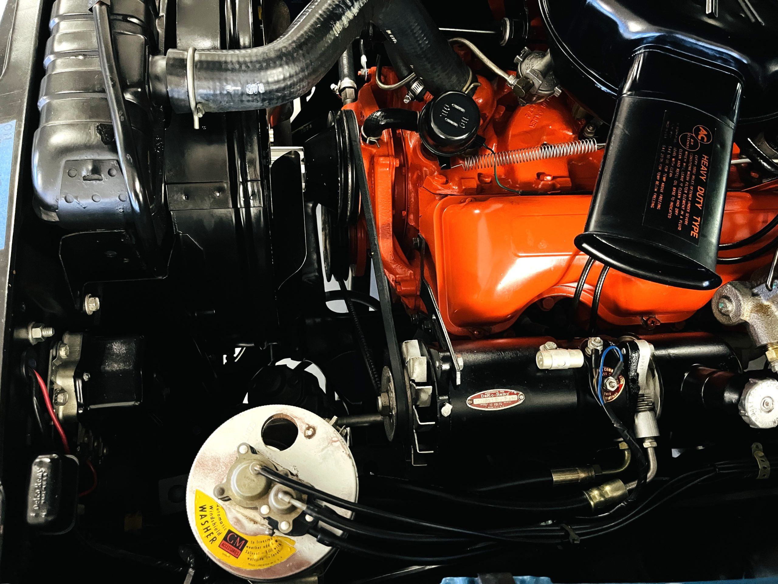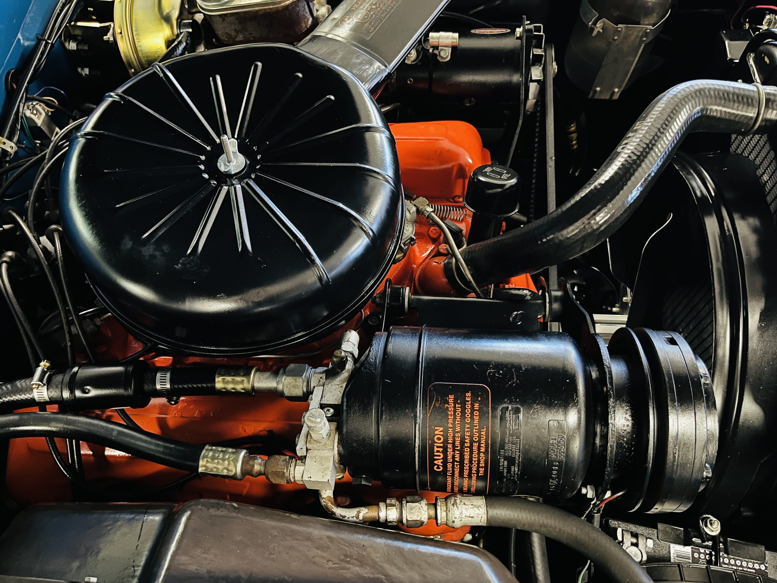 The interior is dressed in the original trim color gray/blue (trim code 823) cloth and vinyl and is in excellent condition. The carpeting is all as-new in a beautiful vibrant blue. The floor mats are in excellent condition. The front manual bench seat is equipped with seatbelts. All the gauges are functioning and the radio works. The dash is beautiful and comes with a built-in clock on the passenger side.