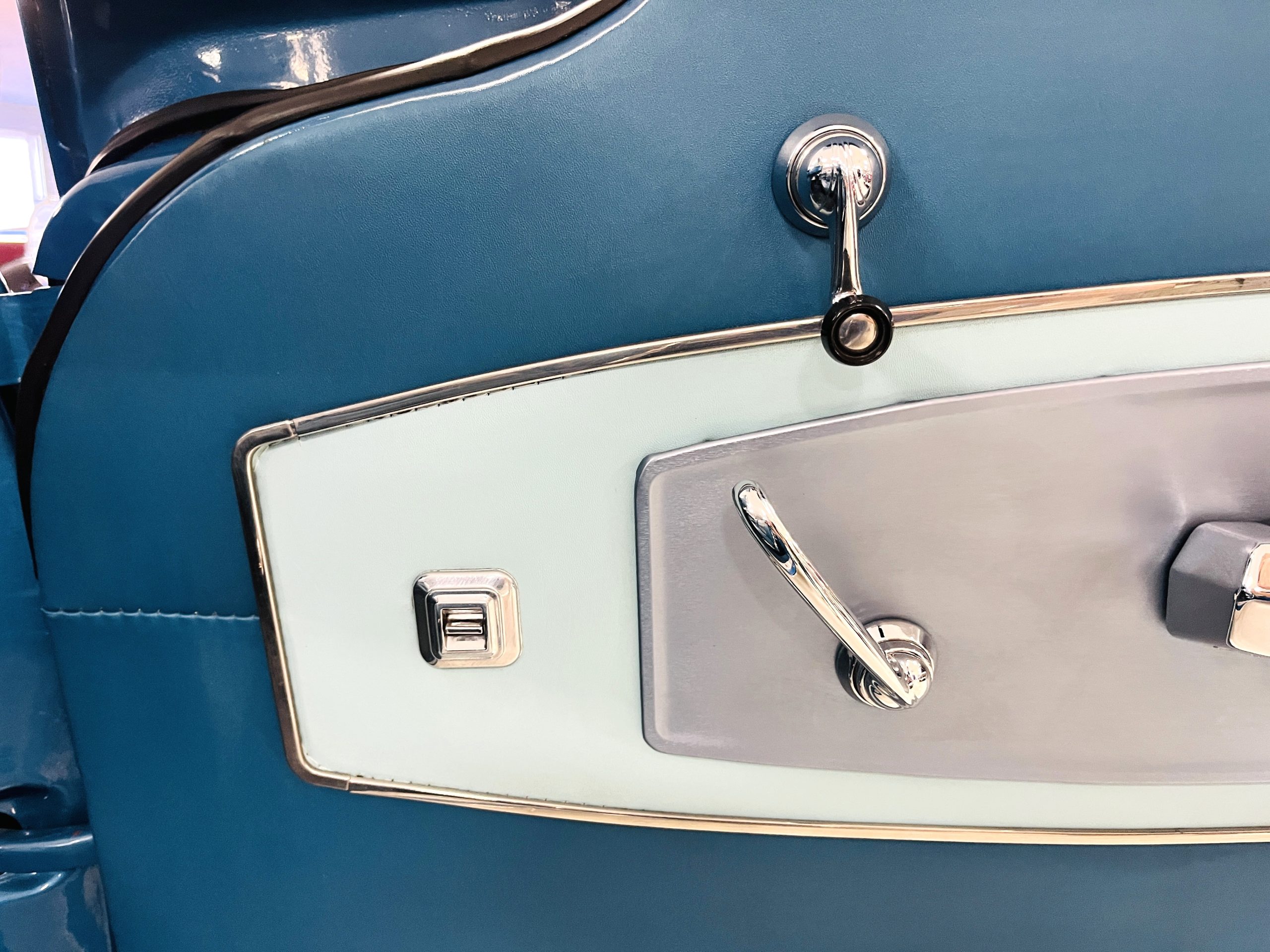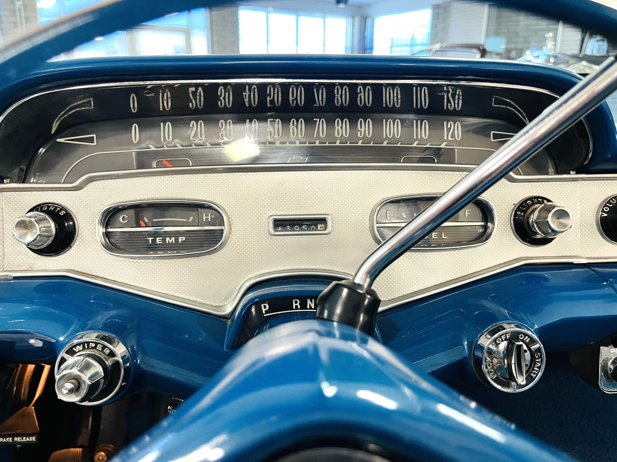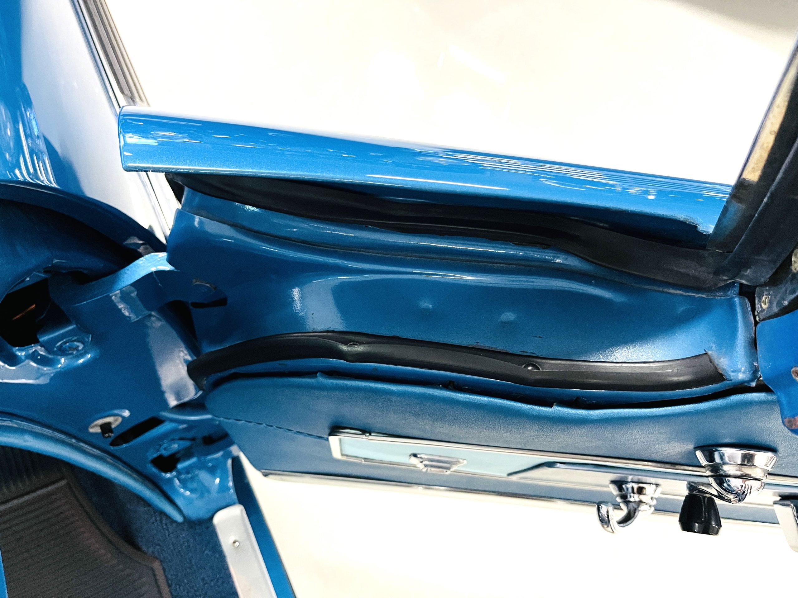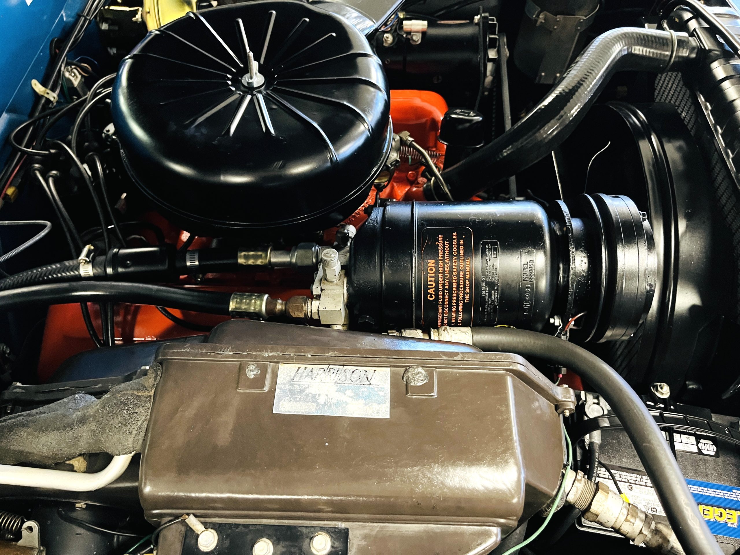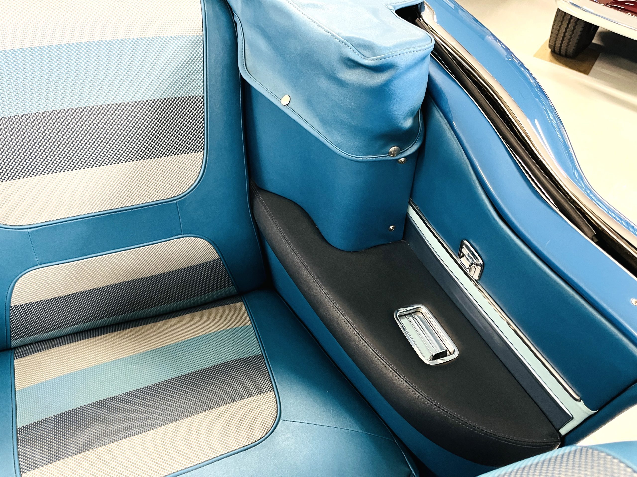 The interior is dressed in the original trim color gray/blue (trim code 823) cloth and vinyl and is in excellent condition. The carpeting is all as-new in a beautiful vibrant blue. The floor mats are in excellent condition. The front manual bench seat is equipped with seatbelts. All the gauges are functioning and the radio works. The dash is beautiful and comes with a built-in clock on the passenger side.