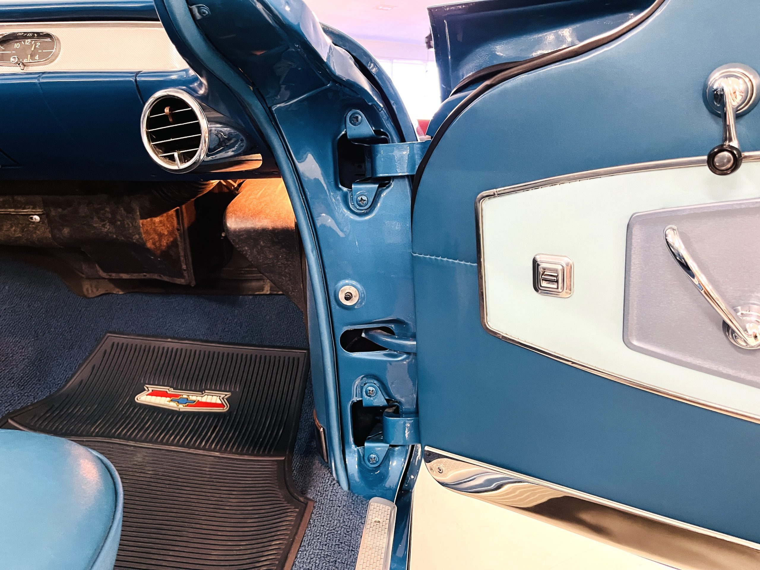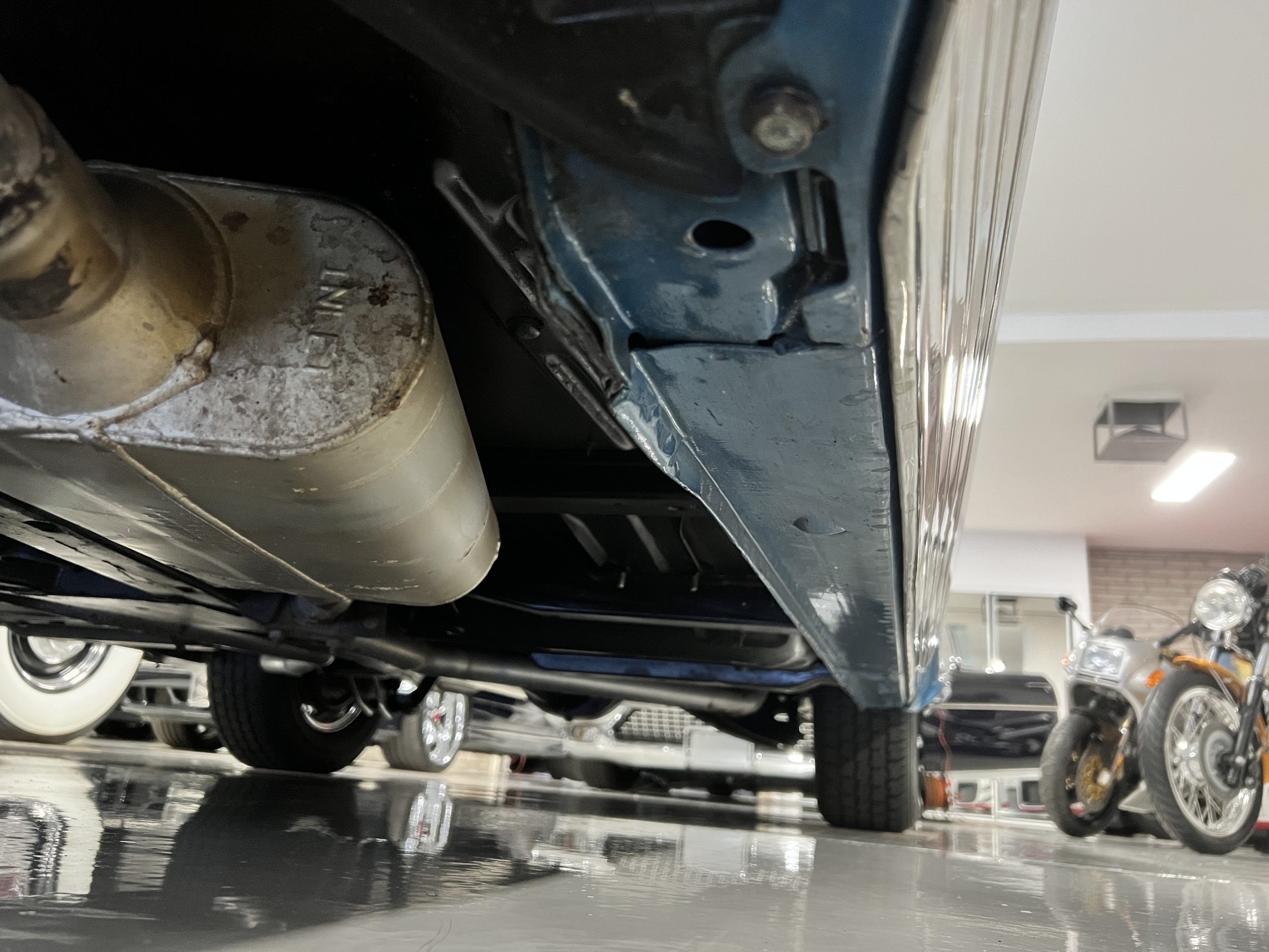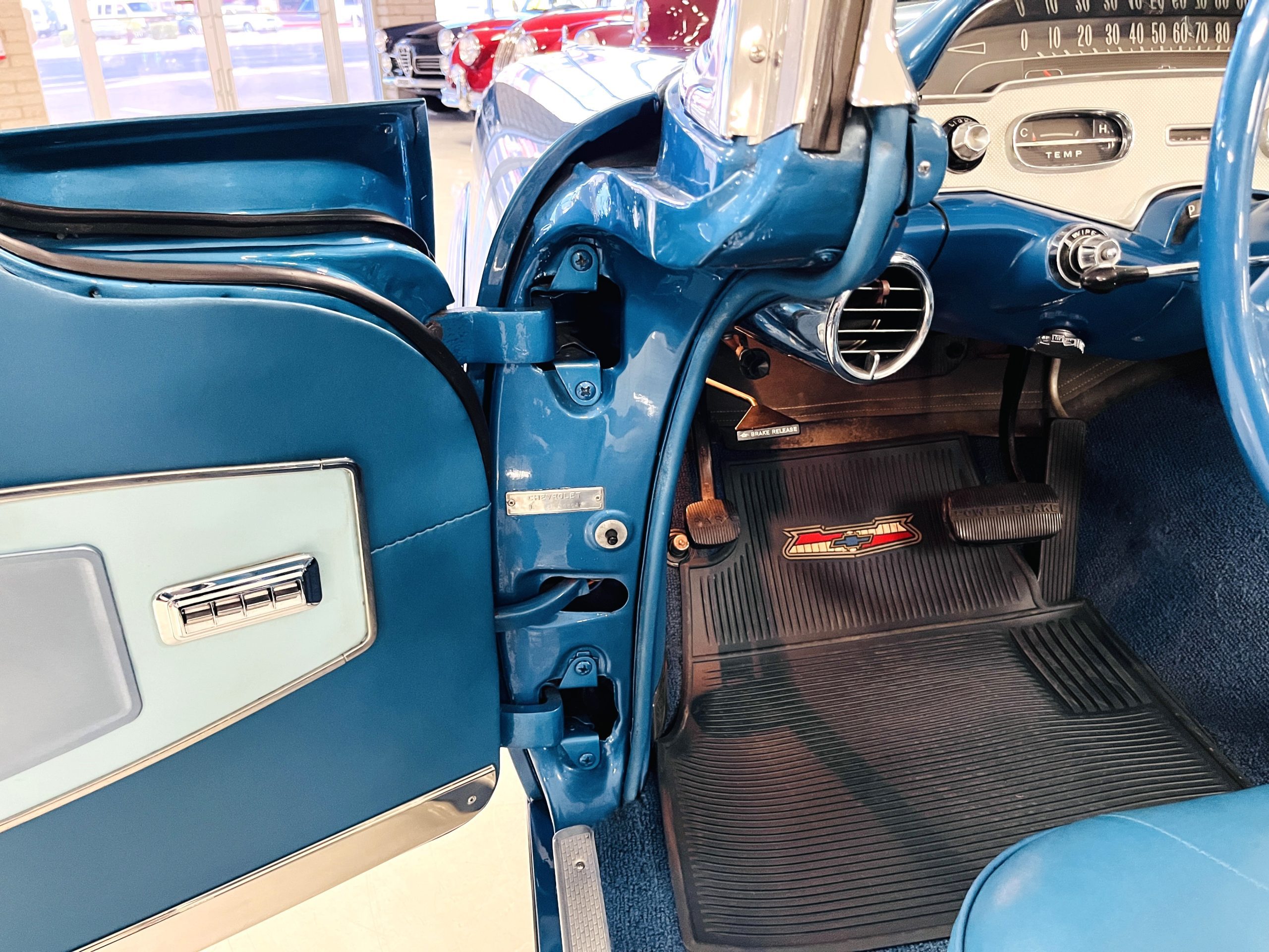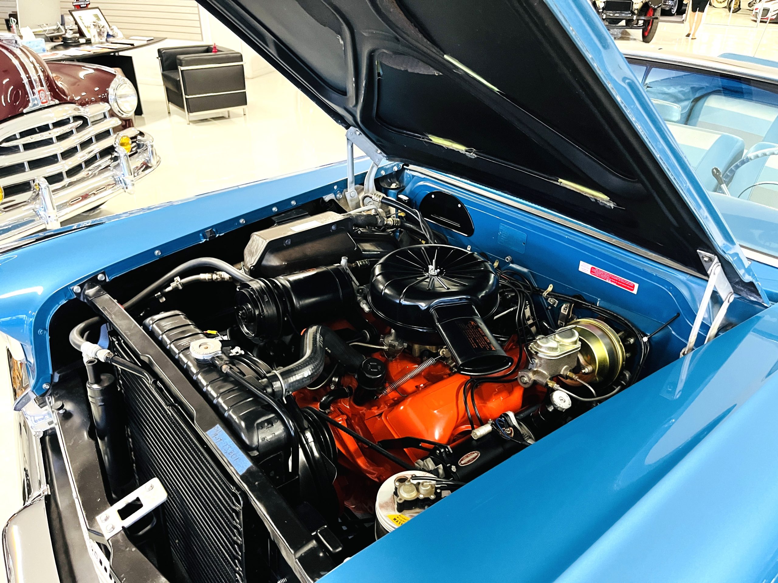 The interior is dressed in the original trim color gray/blue (trim code 823) cloth and vinyl and is in excellent condition. The carpeting is all as-new in a beautiful vibrant blue. The floor mats are in excellent condition. The front manual bench seat is equipped with seatbelts. All the gauges are functioning and the radio works. The dash is beautiful and comes with a built-in clock on the passenger side.