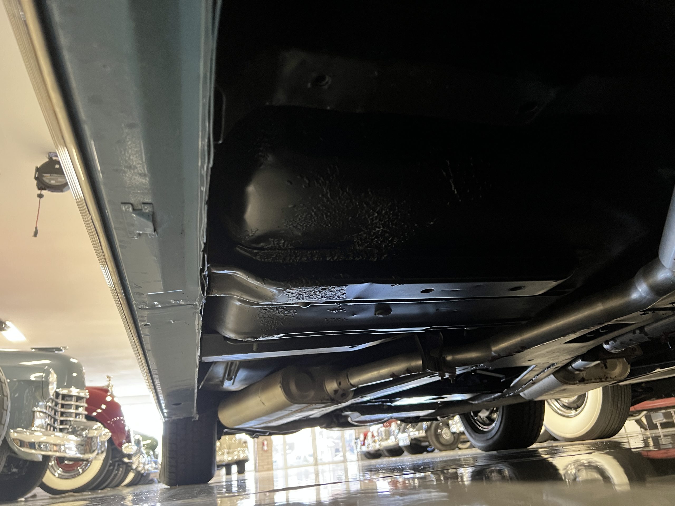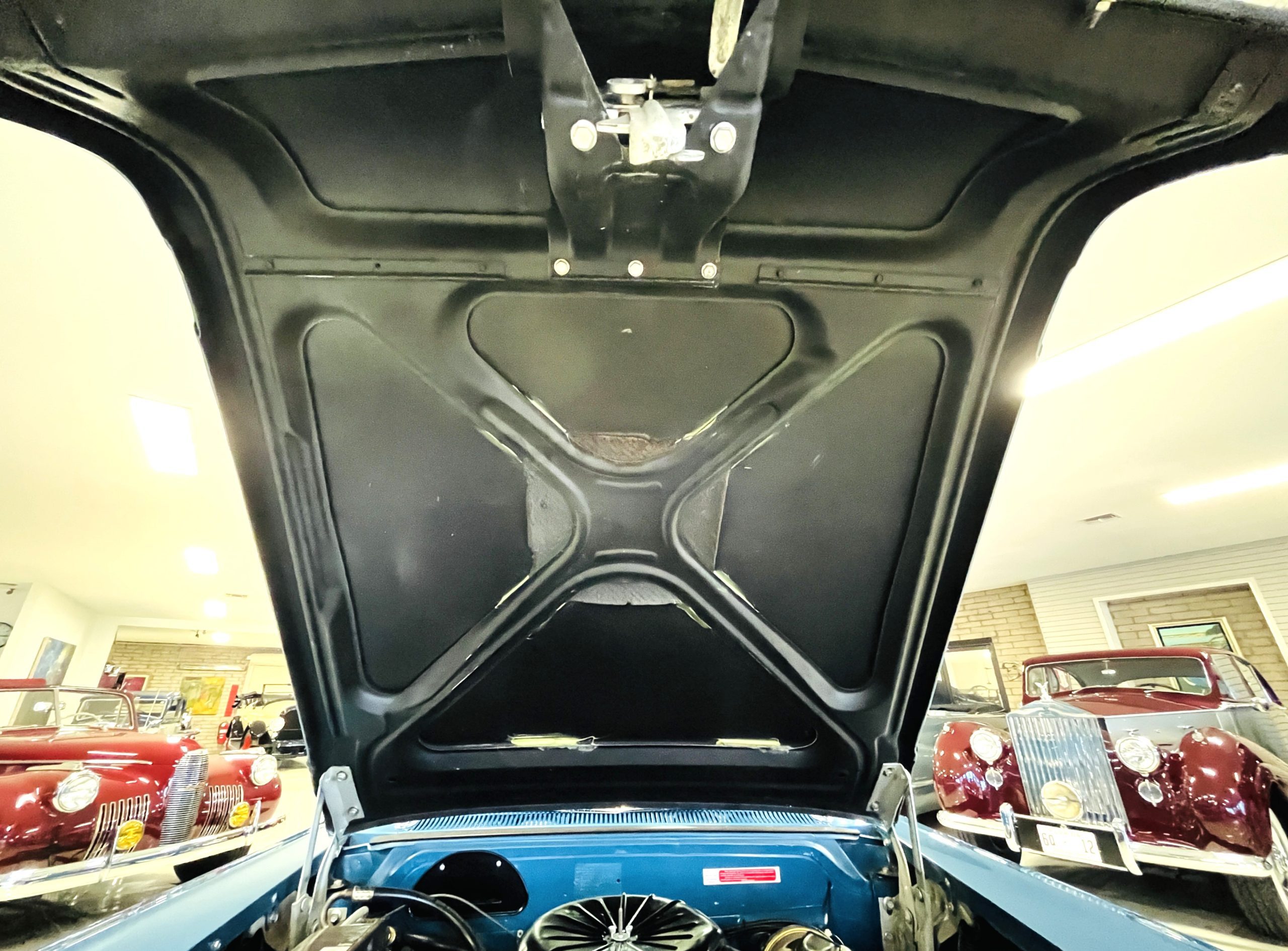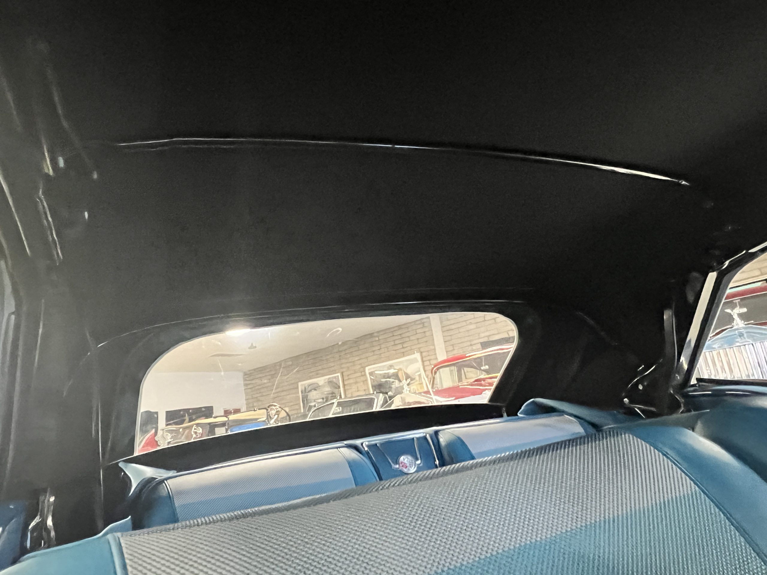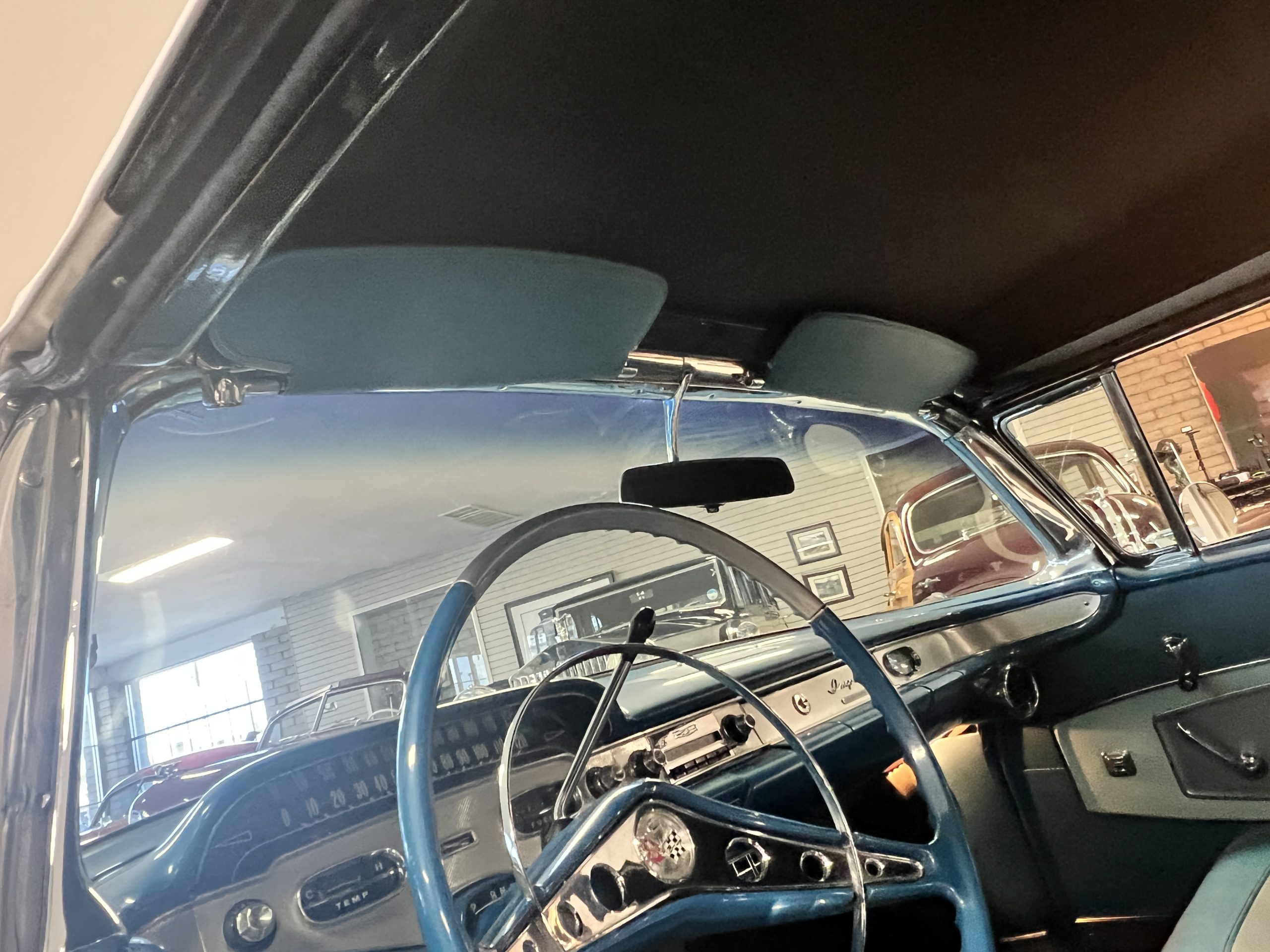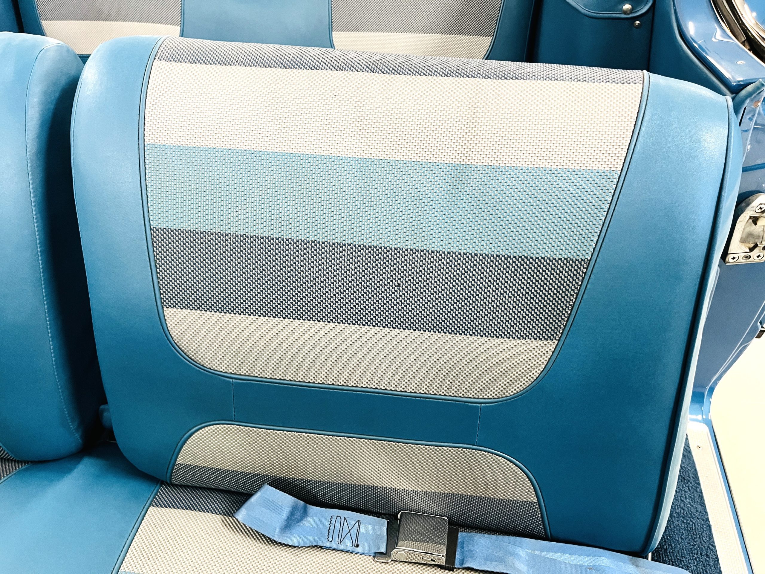 The interior is dressed in the original trim color gray/blue (trim code 823) cloth and vinyl and is in excellent condition. The carpeting is all as-new in a beautiful vibrant blue. The floor mats are in excellent condition. The front manual bench seat is equipped with seatbelts. All the gauges are functioning and the radio works. The dash is beautiful and comes with a built-in clock on the passenger side.