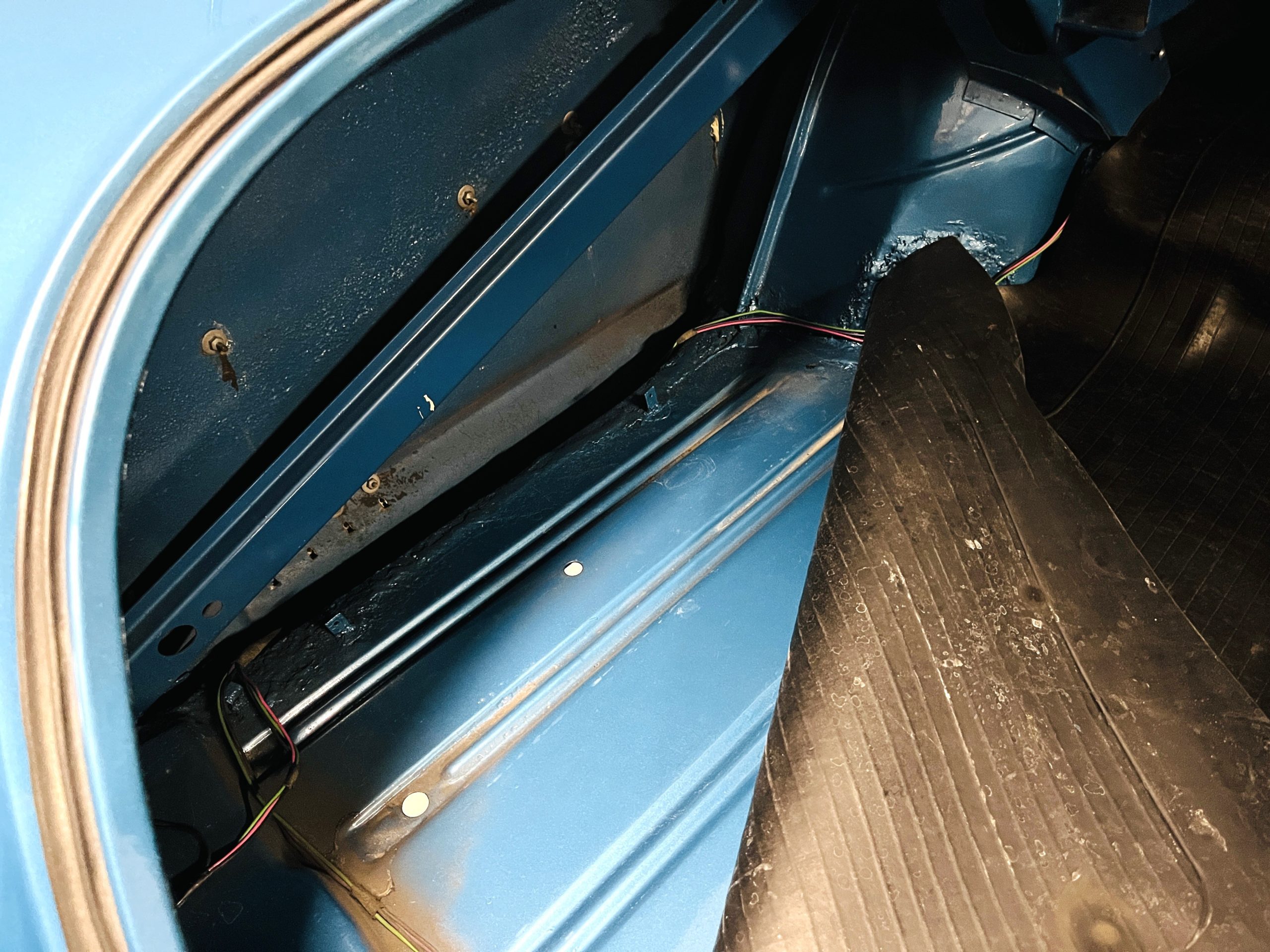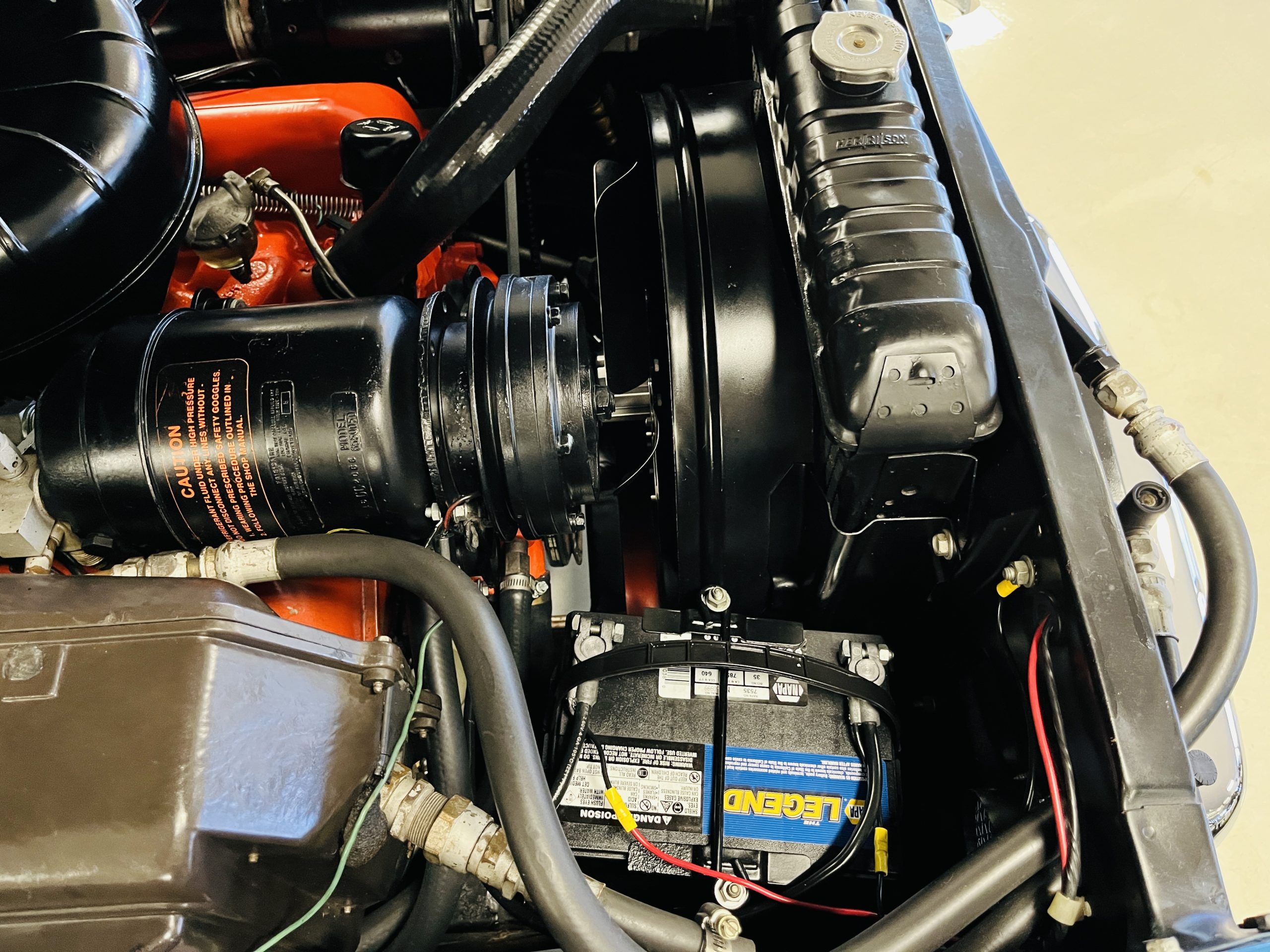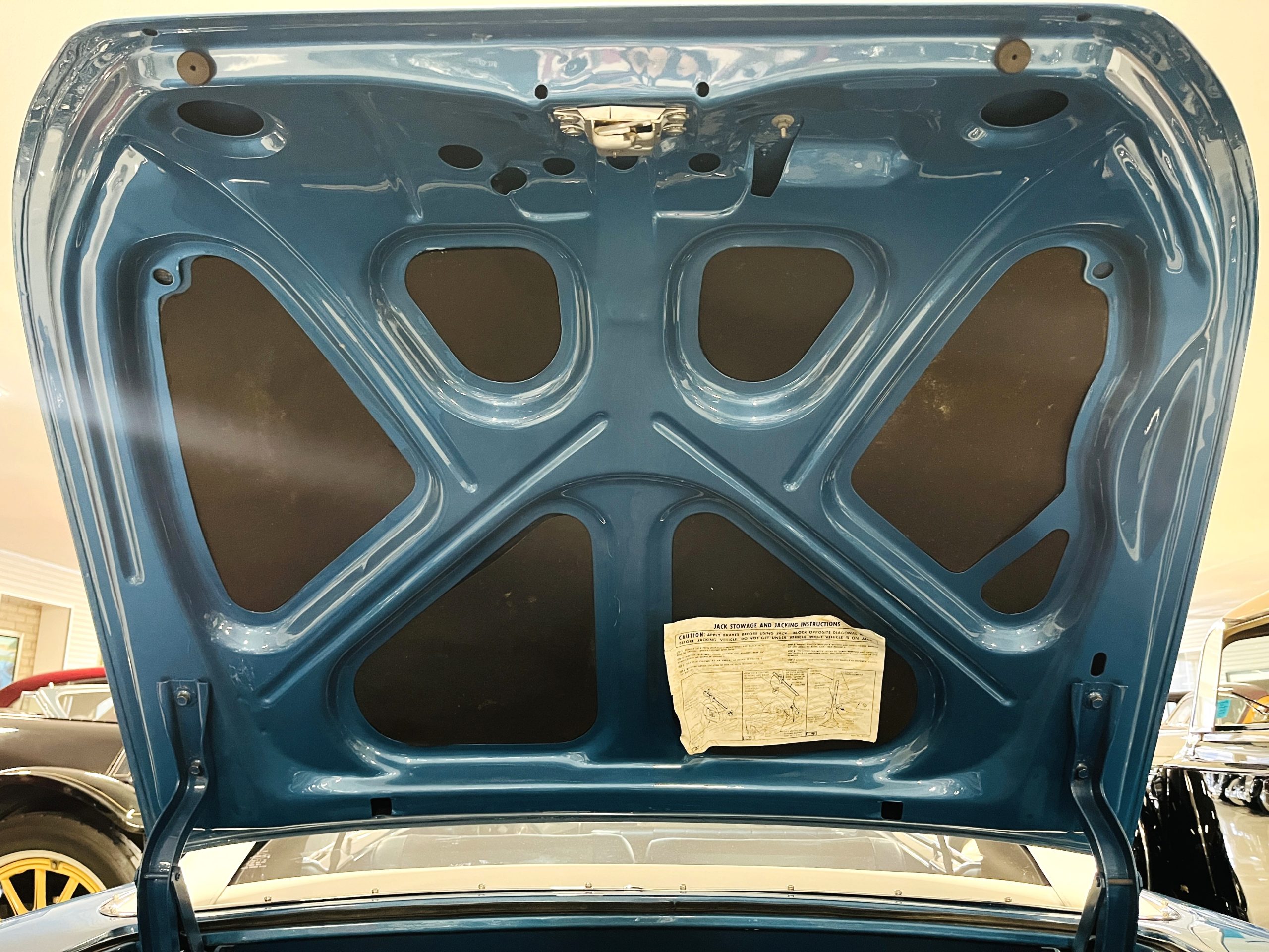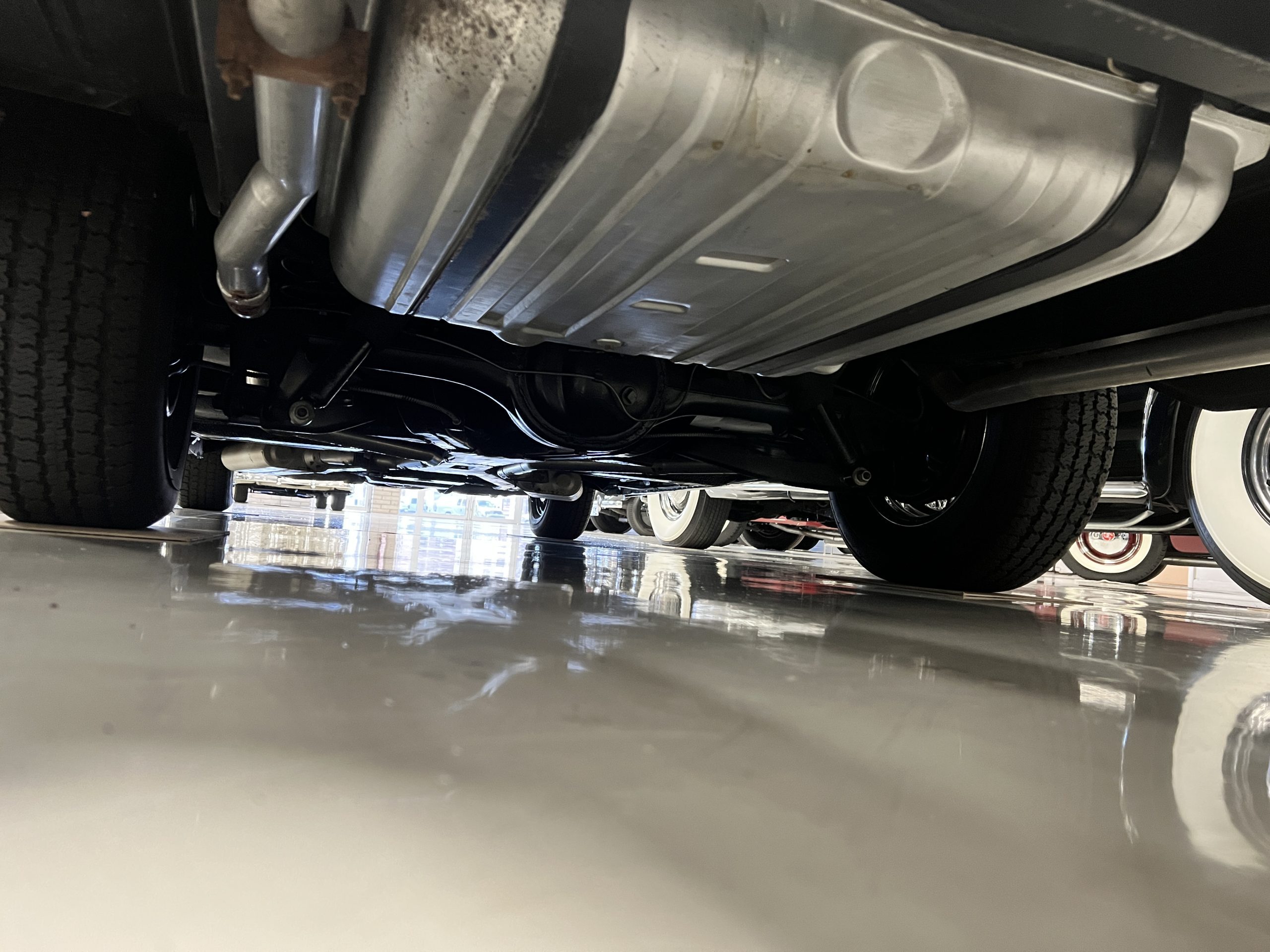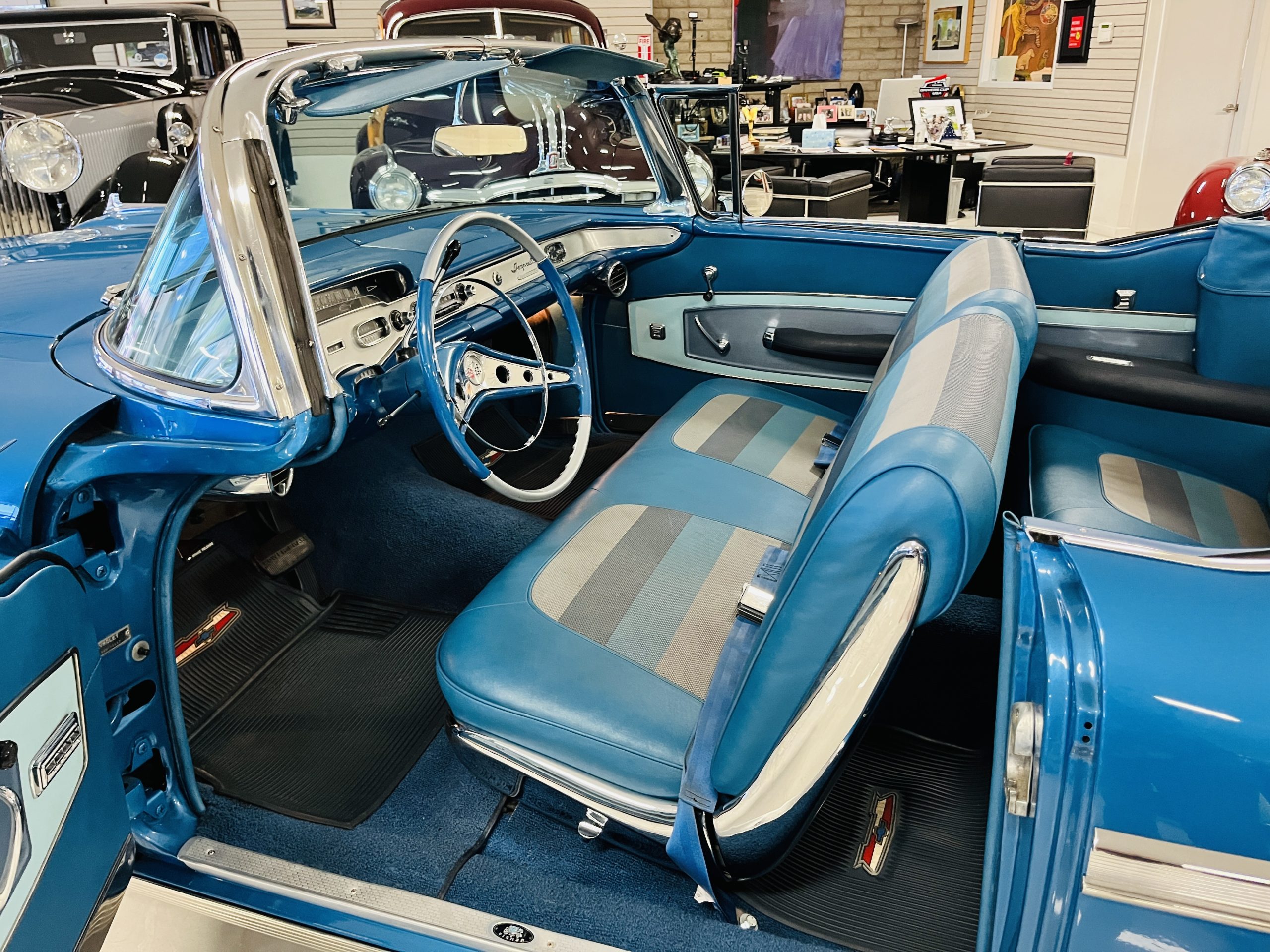 The interior is dressed in the original trim color gray/blue (trim code 823) cloth and vinyl and is in excellent condition. The carpeting is all as-new in a beautiful vibrant blue. The floor mats are in excellent condition. The front manual bench seat is equipped with seatbelts. All the gauges are functioning and the radio works. The dash is beautiful and comes with a built-in clock on the passenger side.