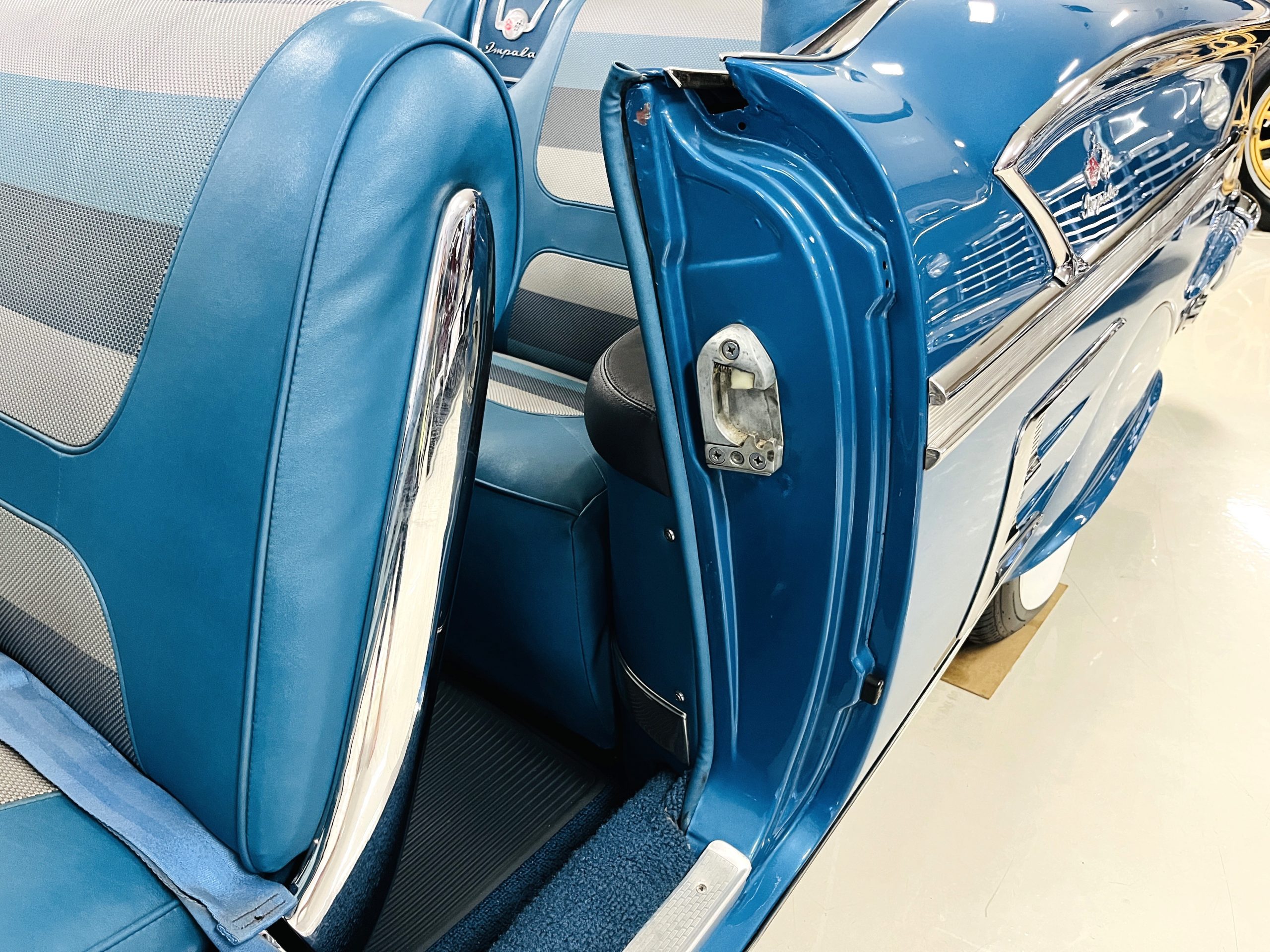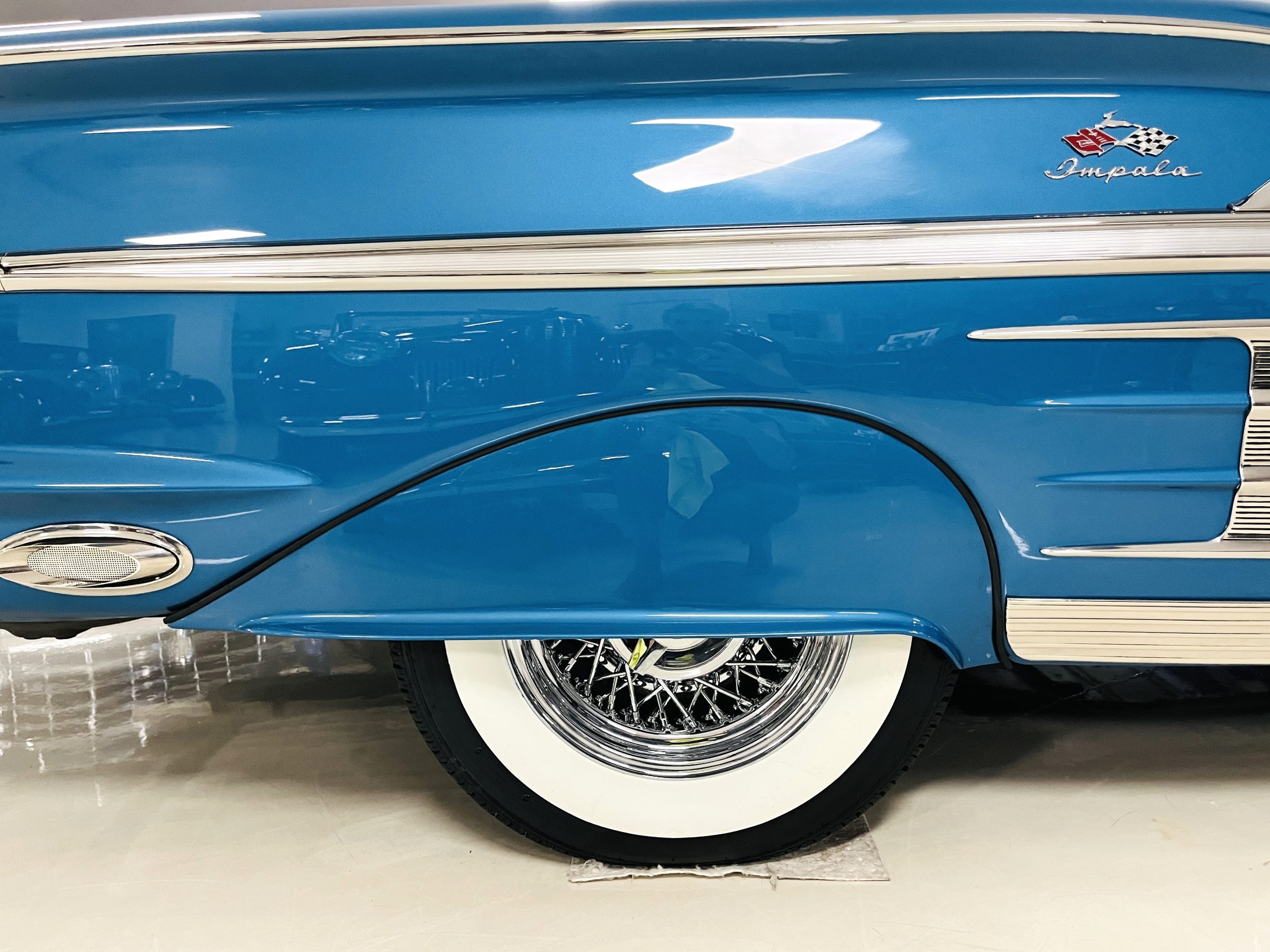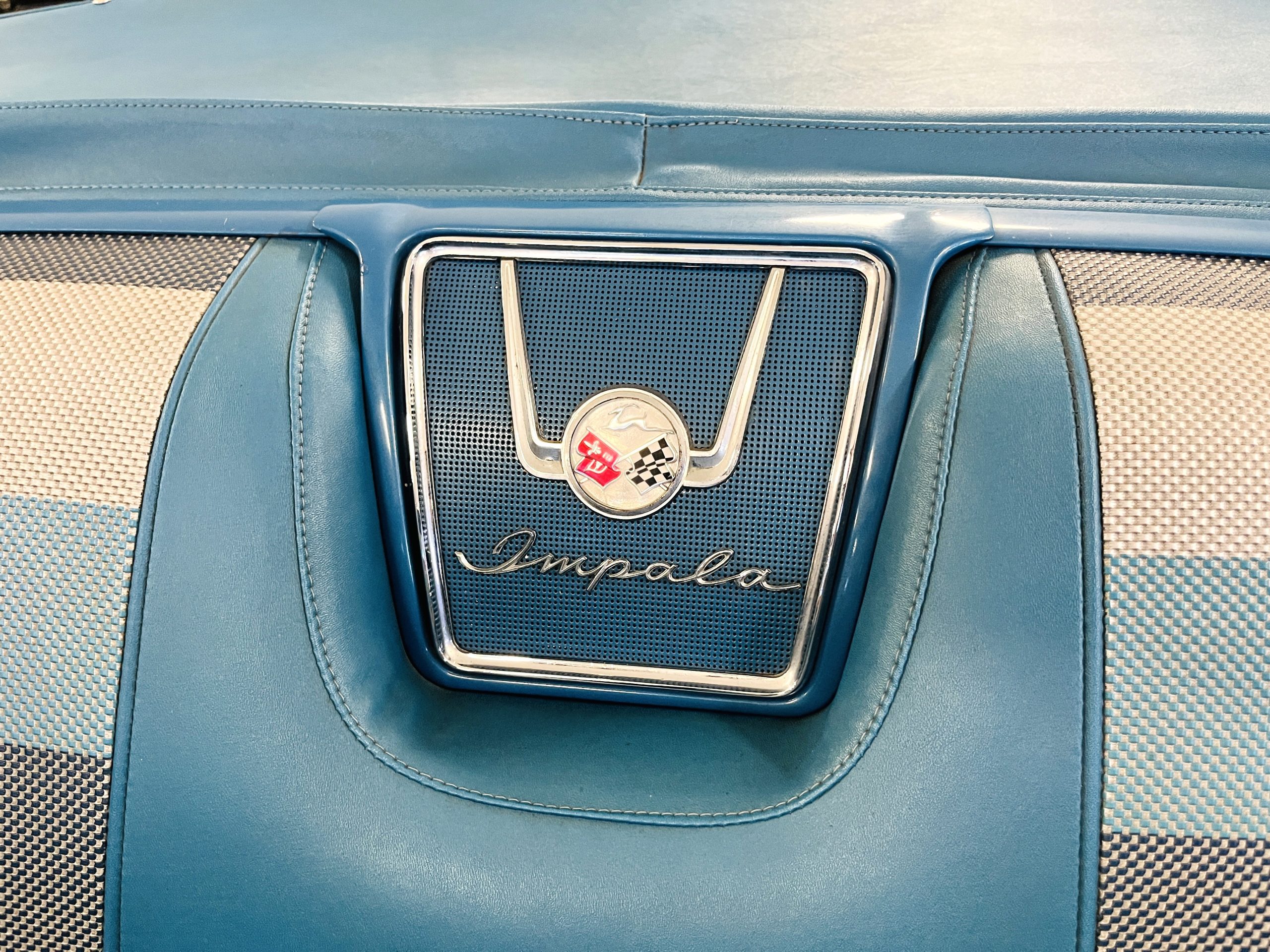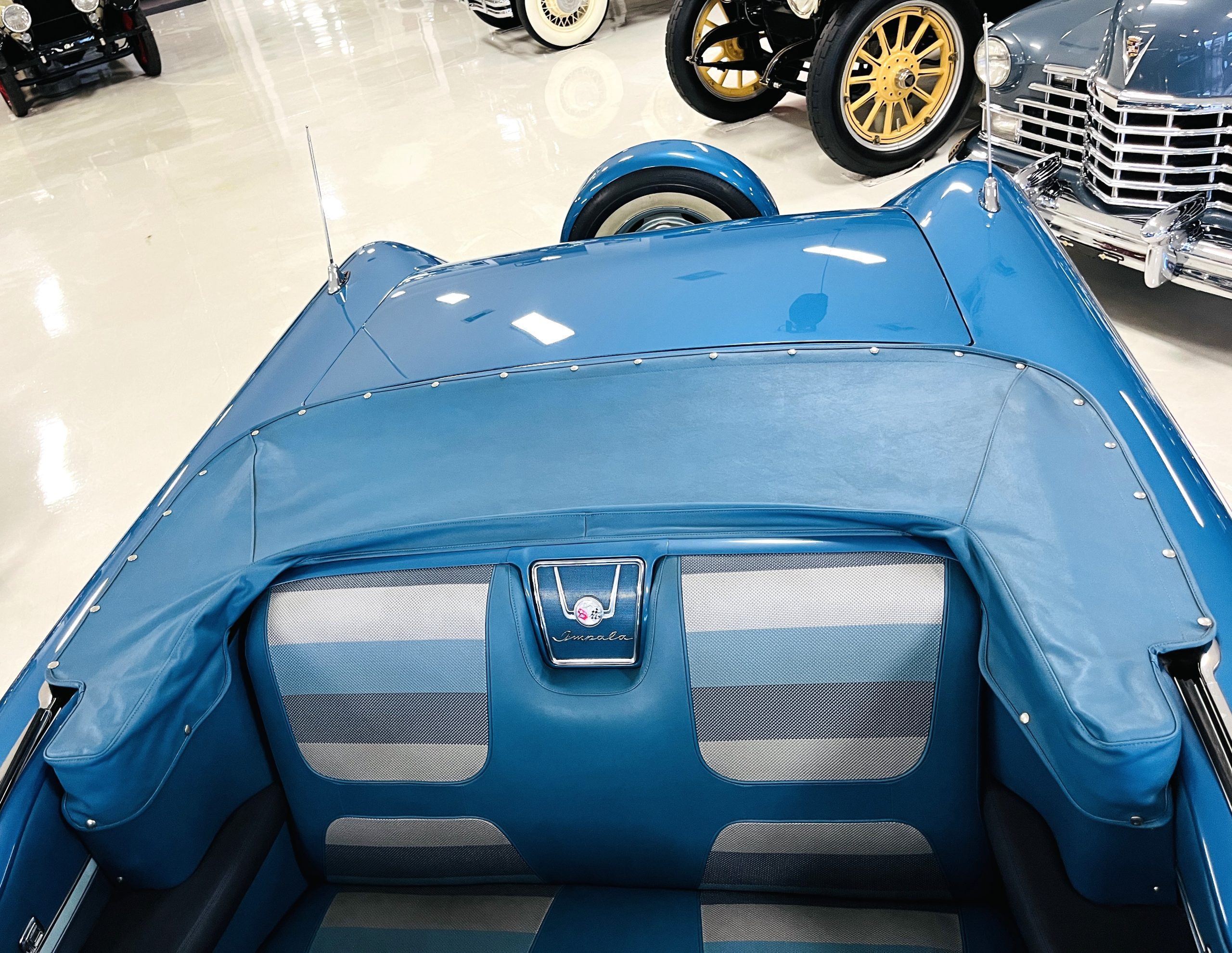 The livery has been repainted in a stunning Fathom Blue versus its original Silver Blue metallic (Paint Code 930). The paint has excellent shine and luster and is stunning. The chrome and stainless are in excellent condition. The paint and chrome are complimented by the chrome wire wheels and wide white wall radial tires. This Impala comes well equipped with dual side mirrors, dual power antenna, and continental kit. The powered white vinyl convertible top is in excellent condition and operates smoothly.