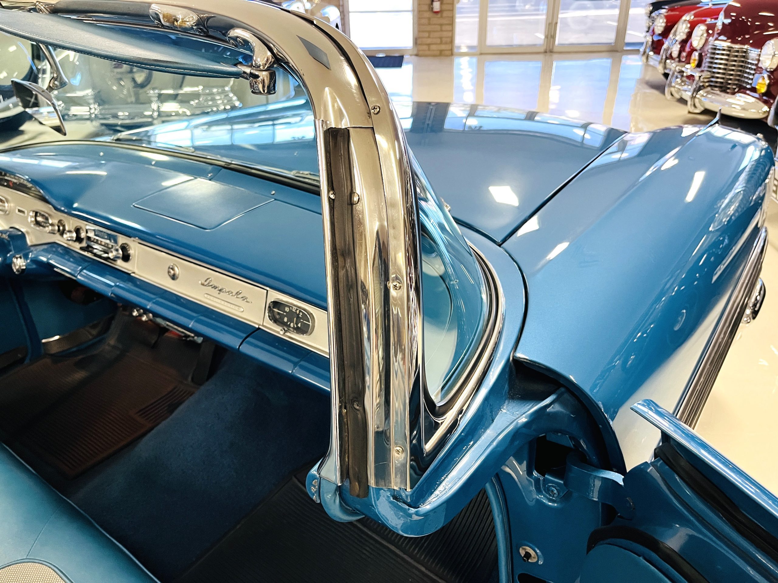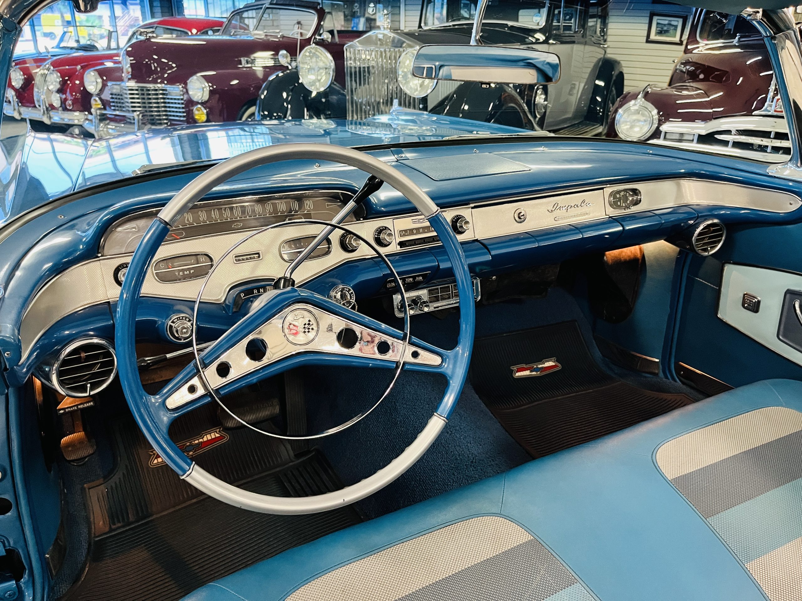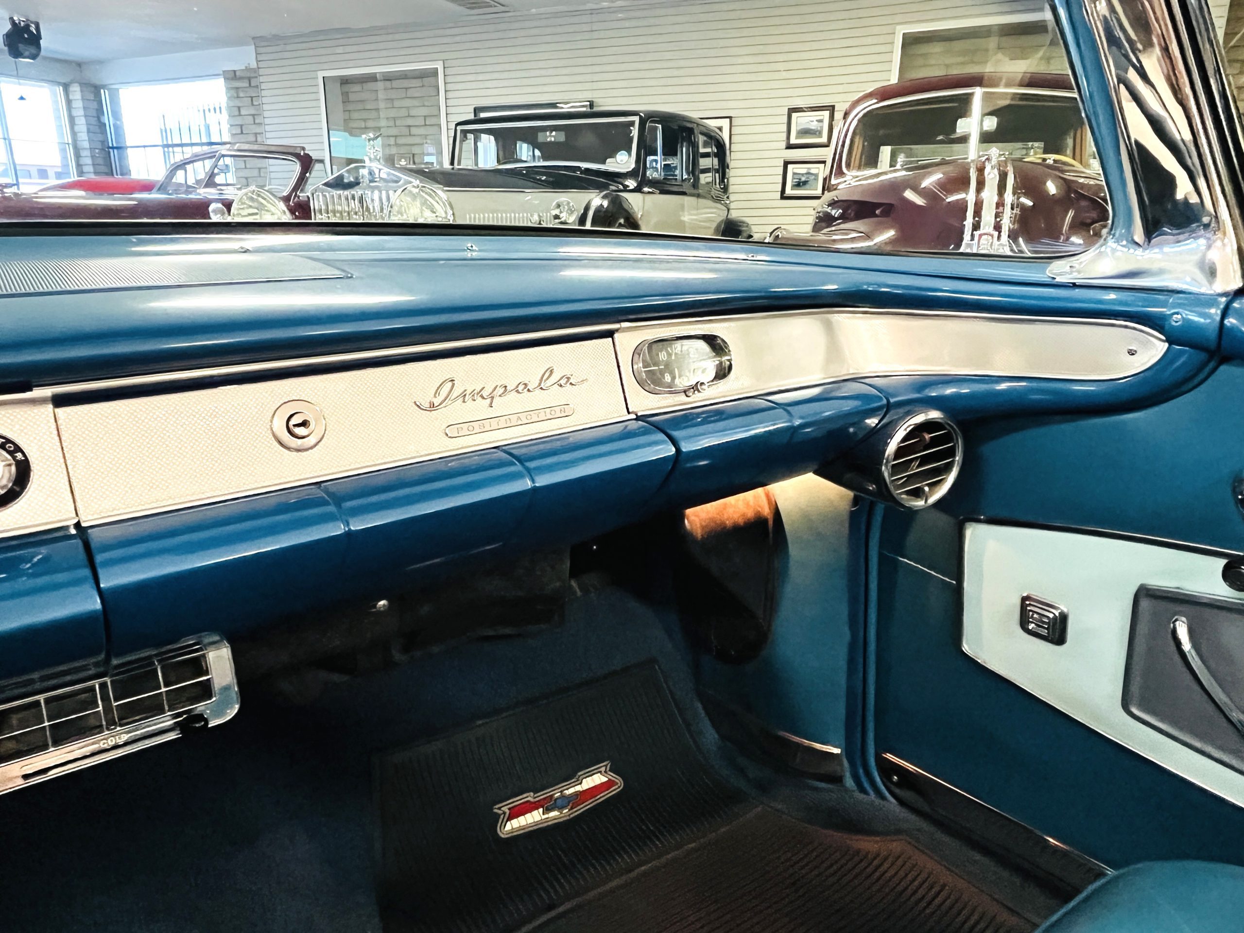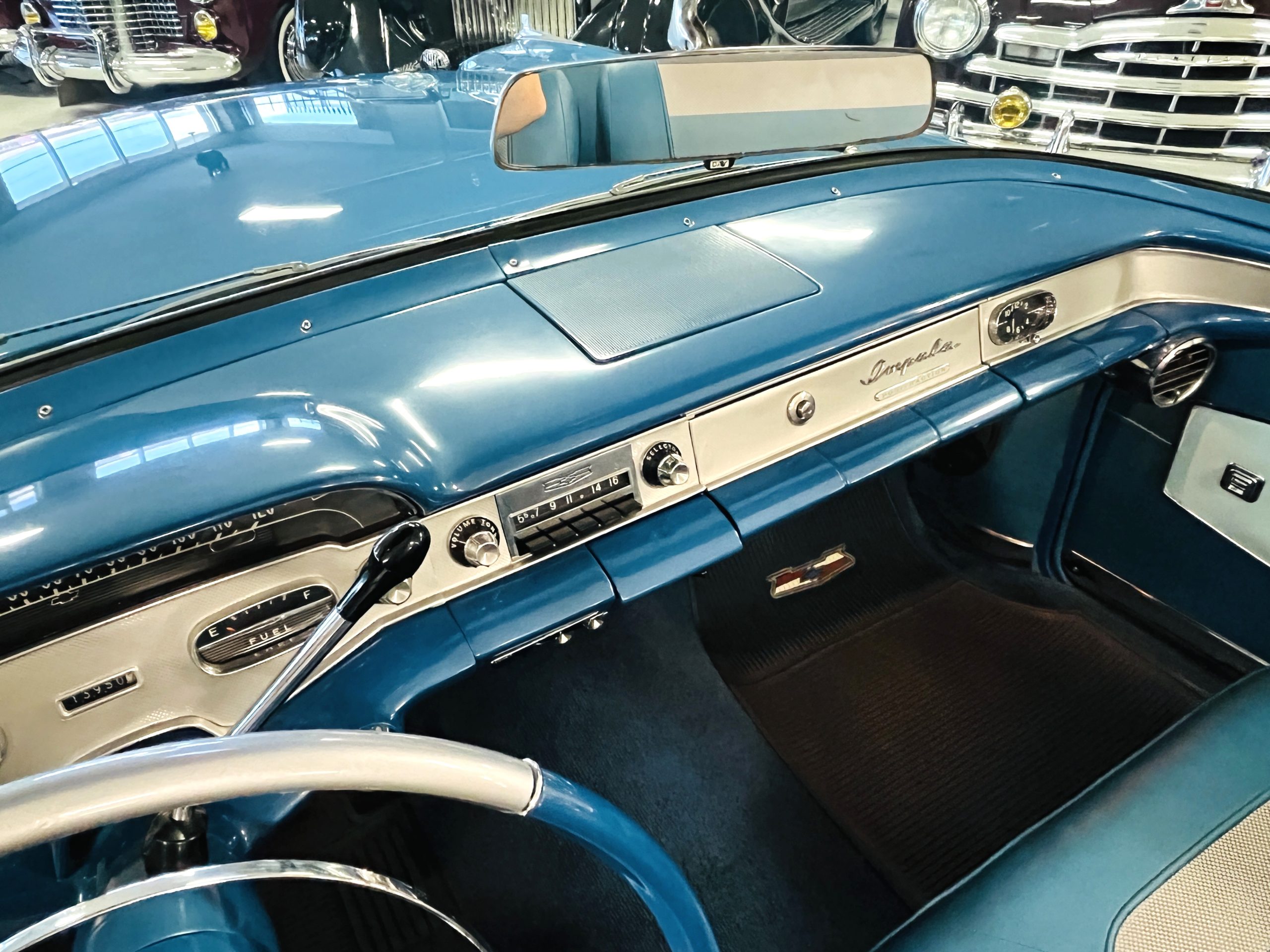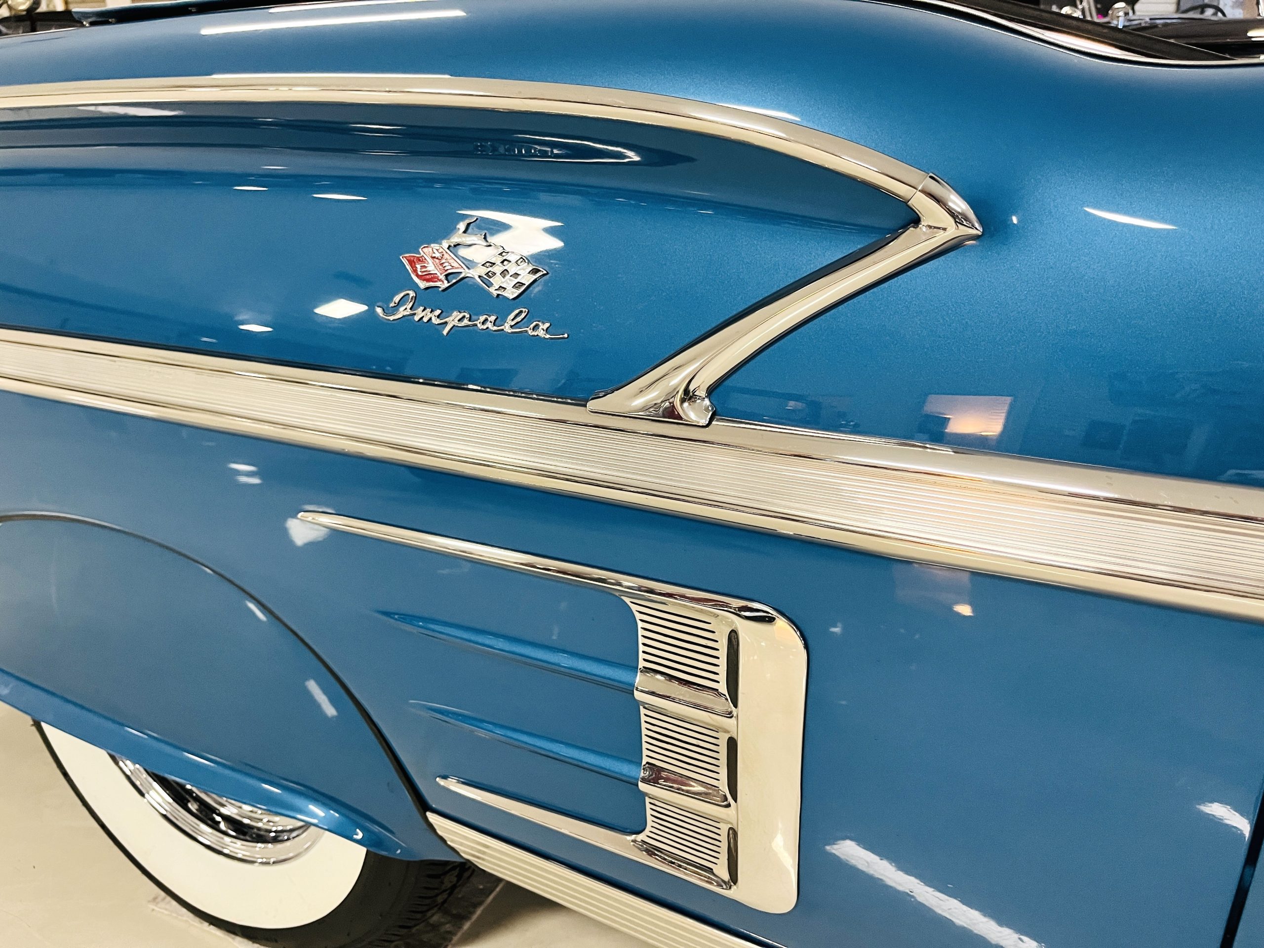 The livery has been repainted in a stunning Fathom Blue versus its original Silver Blue metallic (Paint Code 930). The paint has excellent shine and luster and is stunning. The chrome and stainless are in excellent condition. The paint and chrome are complimented by the chrome wire wheels and wide white wall radial tires. This Impala comes well equipped with dual side mirrors, dual power antenna, and continental kit. The powered white vinyl convertible top is in excellent condition and operates smoothly.