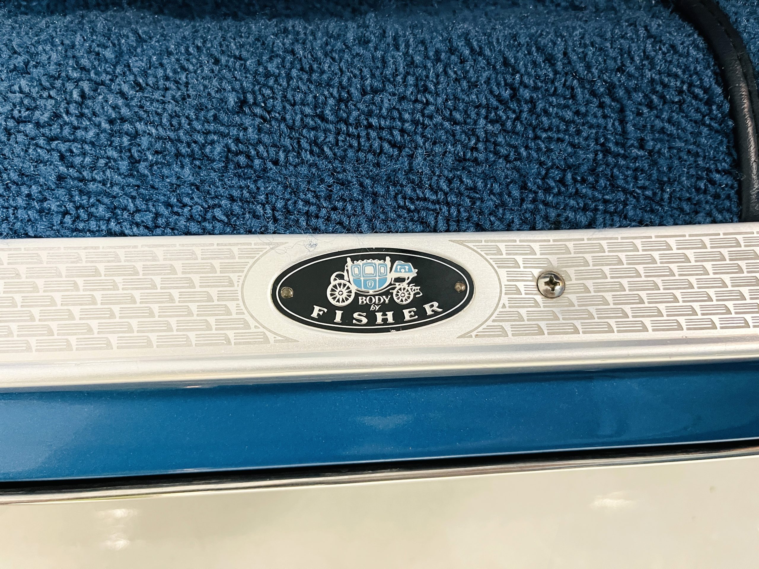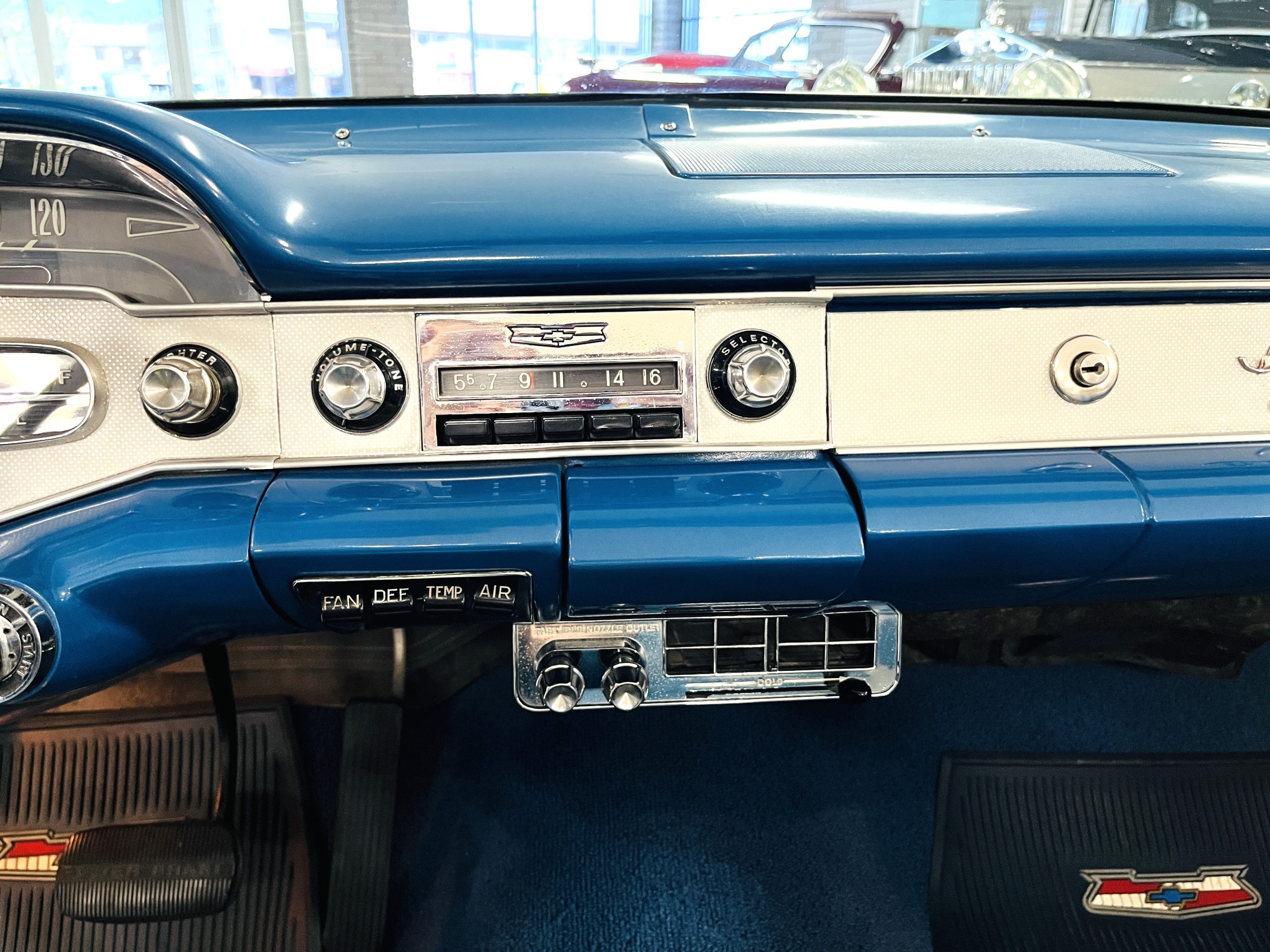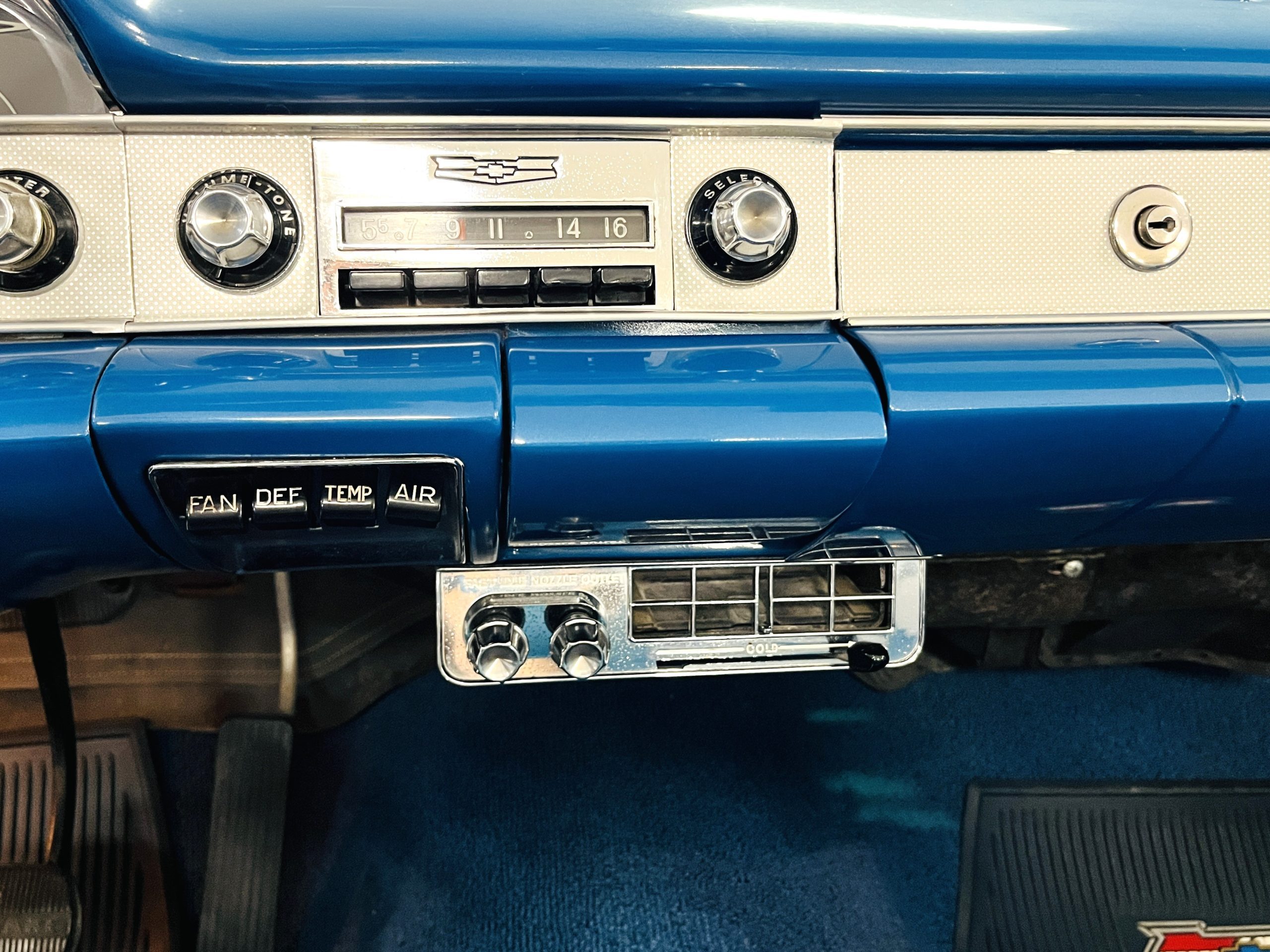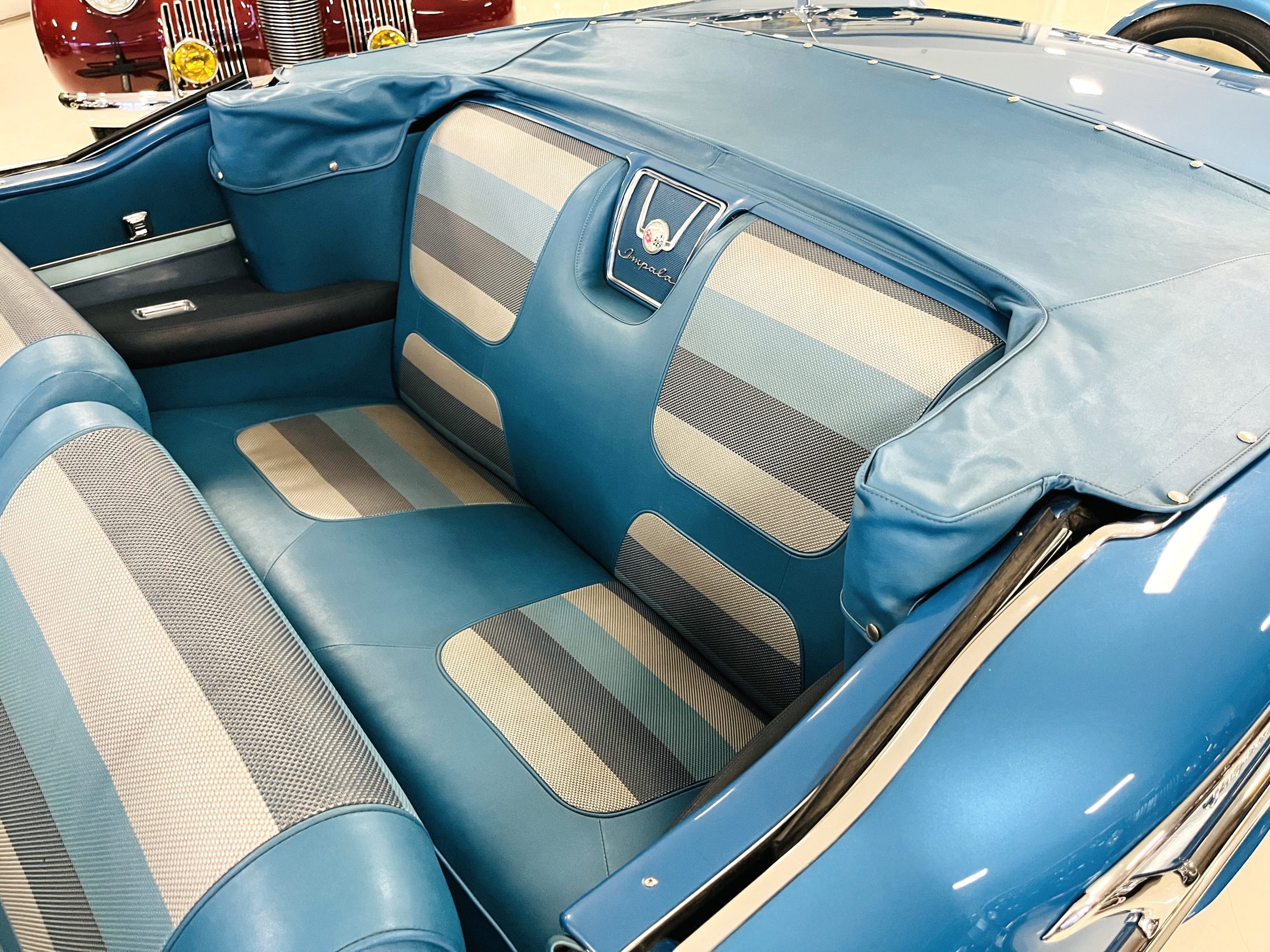 The livery has been repainted in a stunning Fathom Blue versus its original Silver Blue metallic (Paint Code 930). The paint has excellent shine and luster and is stunning. The chrome and stainless are in excellent condition. The paint and chrome are complimented by the chrome wire wheels and wide white wall radial tires. This Impala comes well equipped with dual side mirrors, dual power antenna, and continental kit. The powered white vinyl convertible top is in excellent condition and operates smoothly.