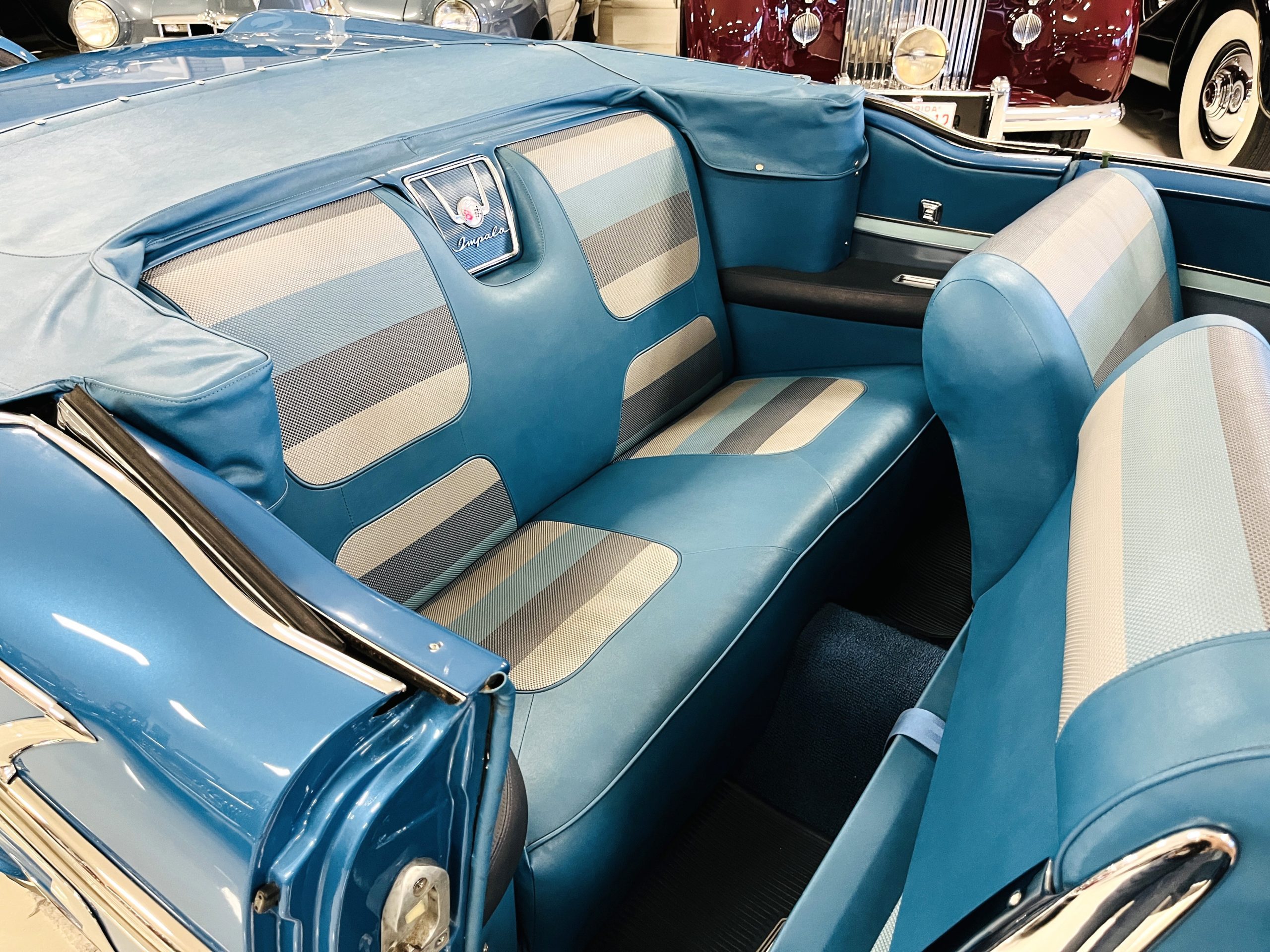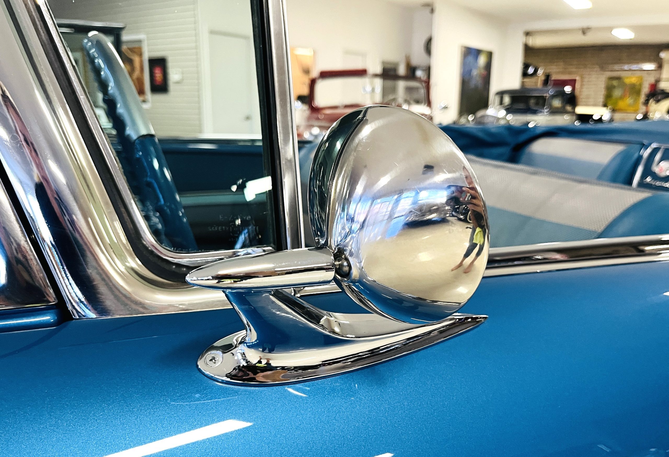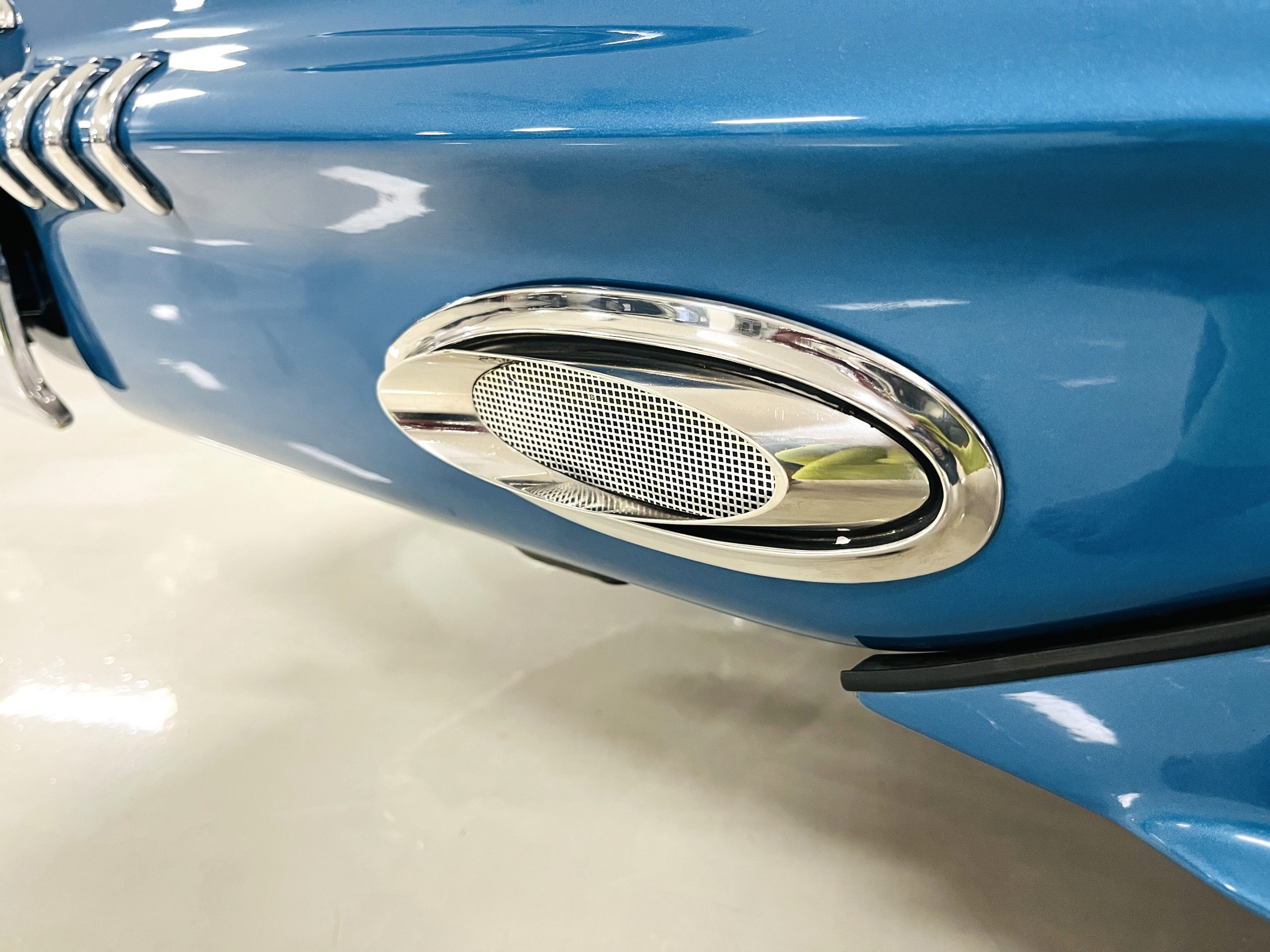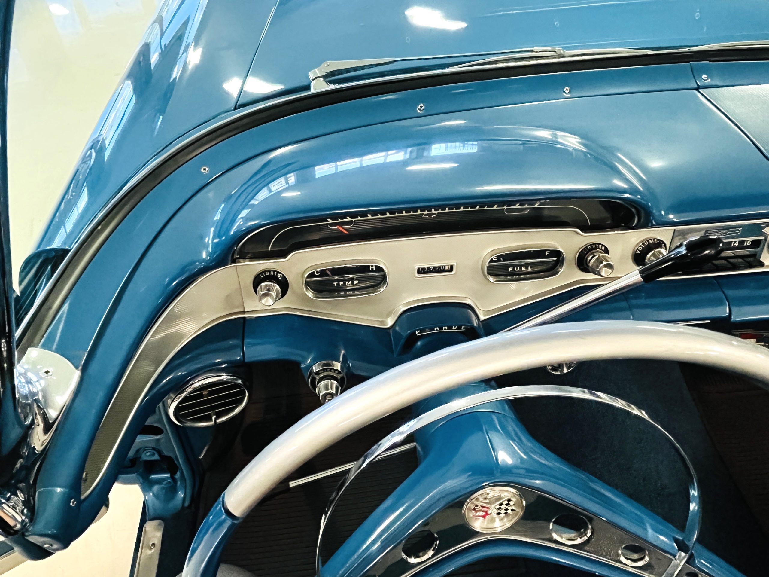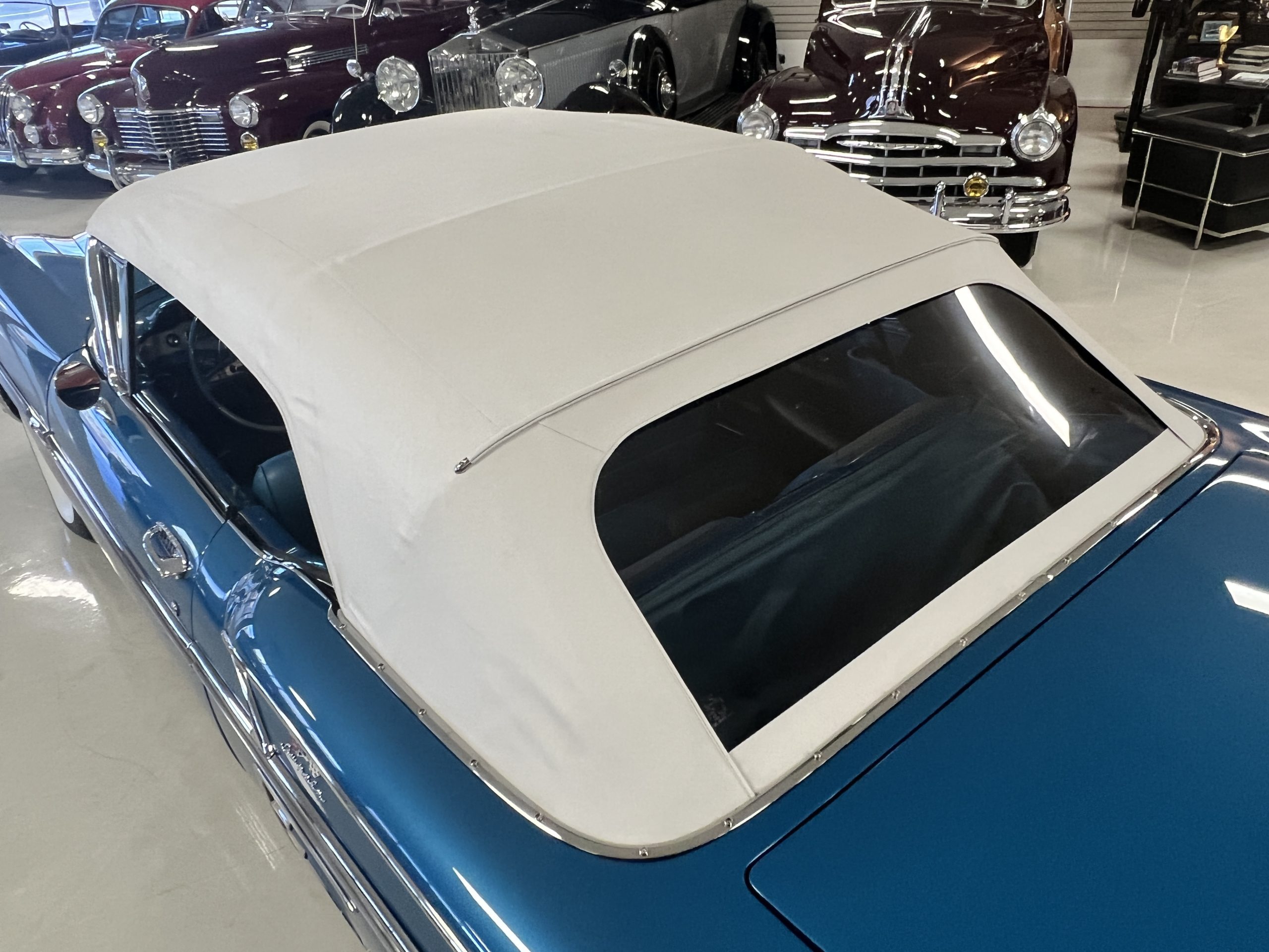The livery has been repainted in a stunning Fathom Blue versus its original Silver Blue metallic (Paint Code 930). The paint has excellent shine and luster and is stunning. The chrome and stainless are in excellent condition. The paint and chrome are complimented by the chrome wire wheels and wide white wall radial tires. This Impala comes well equipped with dual side mirrors, dual power antenna, and continental kit. The powered white vinyl convertible top is in excellent condition and operates smoothly.