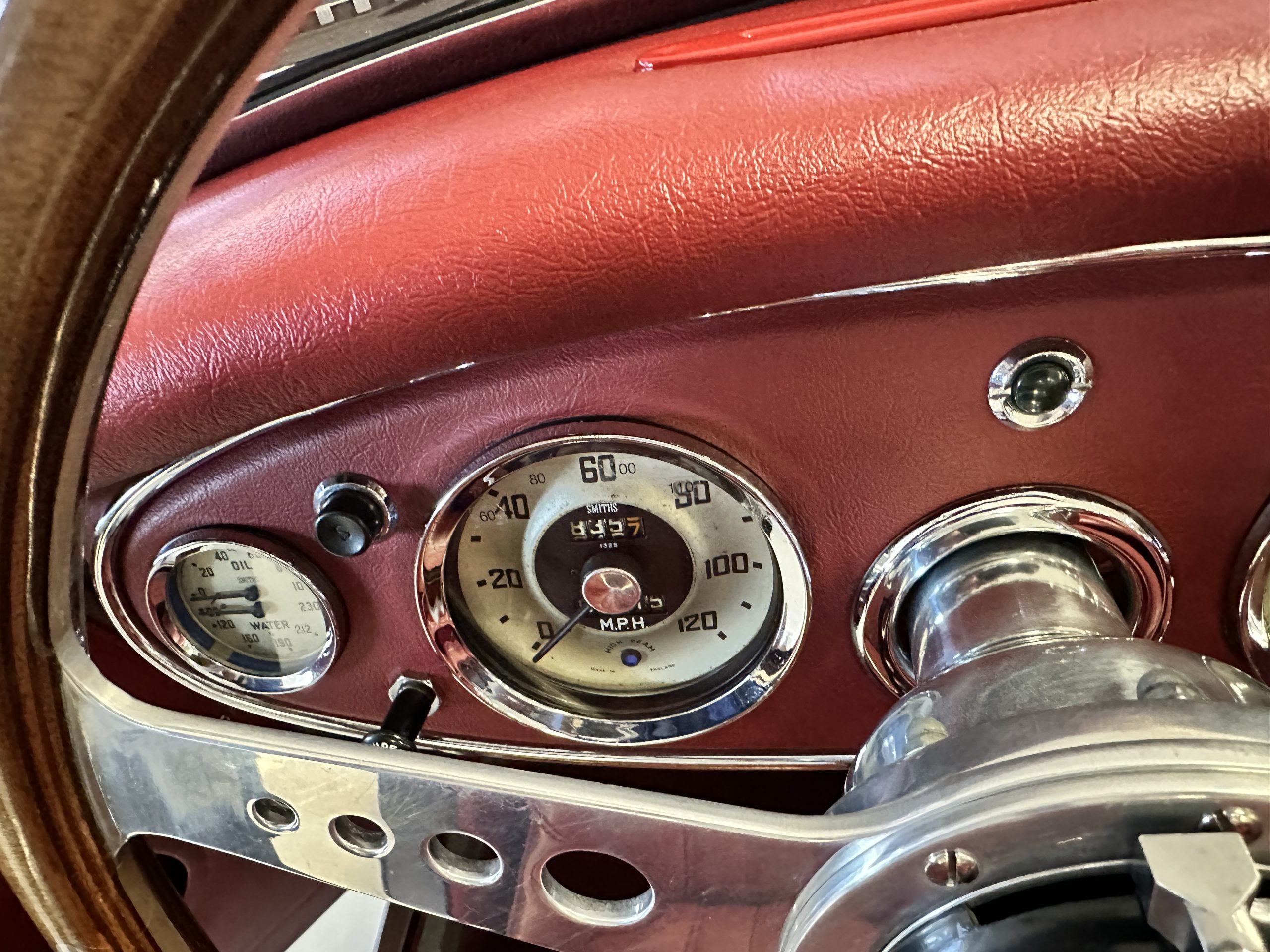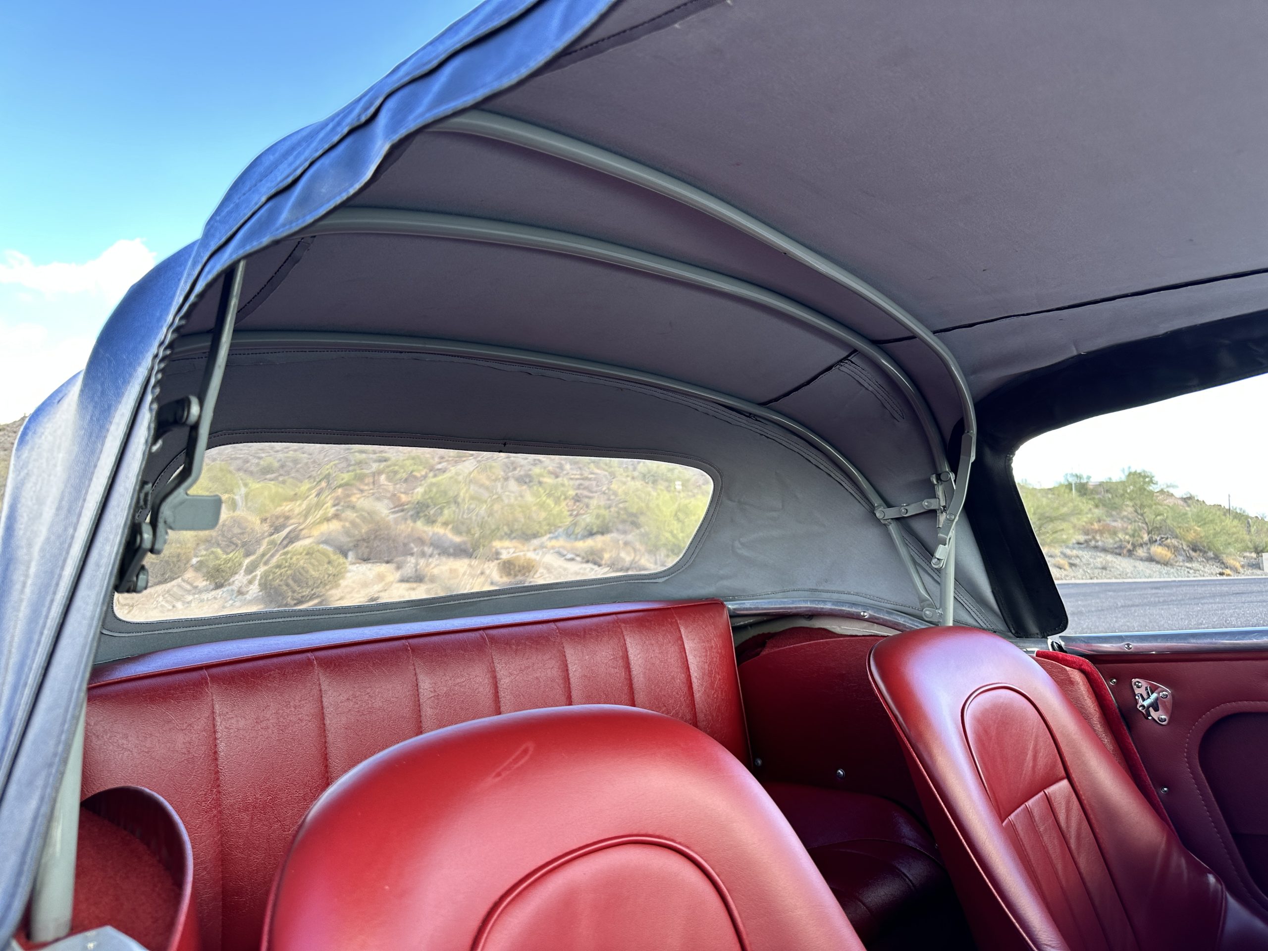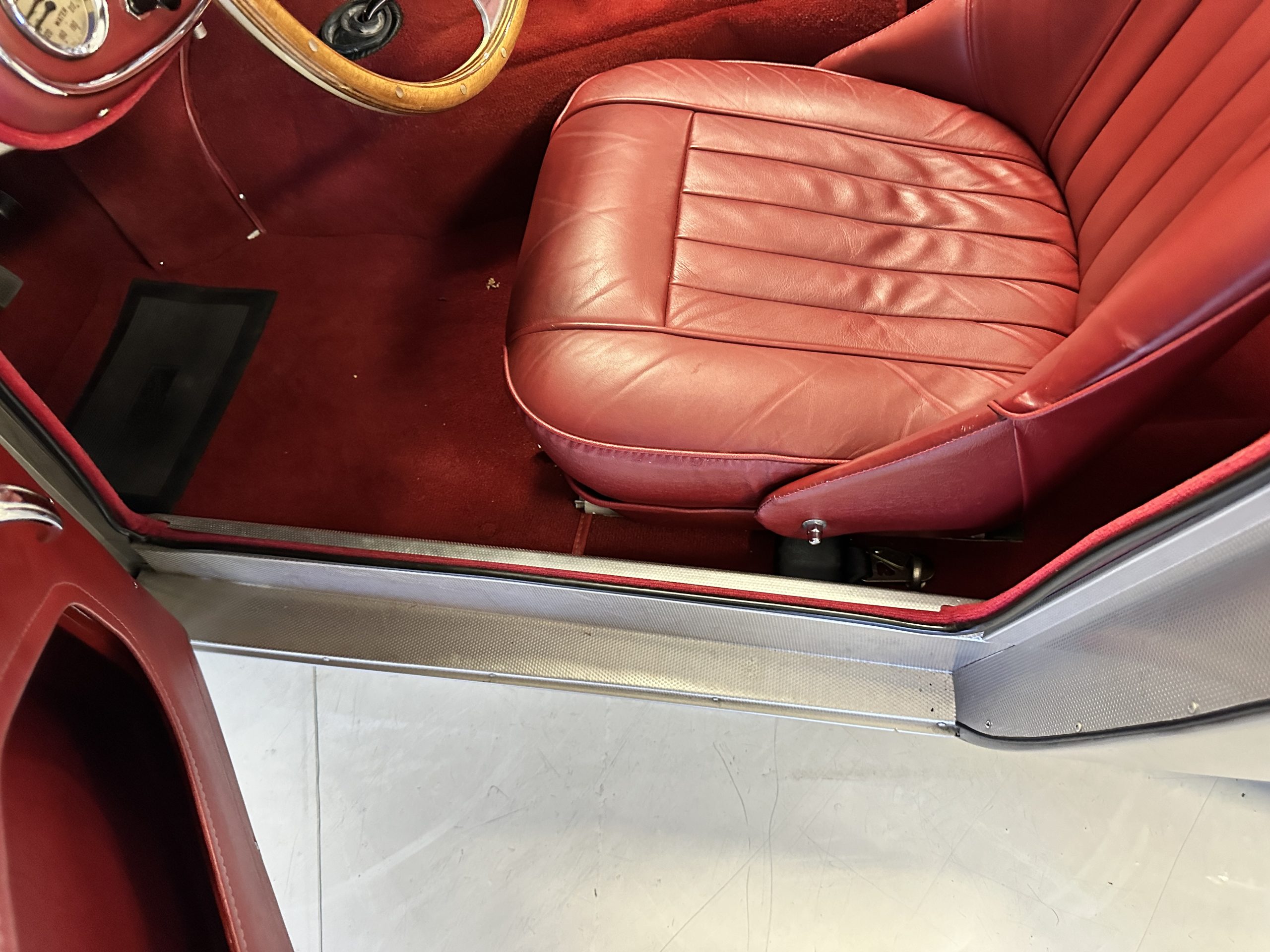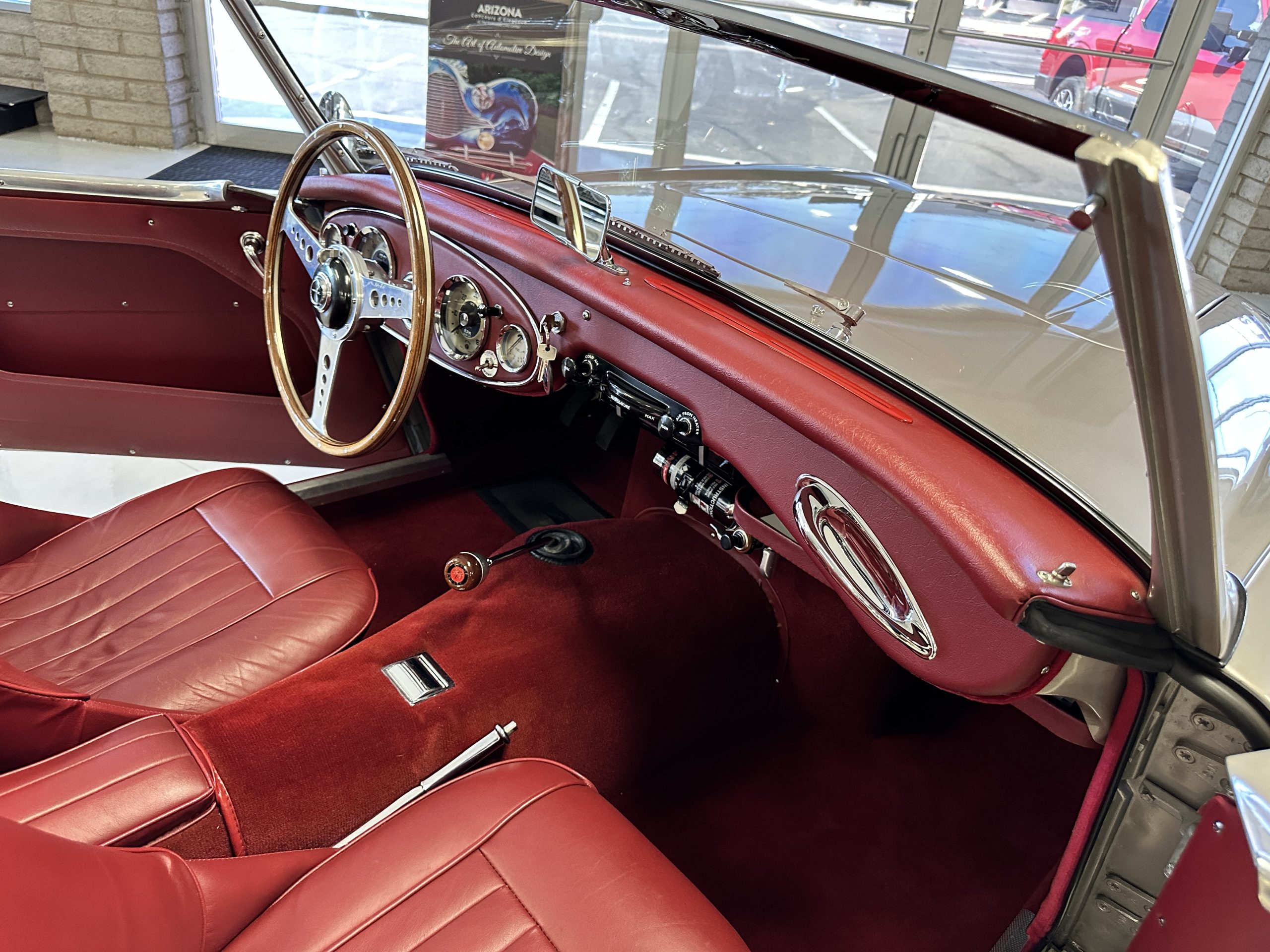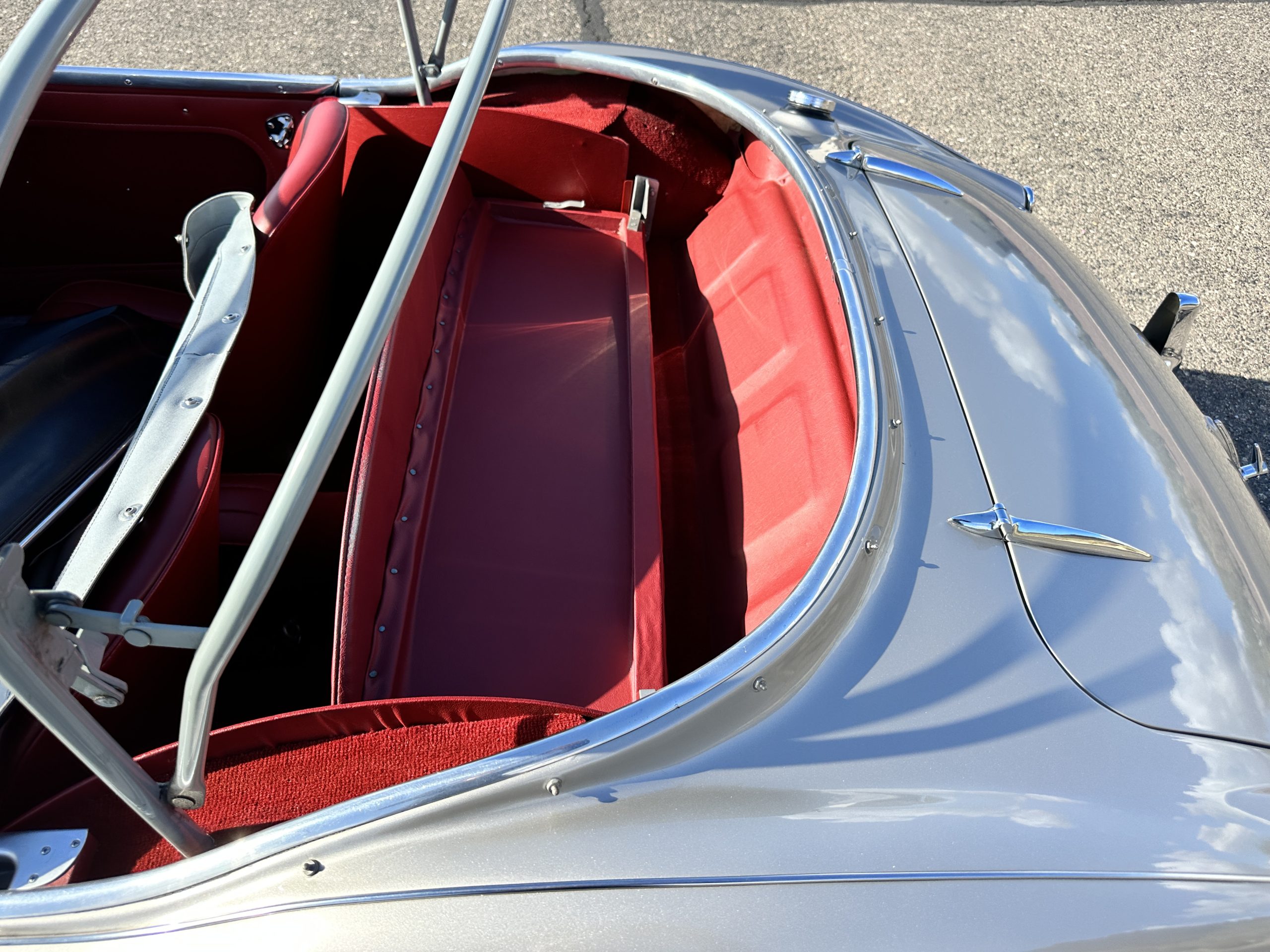 The interior is stunning in gorgeous red leather. The red carpeting and the red leather wrapping the dashboard and door panels looks just right. The combination of the red interior and champagne exterior looks better than we remember seeing it before. The execution of this restoration truly sets it apart. The original aluminum cockpit moldings were stripped, polished, and correctly re-anodized. The car boasts a new Moss Motors interior trim kit, carpet and underlay kit, Armacord trunk kit, door seals, red leather trimmed seats with new foam, Moto-Lita steering wheel, fitted lap belts, and windshield. A new and correct black Everflex top and matching black canvas tonneau has been fitted, along with the original set of restored side curtains in a new black bag. The steering wheel and shift knob are both wood rimmed with aluminum made by none other than Moto-Lita. Fitted in the passenger compartment is a polished fire extinguisher and a power outlet for phones, etc. The original steering wheel and shift knob are included in the sale.