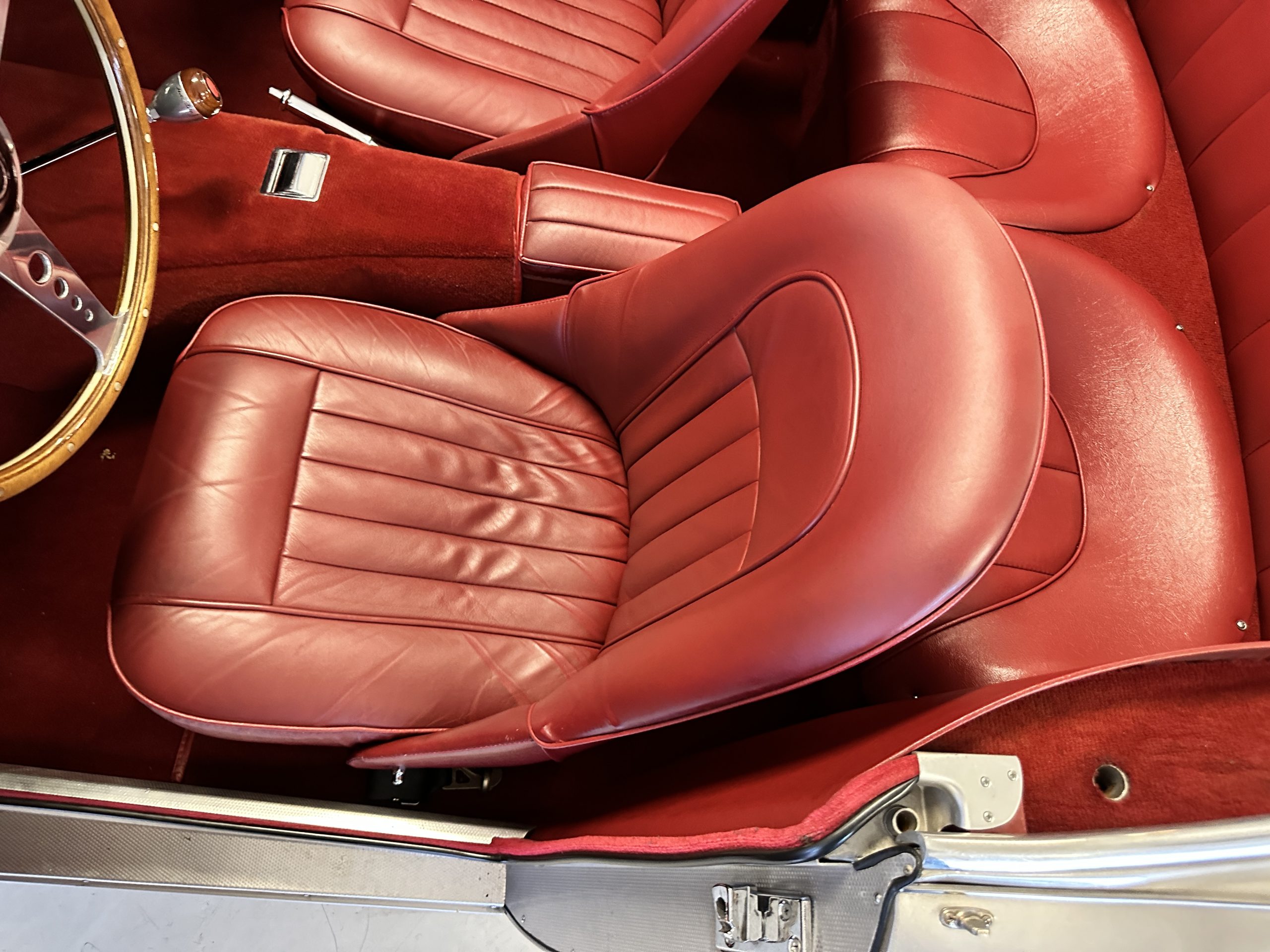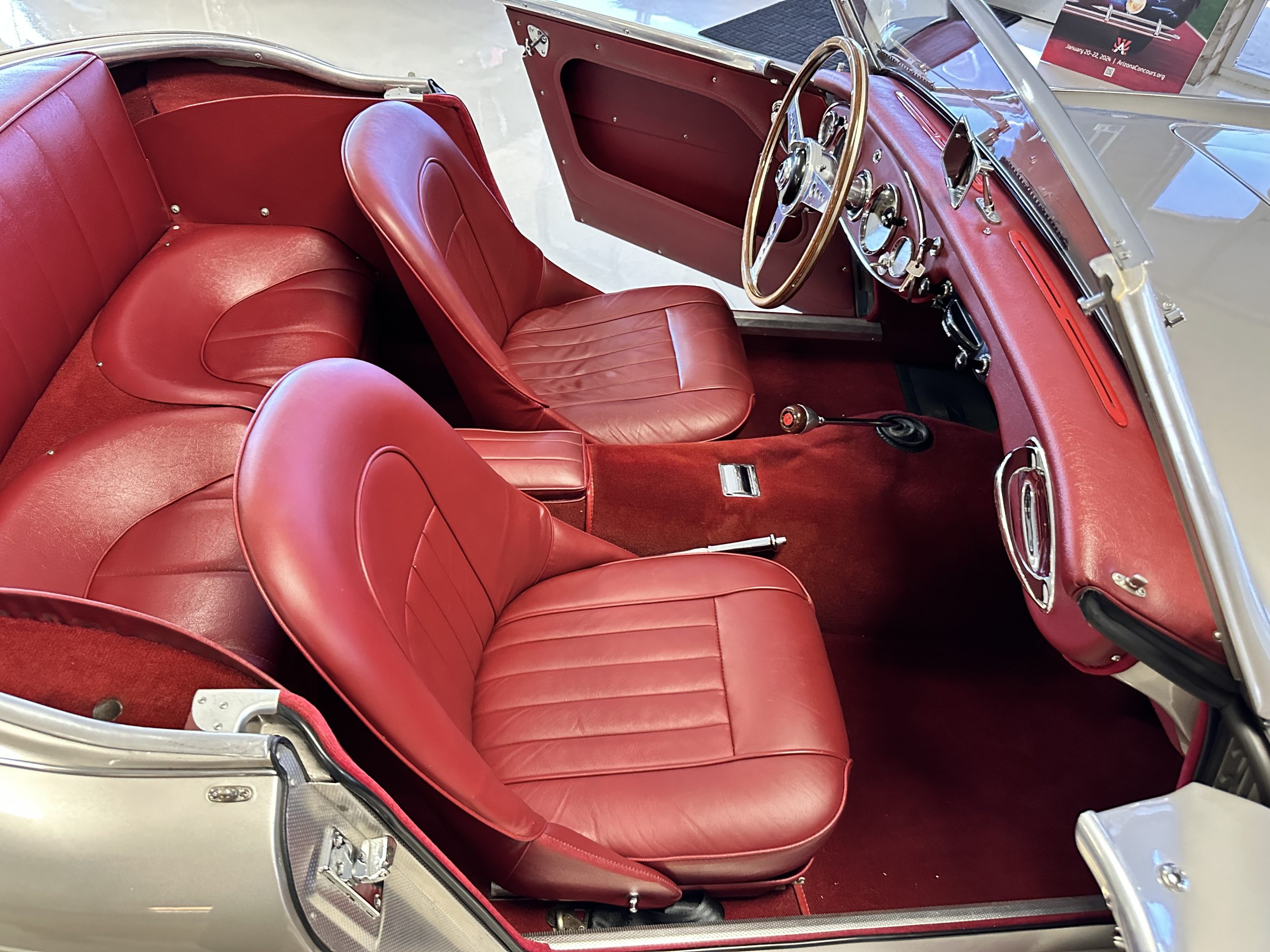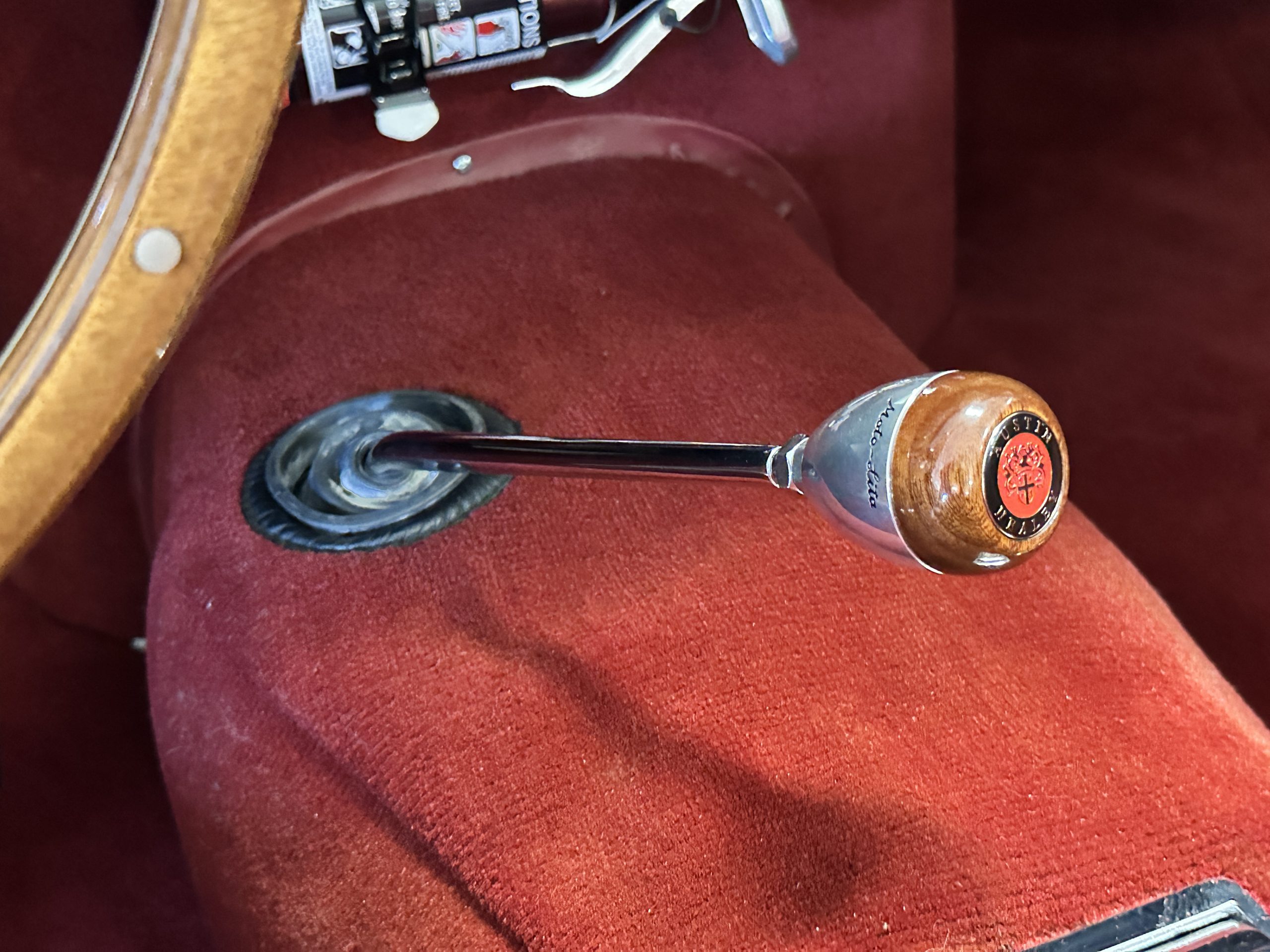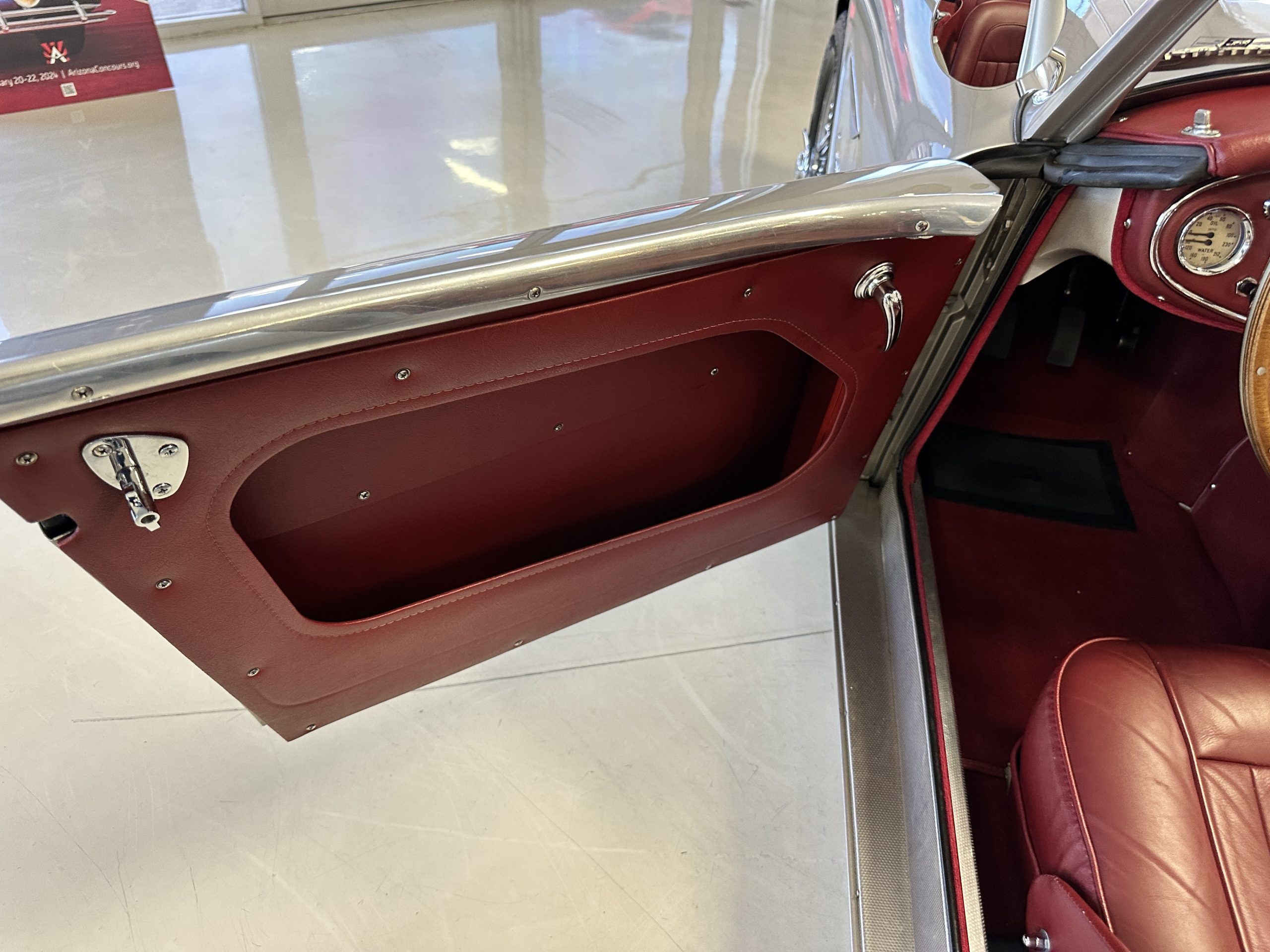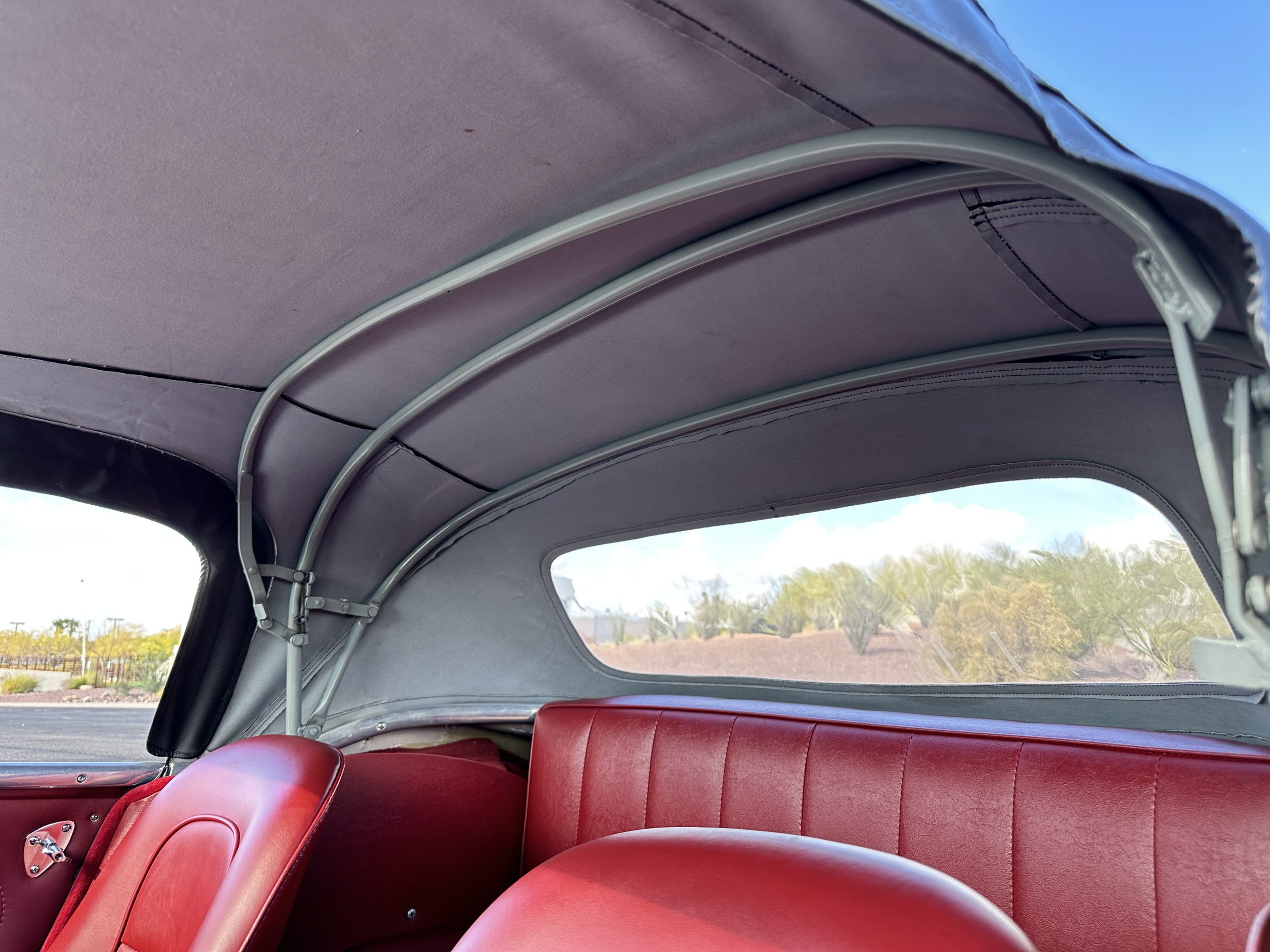The interior is stunning in gorgeous red leather. The red carpeting and the red leather wrapping the dashboard and door panels looks just right. The combination of the red interior and champagne exterior looks better than we remember seeing it before. The execution of this restoration truly sets it apart. The original aluminum cockpit moldings were stripped, polished, and correctly re-anodized. The car boasts a new Moss Motors interior trim kit, carpet and underlay kit, Armacord trunk kit, door seals, red leather trimmed seats with new foam, Moto-Lita steering wheel, fitted lap belts, and windshield. A new and correct black Everflex top and matching black canvas tonneau has been fitted, along with the original set of restored side curtains in a new black bag. The steering wheel and shift knob are both wood rimmed with aluminum made by none other than Moto-Lita. Fitted in the passenger compartment is a polished fire extinguisher and a power outlet for phones, etc. The original steering wheel and shift knob are included in the sale.