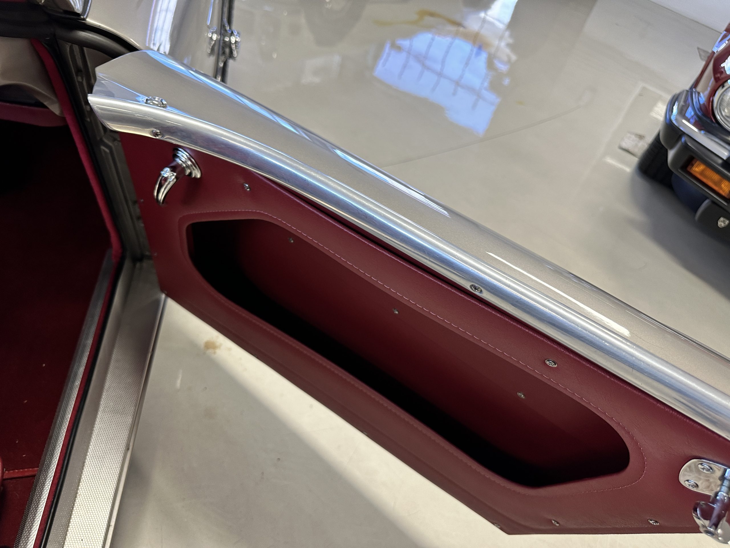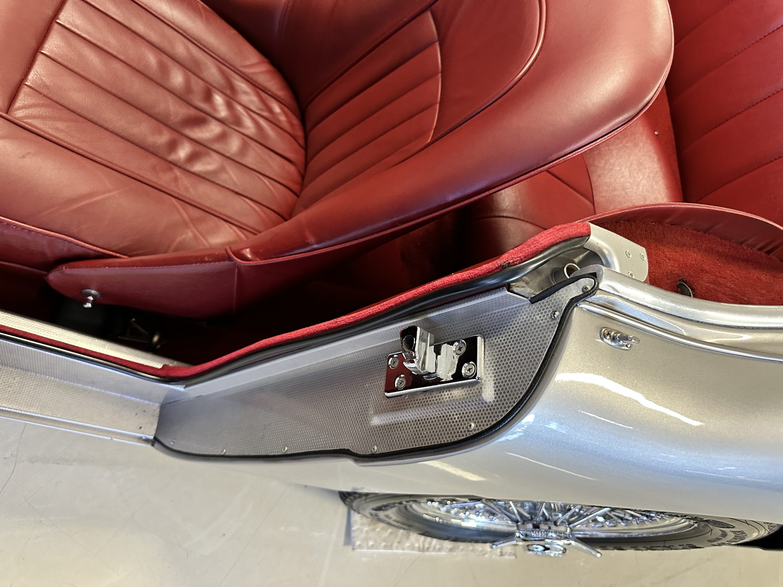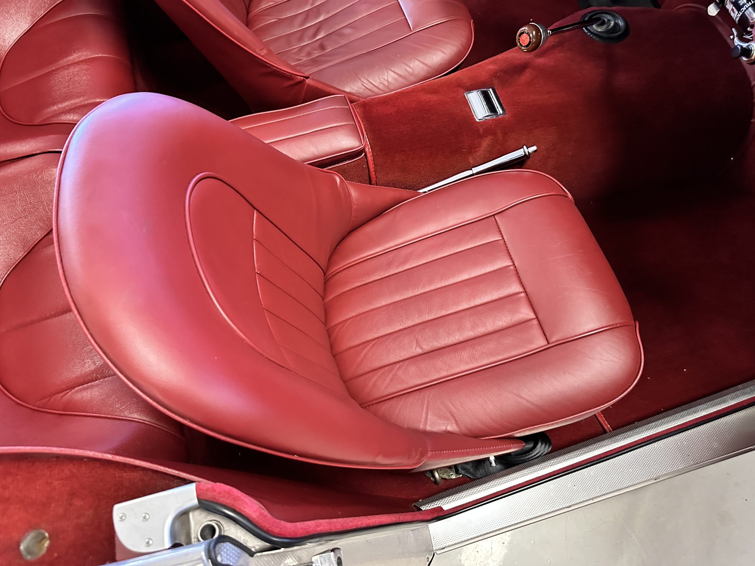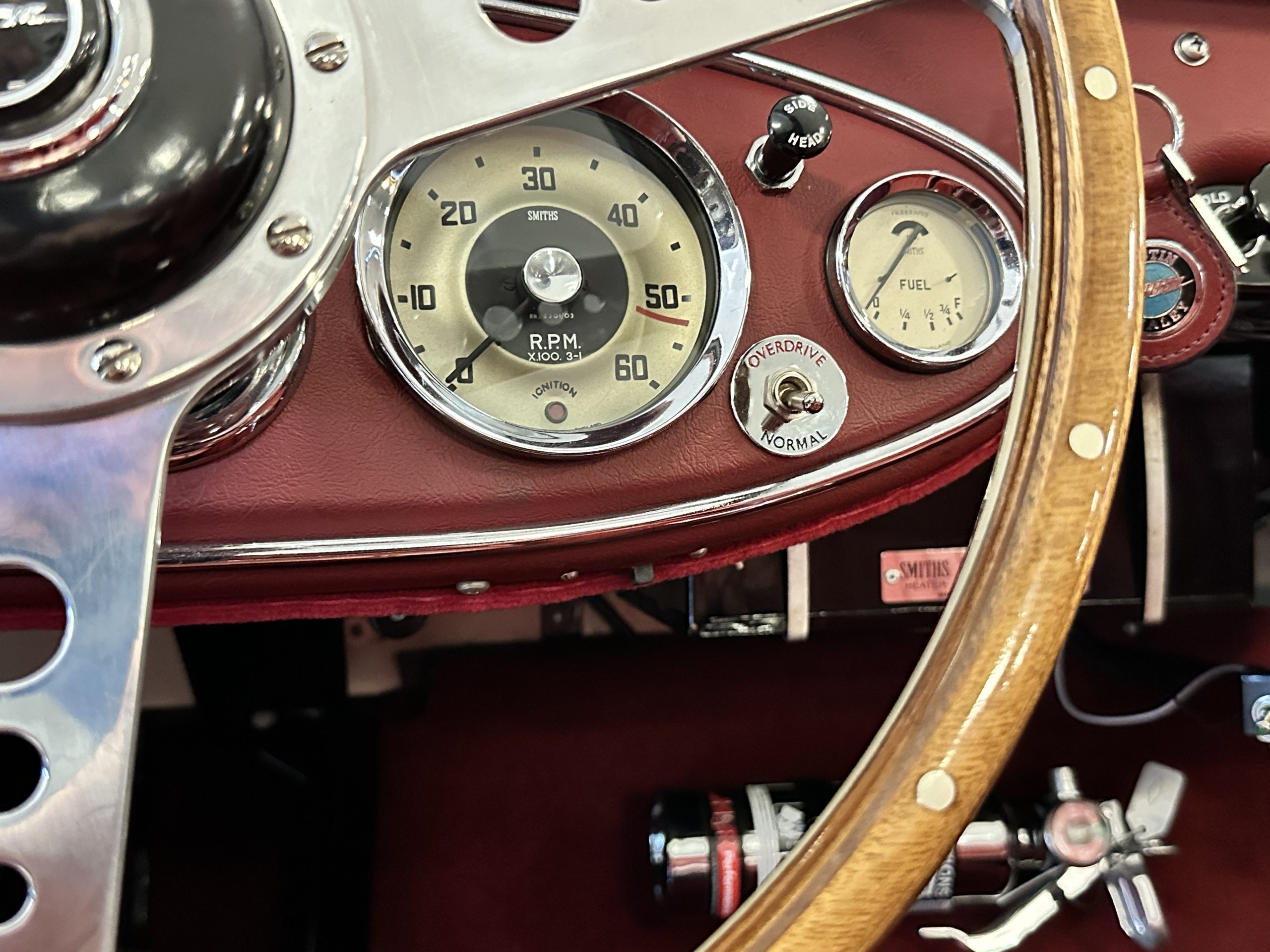 The interior is stunning in gorgeous red leather. The red carpeting and the red leather wrapping the dashboard and door panels looks just right. The combination of the red interior and champagne exterior looks better than we remember seeing it before. The execution of this restoration truly sets it apart. The original aluminum cockpit moldings were stripped, polished, and correctly re-anodized. The car boasts a new Moss Motors interior trim kit, carpet and underlay kit, Armacord trunk kit, door seals, red leather trimmed seats with new foam, Moto-Lita steering wheel, fitted lap belts, and windshield. A new and correct black Everflex top and matching black canvas tonneau has been fitted, along with the original set of restored side curtains in a new black bag. The steering wheel and shift knob are both wood rimmed with aluminum made by none other than Moto-Lita. Fitted in the passenger compartment is a polished fire extinguisher and a power outlet for phones, etc. The original steering wheel and shift knob are included in the sale.