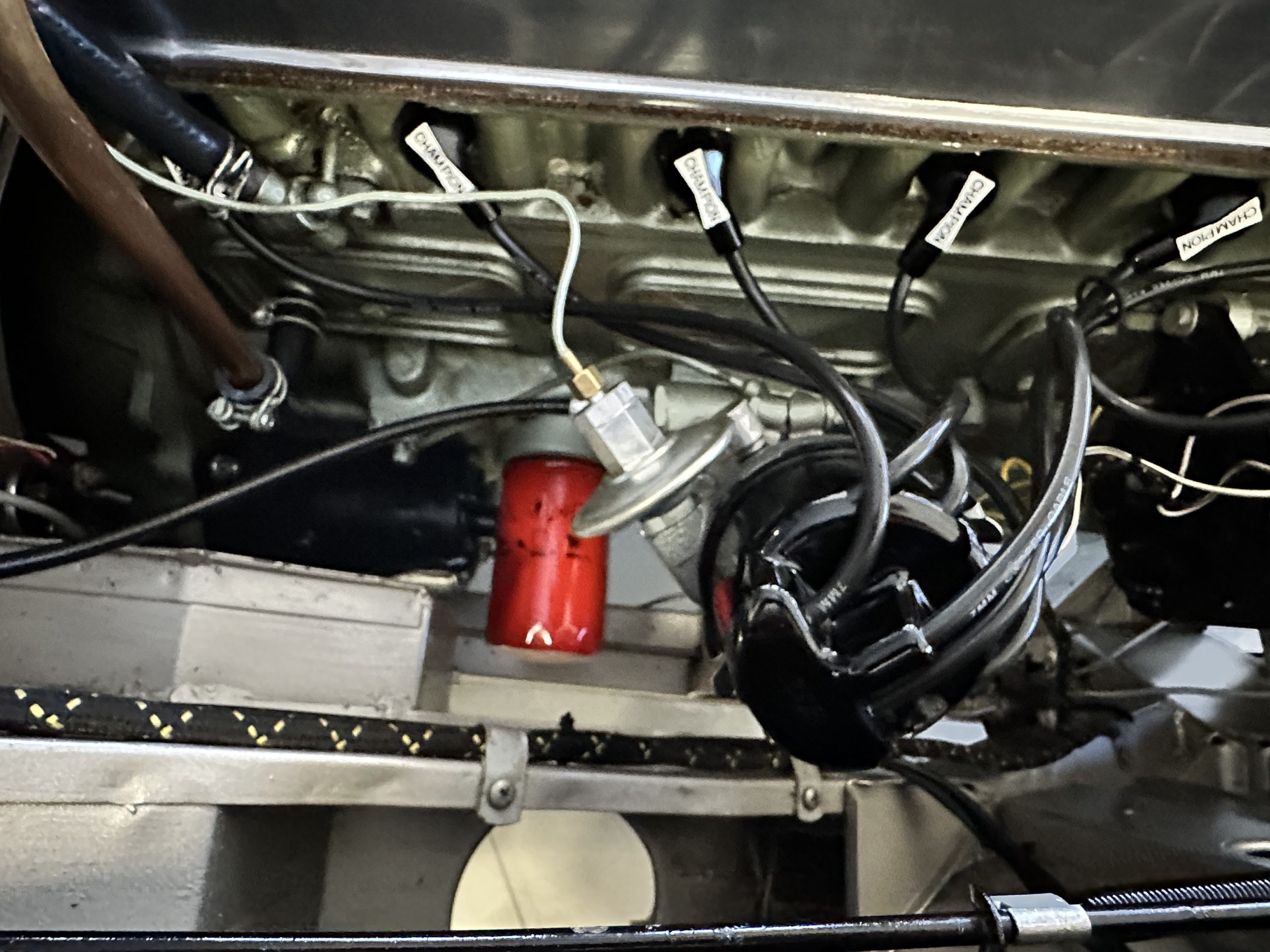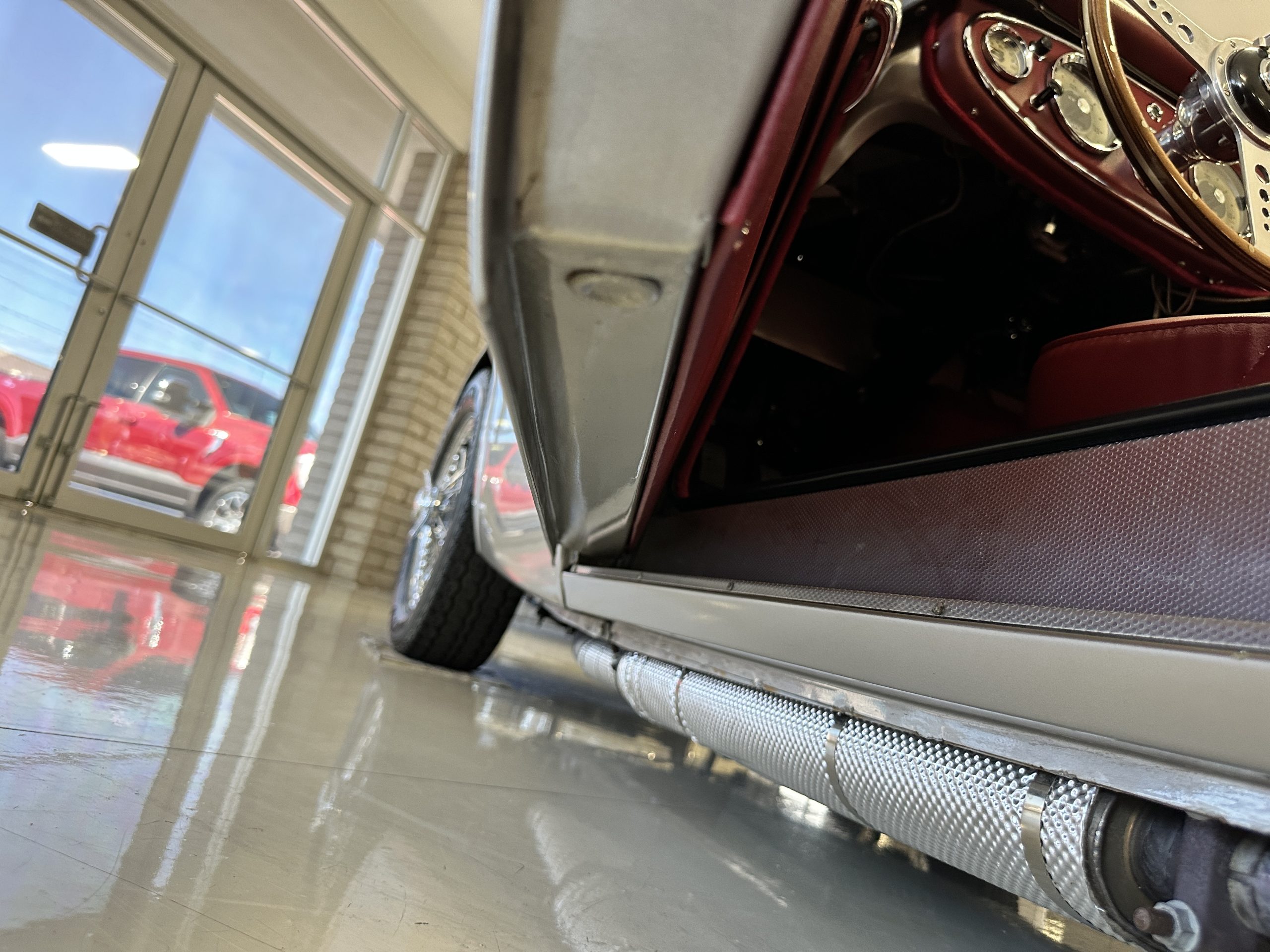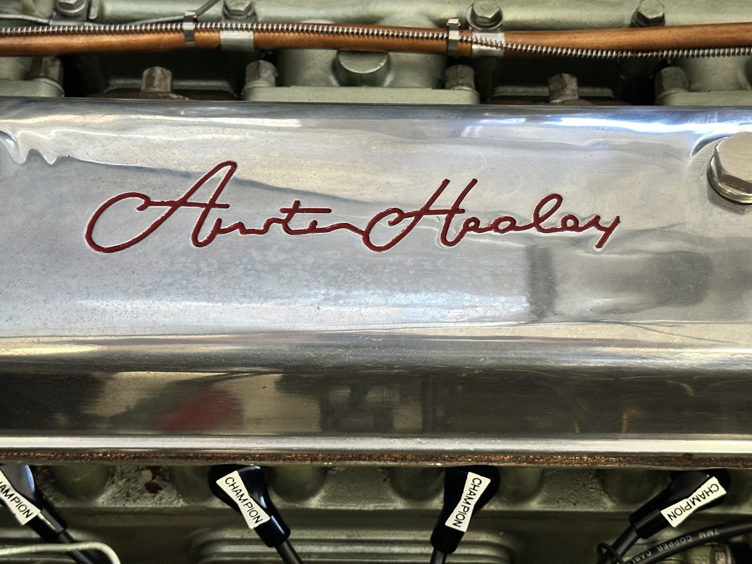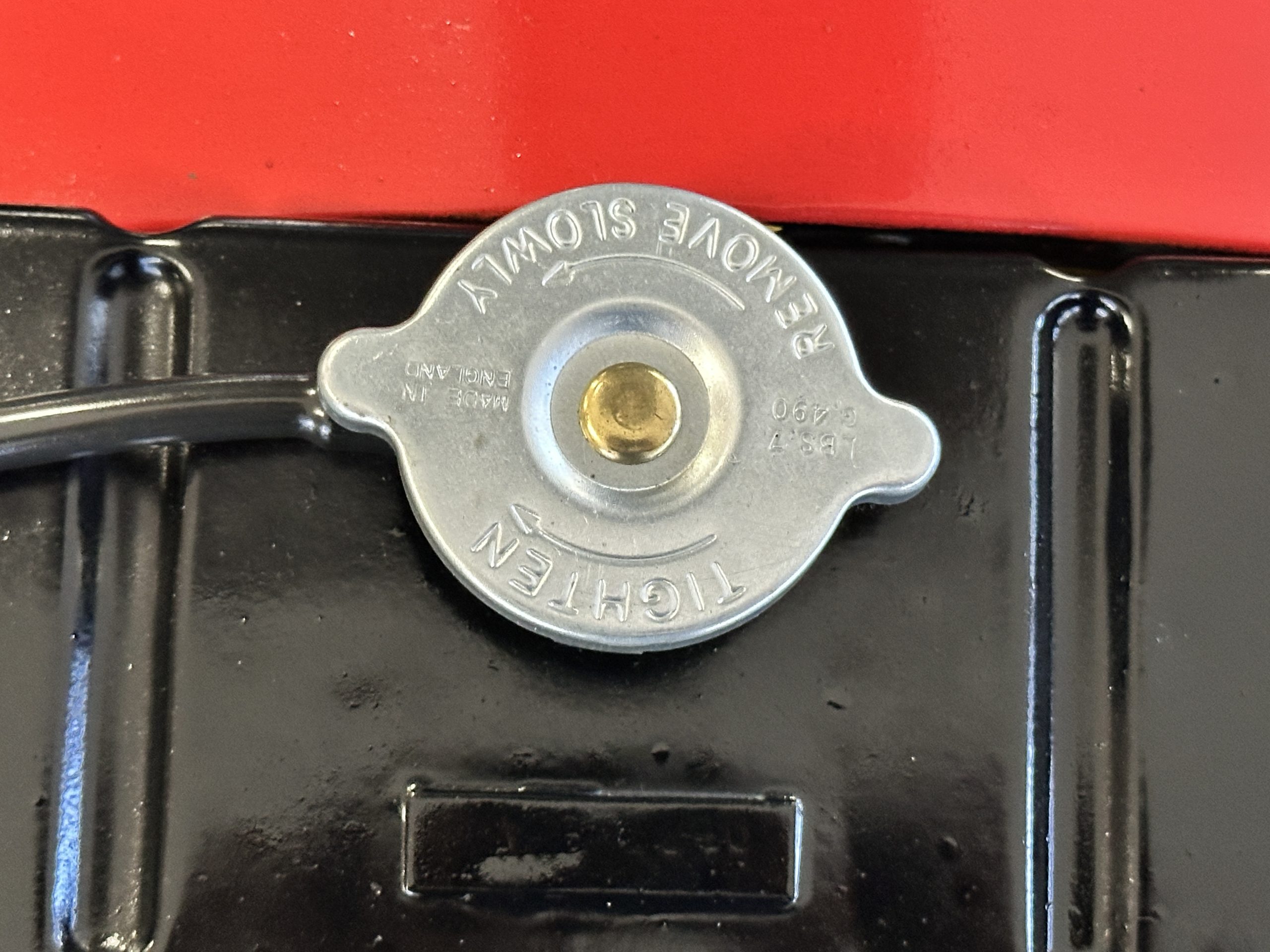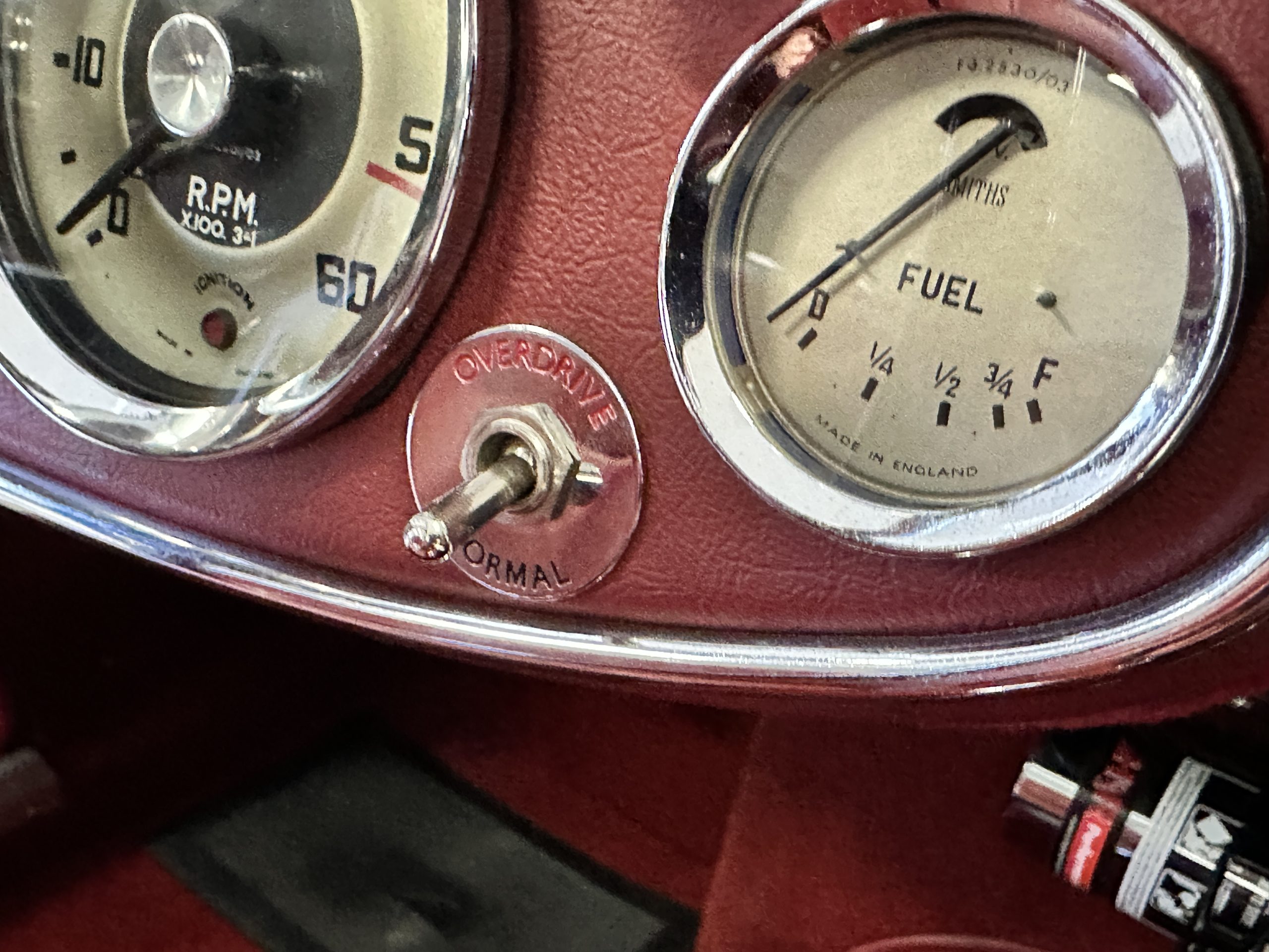 The interior is stunning in gorgeous red leather. The red carpeting and the red leather wrapping the dashboard and door panels looks just right. The combination of the red interior and champagne exterior looks better than we remember seeing it before. The execution of this restoration truly sets it apart. The original aluminum cockpit moldings were stripped, polished, and correctly re-anodized. The car boasts a new Moss Motors interior trim kit, carpet and underlay kit, Armacord trunk kit, door seals, red leather trimmed seats with new foam, Moto-Lita steering wheel, fitted lap belts, and windshield. A new and correct black Everflex top and matching black canvas tonneau has been fitted, along with the original set of restored side curtains in a new black bag. The steering wheel and shift knob are both wood rimmed with aluminum made by none other than Moto-Lita. Fitted in the passenger compartment is a polished fire extinguisher and a power outlet for phones, etc. The original steering wheel and shift knob are included in the sale.