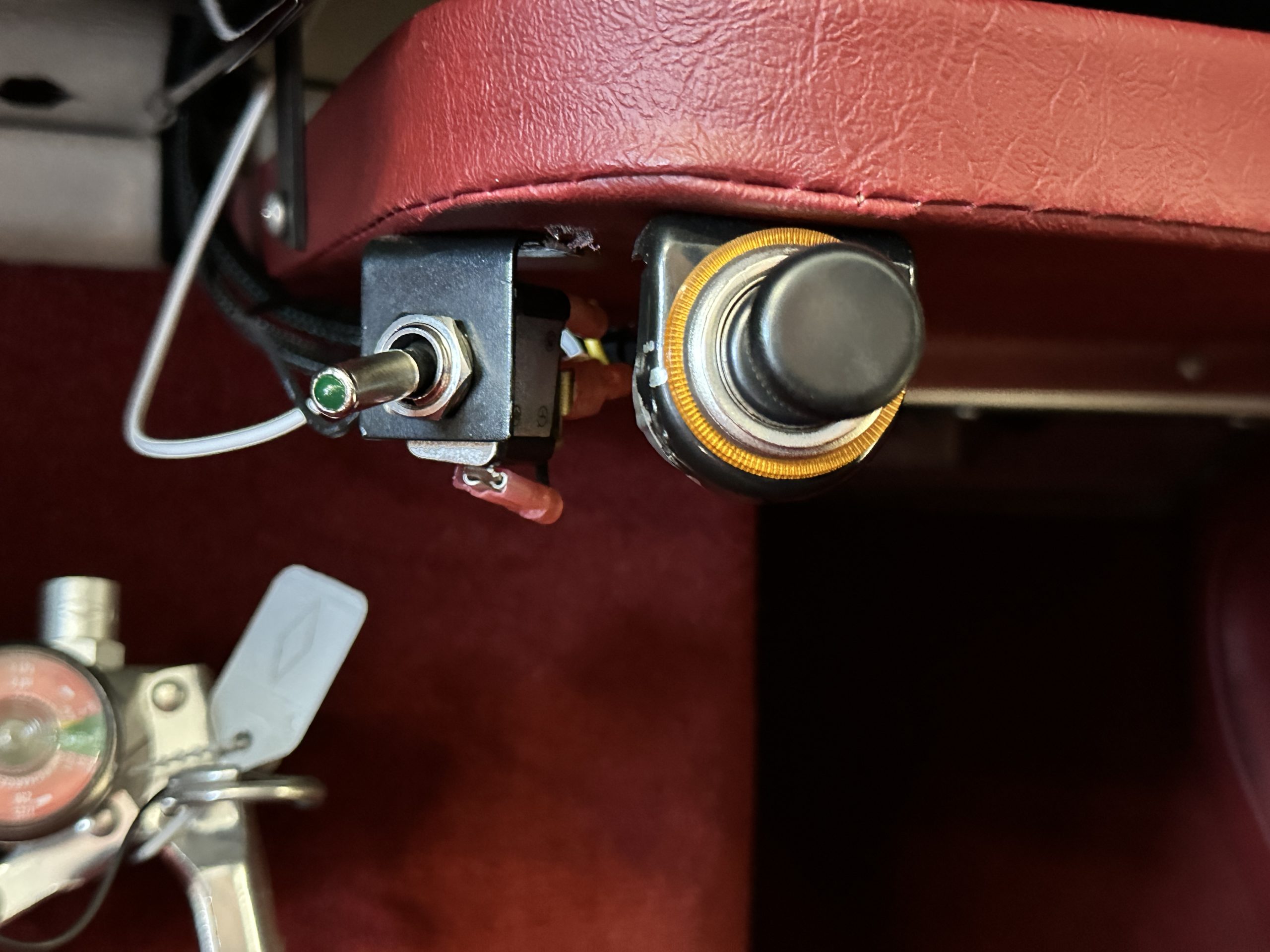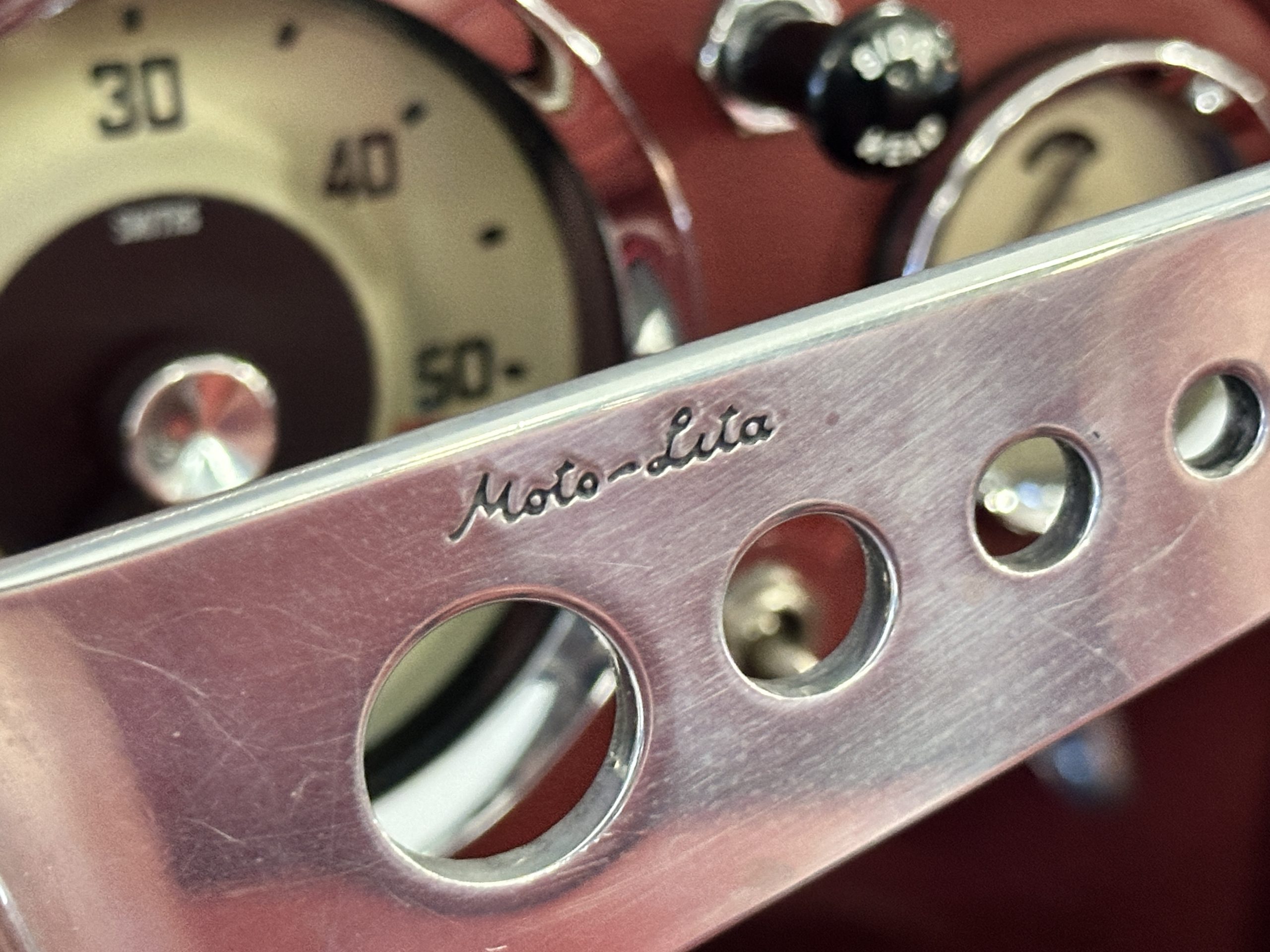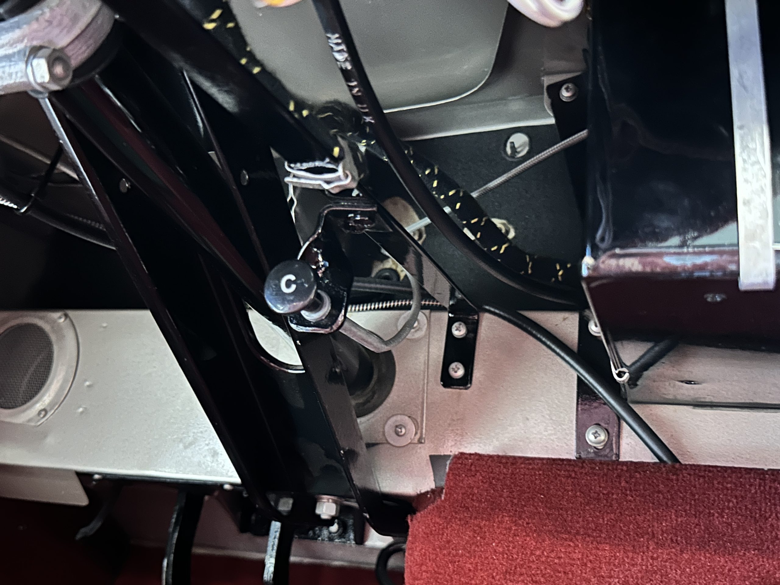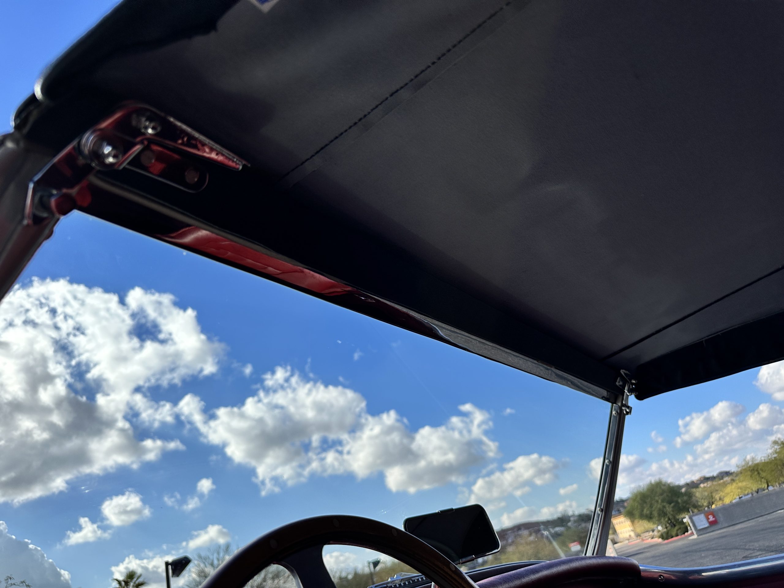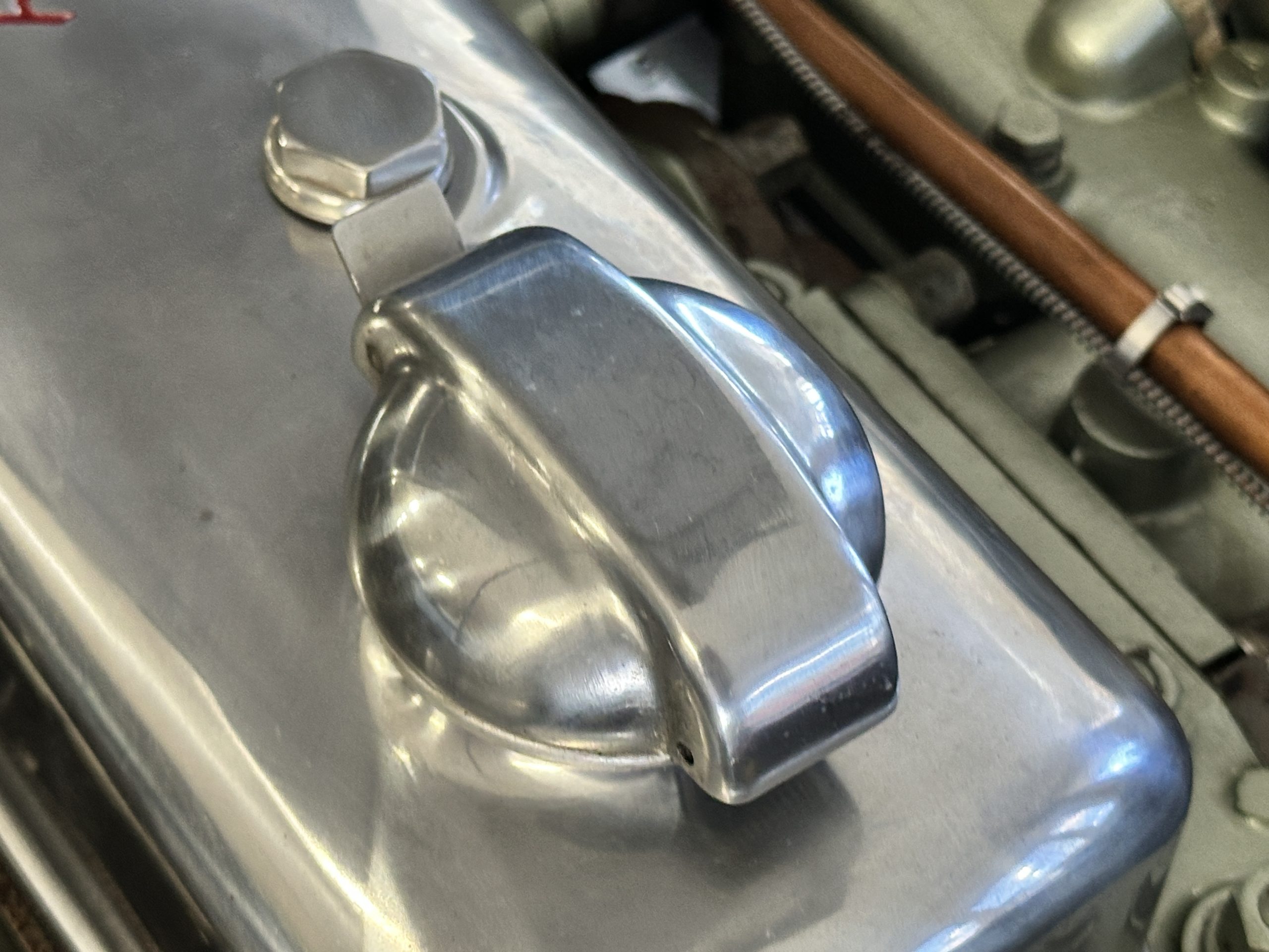 The interior is stunning in gorgeous red leather. The red carpeting and the red leather wrapping the dashboard and door panels looks just right. The combination of the red interior and champagne exterior looks better than we remember seeing it before. The execution of this restoration truly sets it apart. The original aluminum cockpit moldings were stripped, polished, and correctly re-anodized. The car boasts a new Moss Motors interior trim kit, carpet and underlay kit, Armacord trunk kit, door seals, red leather trimmed seats with new foam, Moto-Lita steering wheel, fitted lap belts, and windshield. A new and correct black Everflex top and matching black canvas tonneau has been fitted, along with the original set of restored side curtains in a new black bag. The steering wheel and shift knob are both wood rimmed with aluminum made by none other than Moto-Lita. Fitted in the passenger compartment is a polished fire extinguisher and a power outlet for phones, etc. The original steering wheel and shift knob are included in the sale.
