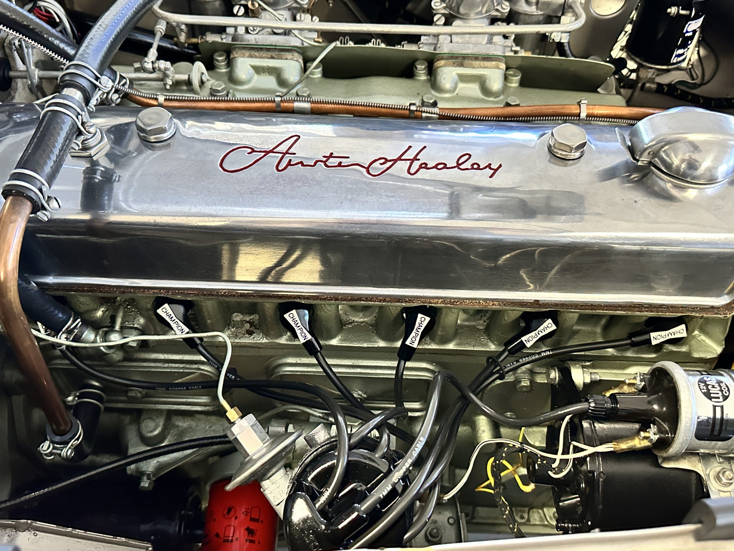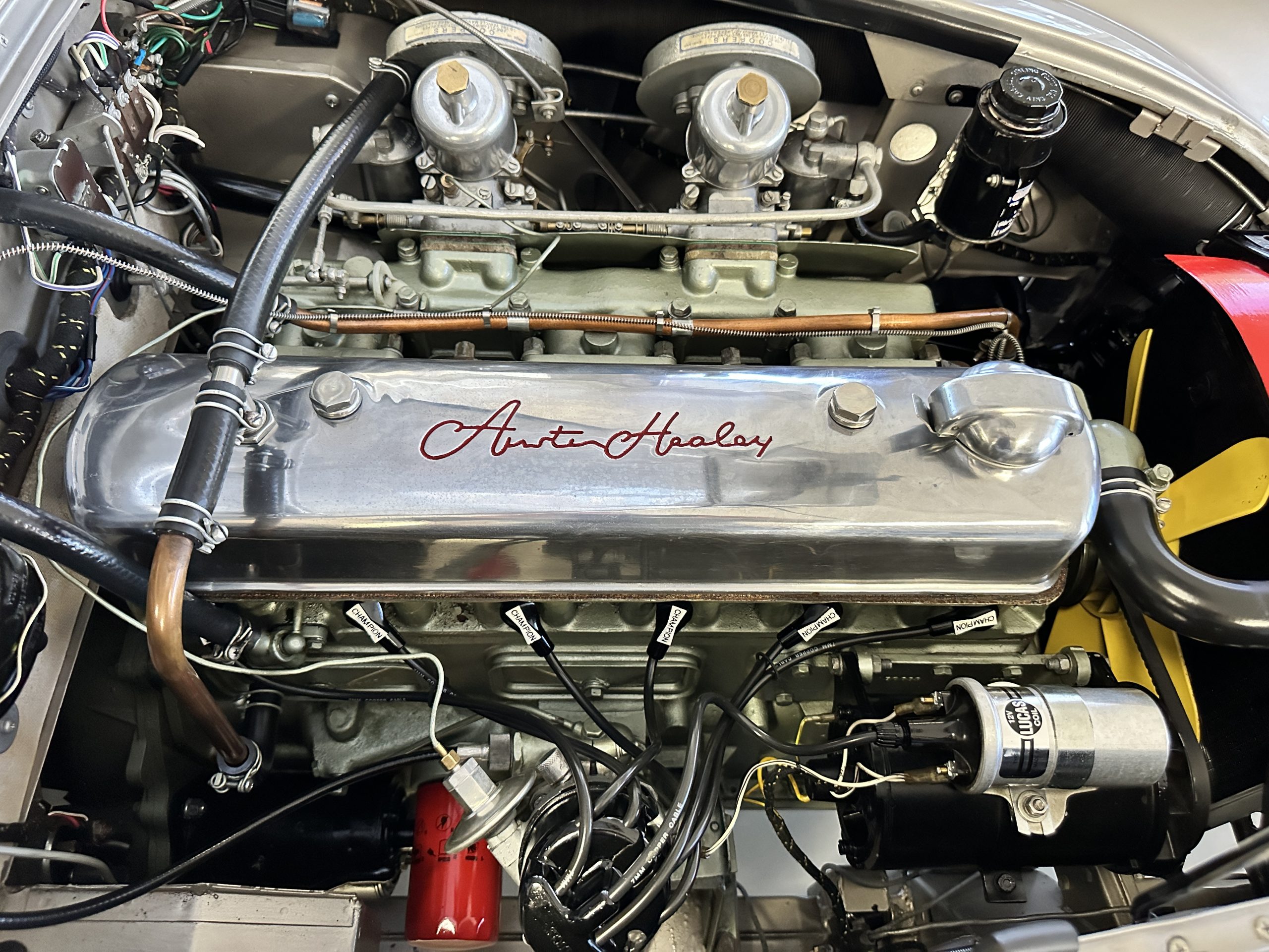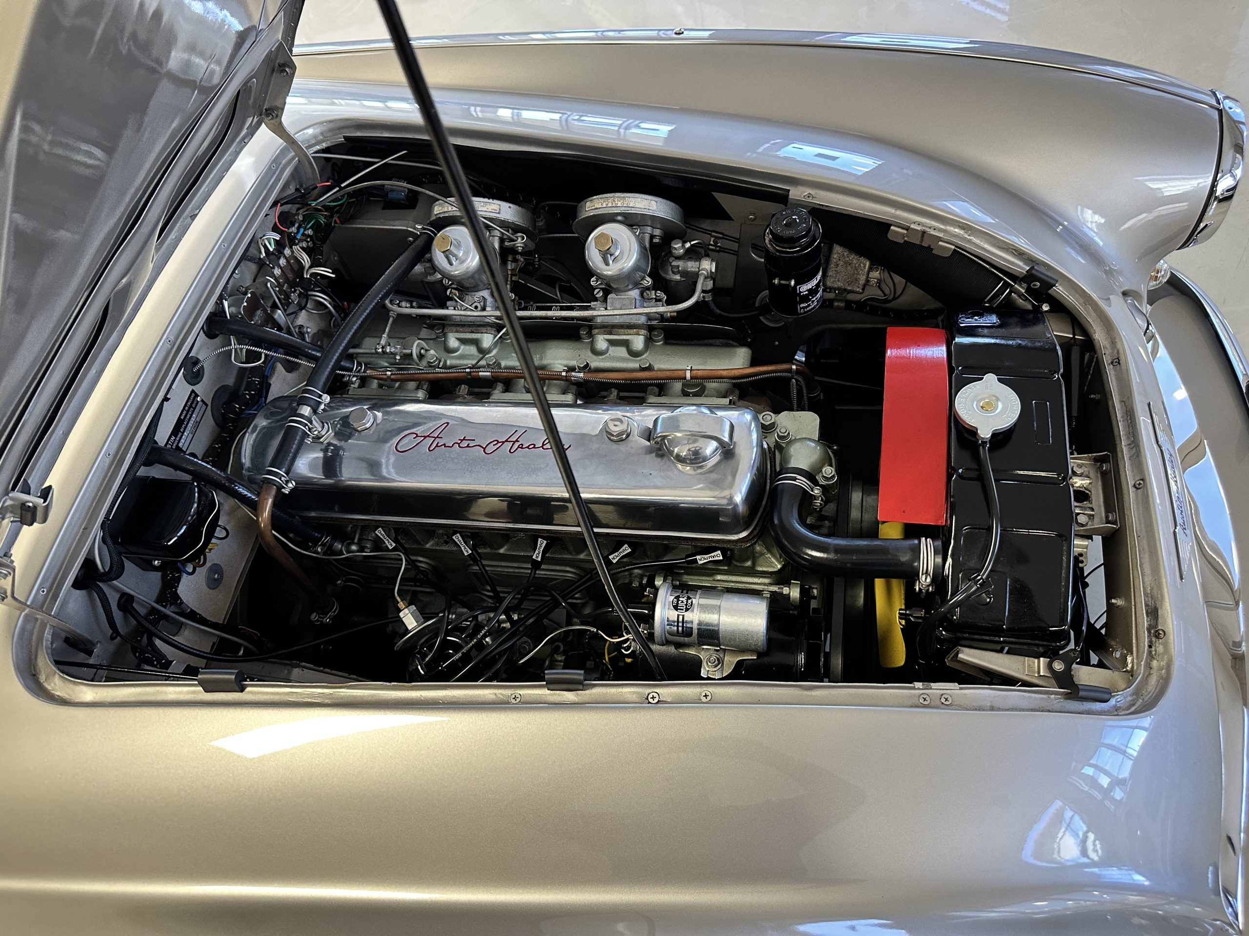 Mechanically, the car could not be in better condition. Everything was rebuilt as needed and today the Healey performs brilliantly. Every aspect of the car looks as-new. Look at the 140 photos and three videos on our website to admire the detail. The Healey was treated to a brand-new set of correct chrome wire wheels with a painted spare in the trunk. The venerable 2,912 cc overhead valve straight six-cylinder engine performs brilliantly producing 124 hp. We love the polished alloy valve cover with the Austin-Healey script (the original valve cover is included in the sale). It is the original numbers matching engine that has been thoroughly rebuilt since its restoration. The documentation is available for viewing. The four-speed transmission is enhanced by its electronic overdrive, an original option from the factory. The braking is from front discs.