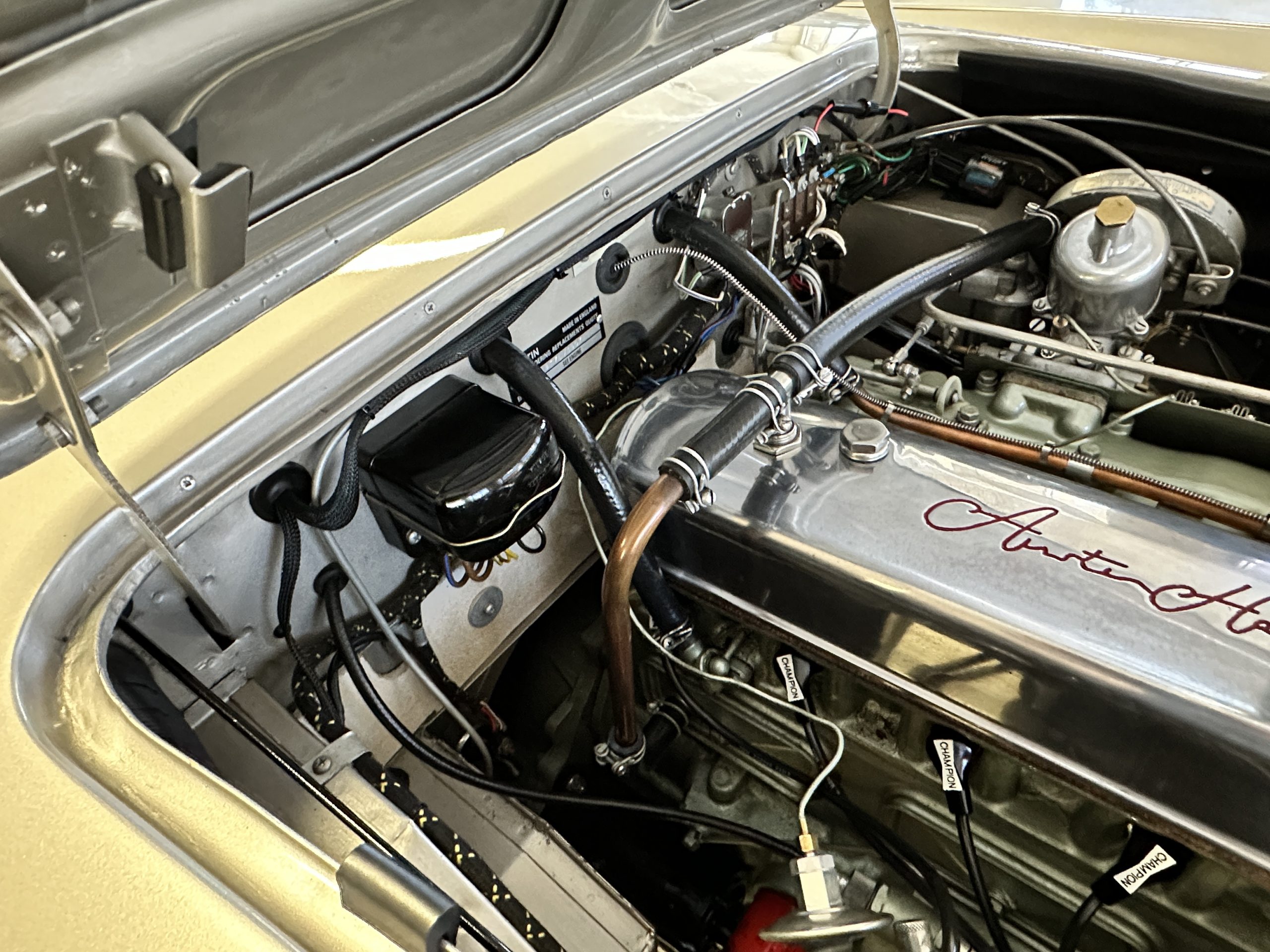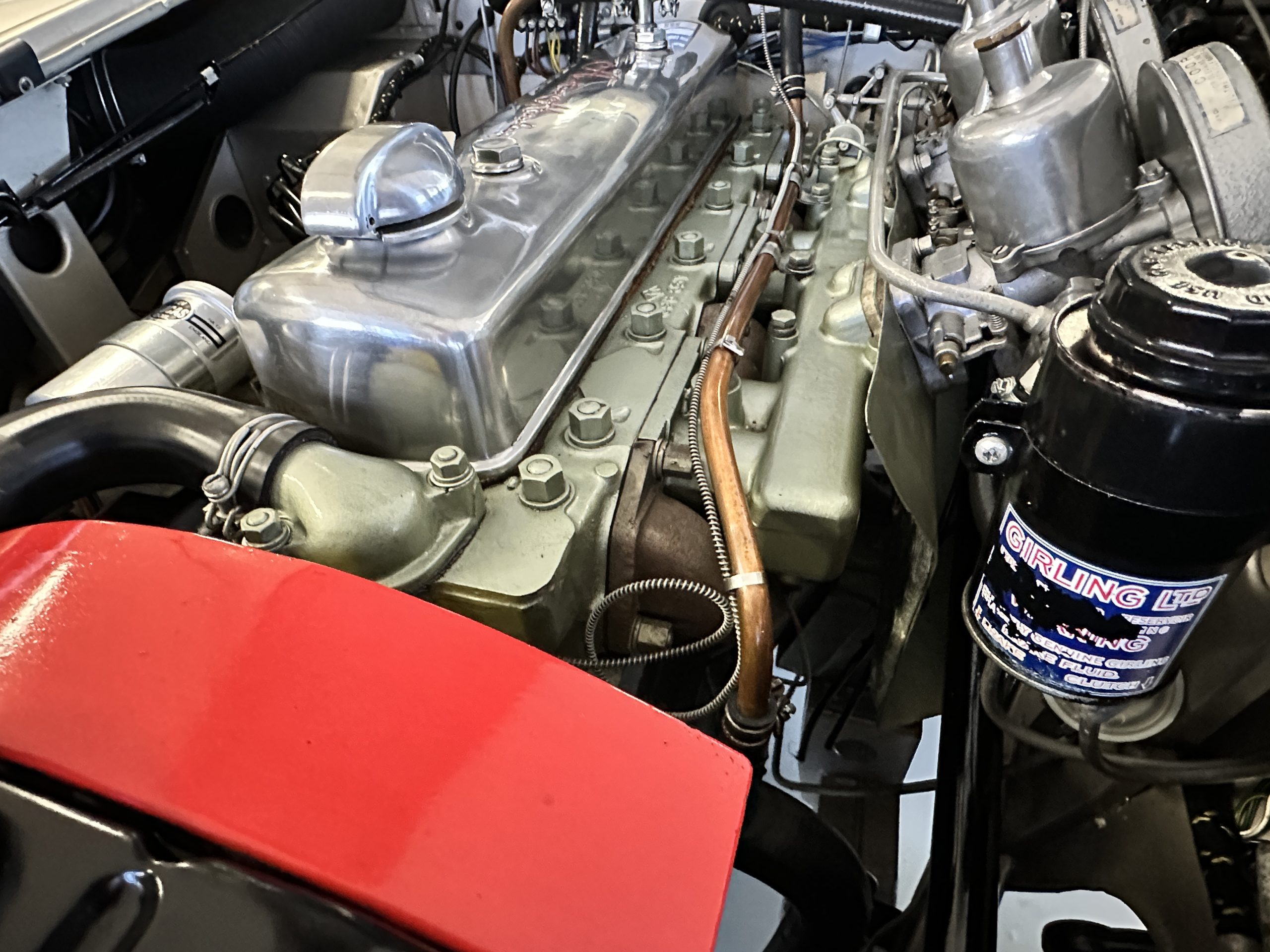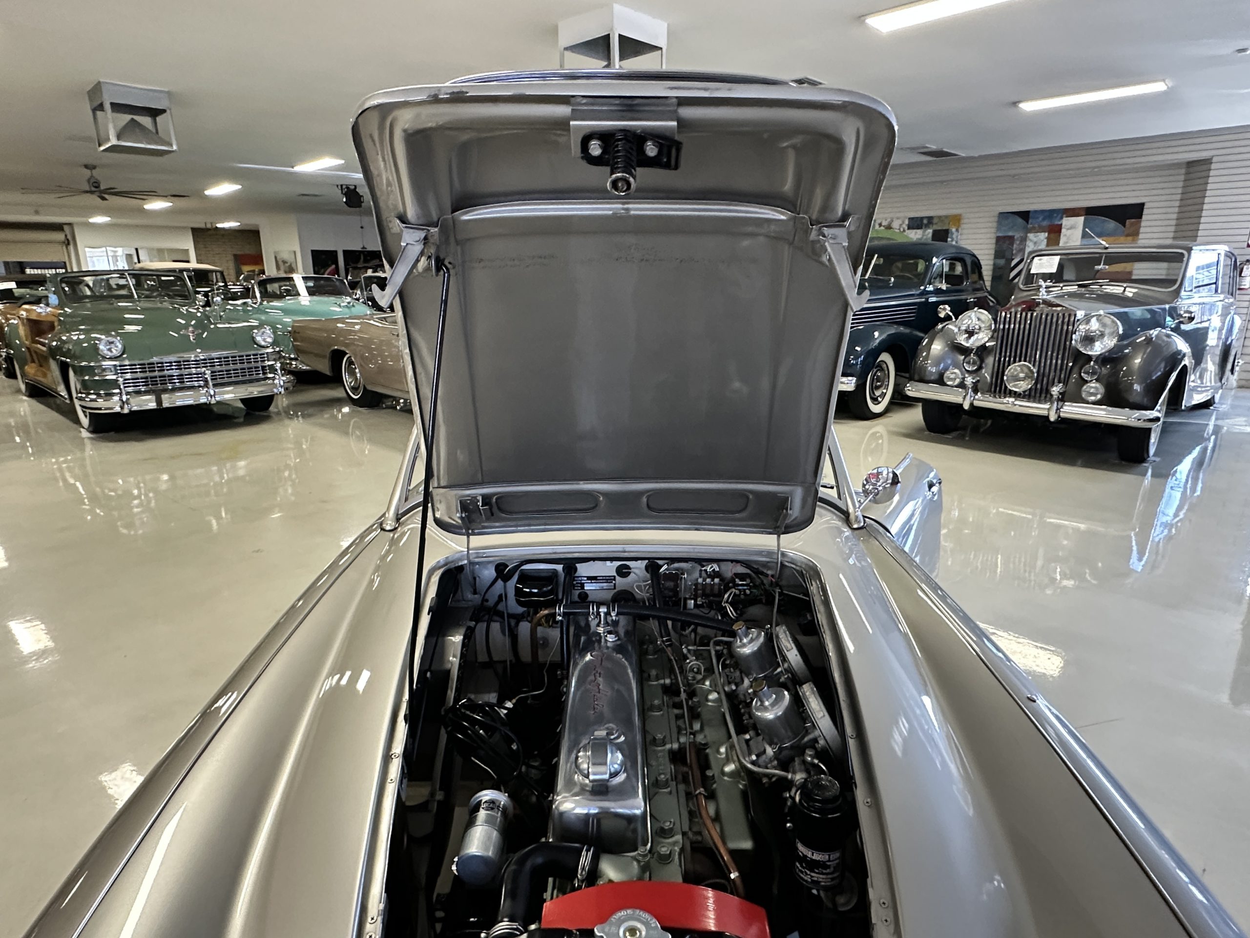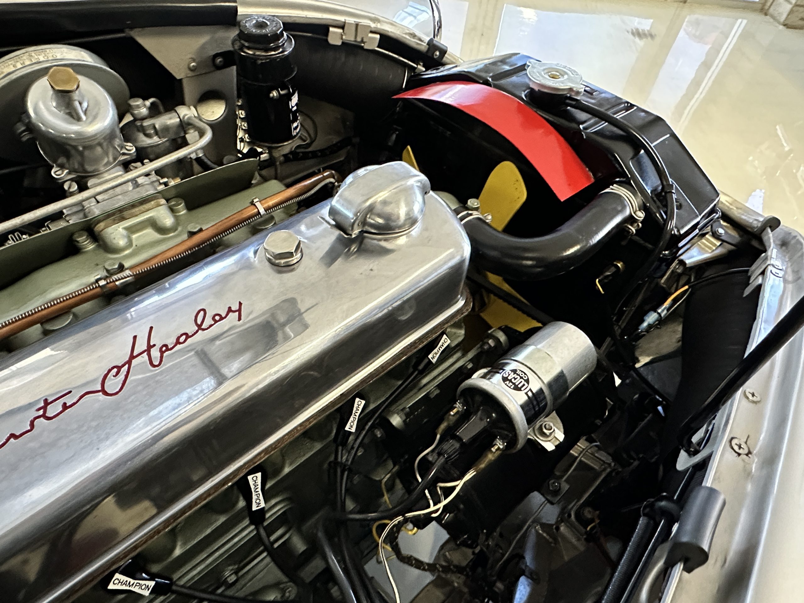 Mechanically, the car could not be in better condition. Everything was rebuilt as needed and today the Healey performs brilliantly. Every aspect of the car looks as-new. Look at the 140 photos and three videos on our website to admire the detail. The Healey was treated to a brand-new set of correct chrome wire wheels with a painted spare in the trunk. The venerable 2,912 cc overhead valve straight six-cylinder engine performs brilliantly producing 124 hp. We love the polished alloy valve cover with the Austin-Healey script (the original valve cover is included in the sale). It is the original numbers matching engine that has been thoroughly rebuilt since its restoration. The documentation is available for viewing. The four-speed transmission is enhanced by its electronic overdrive, an original option from the factory. The braking is from front discs.