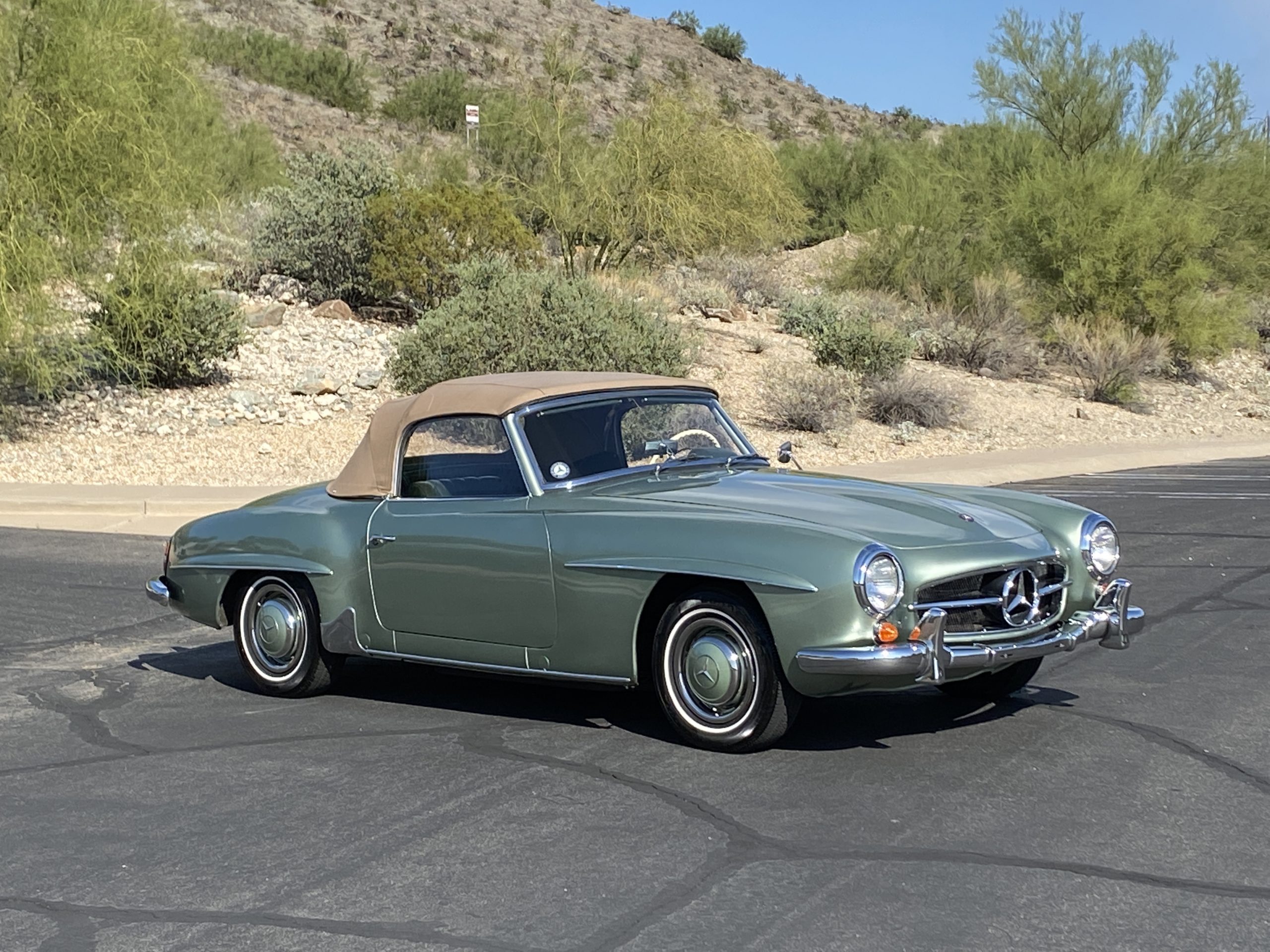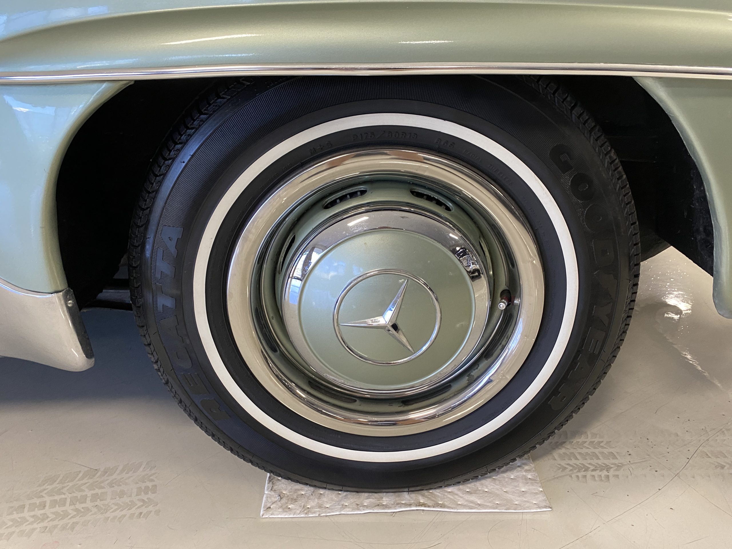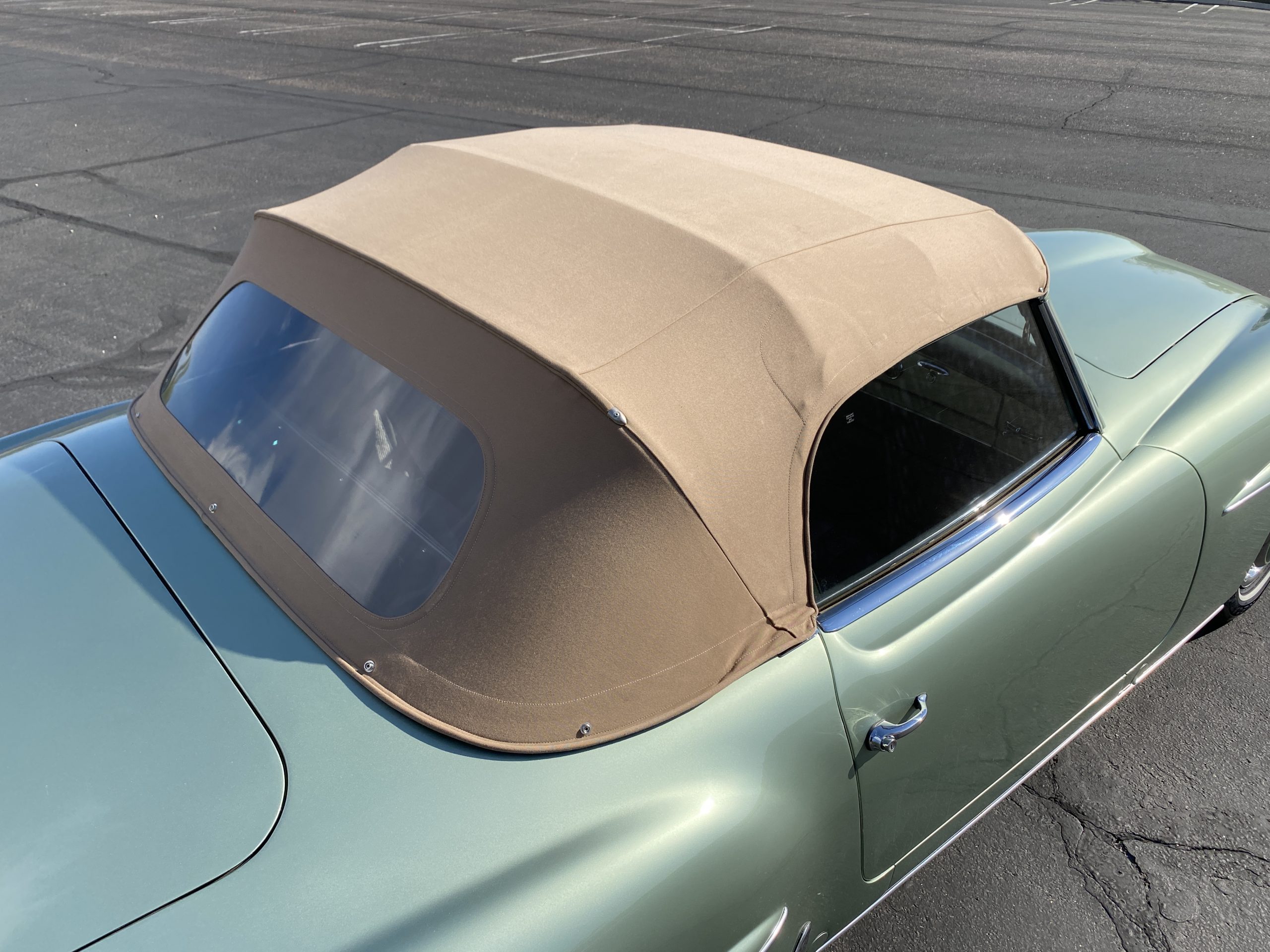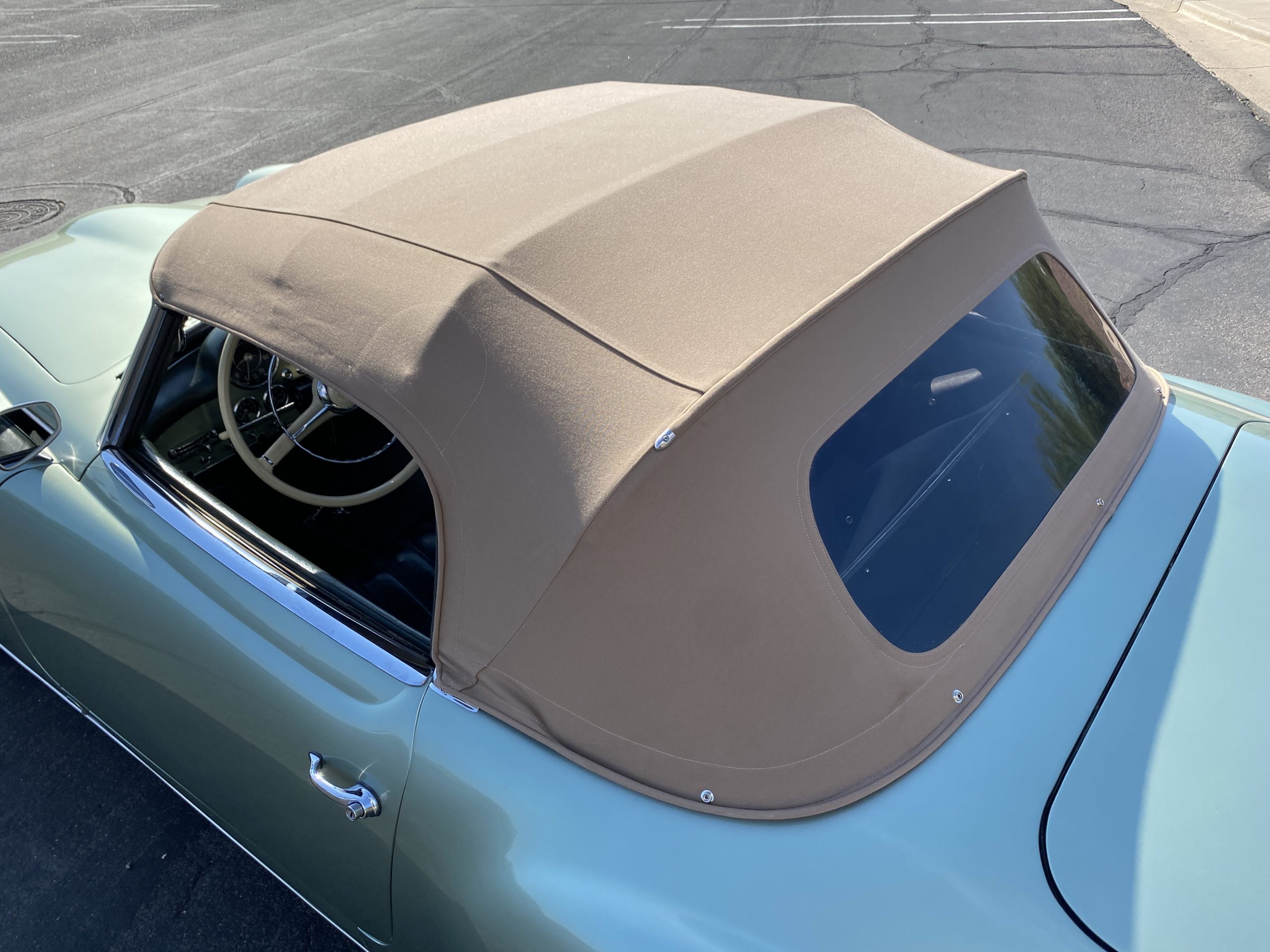 The tan canvas convertible top is as-new and fits nice and snug. The dark green top boot also looks new and is in excellent condition and looks fantastic when contrasted with the light green paint. The new Goodyear radials drive great and look right for a US delivery 190SL with a small white wall.