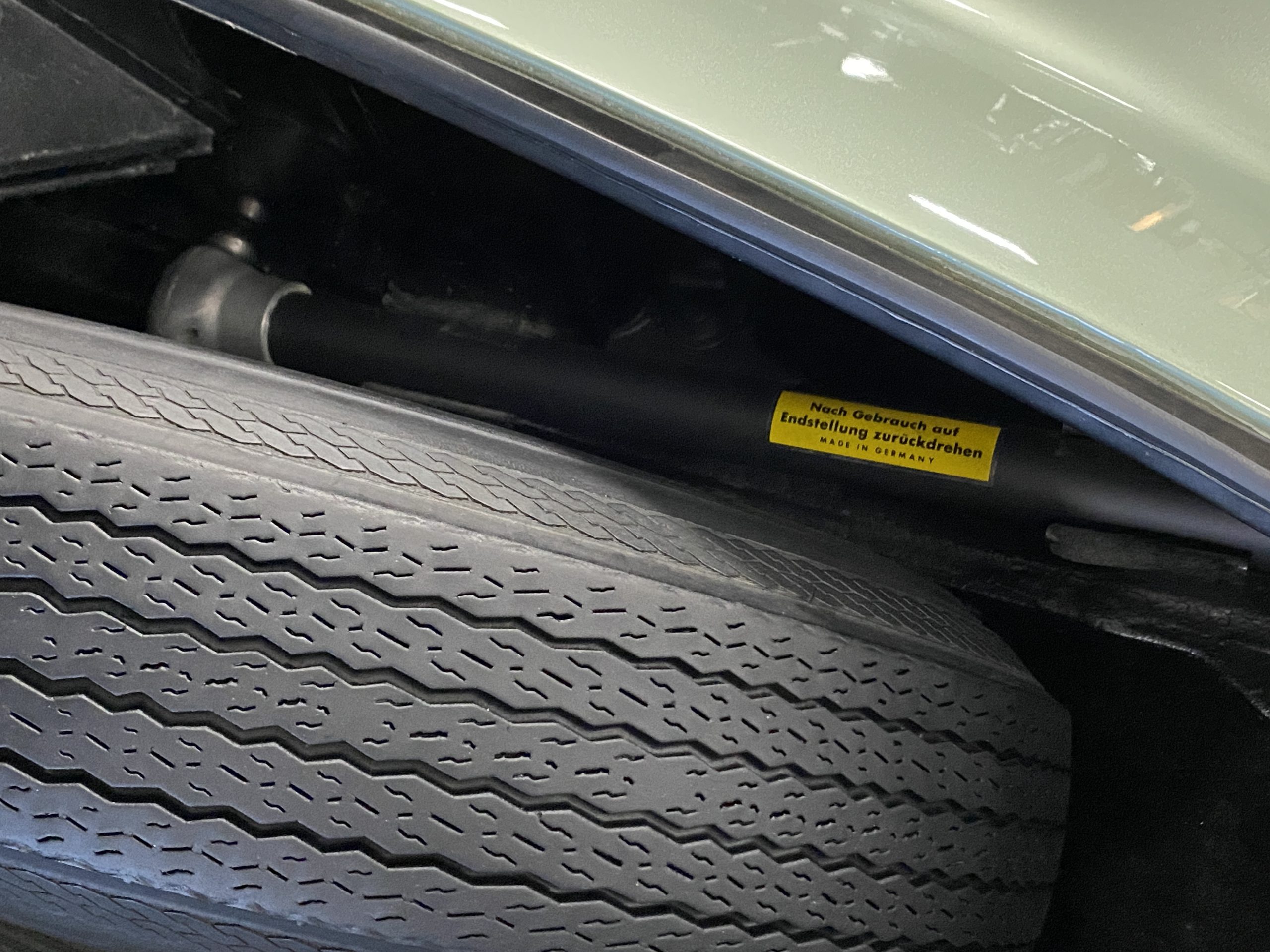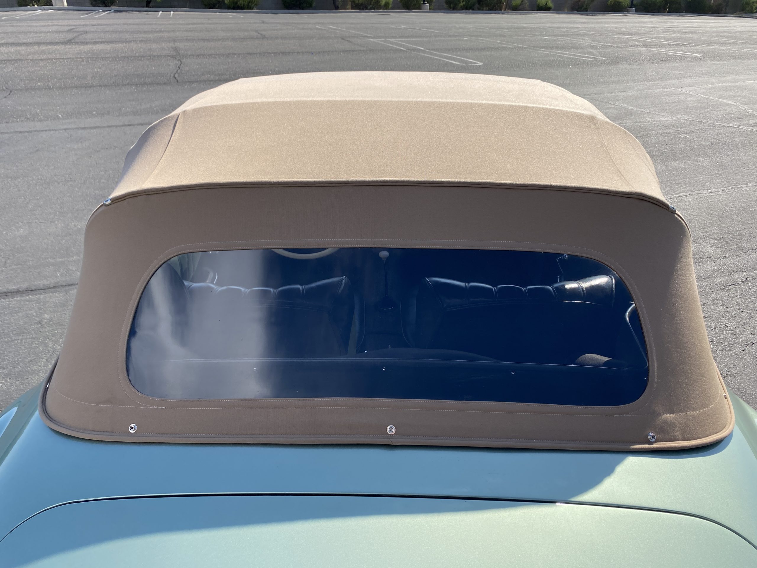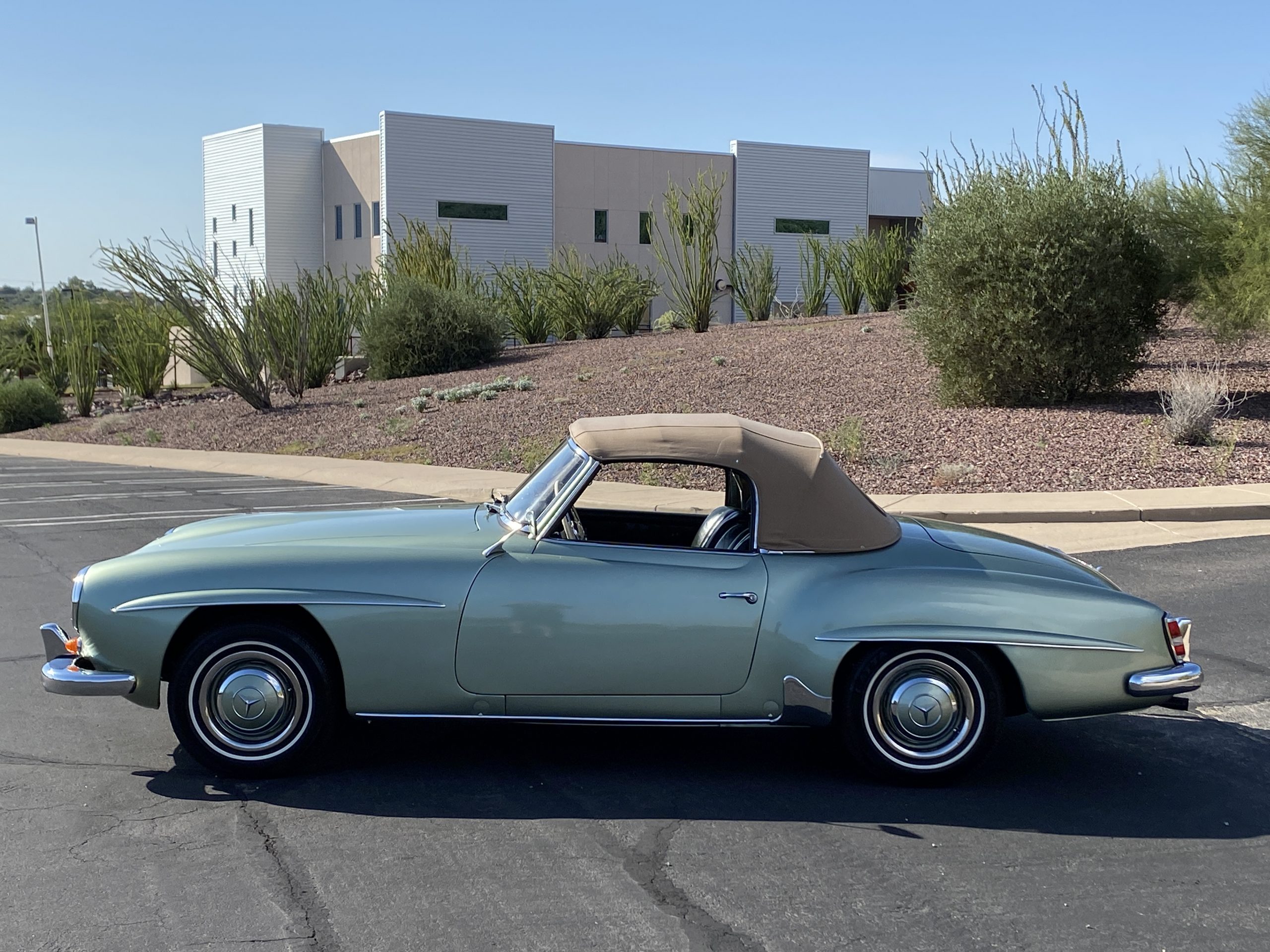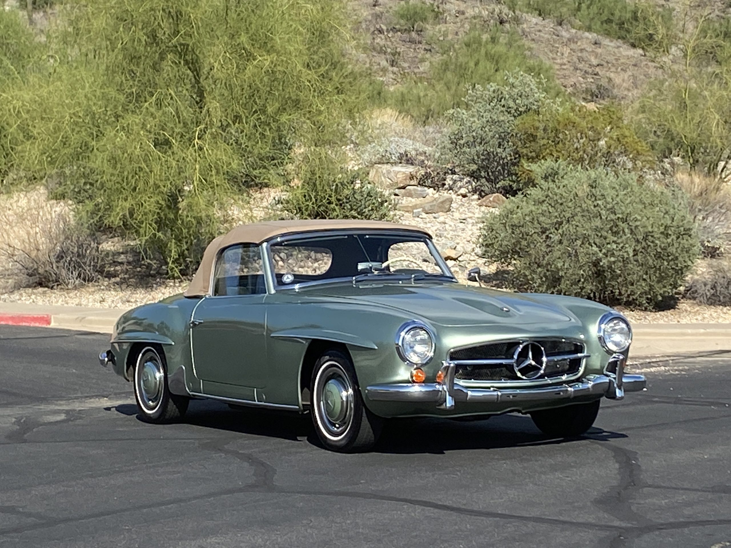 The tan canvas convertible top is as-new and fits nice and snug. The dark green top boot also looks new and is in excellent condition and looks fantastic when contrasted with the light green paint. The new Goodyear radials drive great and look right for a US delivery 190SL with a small white wall.