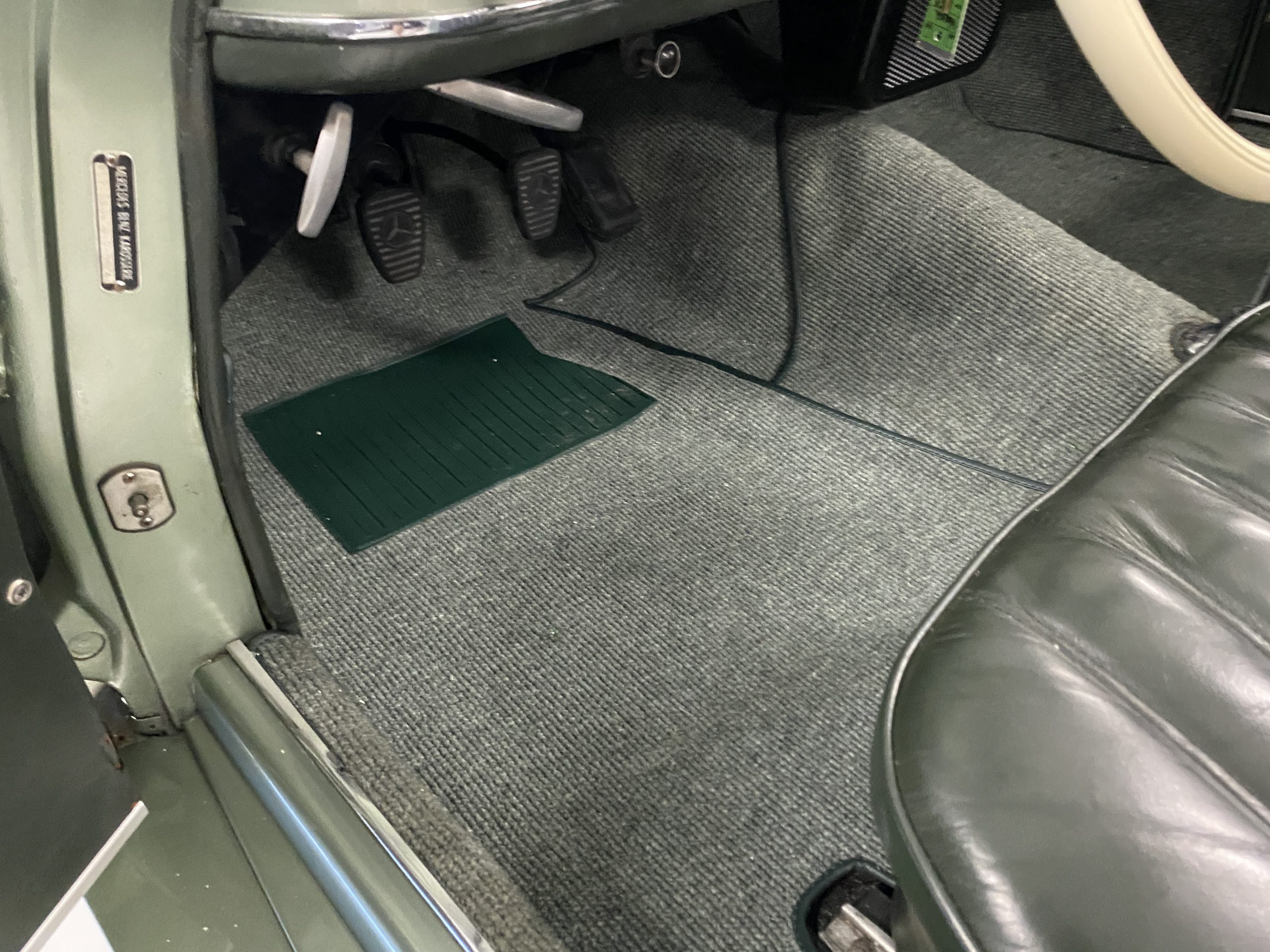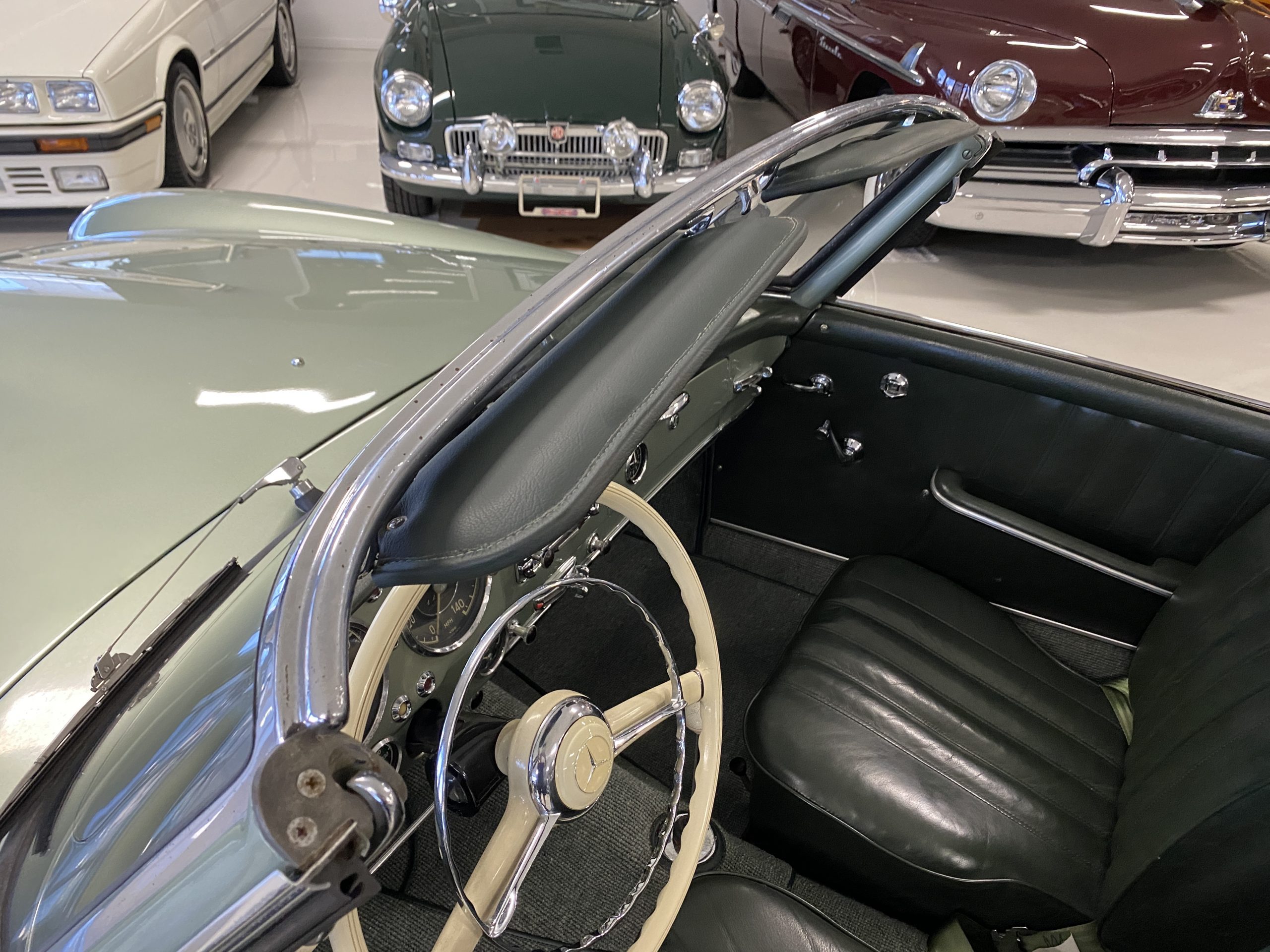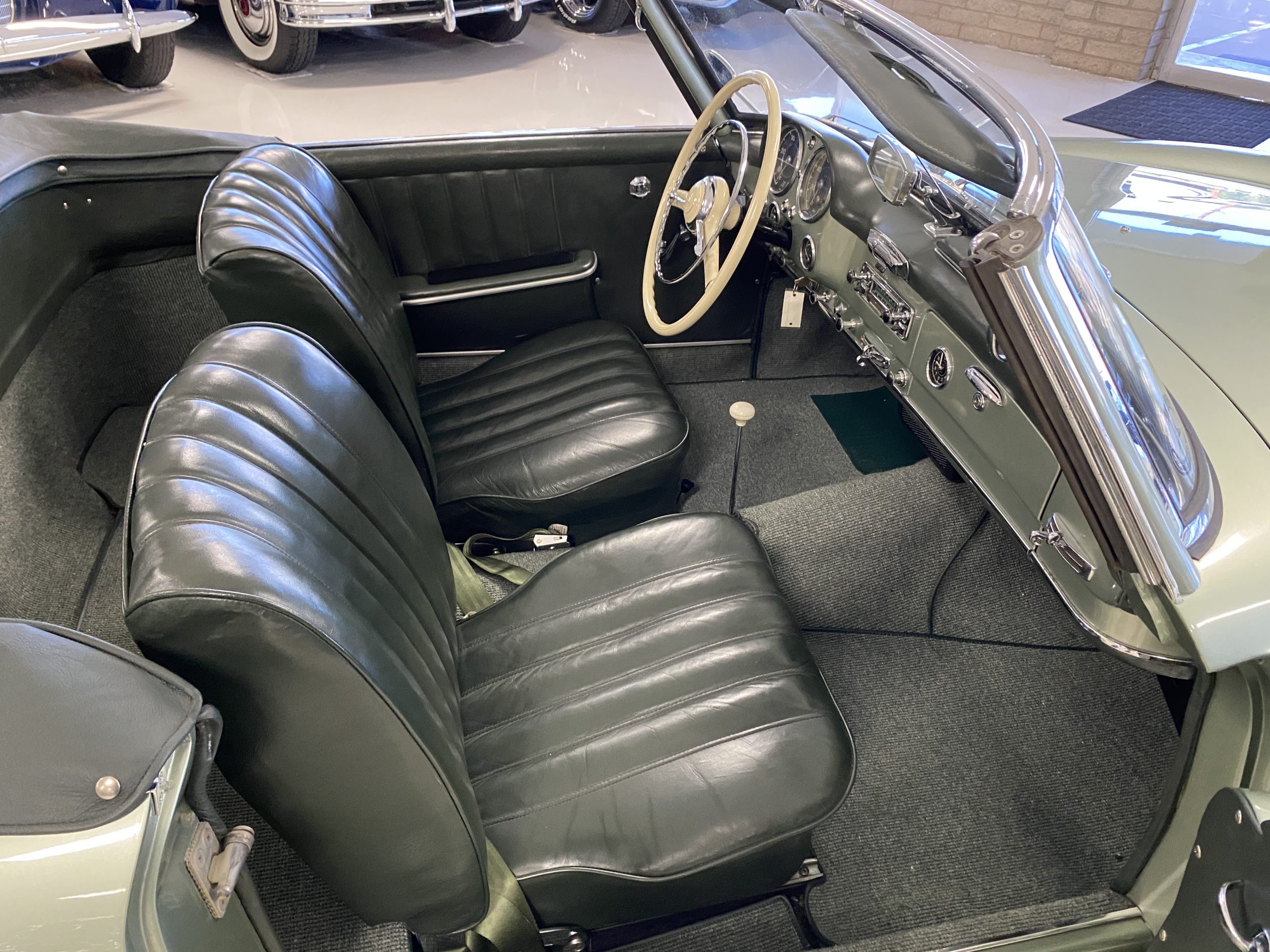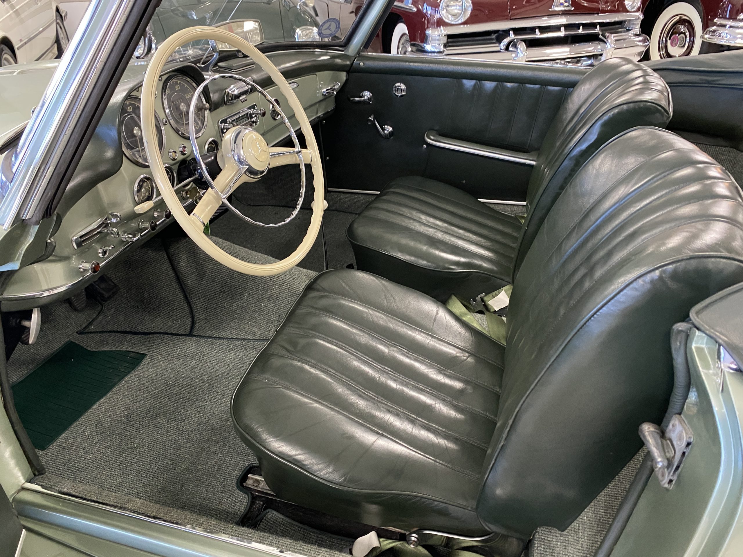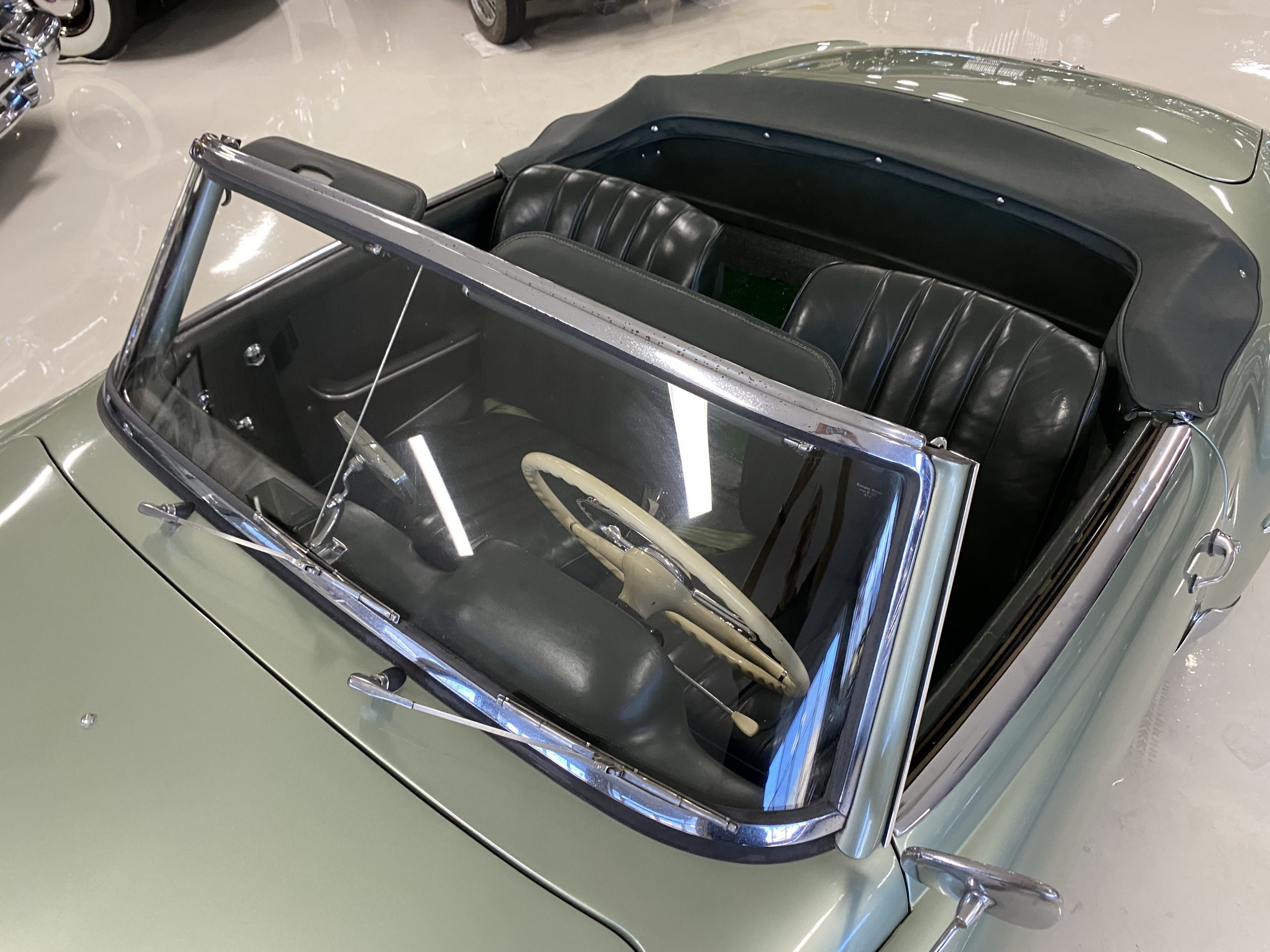 The Light Green Metallic (DB 274 H) livery is truly stunning, whether viewed in doors, in the sunlight or in the shade. The metallic accentuates the curves that the 190SL is known for and reveals a variety of tones from nearly silver to darker green. It is a color that we don’t recall ever seeing on a 190SL, but have seen it on 300Sc coupes and cabriolets. The paint is in overall excellent condition with some areas showing some orange peeling which could be further polished out. The major chrome items such as the grills, hub caps, trim rings, light surrounds and bumpers are restored and re-plated and all look terrific. The windshield frame, door handles and mirror are original and exhibit minor pitting from age. The overall look is stunning.