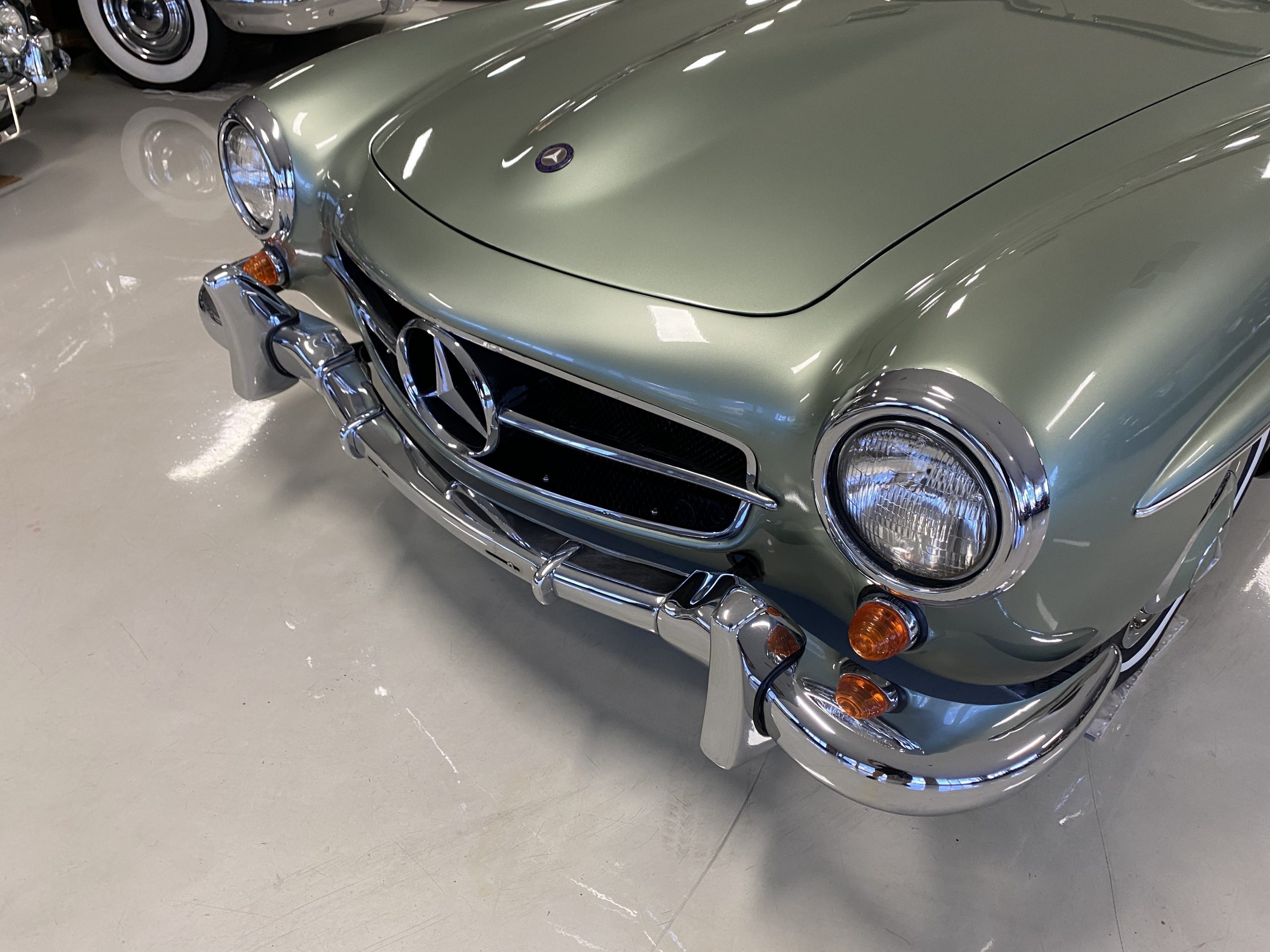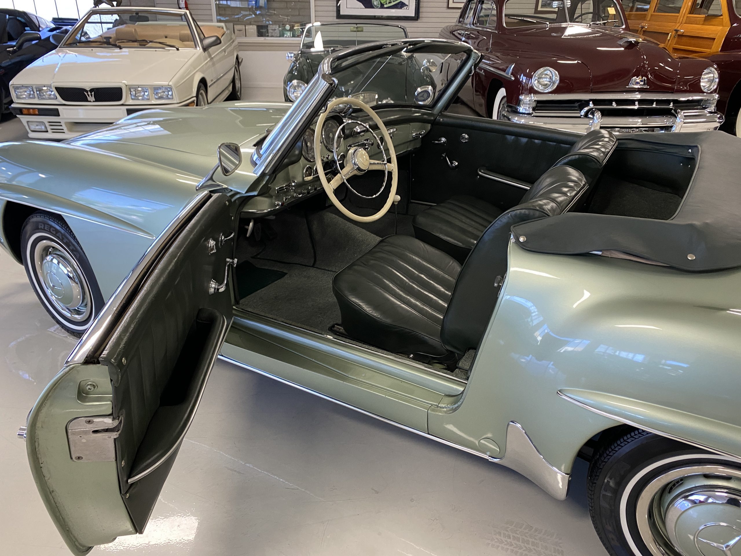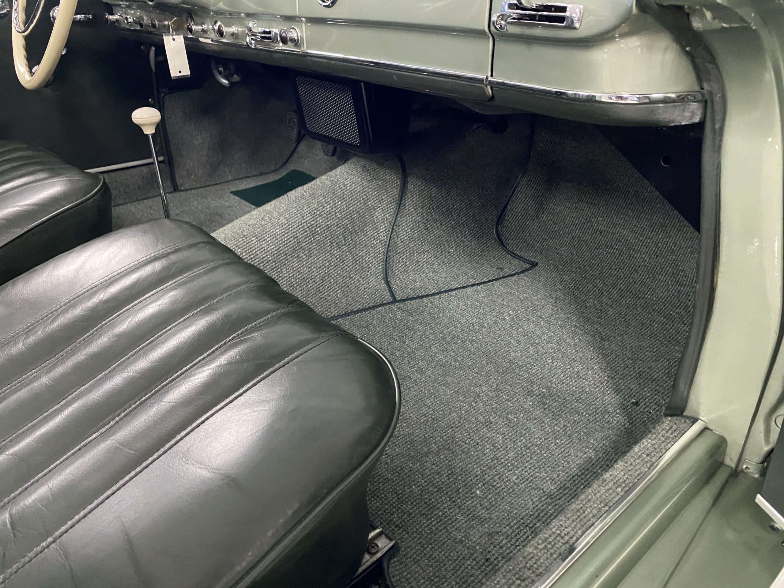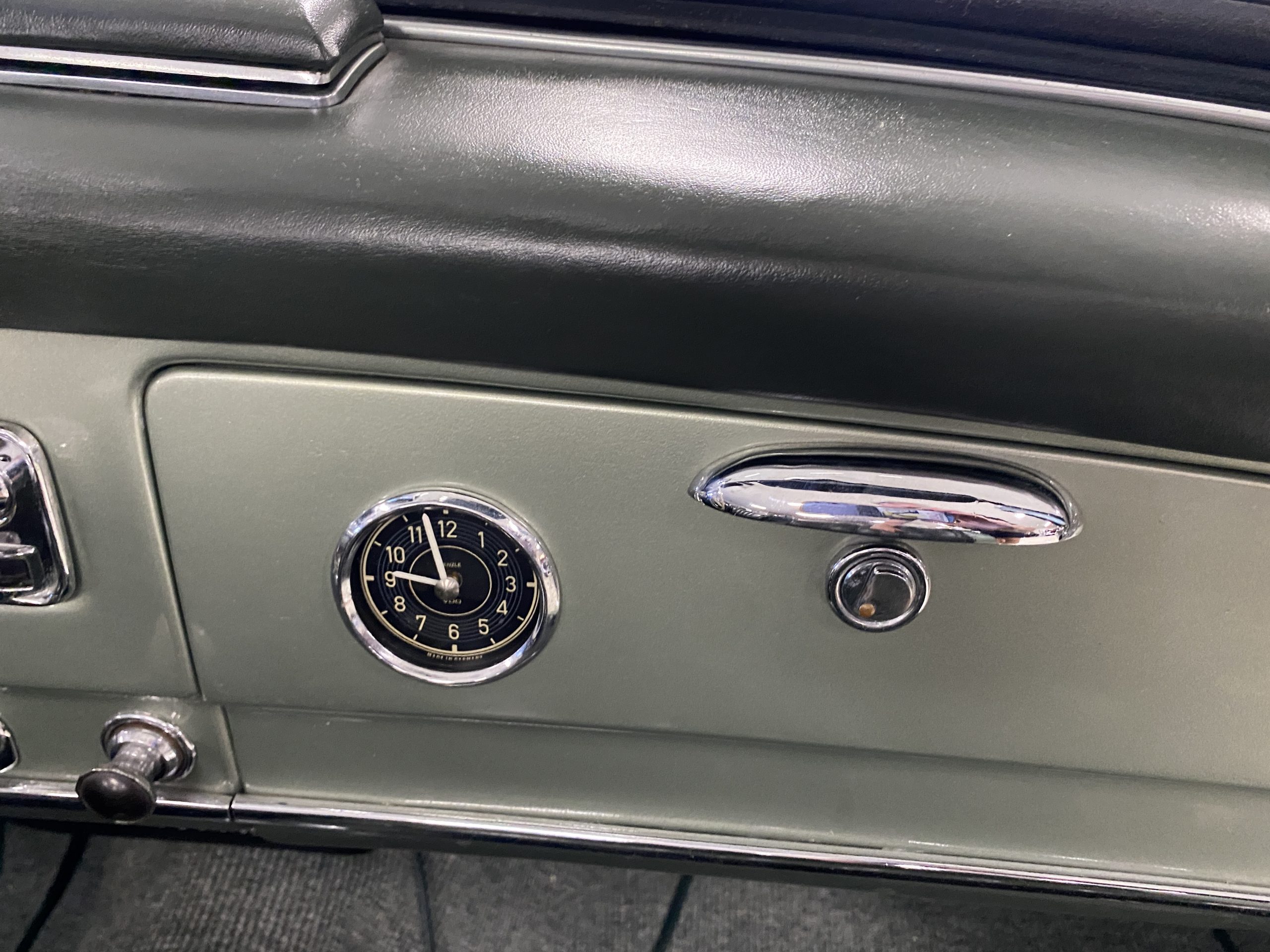 The Light Green Metallic (DB 274 H) livery is truly stunning, whether viewed in doors, in the sunlight or in the shade. The metallic accentuates the curves that the 190SL is known for and reveals a variety of tones from nearly silver to darker green. It is a color that we don’t recall ever seeing on a 190SL, but have seen it on 300Sc coupes and cabriolets. The paint is in overall excellent condition with some areas showing some orange peeling which could be further polished out. The major chrome items such as the grills, hub caps, trim rings, light surrounds and bumpers are restored and re-plated and all look terrific. The windshield frame, door handles and mirror are original and exhibit minor pitting from age. The overall look is stunning.