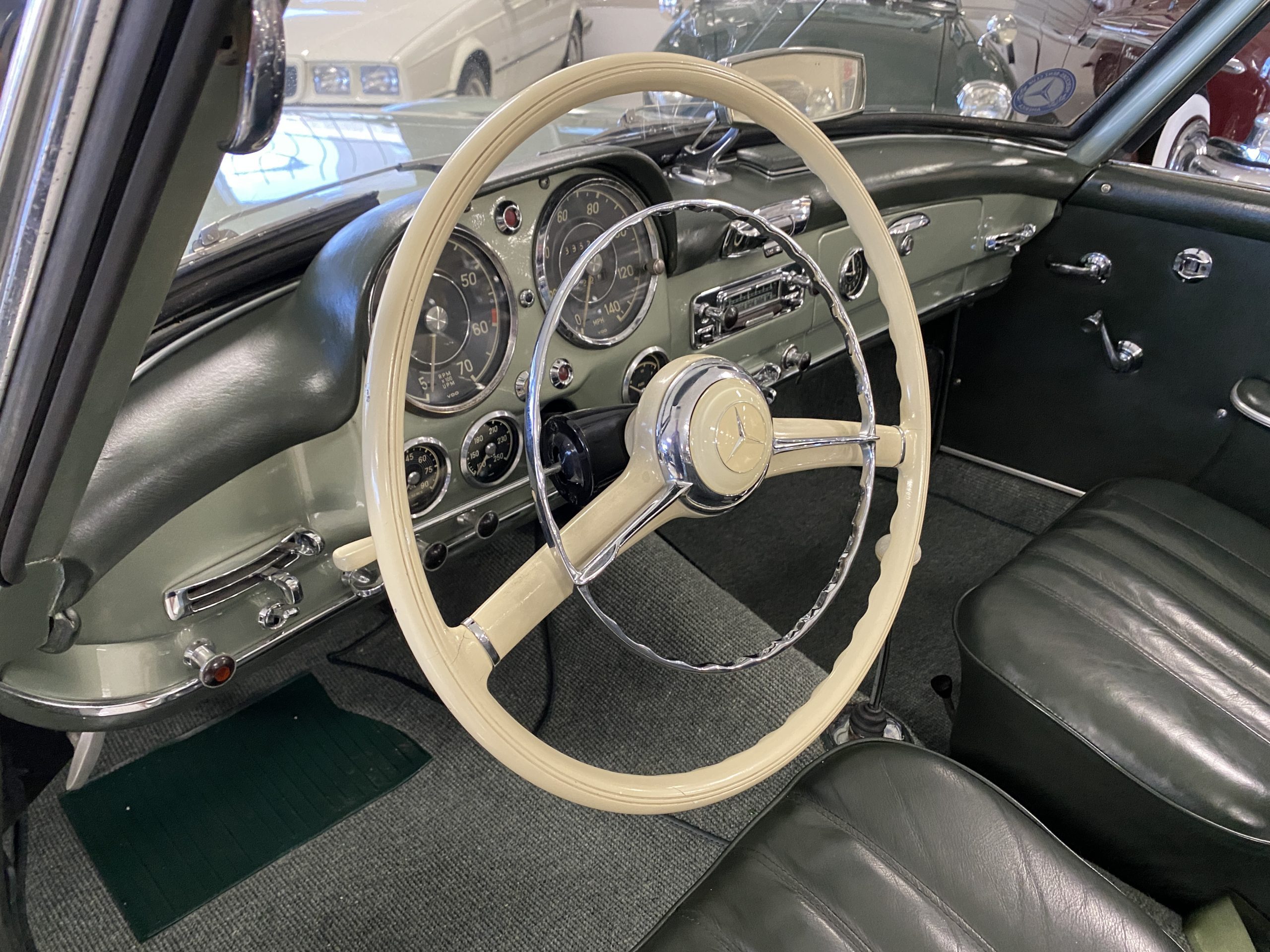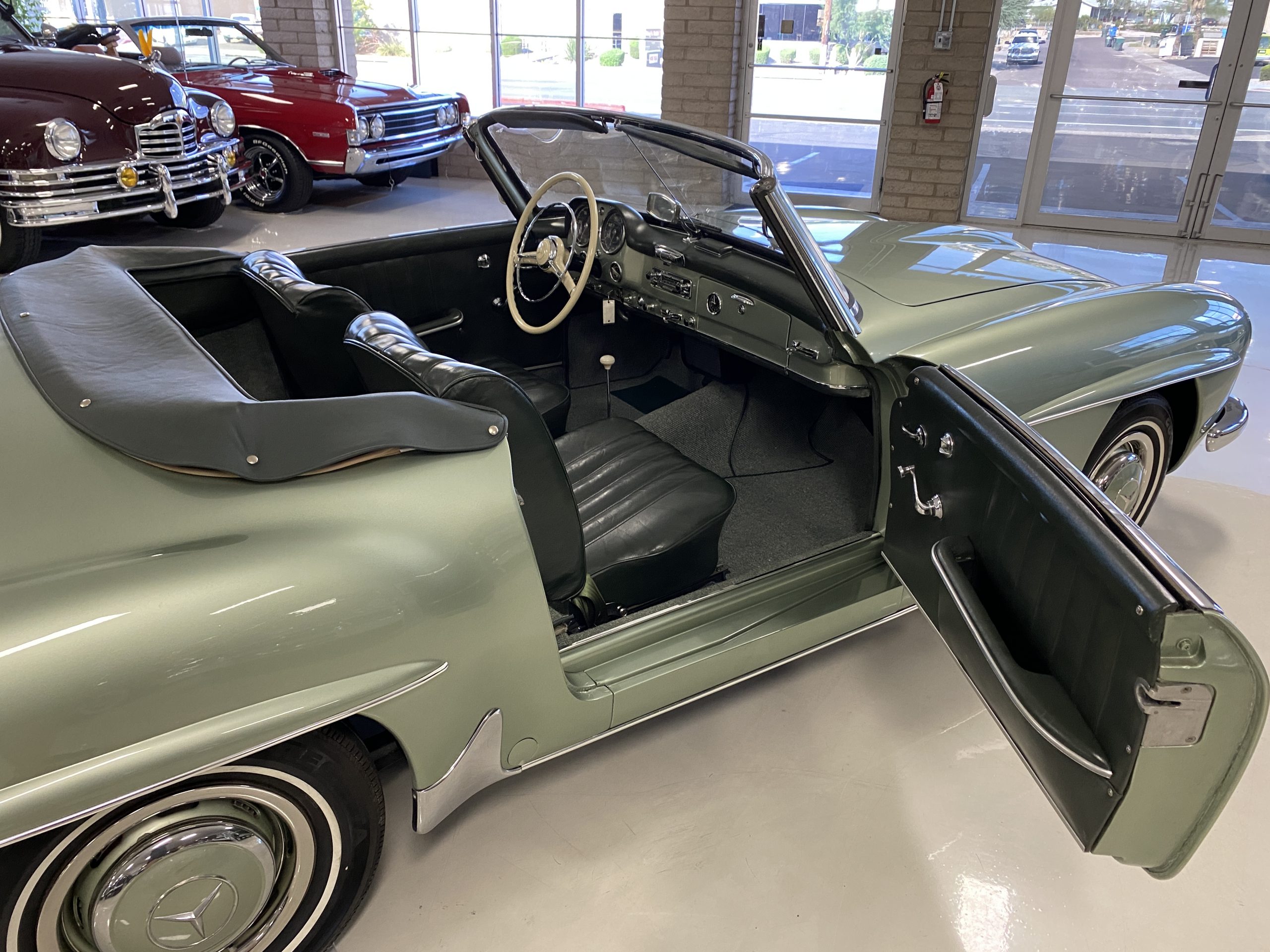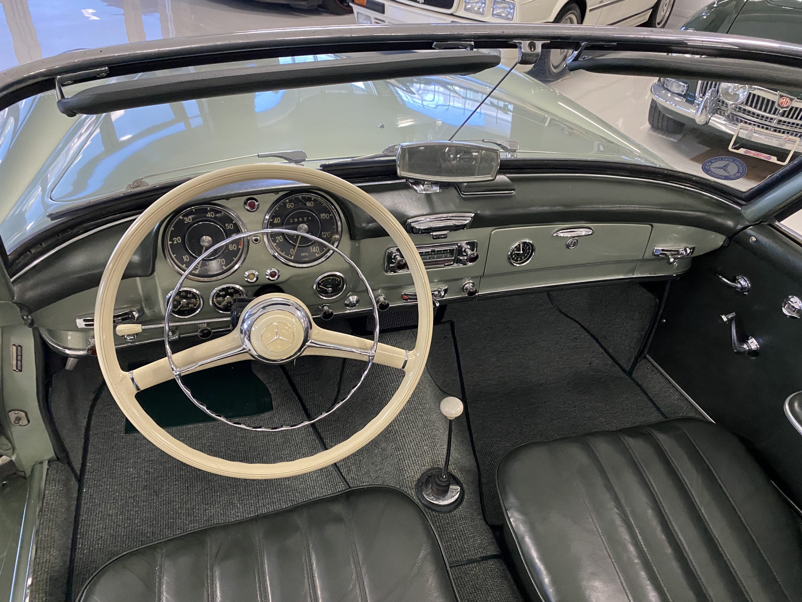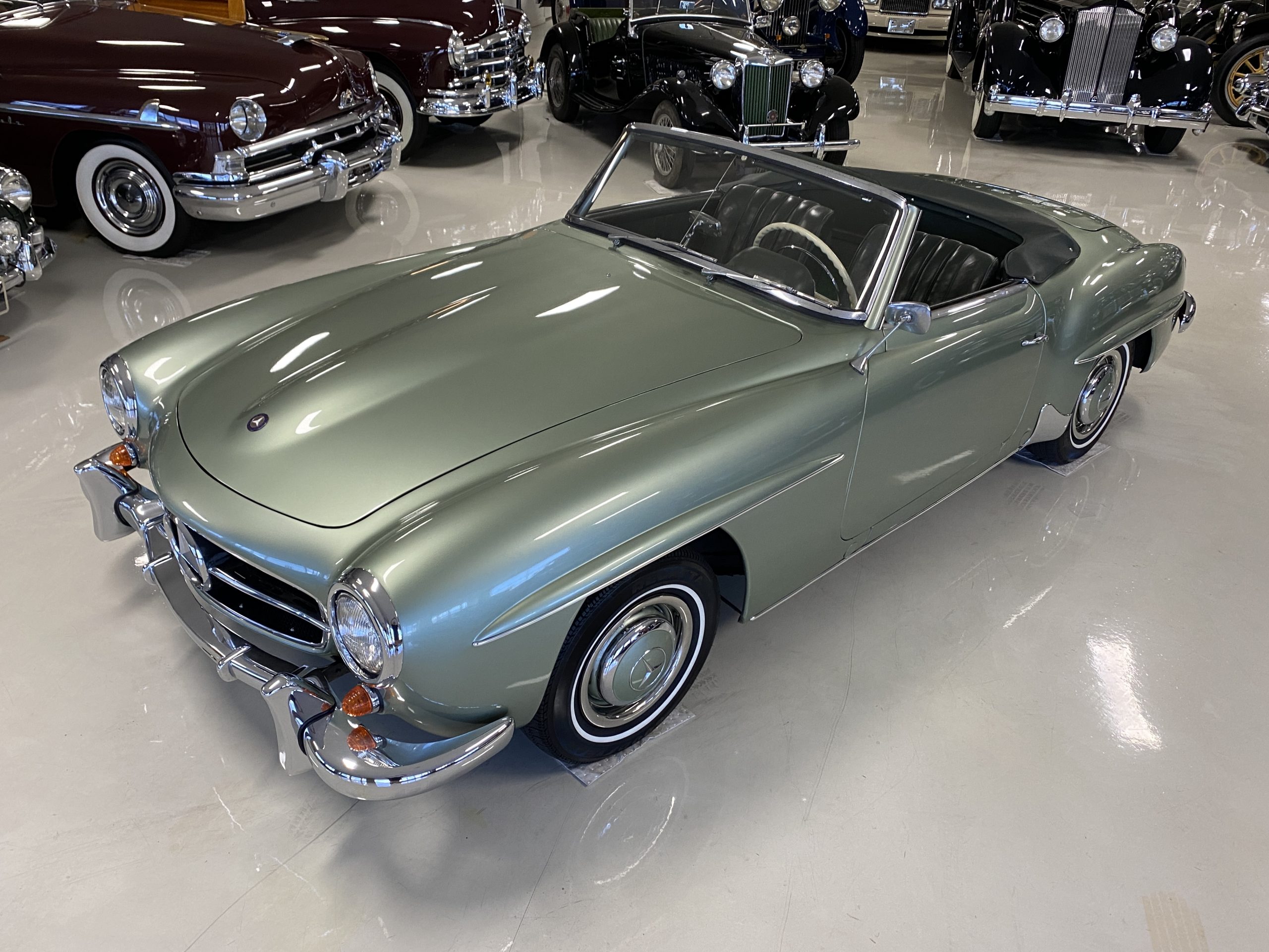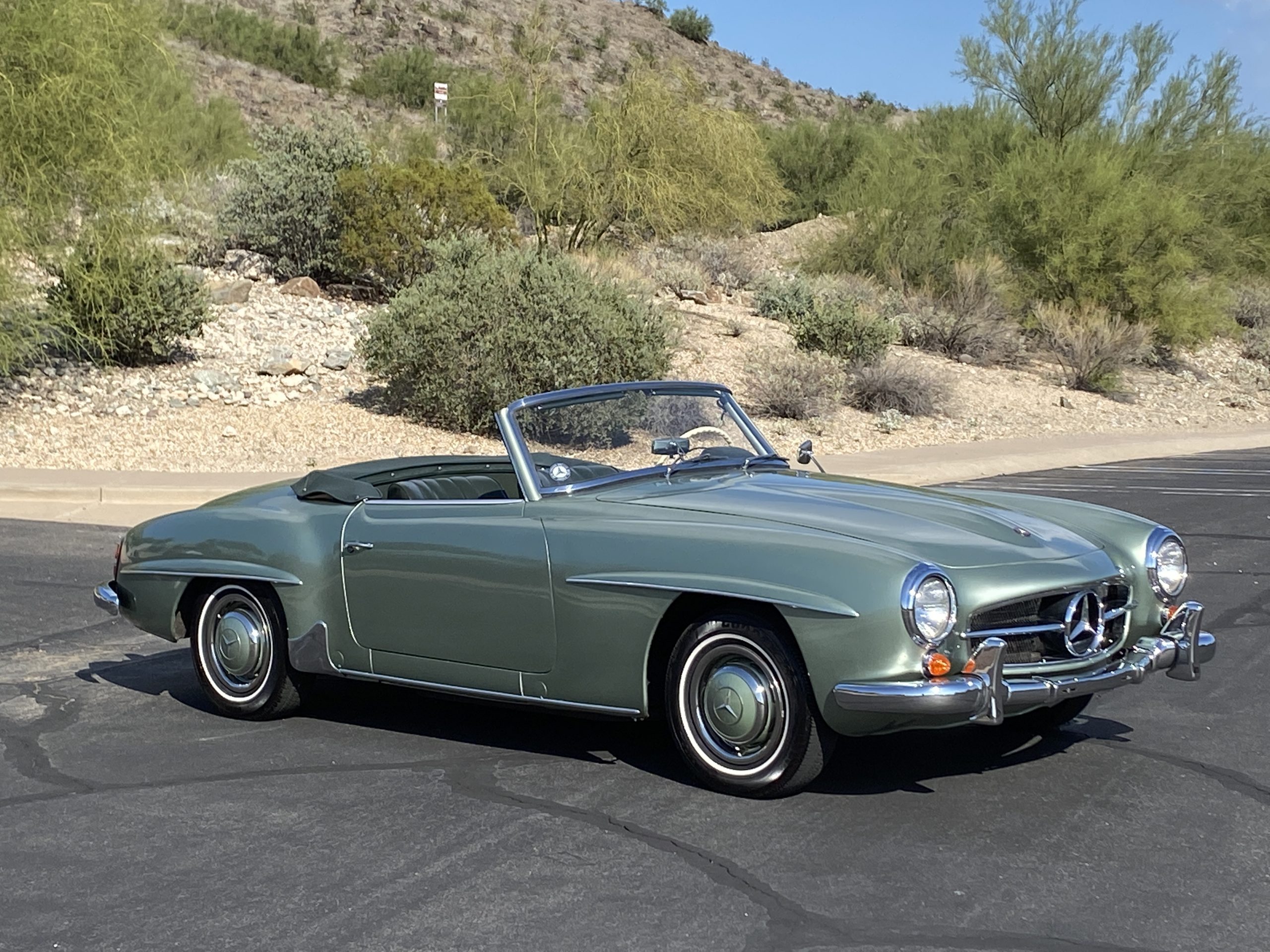 The Light Green Metallic (DB 274 H) livery is truly stunning, whether viewed in doors, in the sunlight or in the shade. The metallic accentuates the curves that the 190SL is known for and reveals a variety of tones from nearly silver to darker green. It is a color that we don’t recall ever seeing on a 190SL, but have seen it on 300Sc coupes and cabriolets. The paint is in overall excellent condition with some areas showing some orange peeling which could be further polished out. The major chrome items such as the grills, hub caps, trim rings, light surrounds and bumpers are restored and re-plated and all look terrific. The windshield frame, door handles and mirror are original and exhibit minor pitting from age. The overall look is stunning.