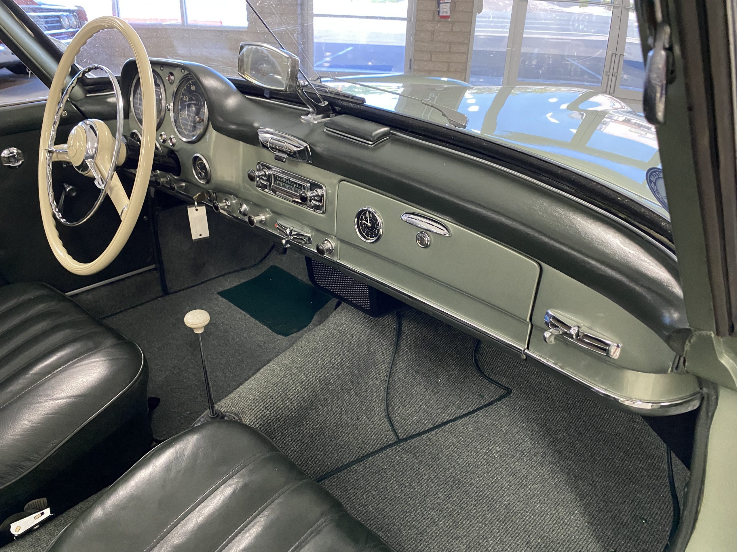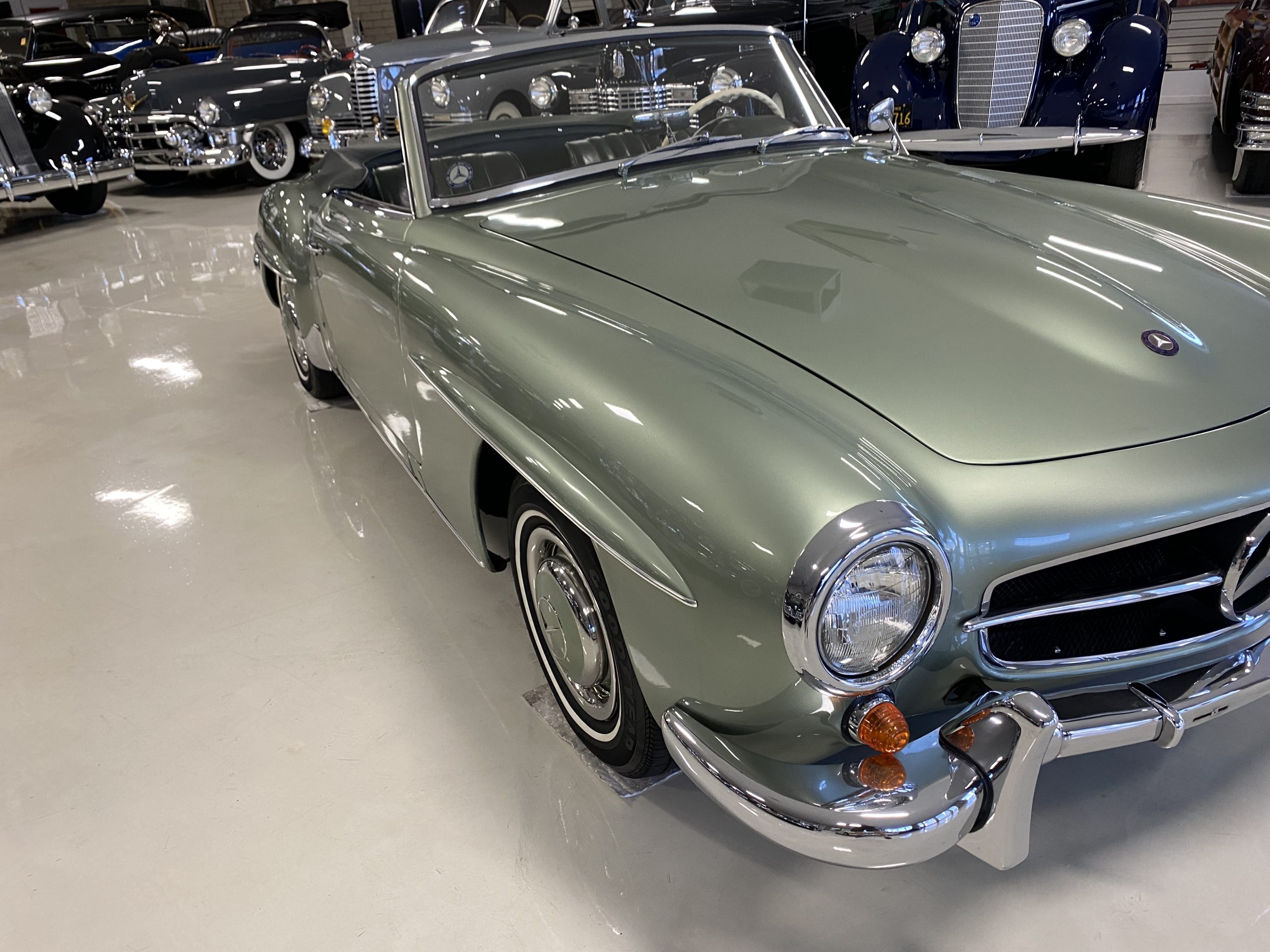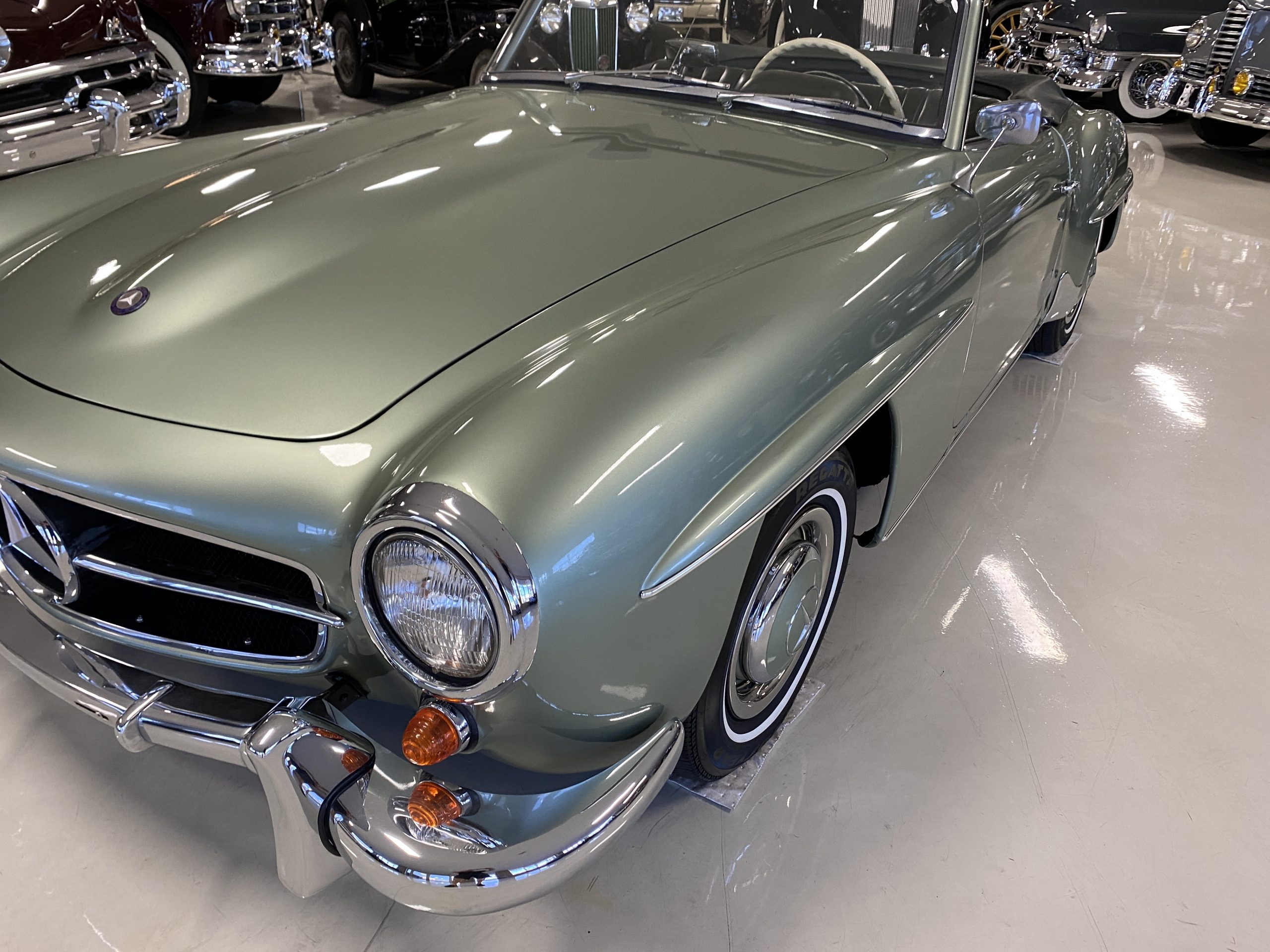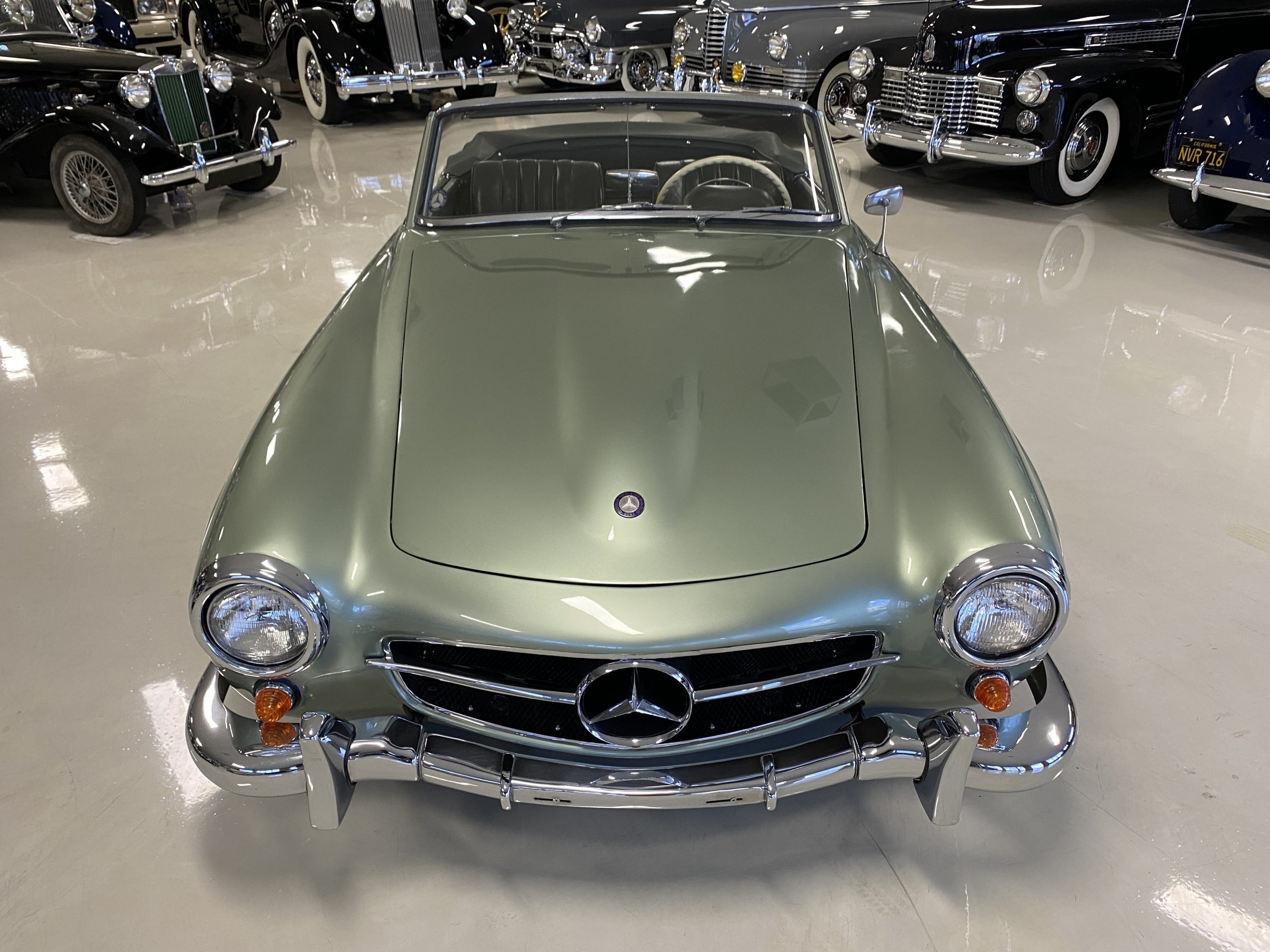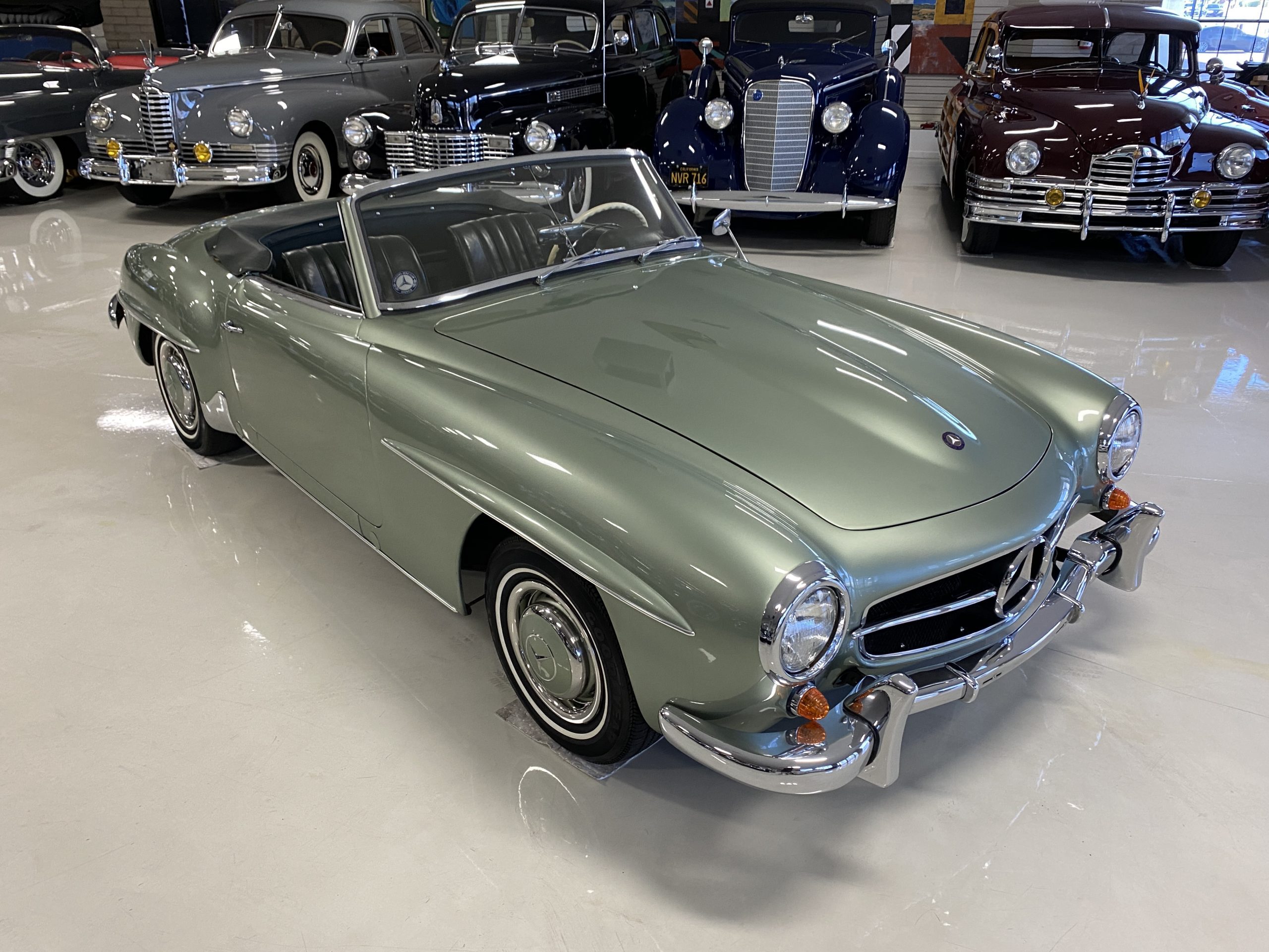 The Light Green Metallic (DB 274 H) livery is truly stunning, whether viewed in doors, in the sunlight or in the shade. The metallic accentuates the curves that the 190SL is known for and reveals a variety of tones from nearly silver to darker green. It is a color that we don’t recall ever seeing on a 190SL, but have seen it on 300Sc coupes and cabriolets. The paint is in overall excellent condition with some areas showing some orange peeling which could be further polished out. The major chrome items such as the grills, hub caps, trim rings, light surrounds and bumpers are restored and re-plated and all look terrific. The windshield frame, door handles and mirror are original and exhibit minor pitting from age. The overall look is stunning.
