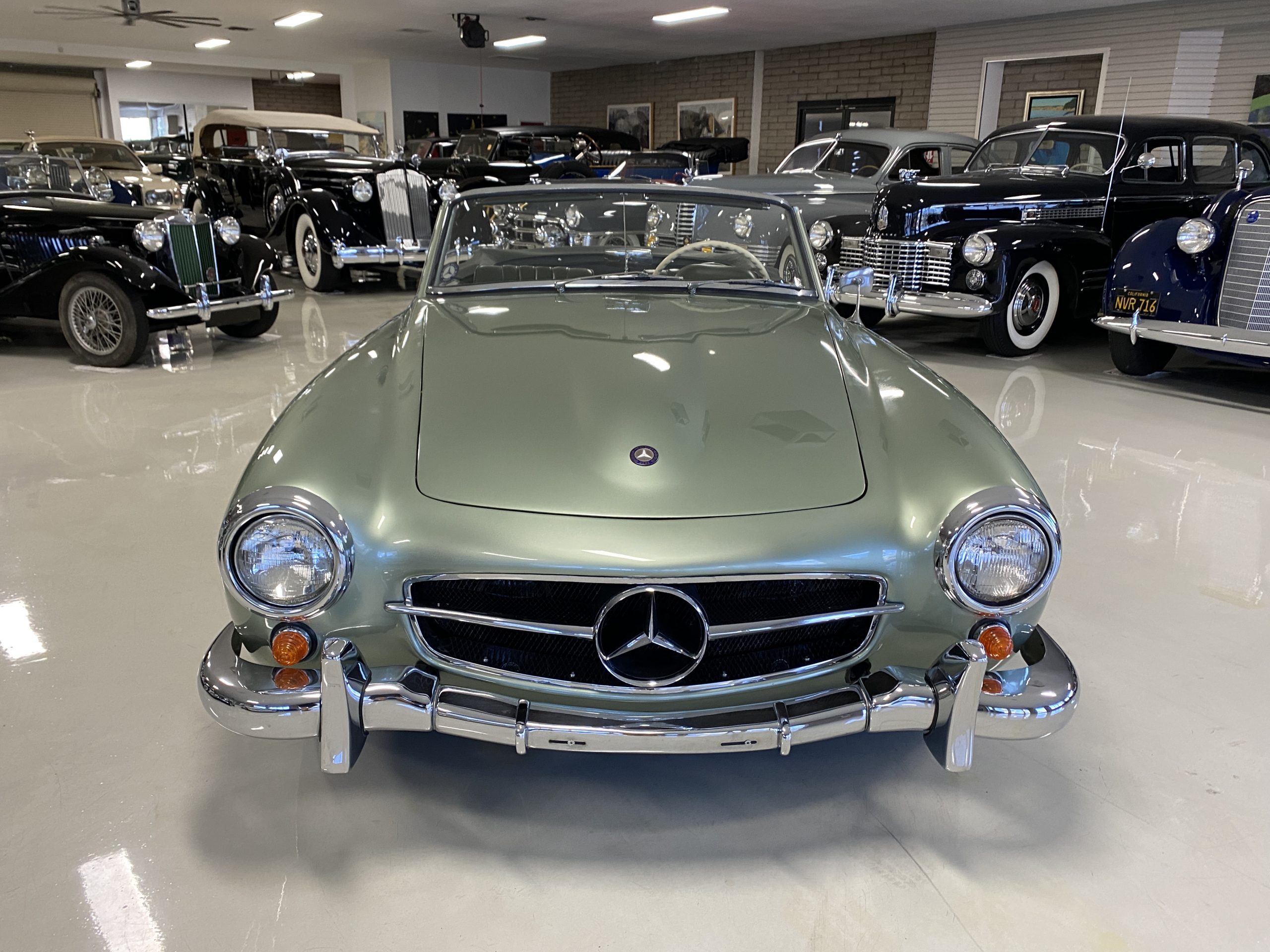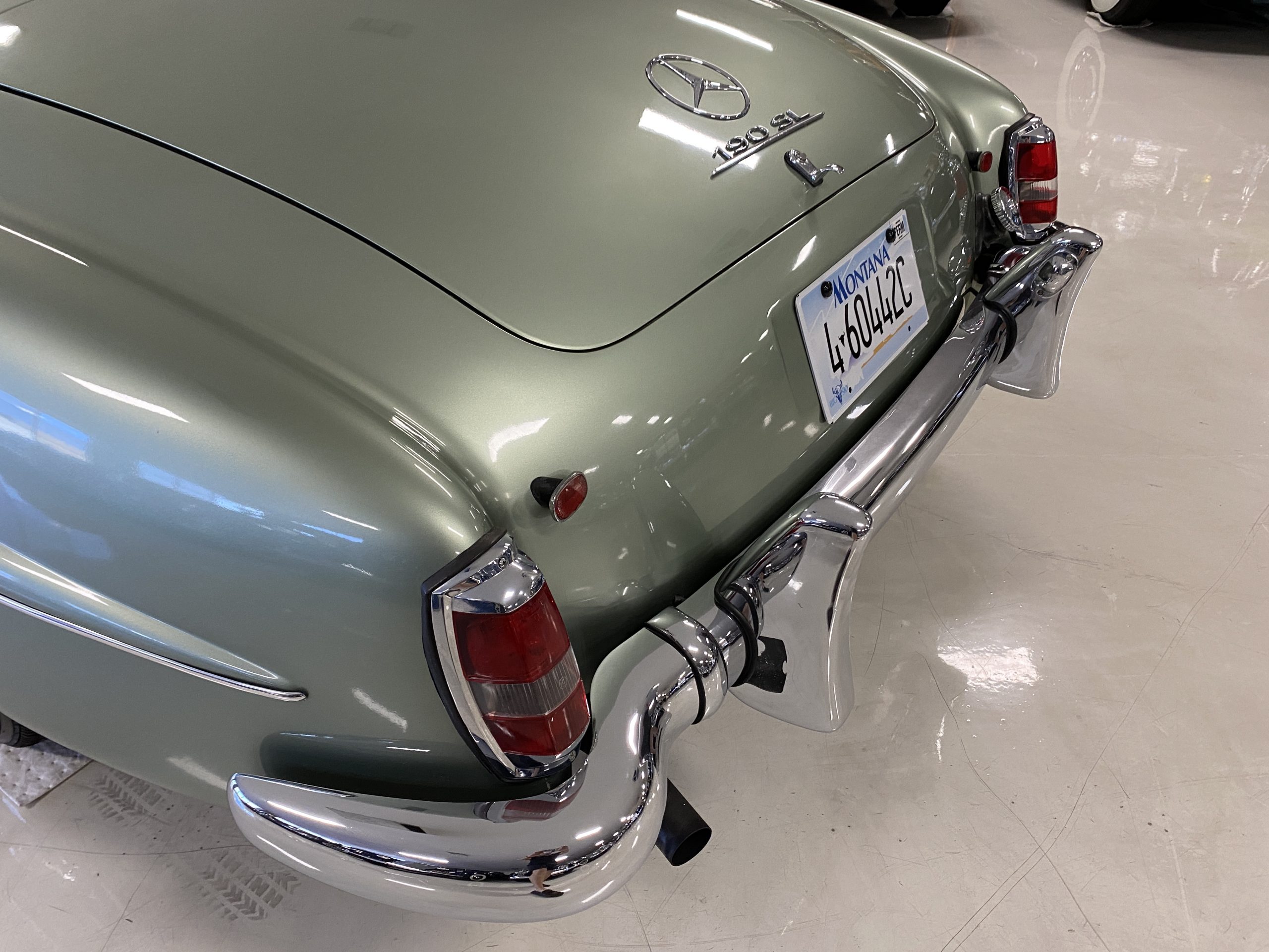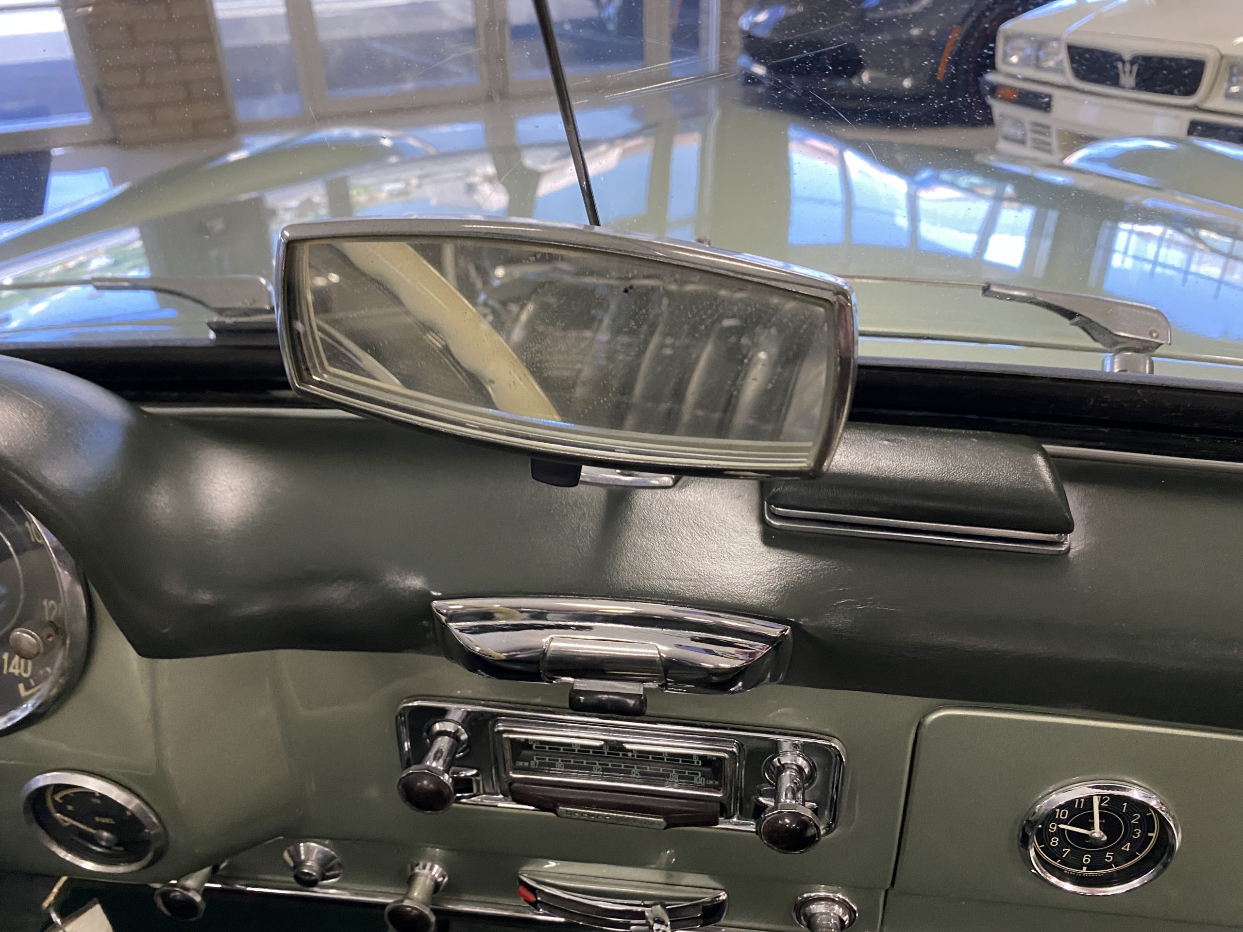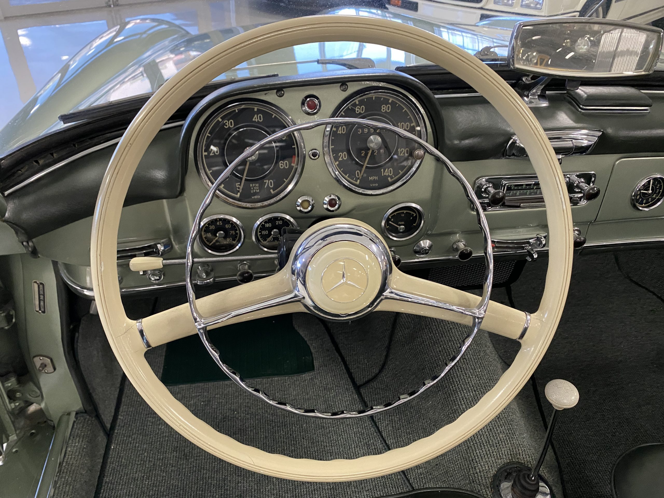 The Light Green Metallic (DB 274 H) livery is truly stunning, whether viewed in doors, in the sunlight or in the shade. The metallic accentuates the curves that the 190SL is known for and reveals a variety of tones from nearly silver to darker green. It is a color that we don’t recall ever seeing on a 190SL, but have seen it on 300Sc coupes and cabriolets. The paint is in overall excellent condition with some areas showing some orange peeling which could be further polished out. The major chrome items such as the grills, hub caps, trim rings, light surrounds and bumpers are restored and re-plated and all look terrific. The windshield frame, door handles and mirror are original and exhibit minor pitting from age. The overall look is stunning.