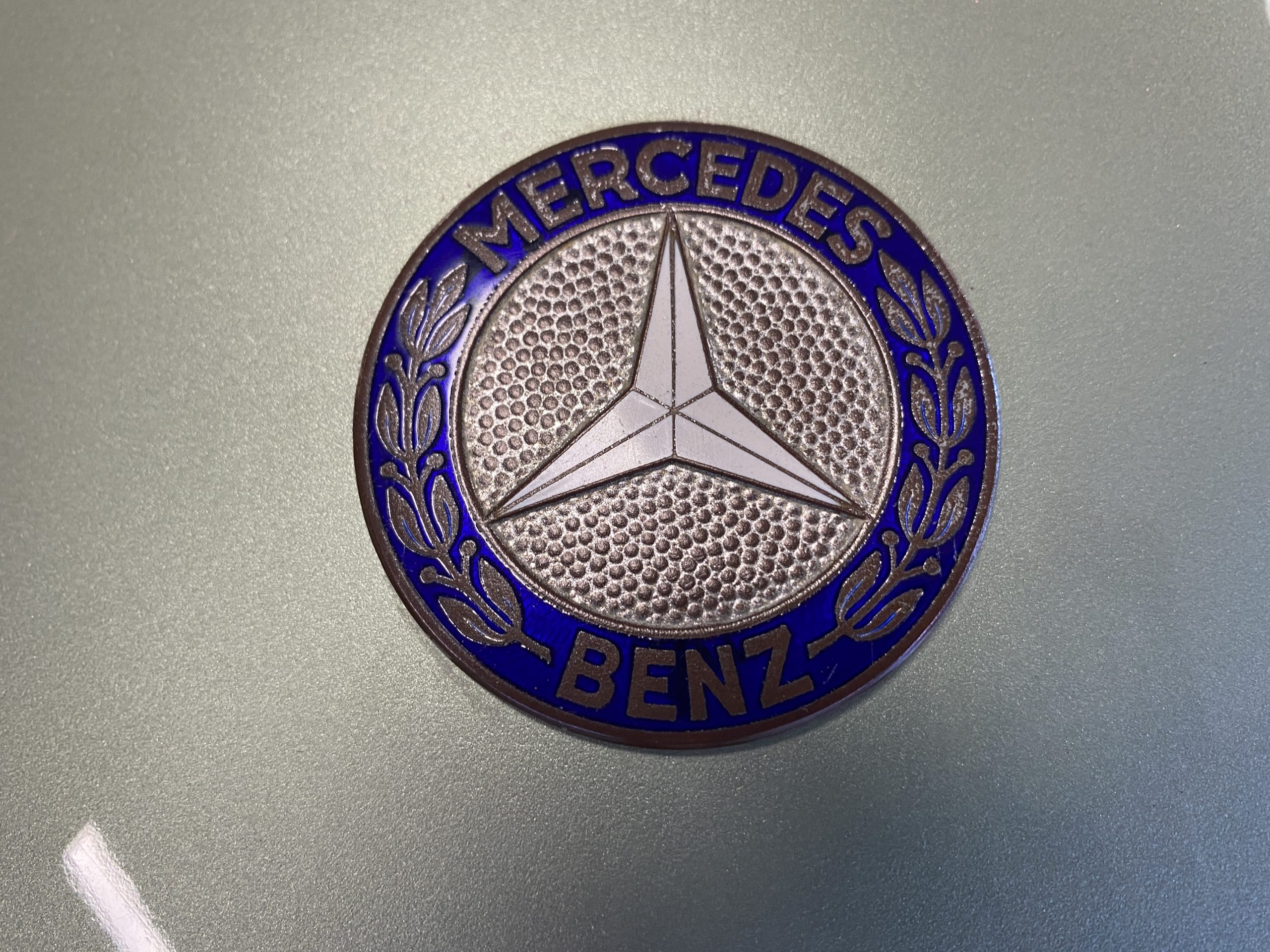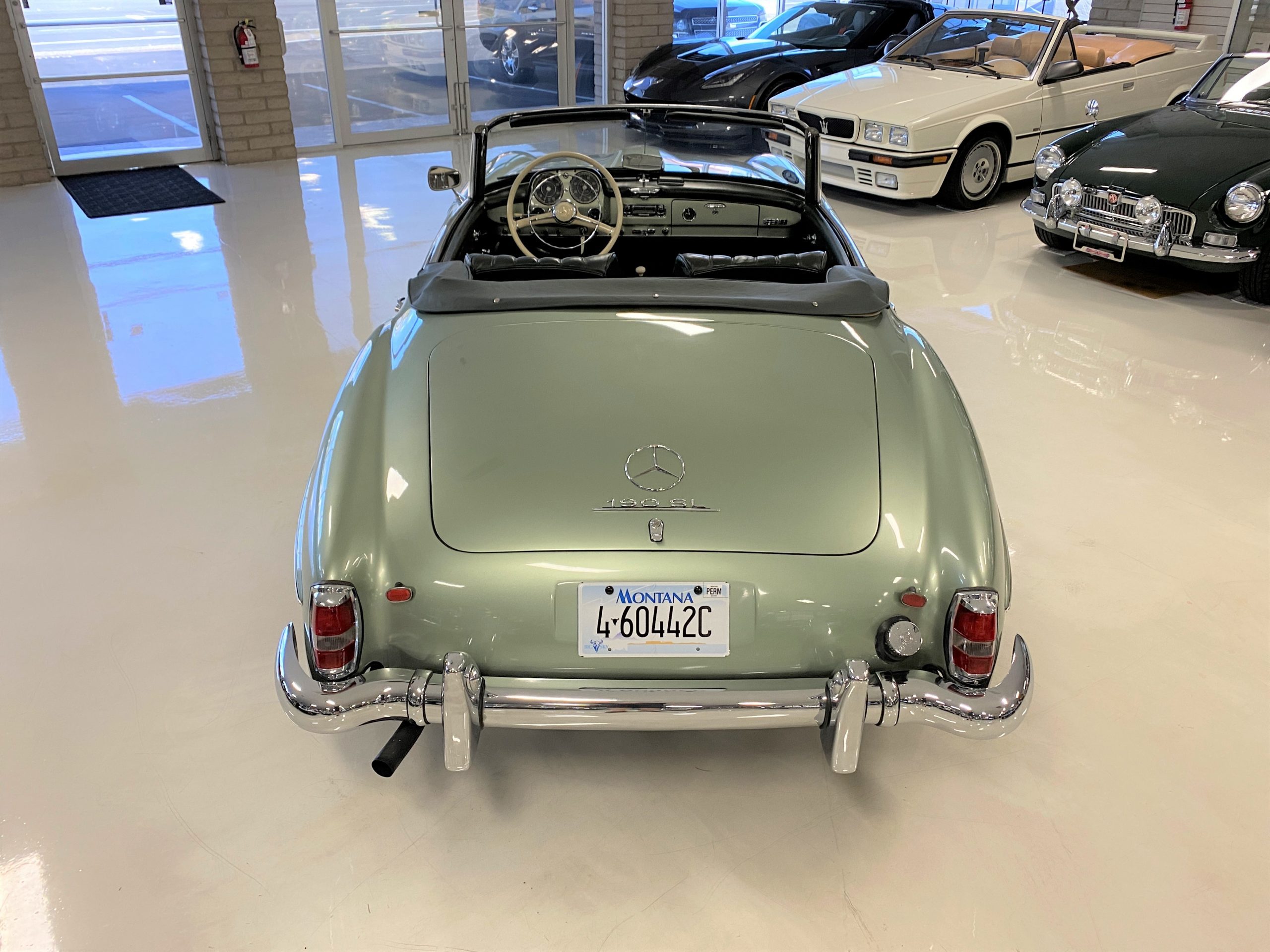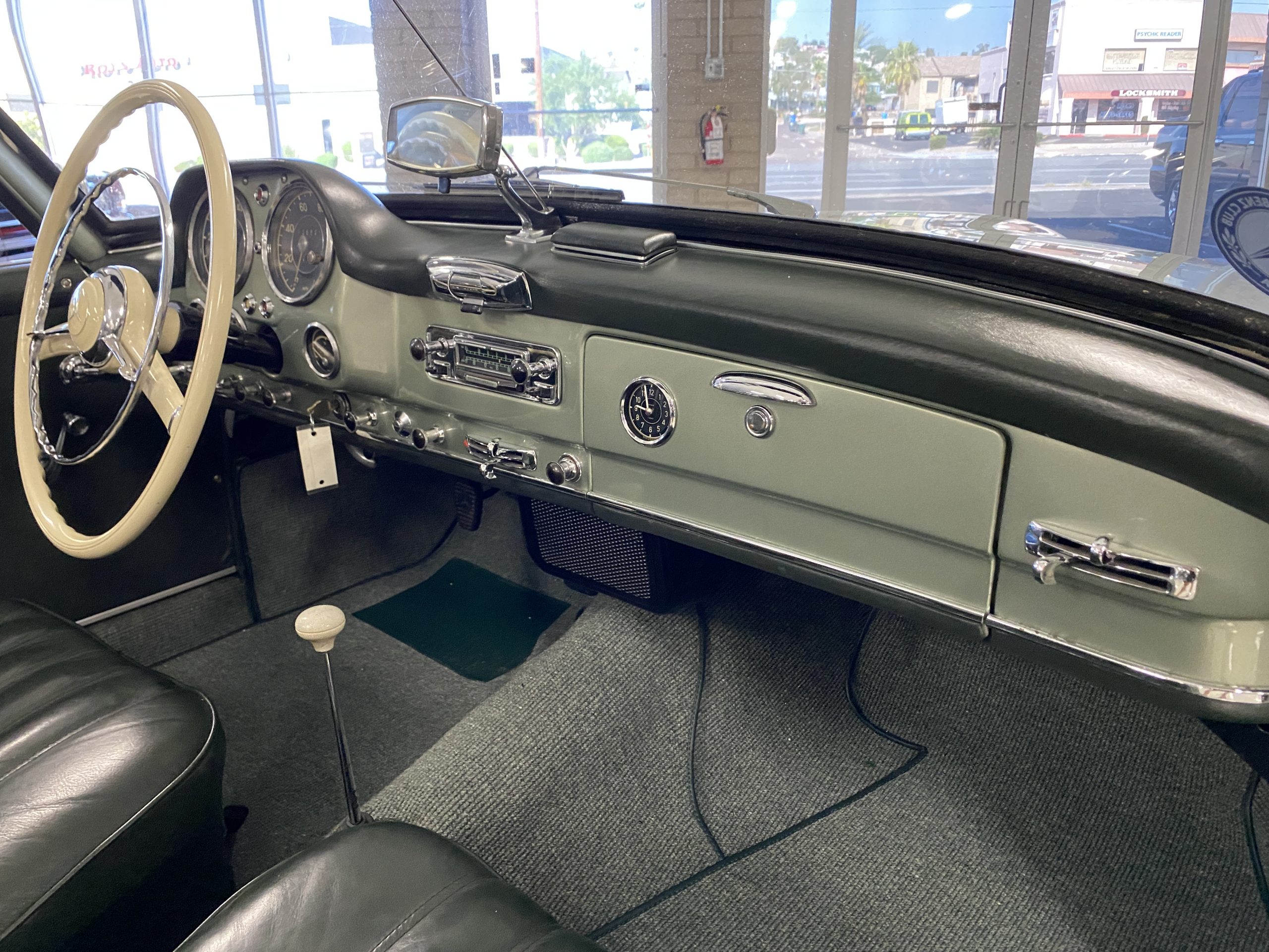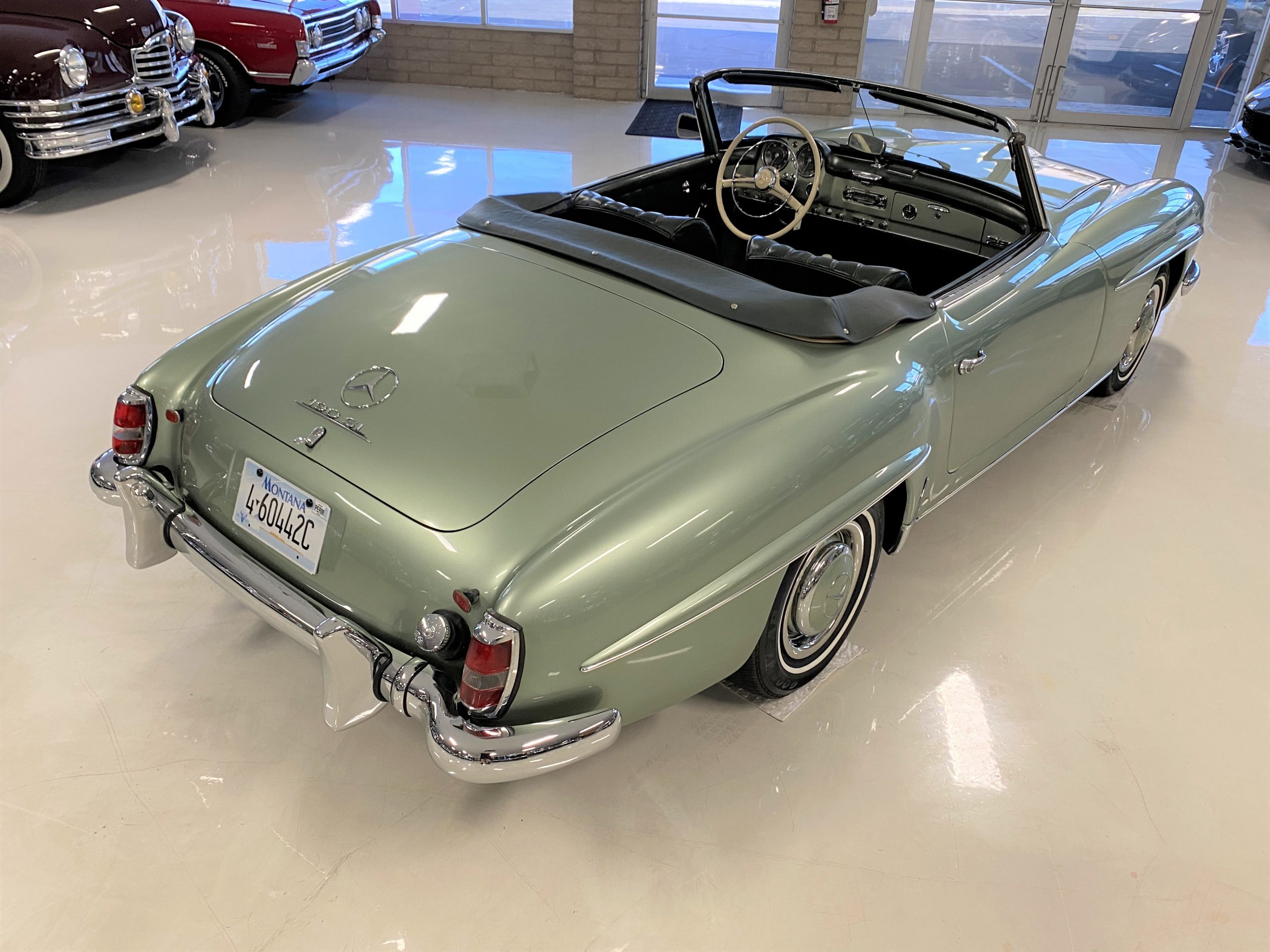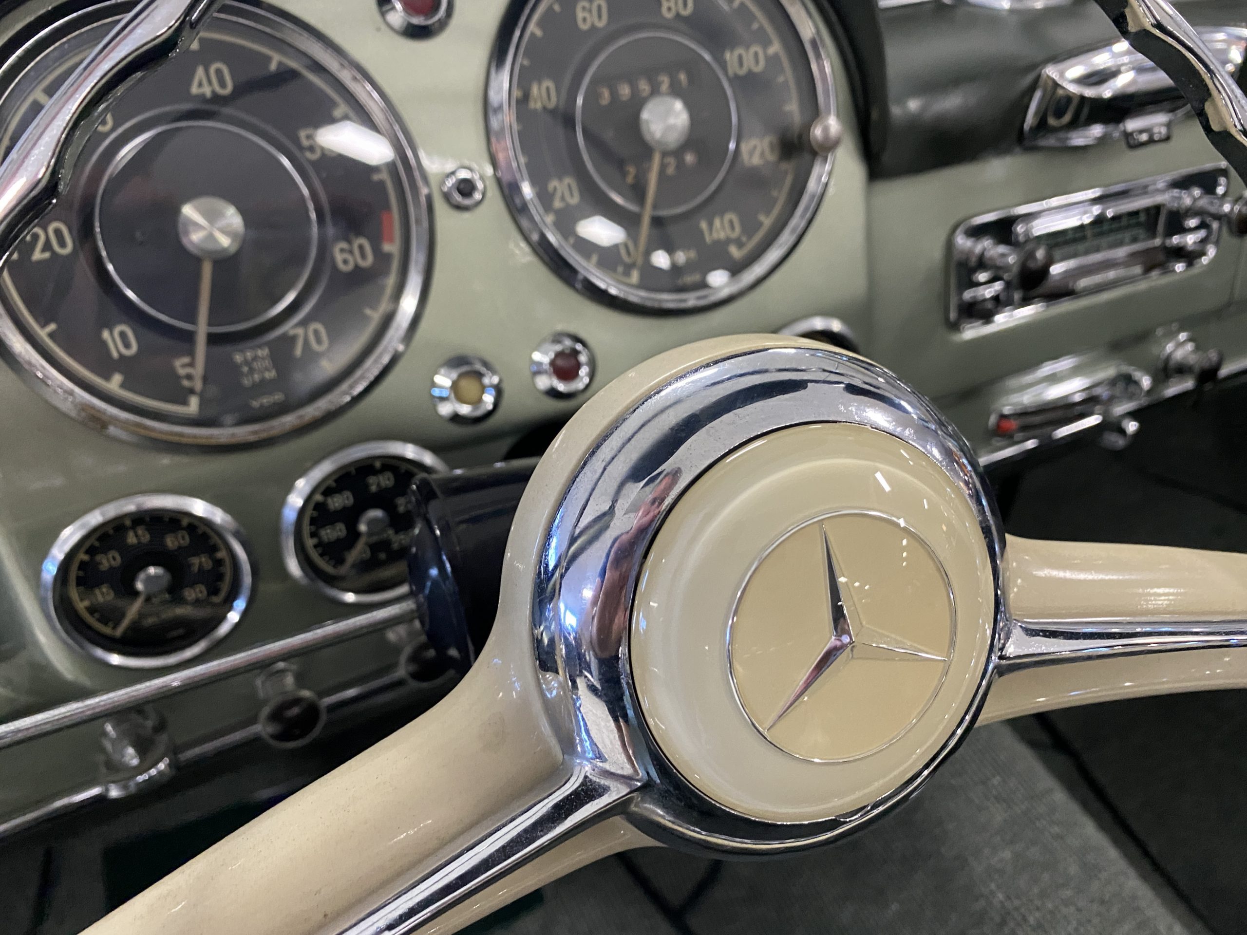 The Light Green Metallic (DB 274 H) livery is truly stunning, whether viewed in doors, in the sunlight or in the shade. The metallic accentuates the curves that the 190SL is known for and reveals a variety of tones from nearly silver to darker green. It is a color that we don’t recall ever seeing on a 190SL, but have seen it on 300Sc coupes and cabriolets. The paint is in overall excellent condition with some areas showing some orange peeling which could be further polished out. The major chrome items such as the grills, hub caps, trim rings, light surrounds and bumpers are restored and re-plated and all look terrific. The windshield frame, door handles and mirror are original and exhibit minor pitting from age. The overall look is stunning.