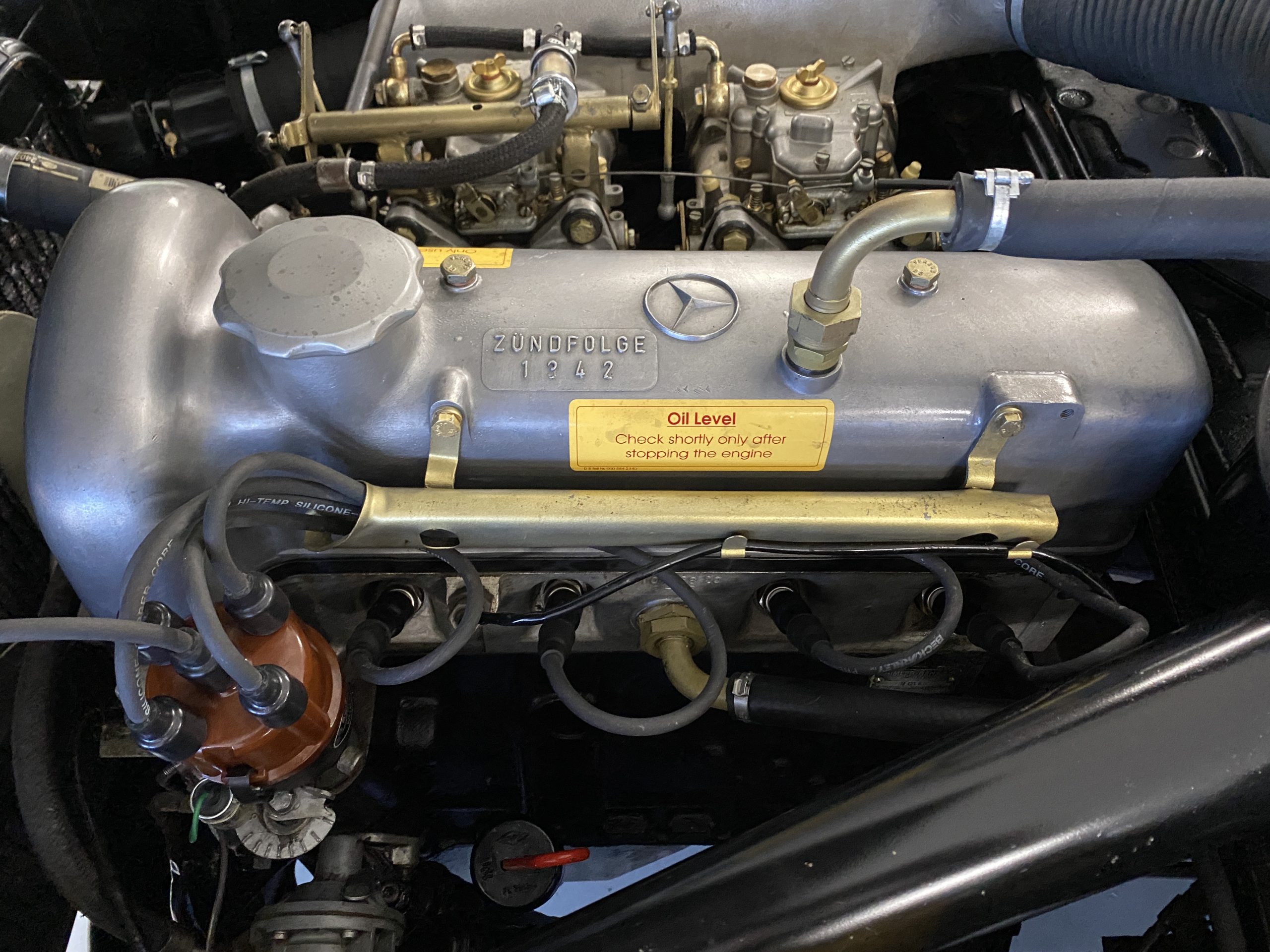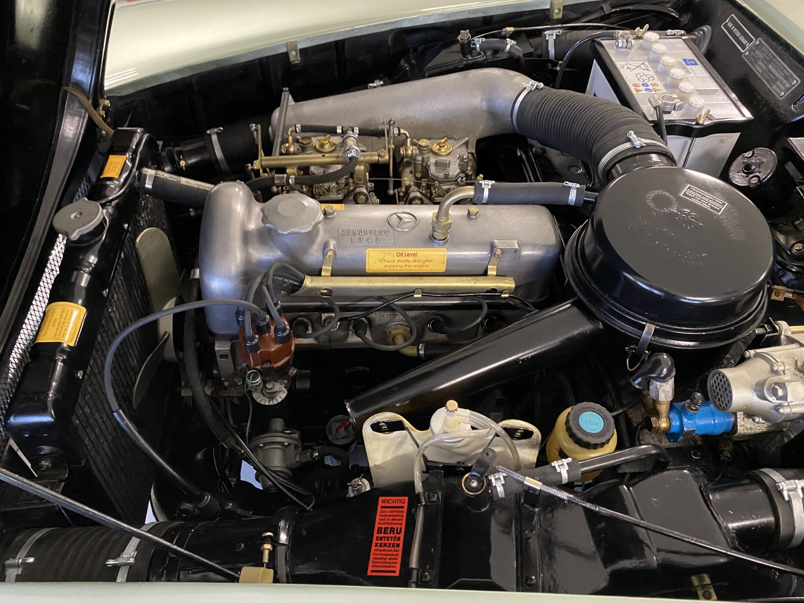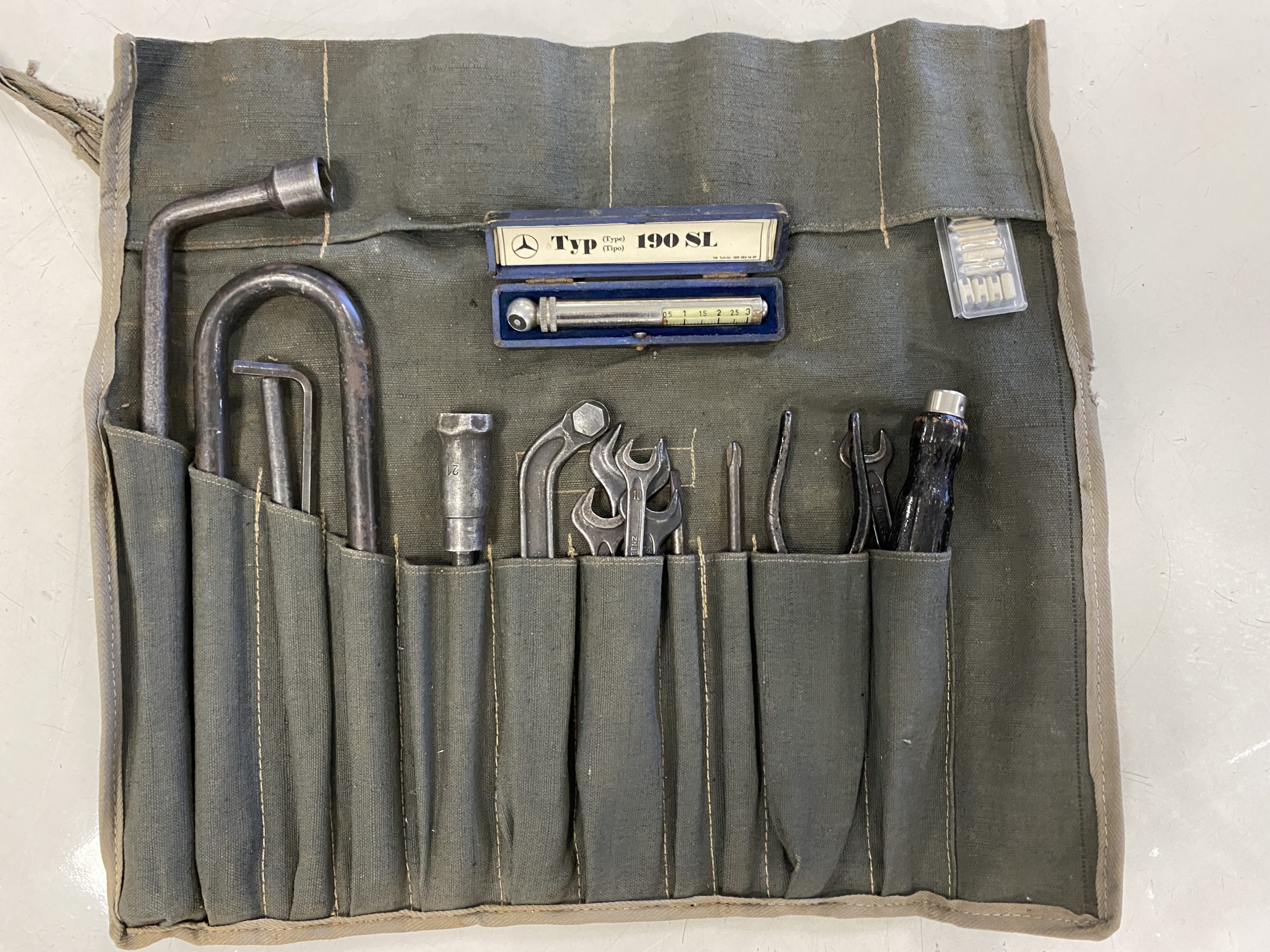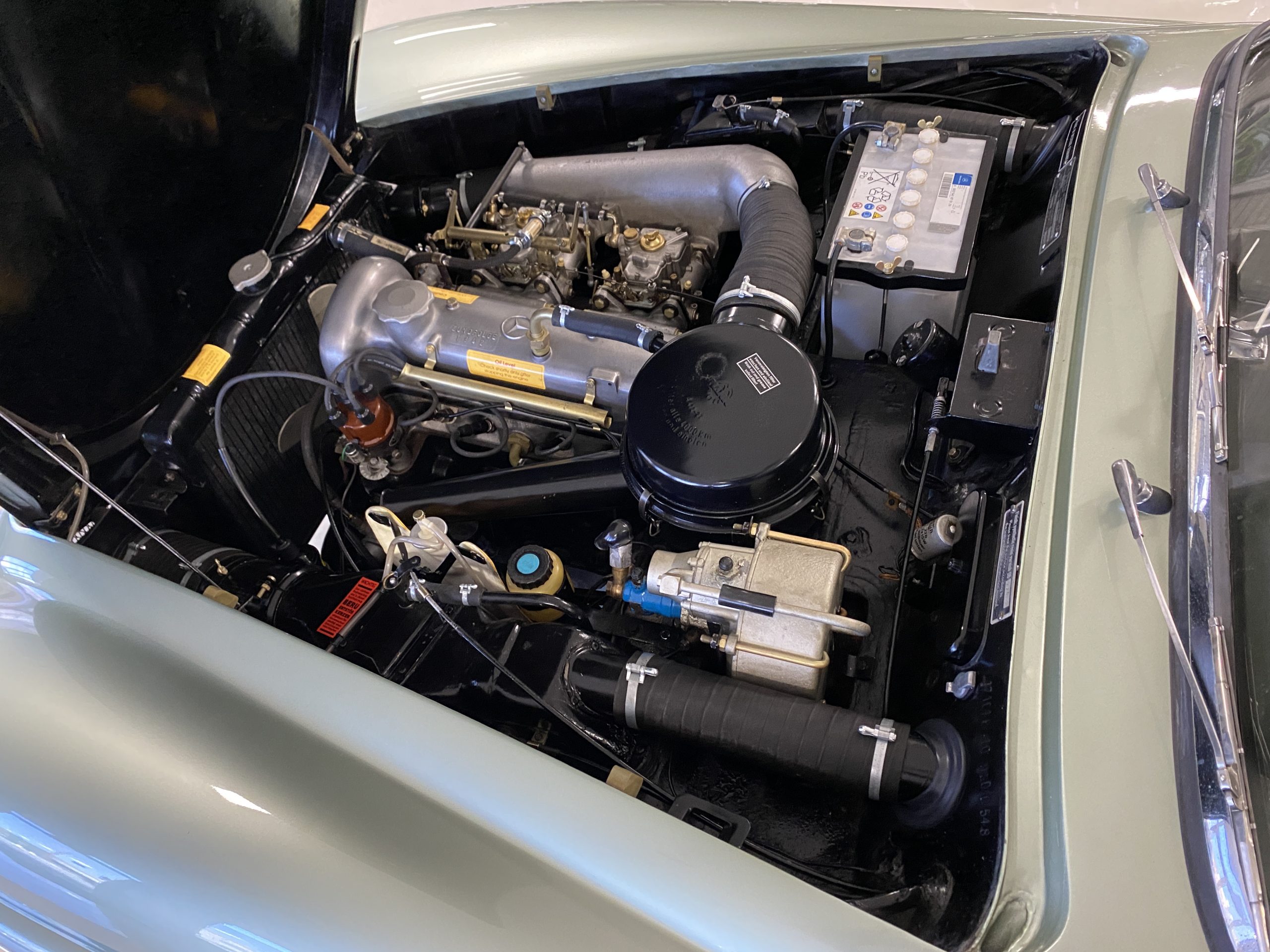 The engine compartments is very well detailed, well enough for showing at regional car shows. The original Solex carbs are included in the sale but have been replaced with Weber carburetors (thank goodness) for performance and reliability. The original starter has also been replaced with a faster more efficient starter, with the original starter included in the sale. Also included in the sale are a load of spare parts, all new, an owners manual, original complete tool set and roll as well as the correct 190SL tire pressure gauge.