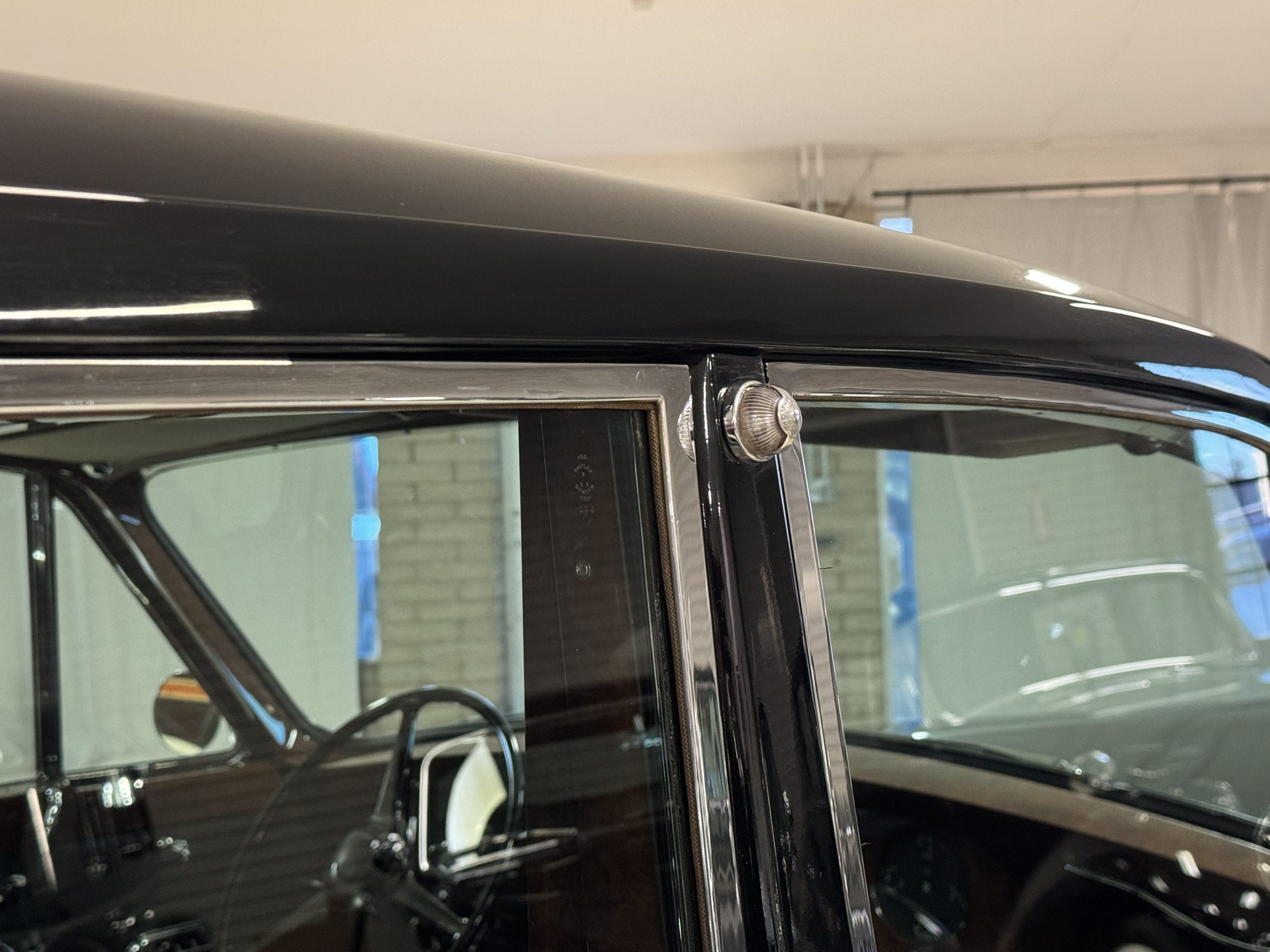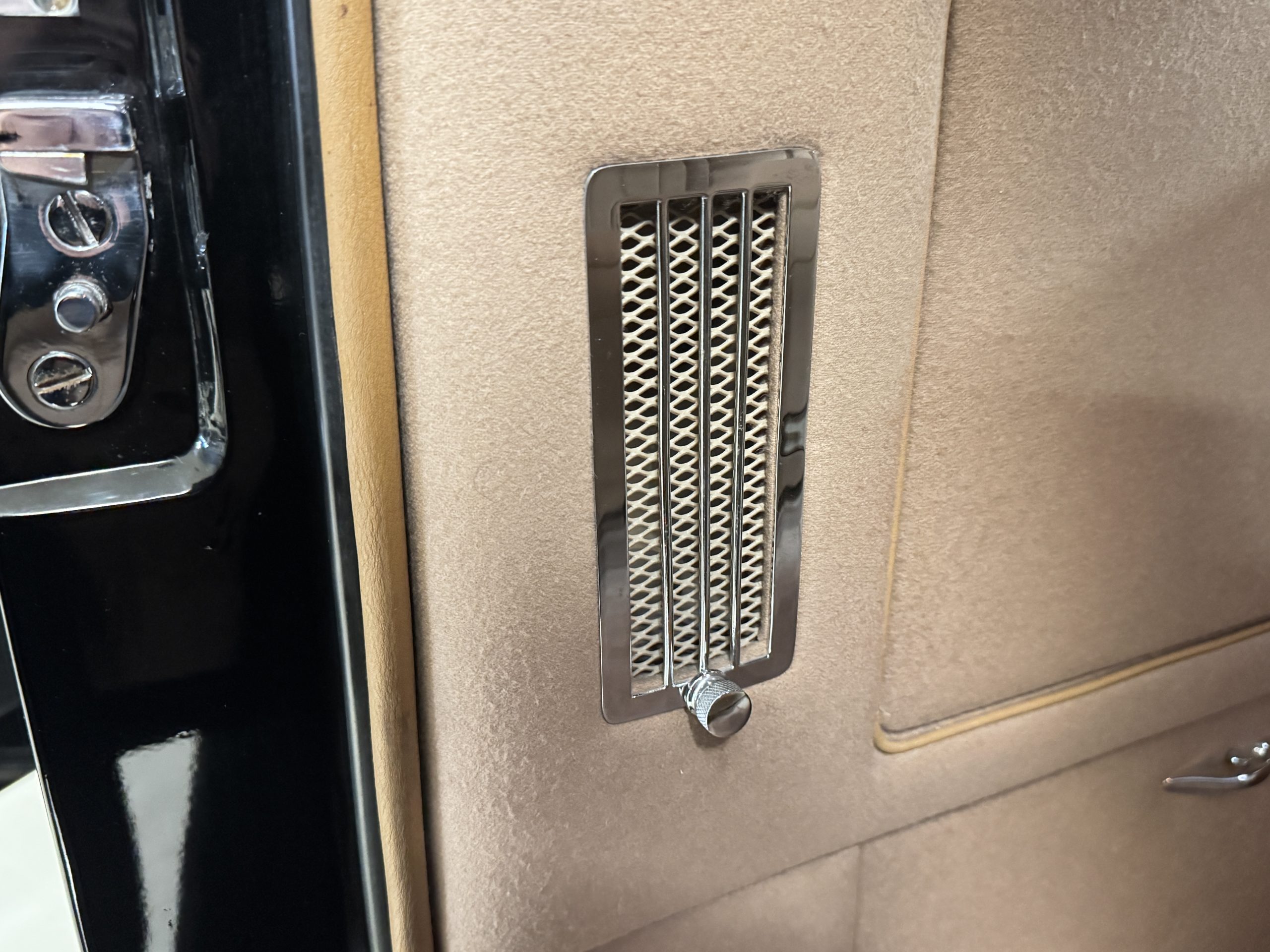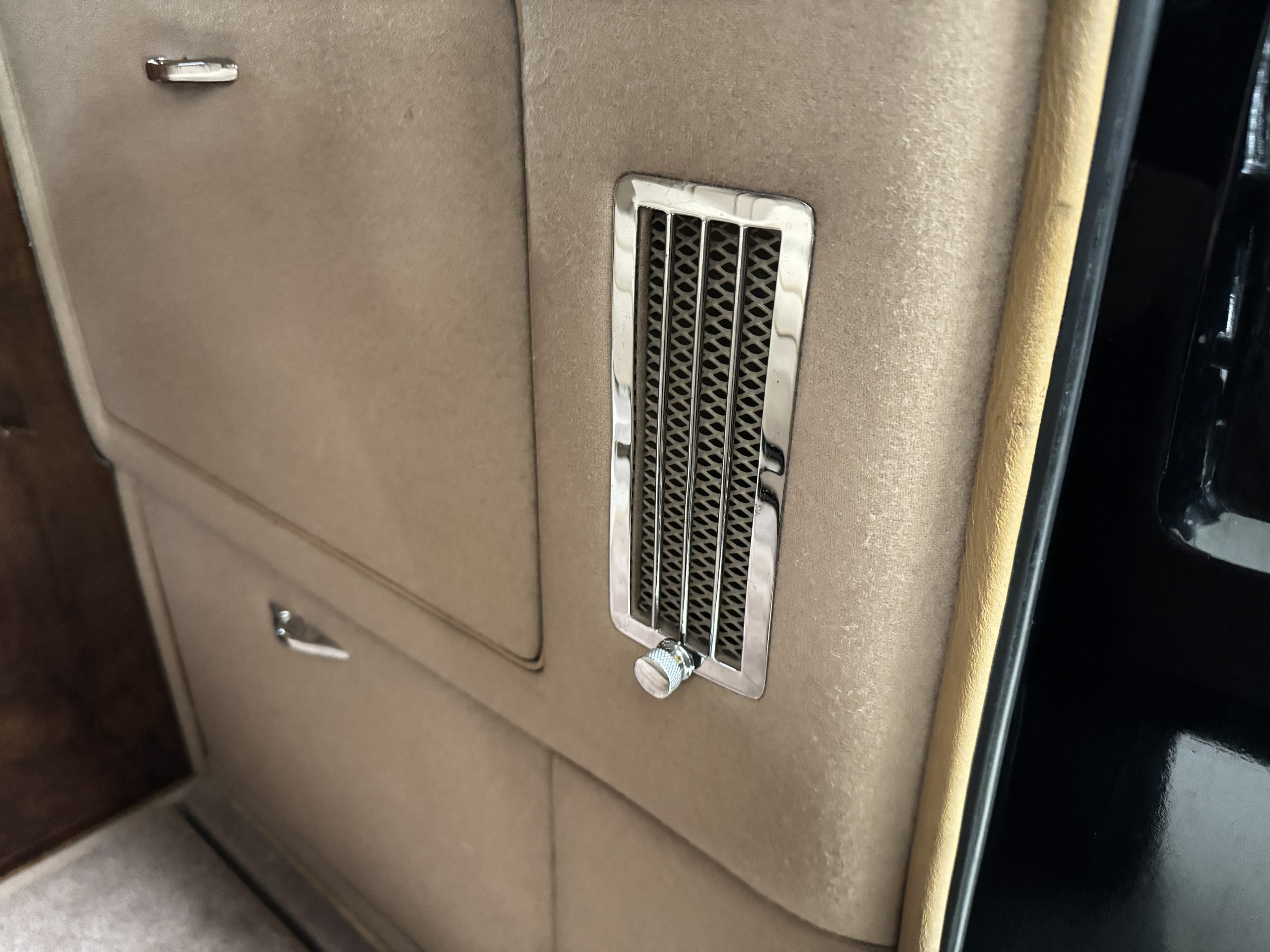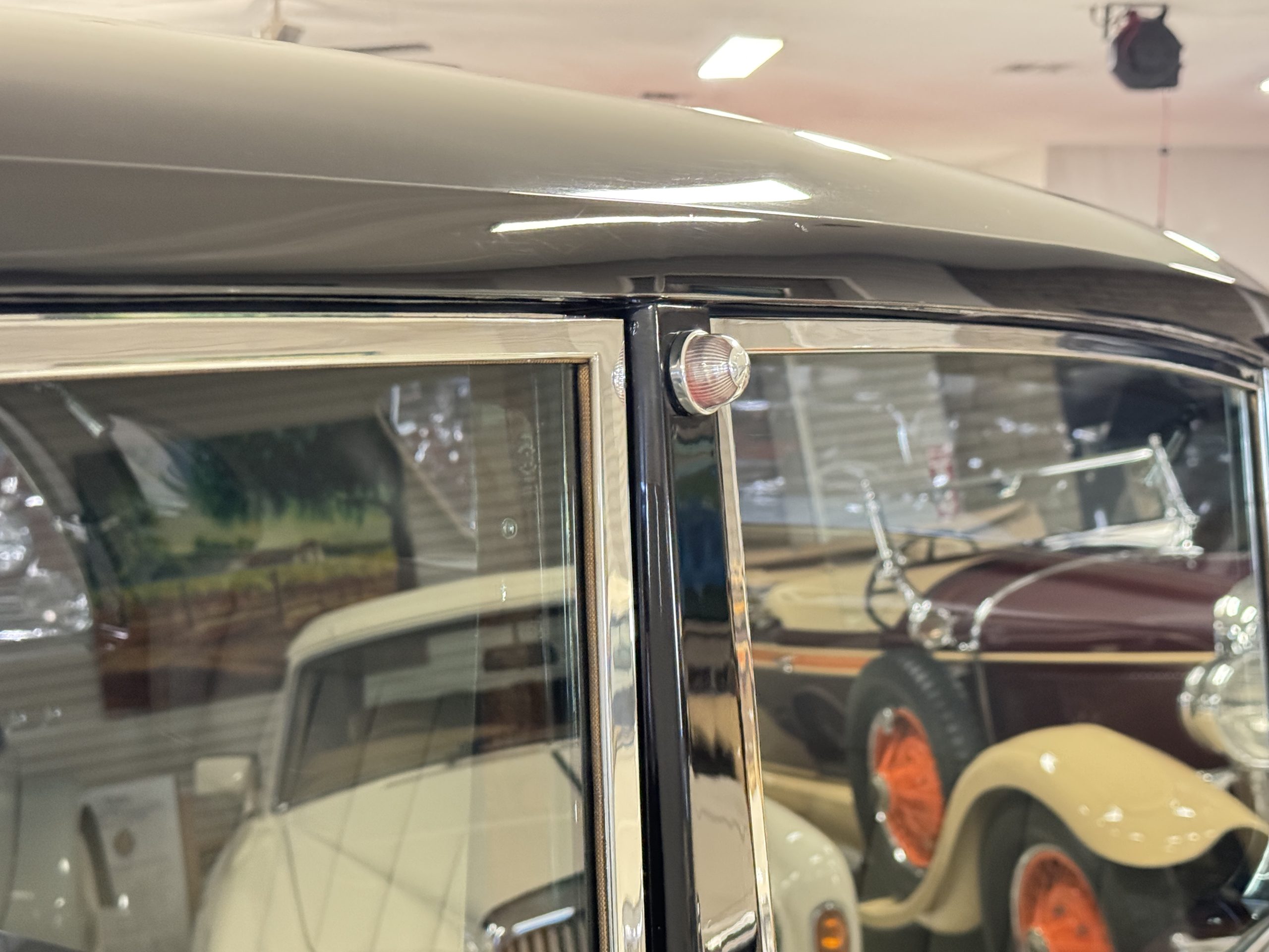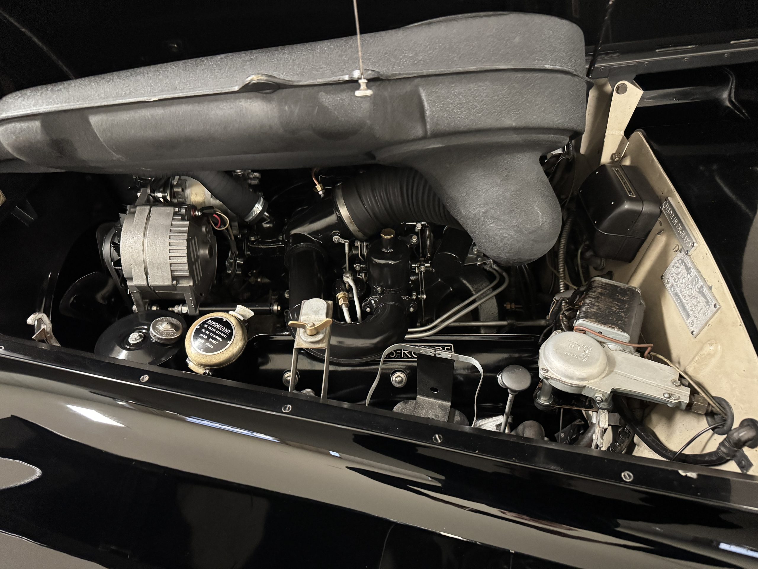 The livery is formal and stately in its original Black paint with complementary tan pinstripes.  The paint is about one-third original and two-thirds repainted and the shine and luster are excellent.  The stainless steel and chrome trim are overall in excellent condition.  The Lucas driving lights and rear mounted color matched TV antenna accessorizes the Phantoms stunning exterior.  The Rolls originally was ordered with white walled tires and is presently fitted with blackwalled bias ply tires.  The next owner can decide to update it with radials, add whitewall tires or keep it as it is.