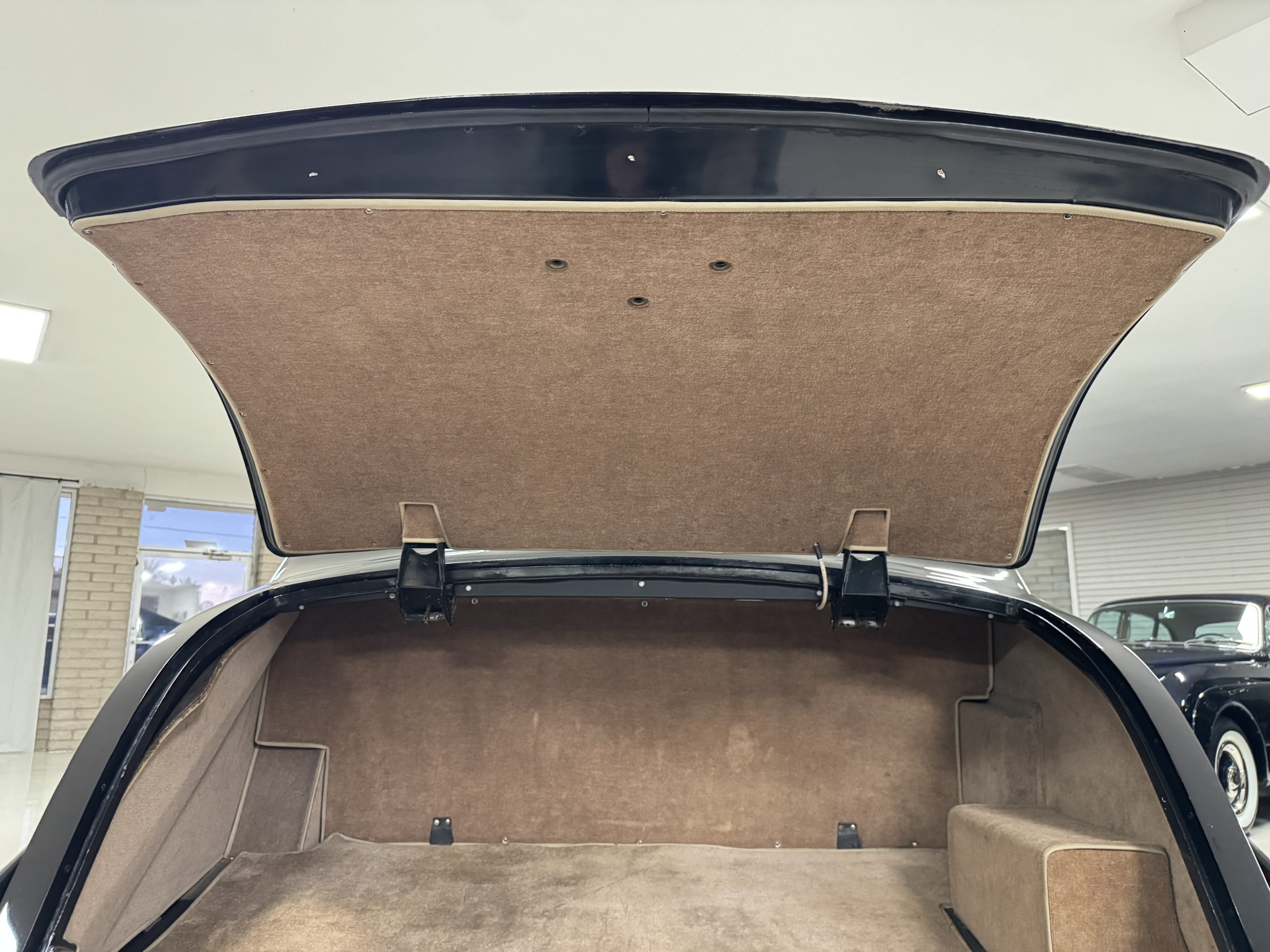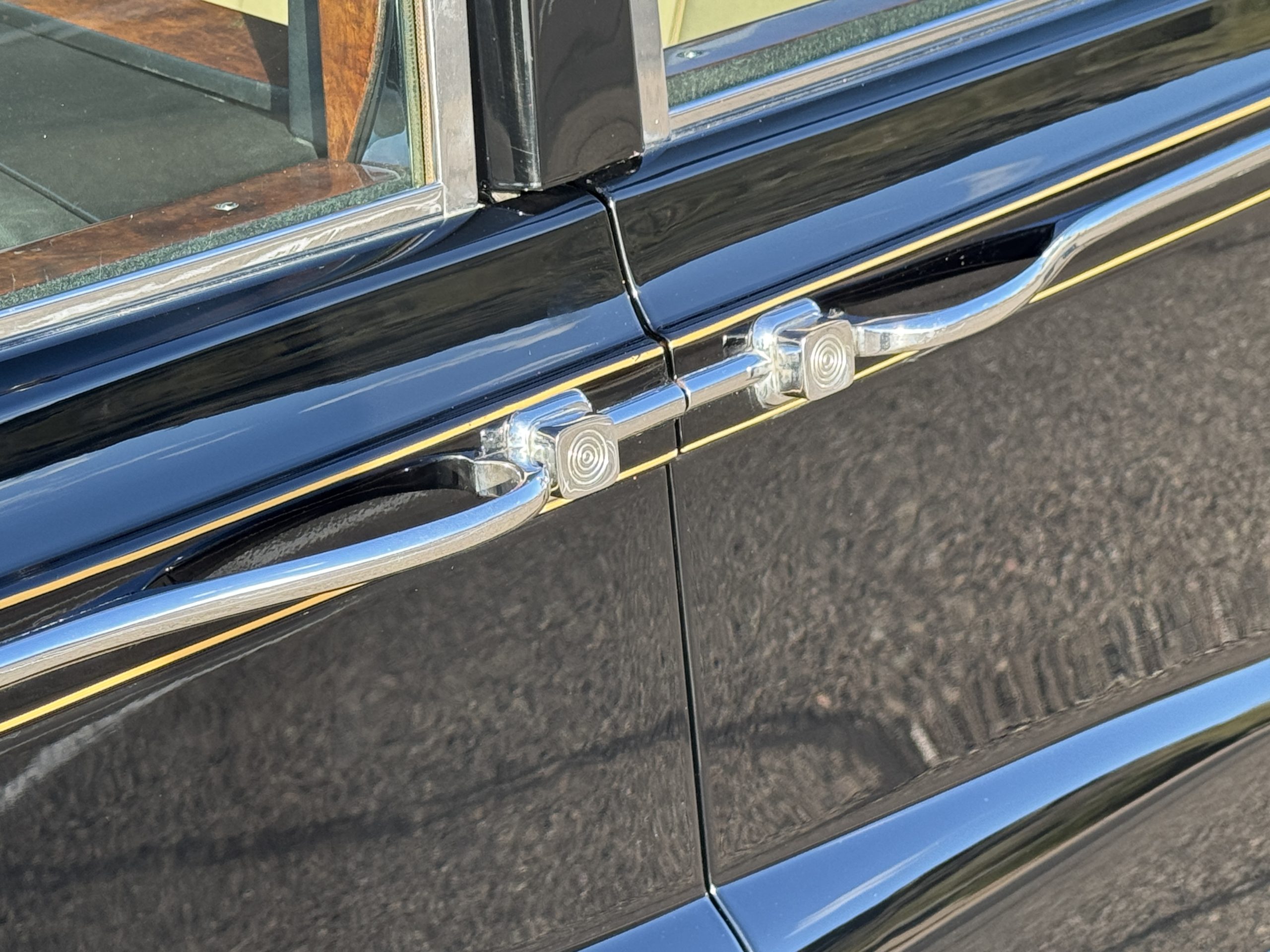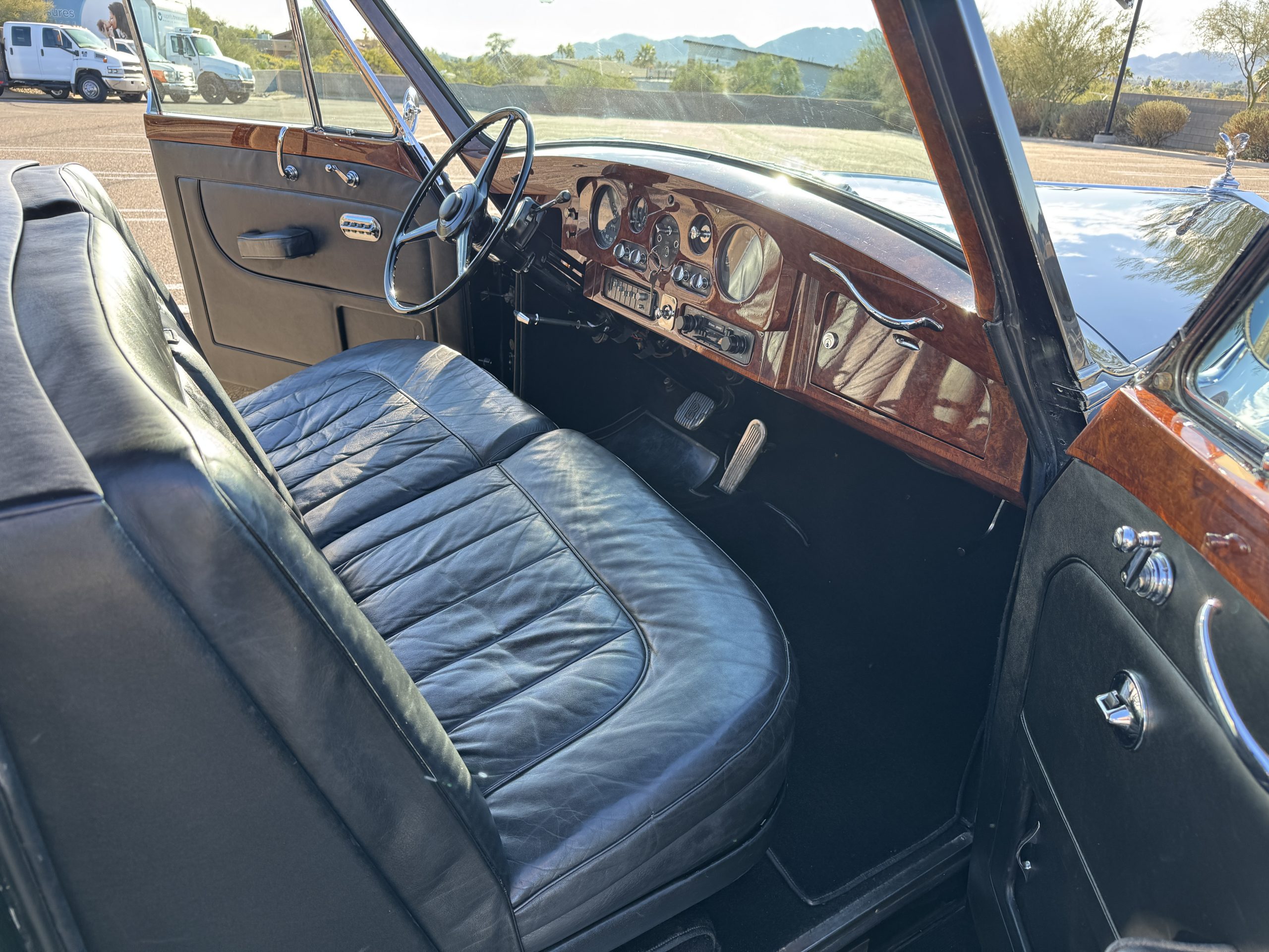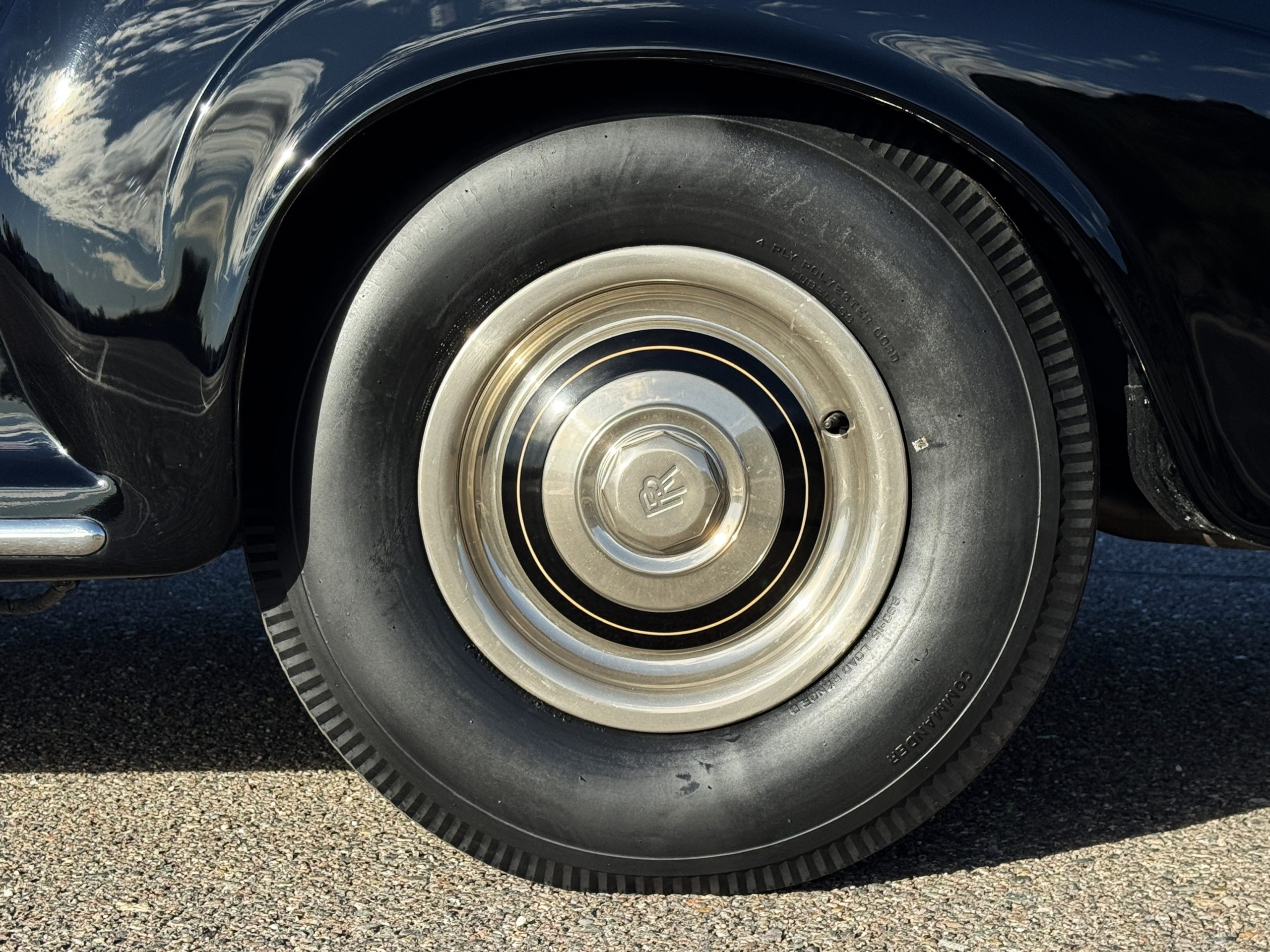 The livery is formal and stately in its original Black paint with complementary tan pinstripes.  The paint is about one-third original and two-thirds repainted and the shine and luster are excellent.  The stainless steel and chrome trim are overall in excellent condition.  The Lucas driving lights and rear mounted color matched TV antenna accessorizes the Phantoms stunning exterior.  The Rolls originally was ordered with white walled tires and is presently fitted with blackwalled bias ply tires.  The next owner can decide to update it with radials, add whitewall tires or keep it as it is.