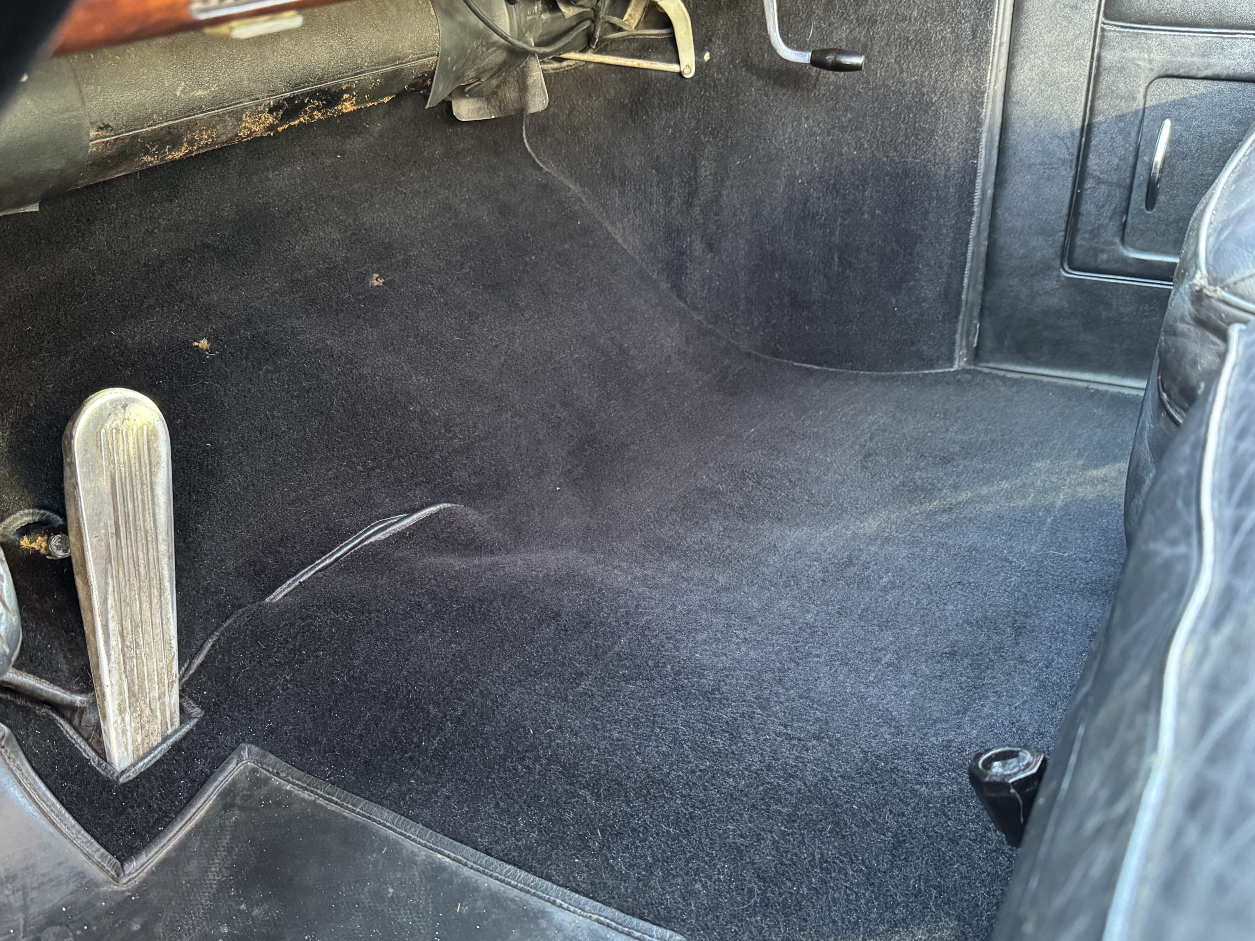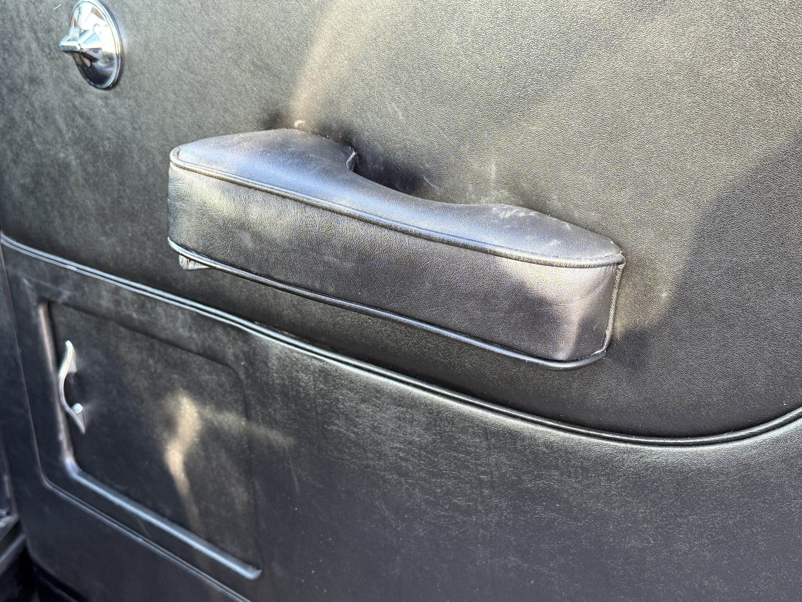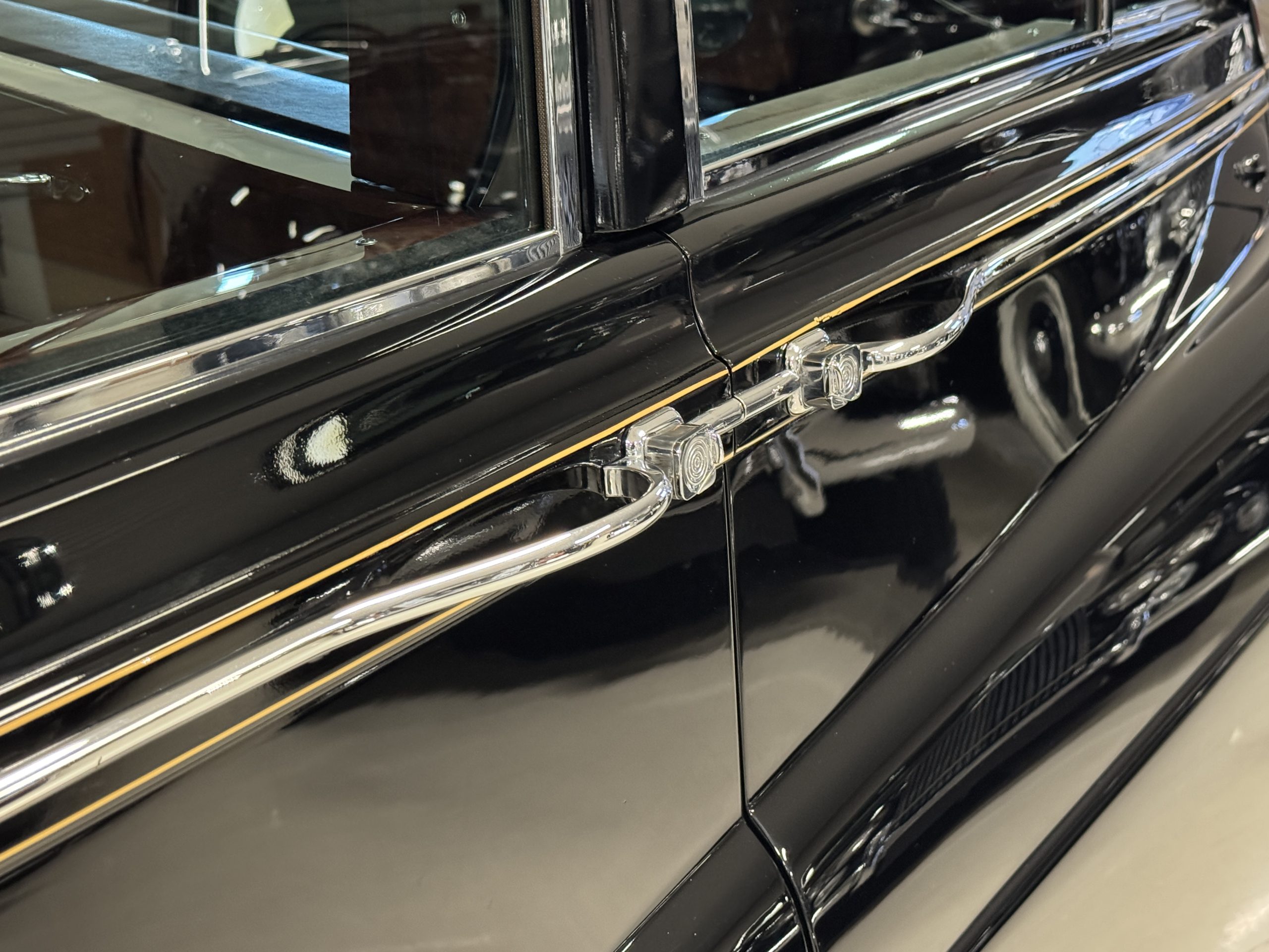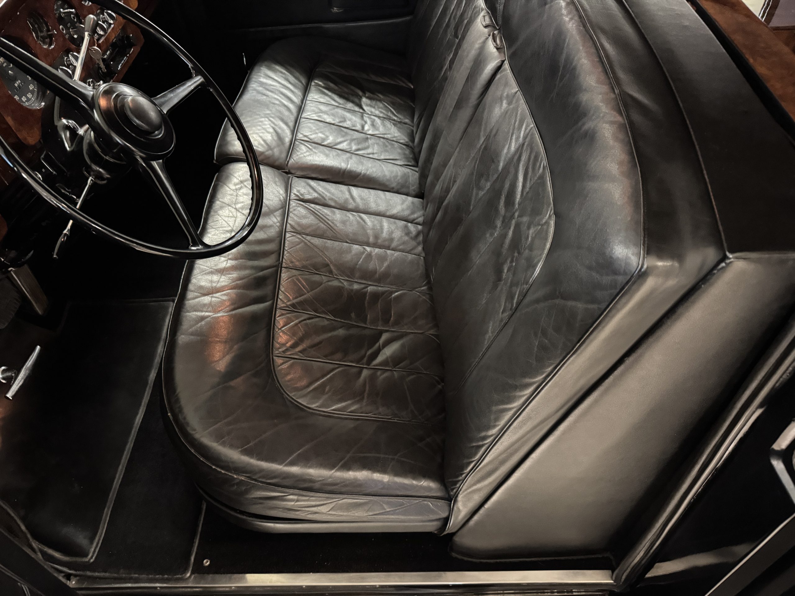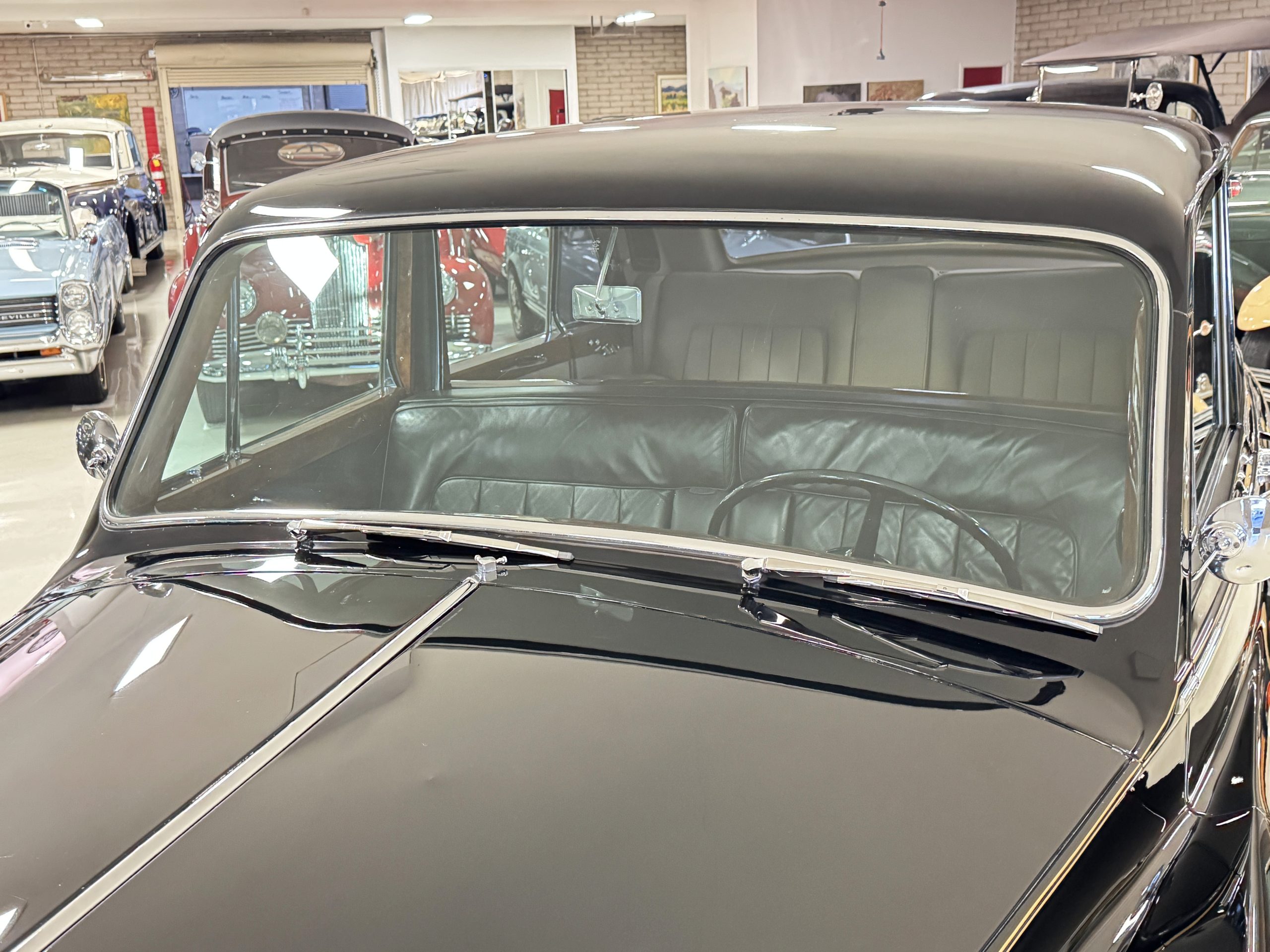 The livery is formal and stately in its original Black paint with complementary tan pinstripes.  The paint is about one-third original and two-thirds repainted and the shine and luster are excellent.  The stainless steel and chrome trim are overall in excellent condition.  The Lucas driving lights and rear mounted color matched TV antenna accessorizes the Phantoms stunning exterior.  The Rolls originally was ordered with white walled tires and is presently fitted with blackwalled bias ply tires.  The next owner can decide to update it with radials, add whitewall tires or keep it as it is.