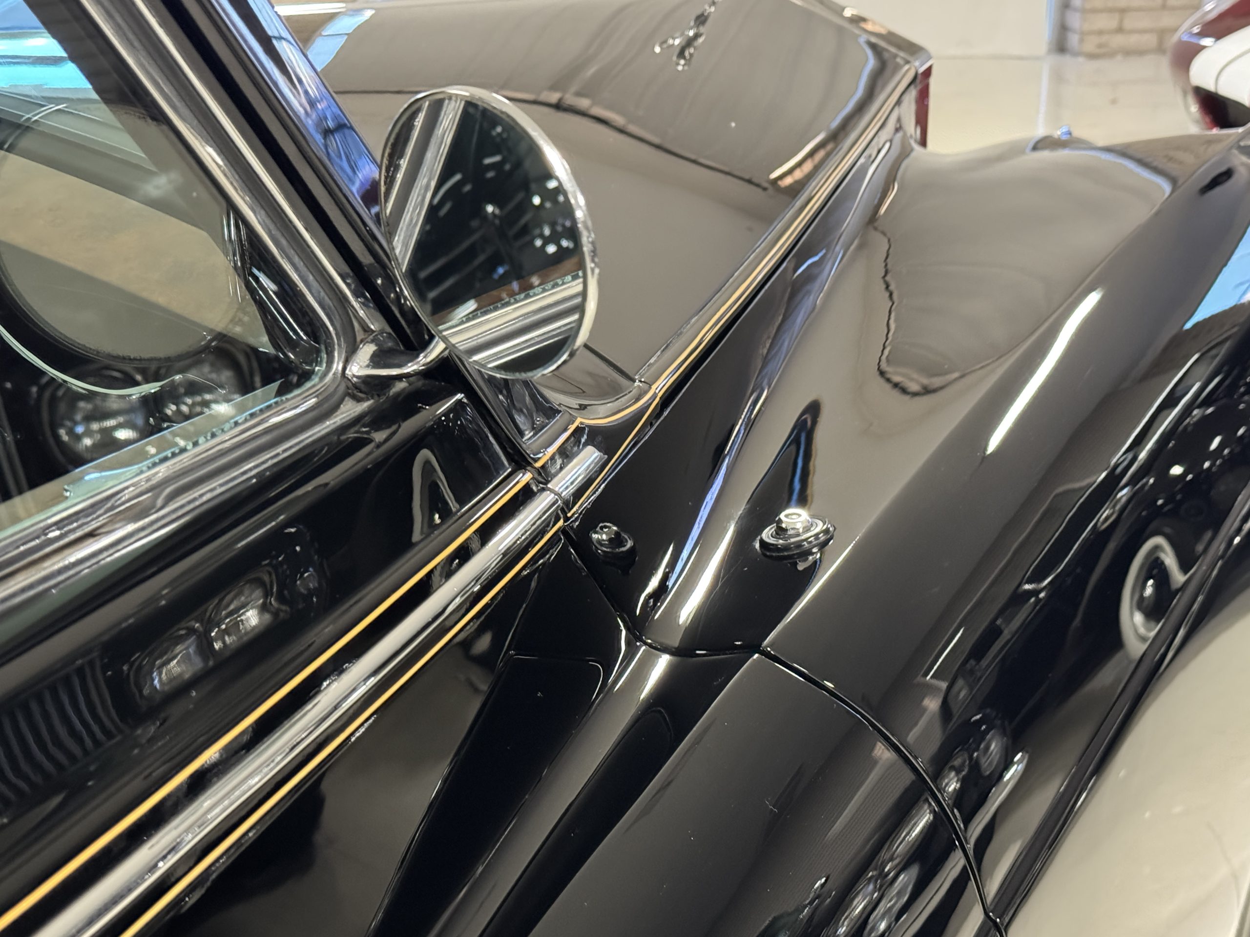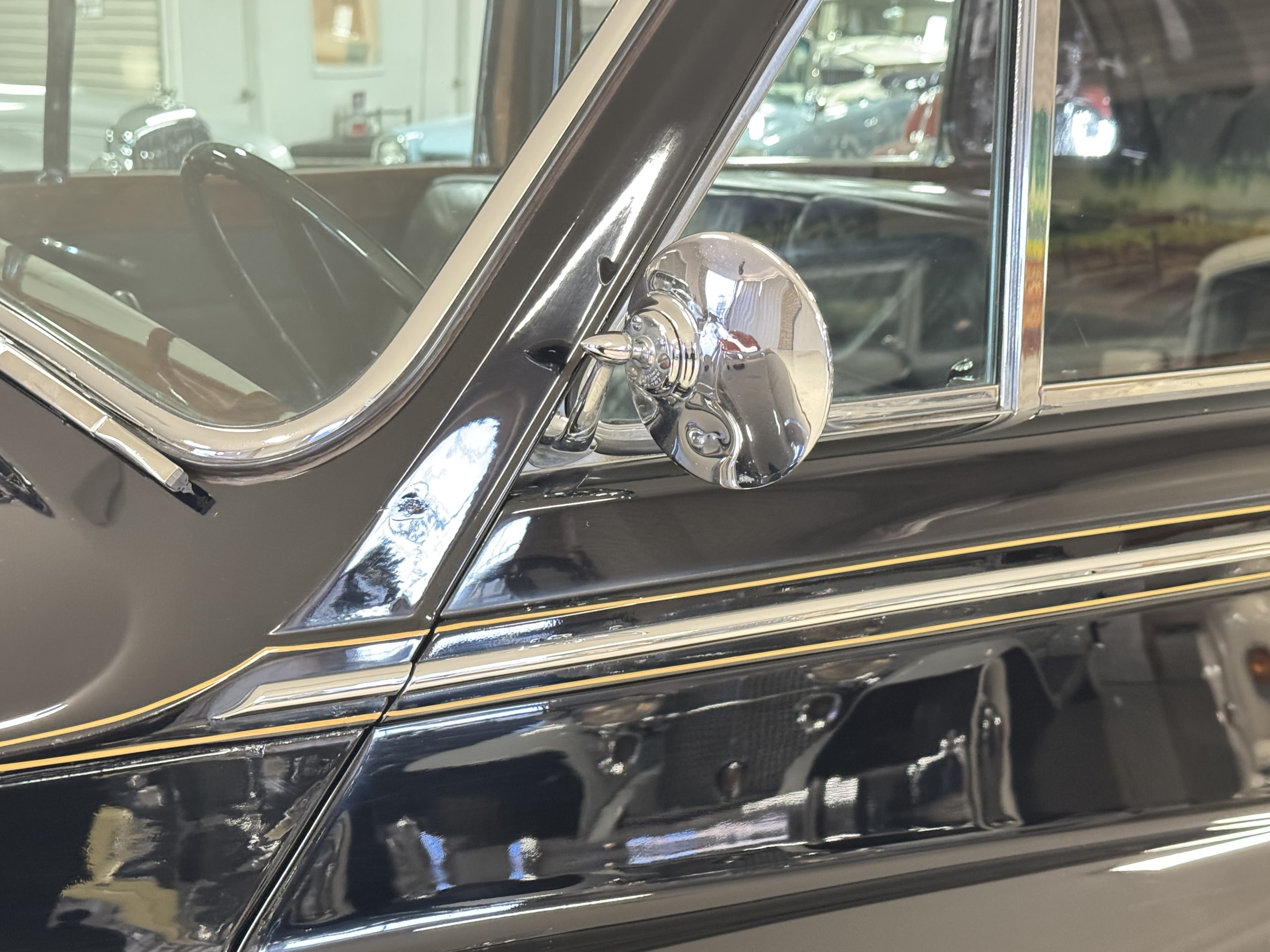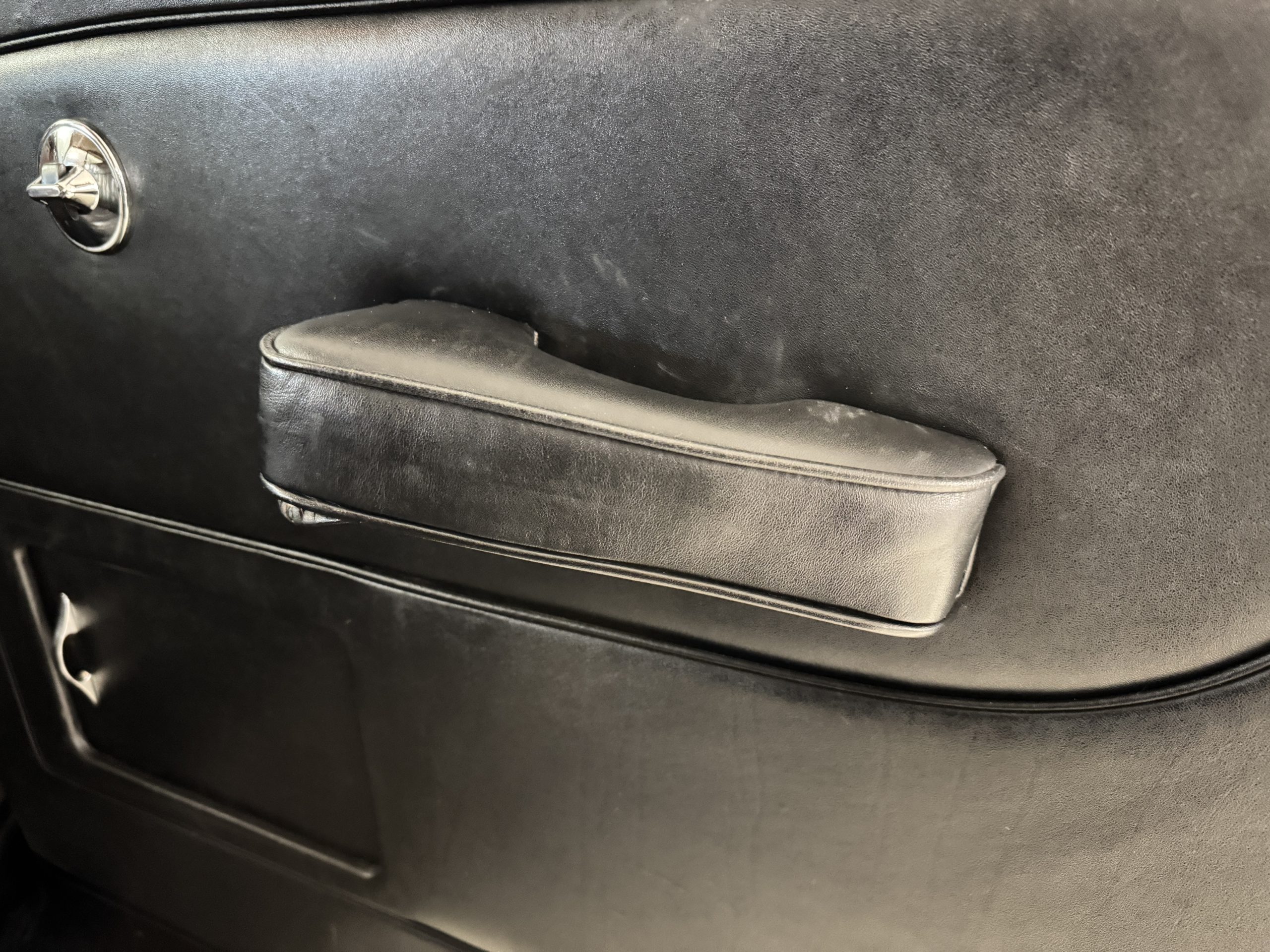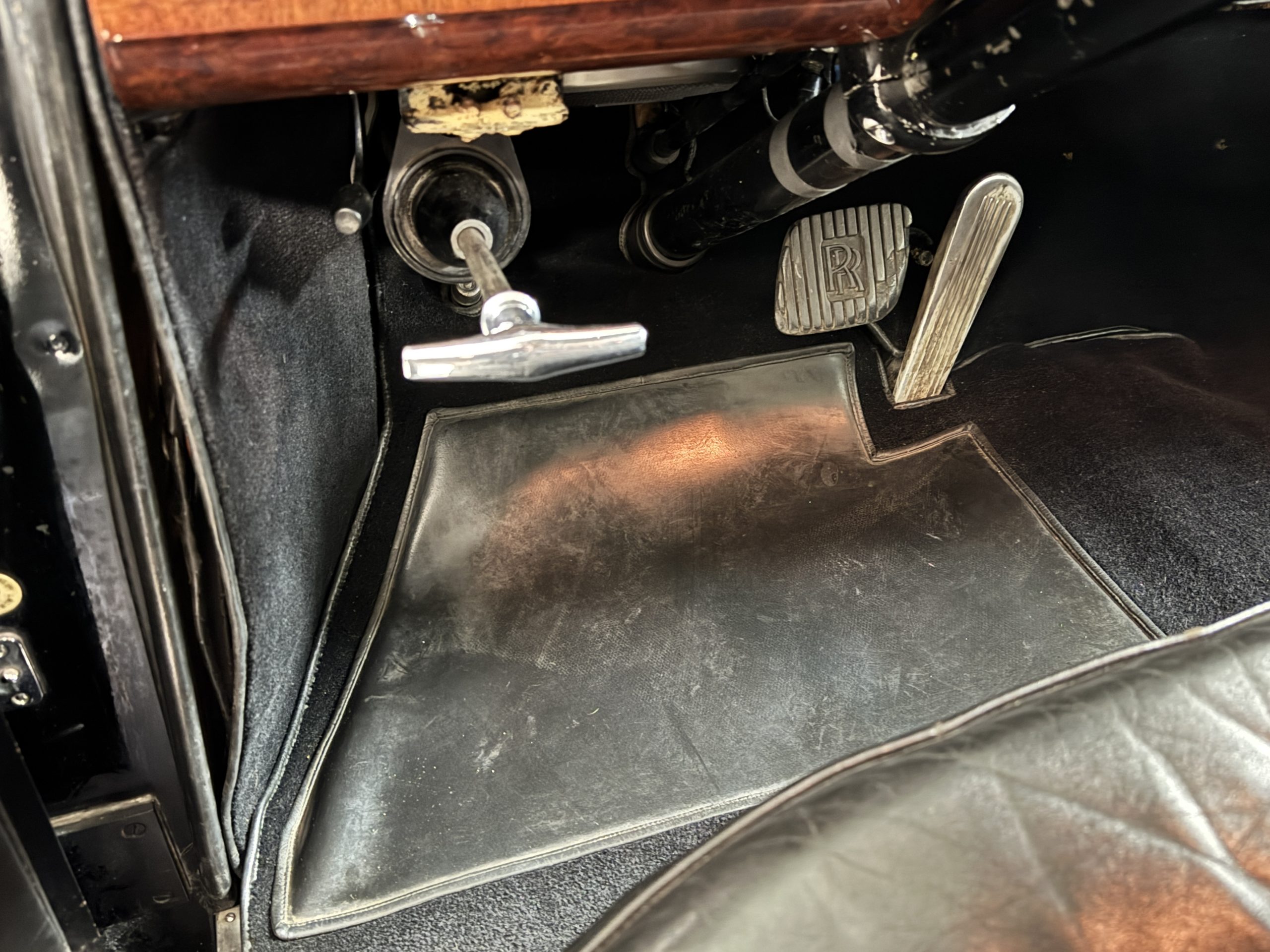 The livery is formal and stately in its original Black paint with complementary tan pinstripes.  The paint is about one-third original and two-thirds repainted and the shine and luster are excellent.  The stainless steel and chrome trim are overall in excellent condition.  The Lucas driving lights and rear mounted color matched TV antenna accessorizes the Phantoms stunning exterior.  The Rolls originally was ordered with white walled tires and is presently fitted with blackwalled bias ply tires.  The next owner can decide to update it with radials, add whitewall tires or keep it as it is.