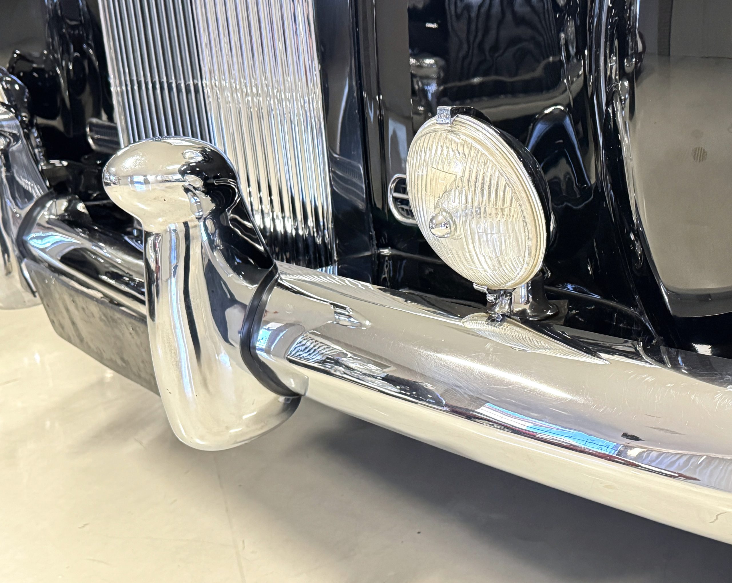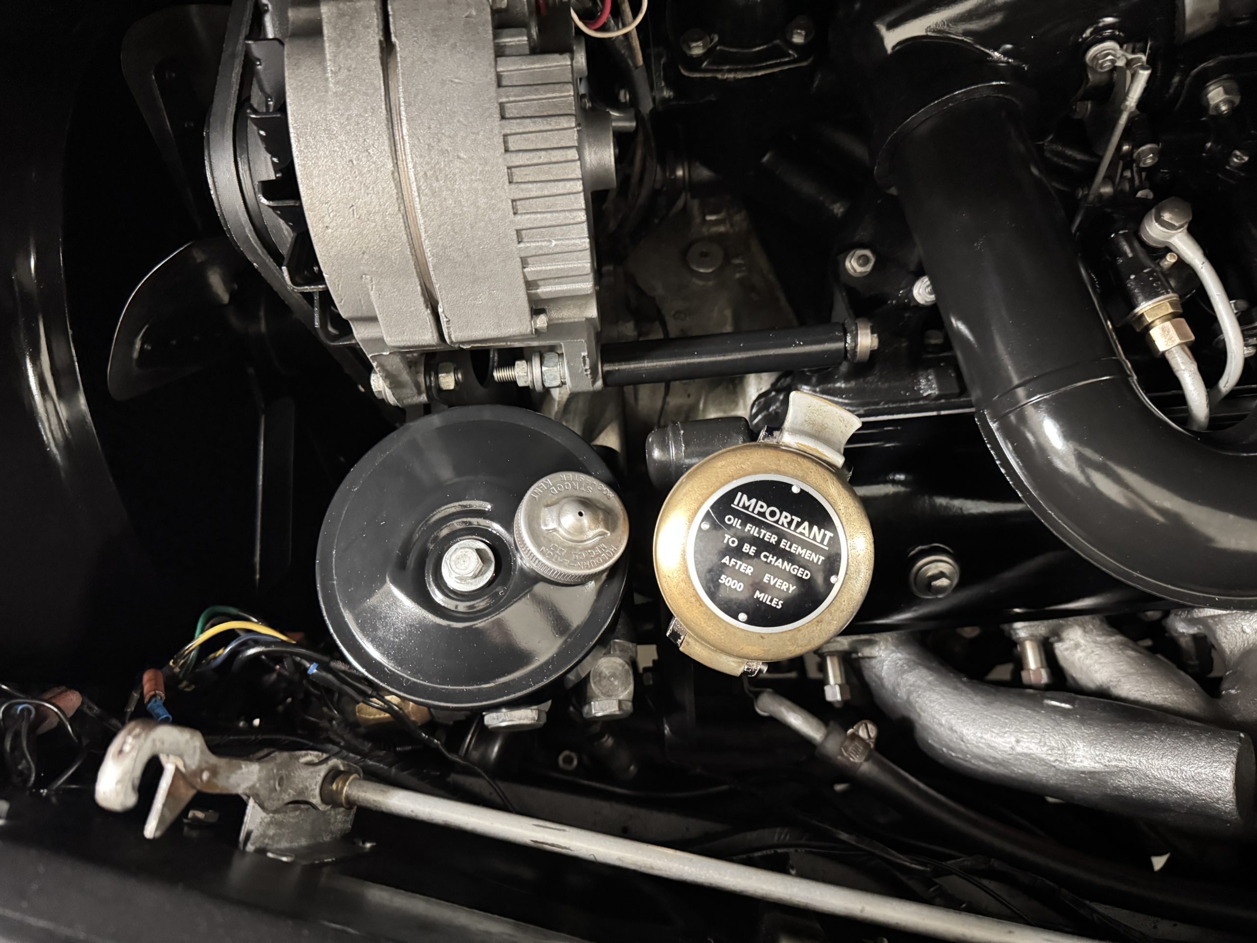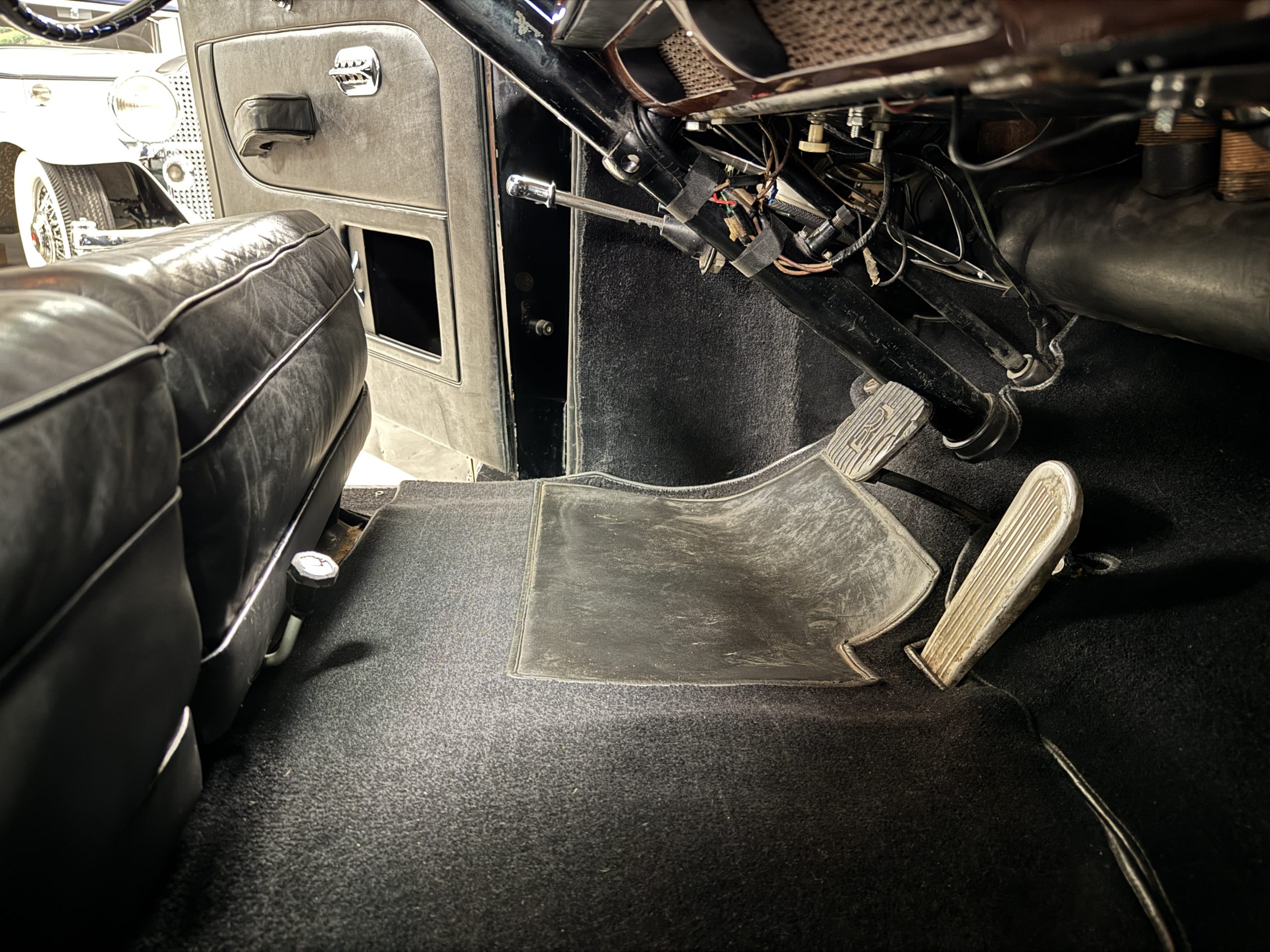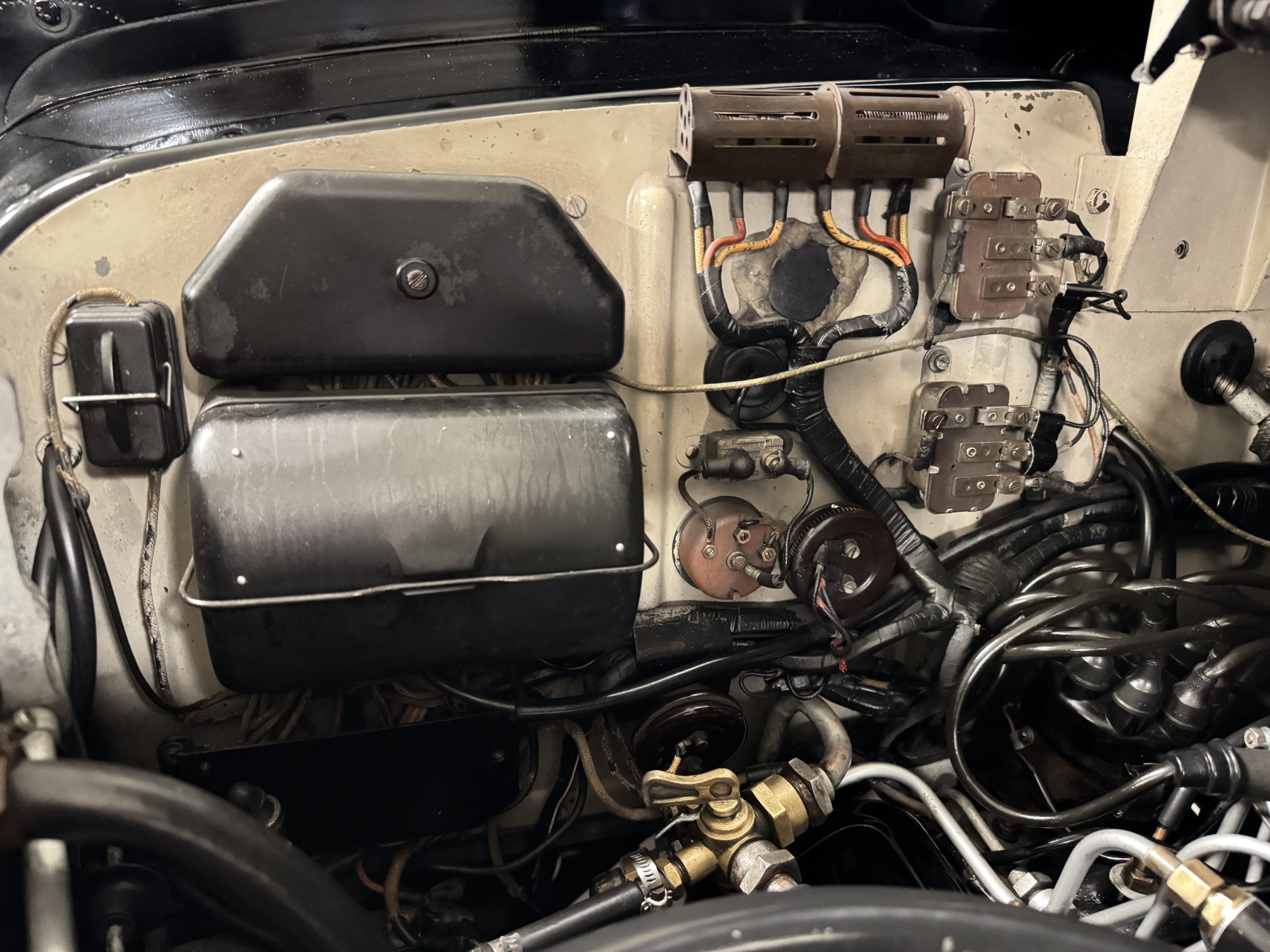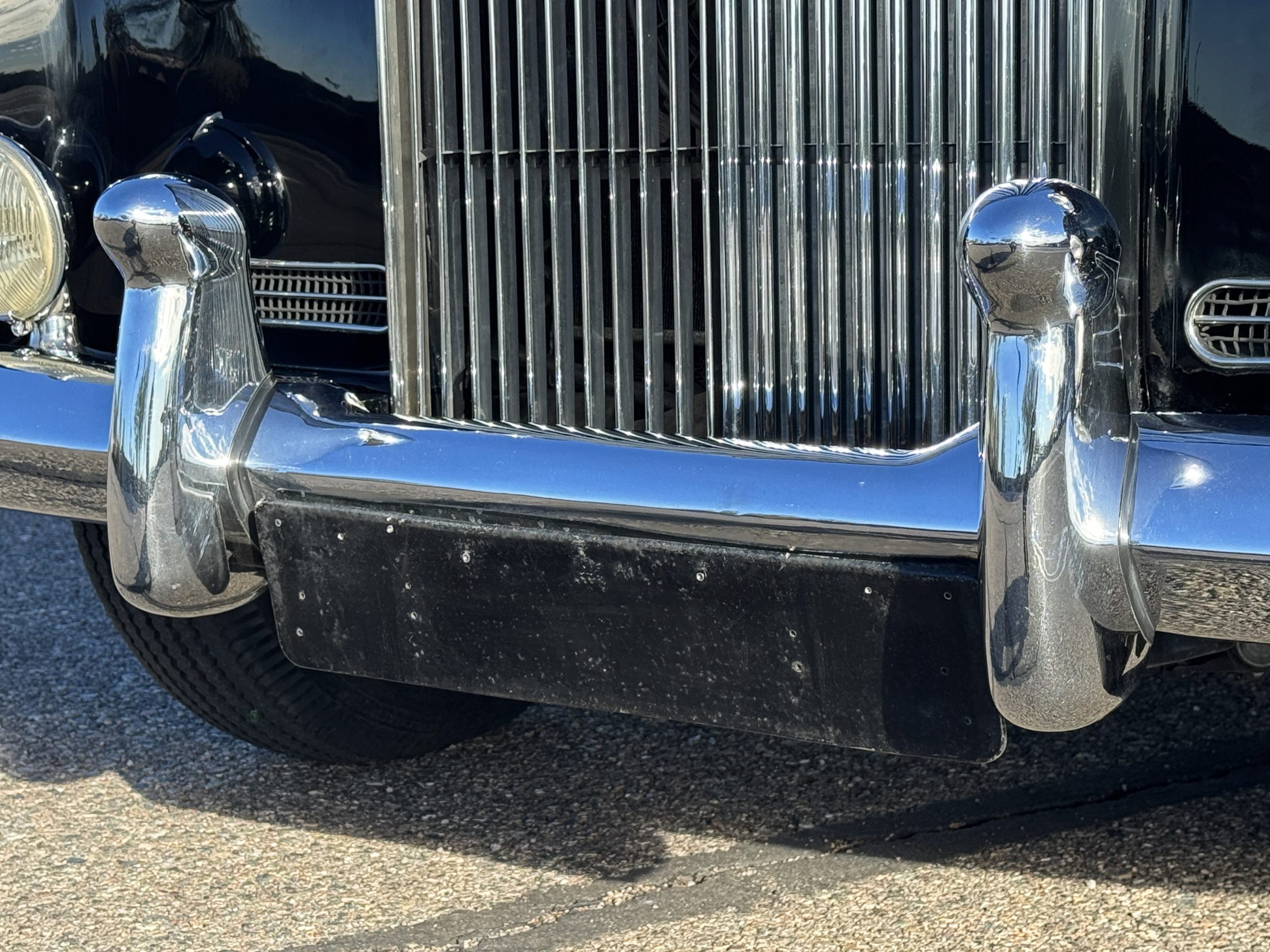 The livery is formal and stately in its original Black paint with complementary tan pinstripes.  The paint is about one-third original and two-thirds repainted and the shine and luster are excellent.  The stainless steel and chrome trim are overall in excellent condition.  The Lucas driving lights and rear mounted color matched TV antenna accessorizes the Phantoms stunning exterior.  The Rolls originally was ordered with white walled tires and is presently fitted with blackwalled bias ply tires.  The next owner can decide to update it with radials, add whitewall tires or keep it as it is.