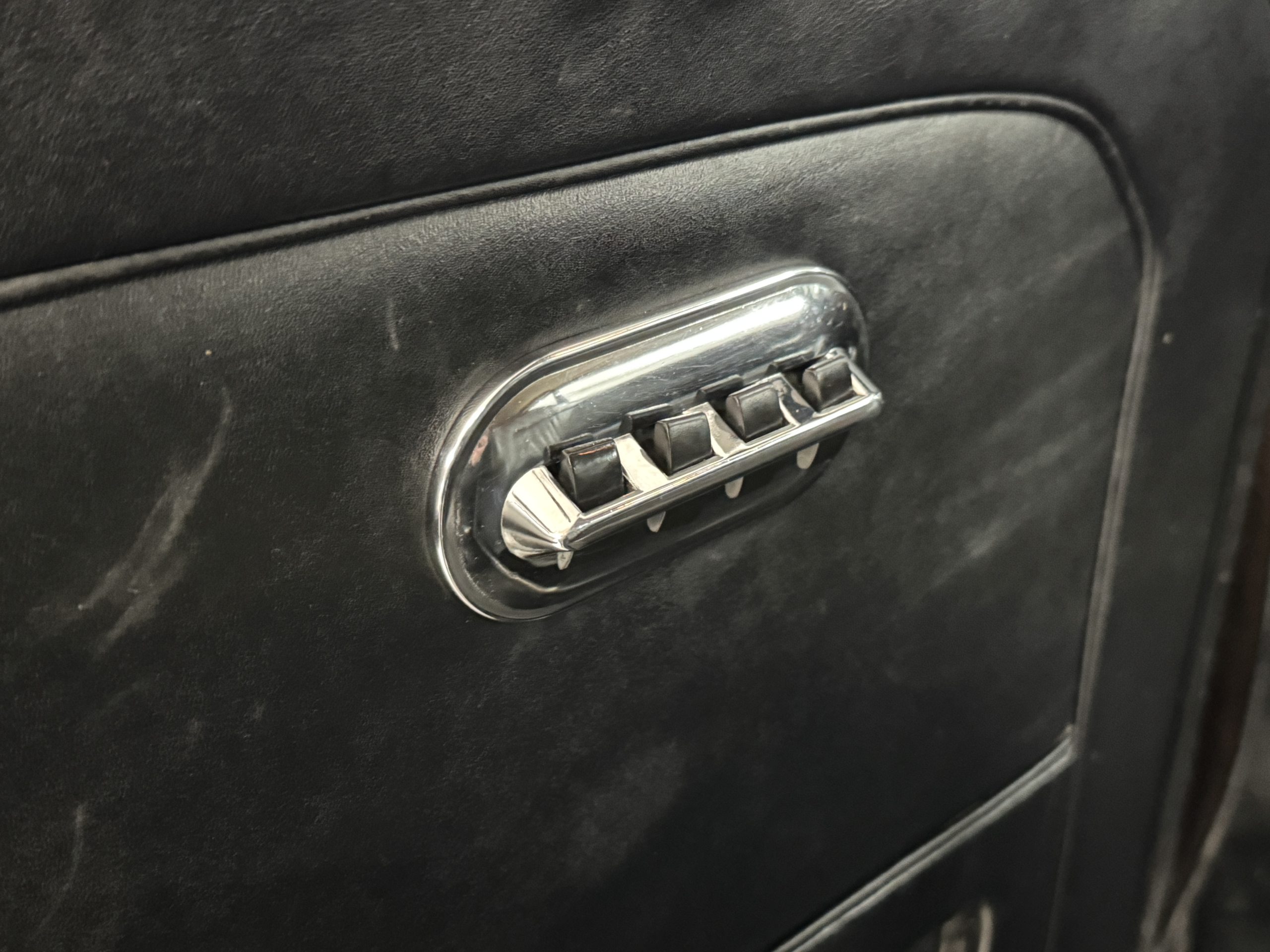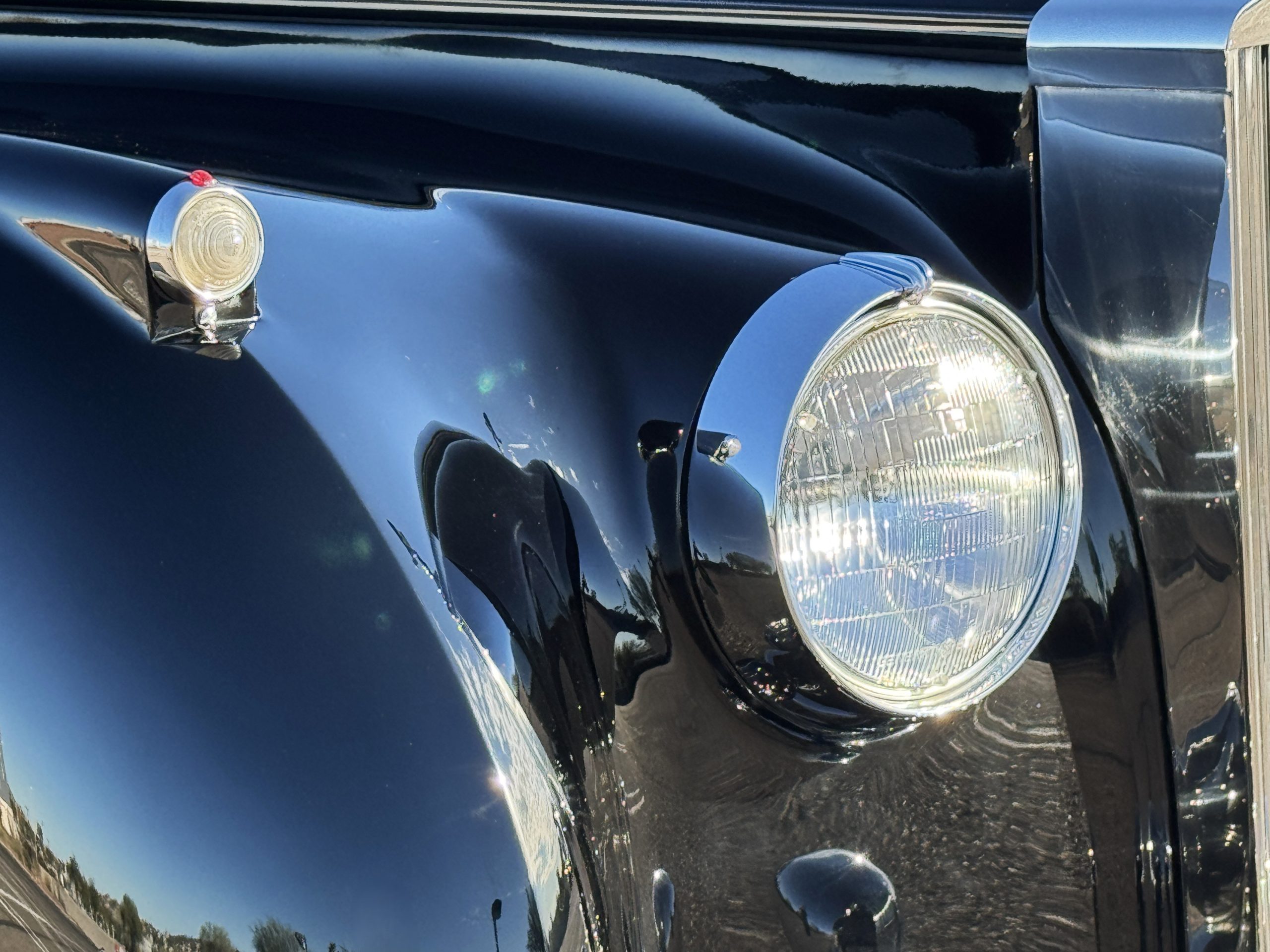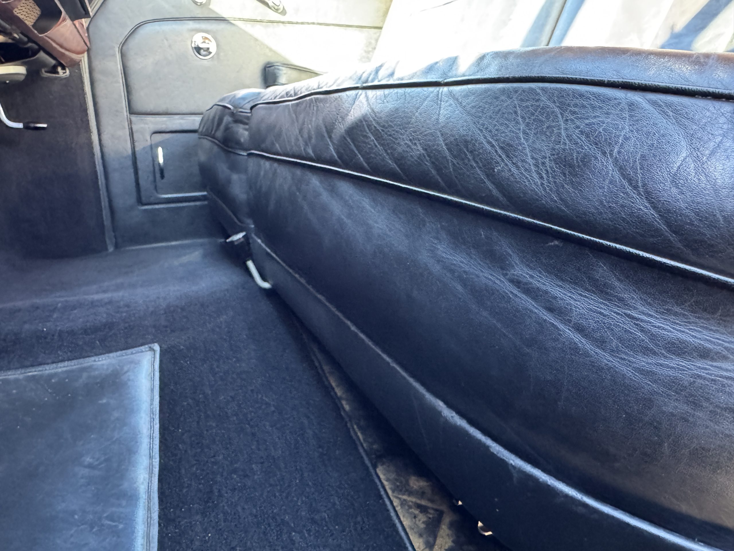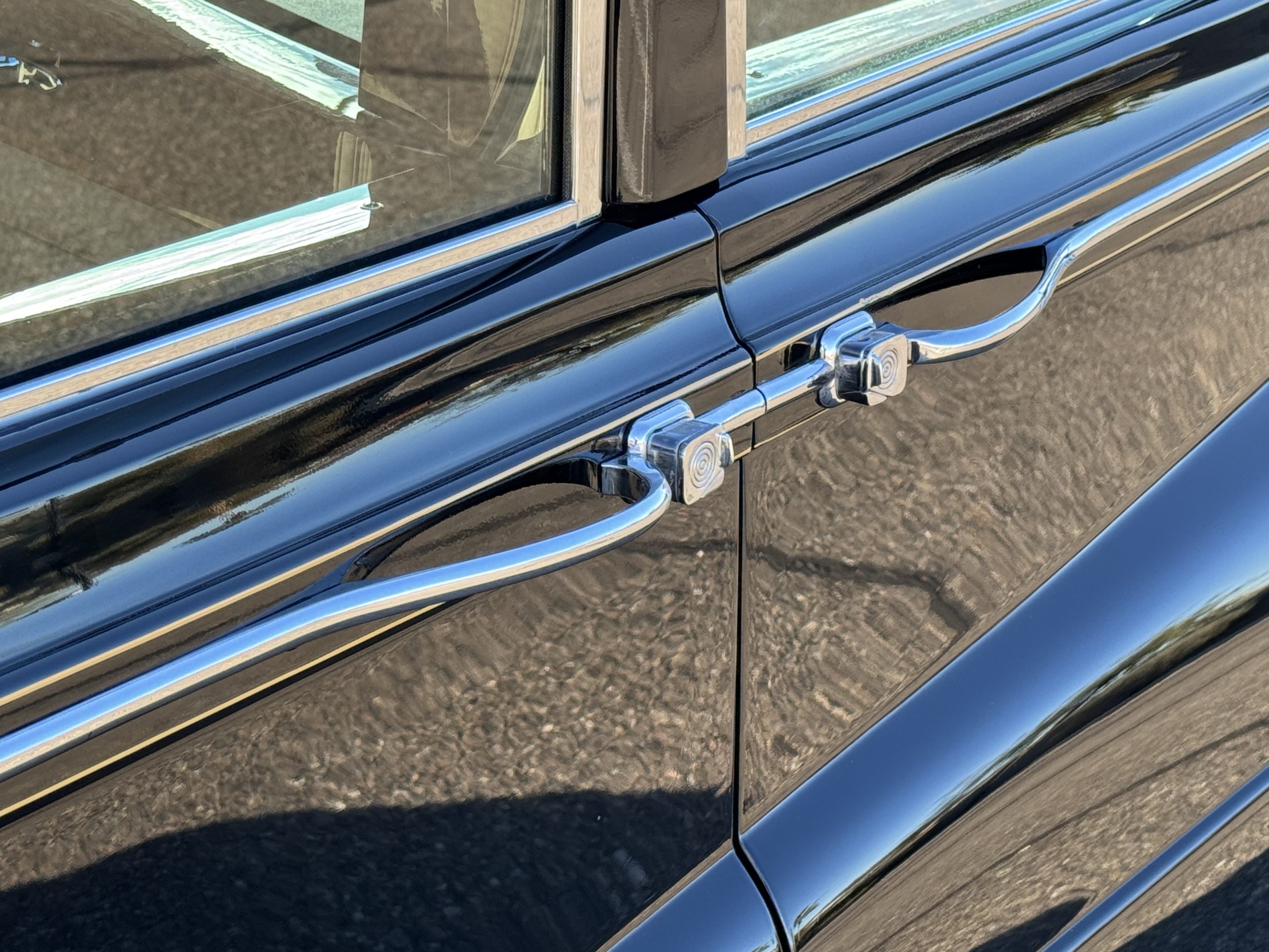 The livery is formal and stately in its original Black paint with complementary tan pinstripes.  The paint is about one-third original and two-thirds repainted and the shine and luster are excellent.  The stainless steel and chrome trim are overall in excellent condition.  The Lucas driving lights and rear mounted color matched TV antenna accessorizes the Phantoms stunning exterior.  The Rolls originally was ordered with white walled tires and is presently fitted with blackwalled bias ply tires.  The next owner can decide to update it with radials, add whitewall tires or keep it as it is.