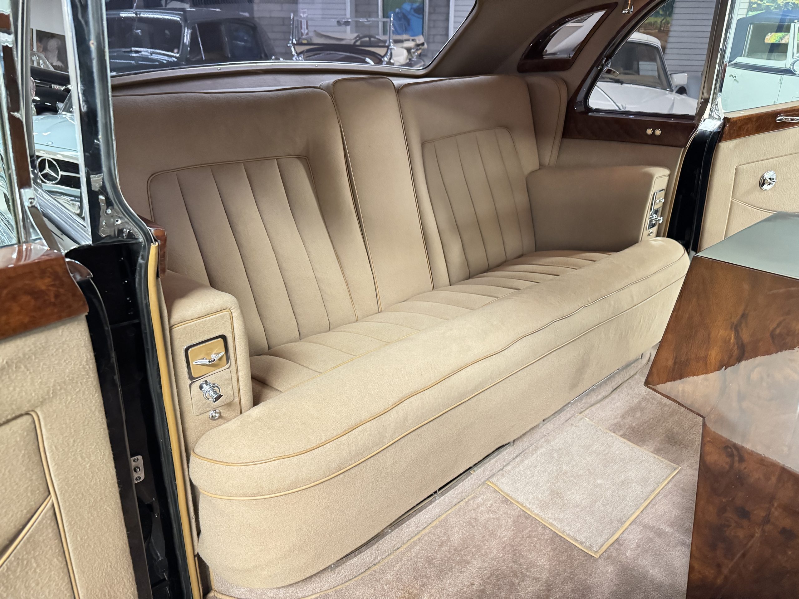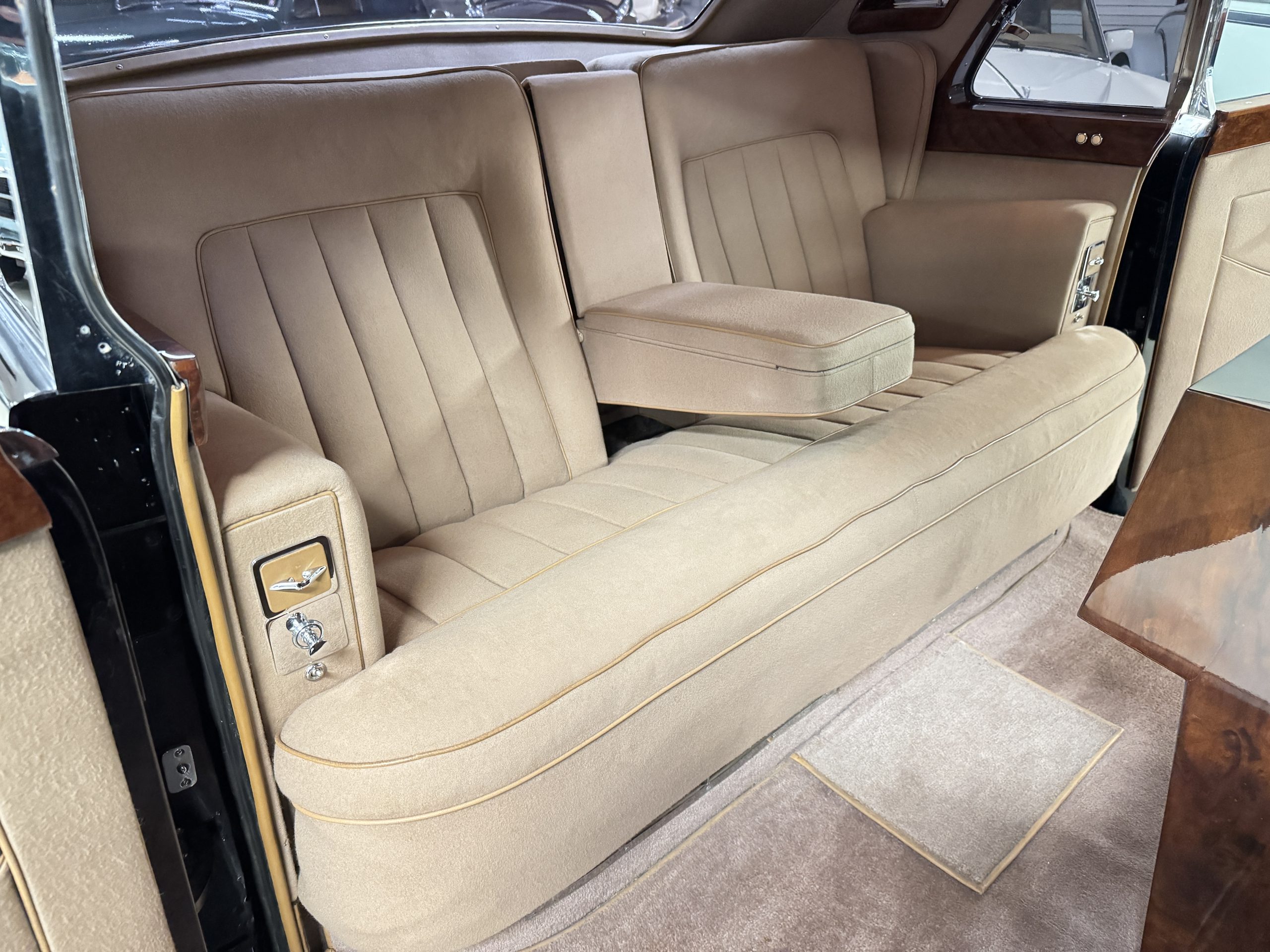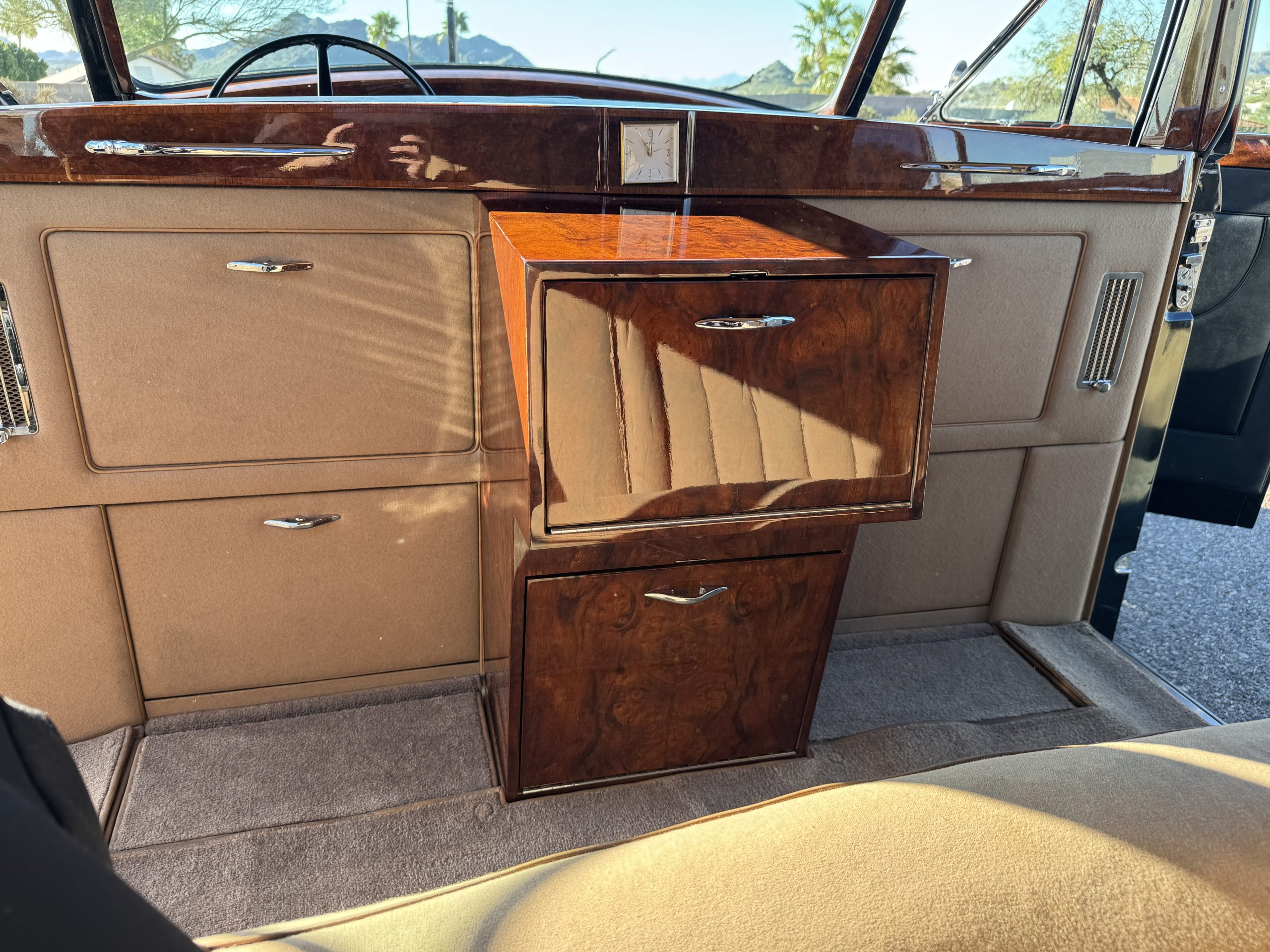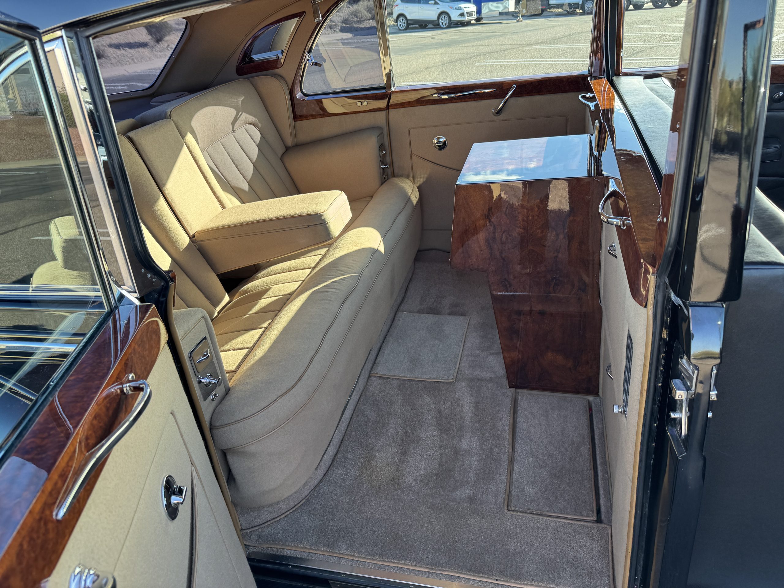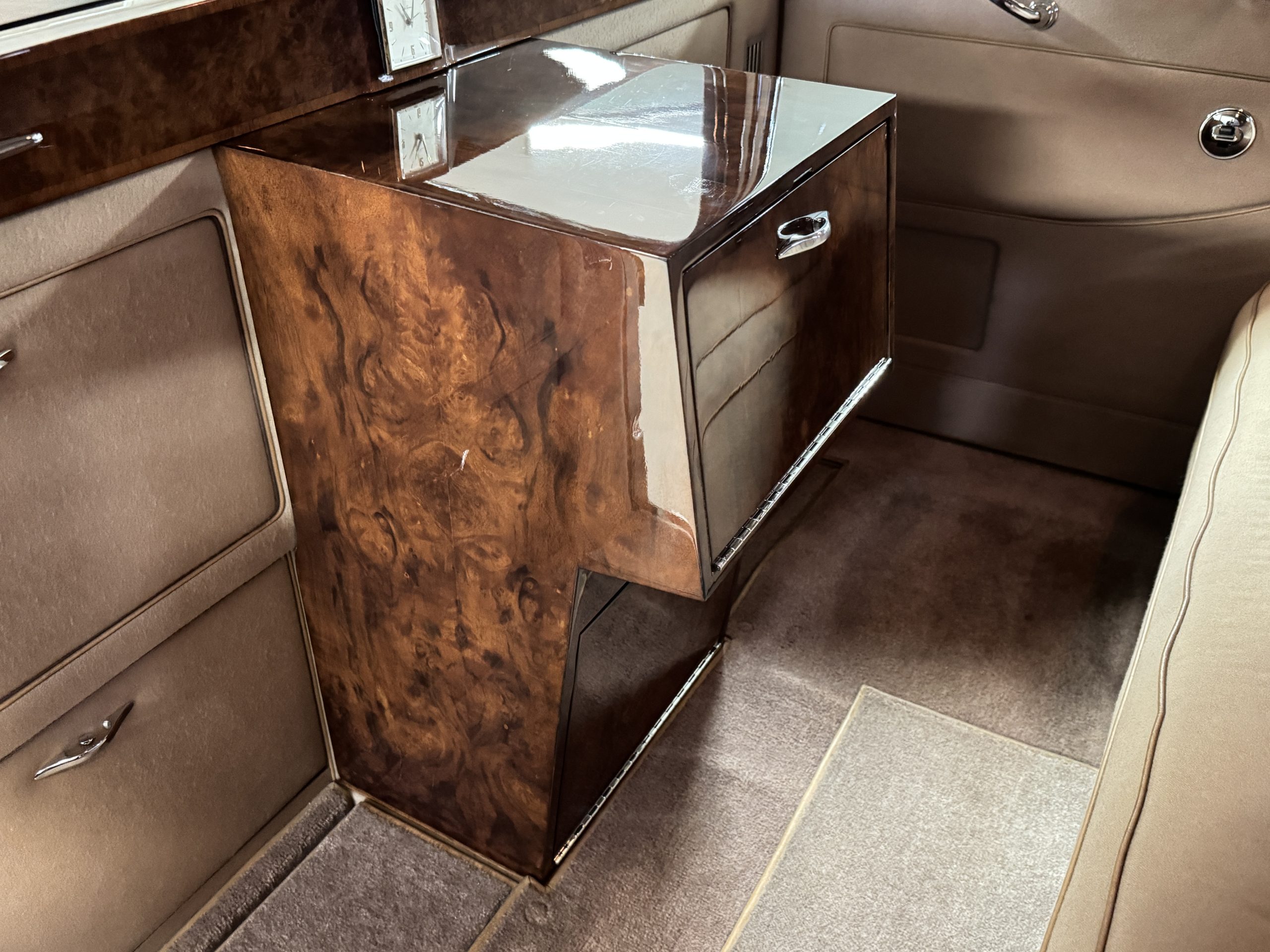 The interior is in overall beautiful condition.  All of the burl walnut trim has been painstakingly restored to showroom condition.  The chauffer’s compartment is finished in Black leather that is very soft and supple with normal creases with age.   The stereo has been updated with a more modern system.  The rear passenger compartment is all original tan wool broadcloth with complementary tan leather piping.  The upholstery is in excellent original condition with no soiling. The tan Wilton wool carpeting is also in very nice condition.  The center mirrored cocktail cabinet contains an original crystal decanter and two crystal glasses.  Above the cocktail cabinet is a separate compartment holding the Television.  Twin reading lamps, twin vanities and a Seth clock complete the amenities.  James Young coachbuilt Rolls-Royces always exhibit the most extraordinary book matched burlwood finishes.  This example, being built for their Earls Court exhibition, is just gorgeous.