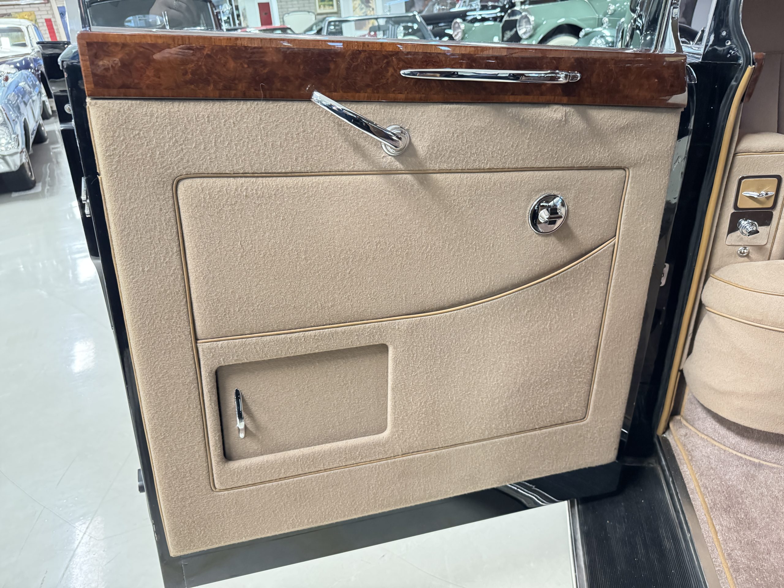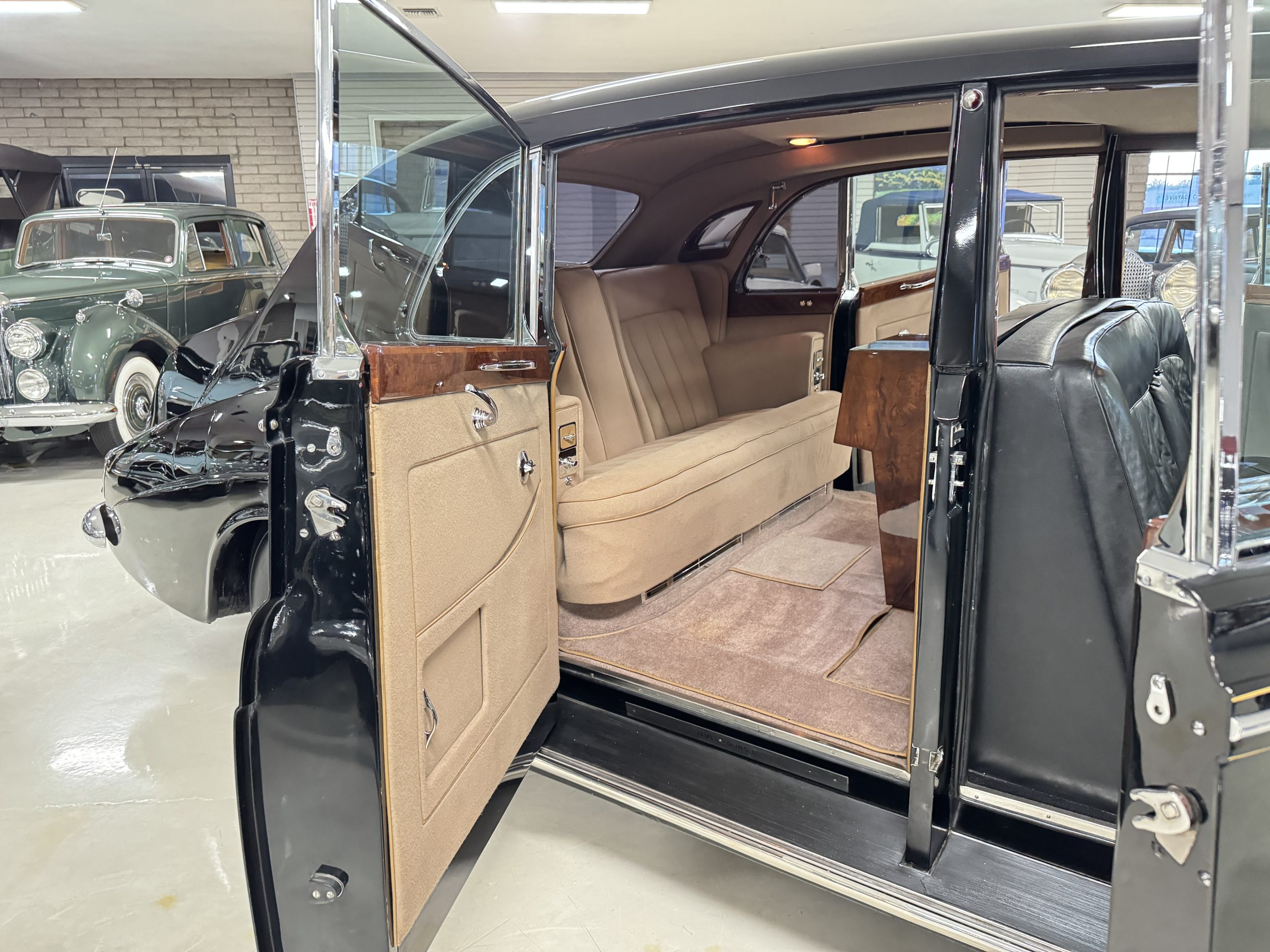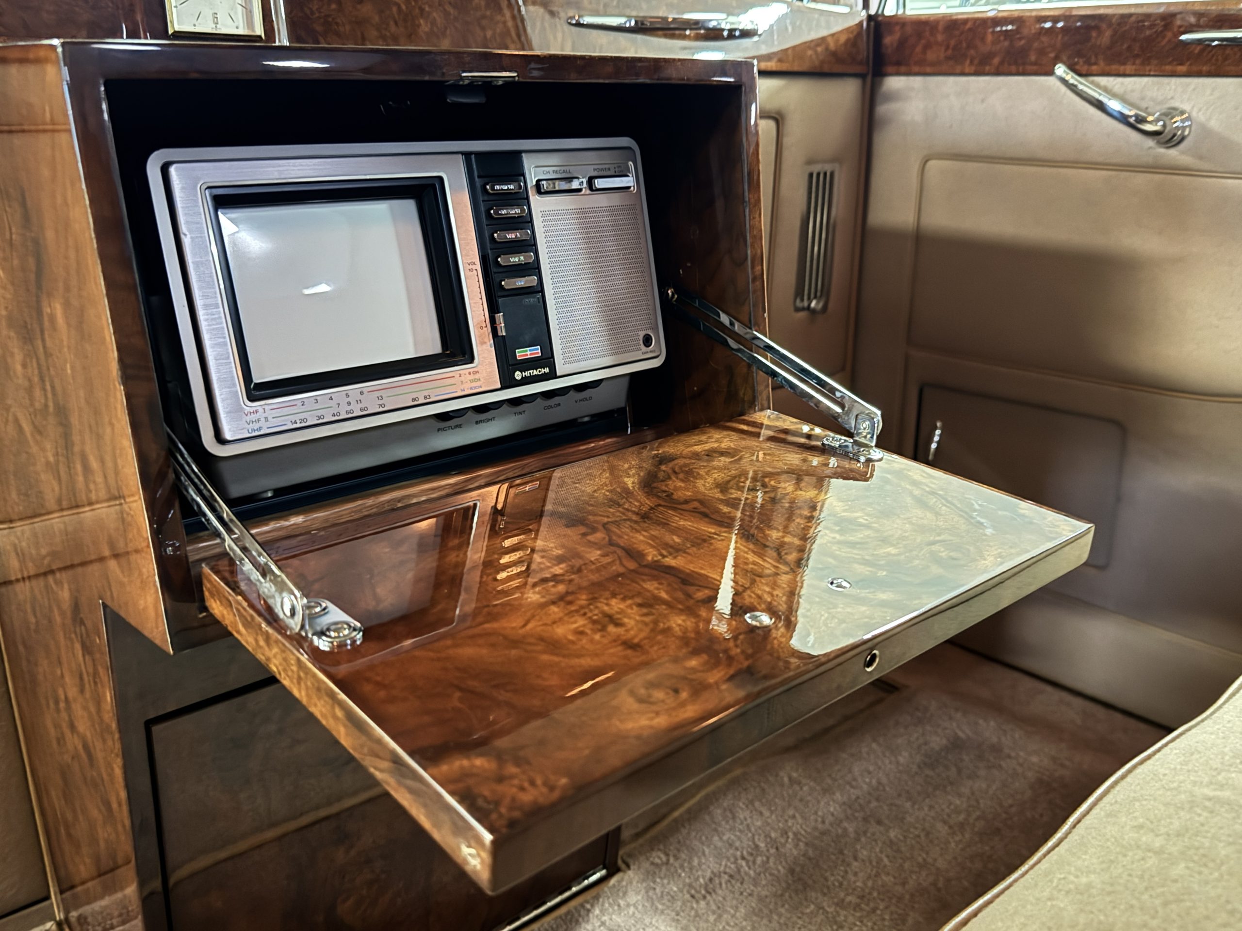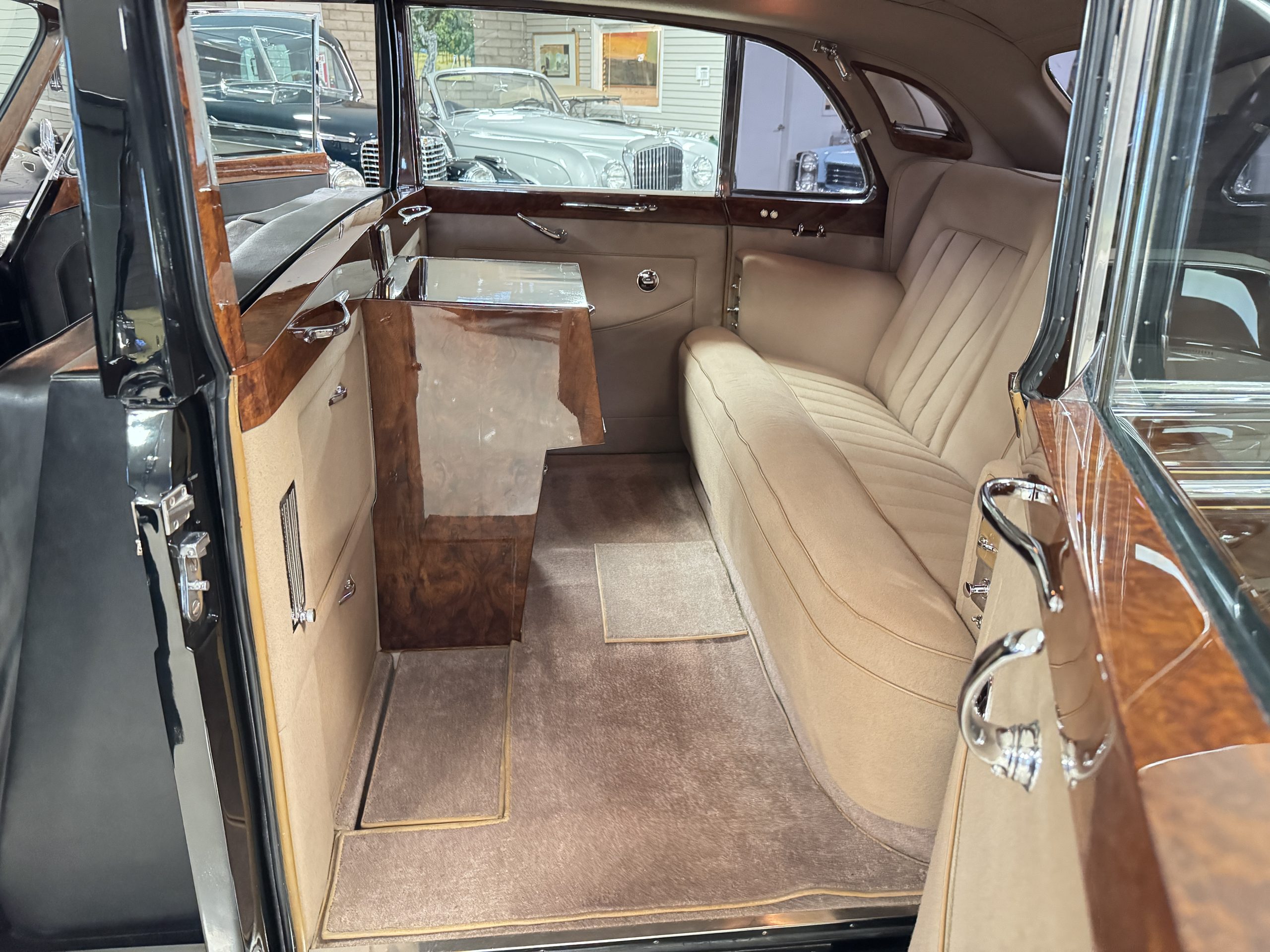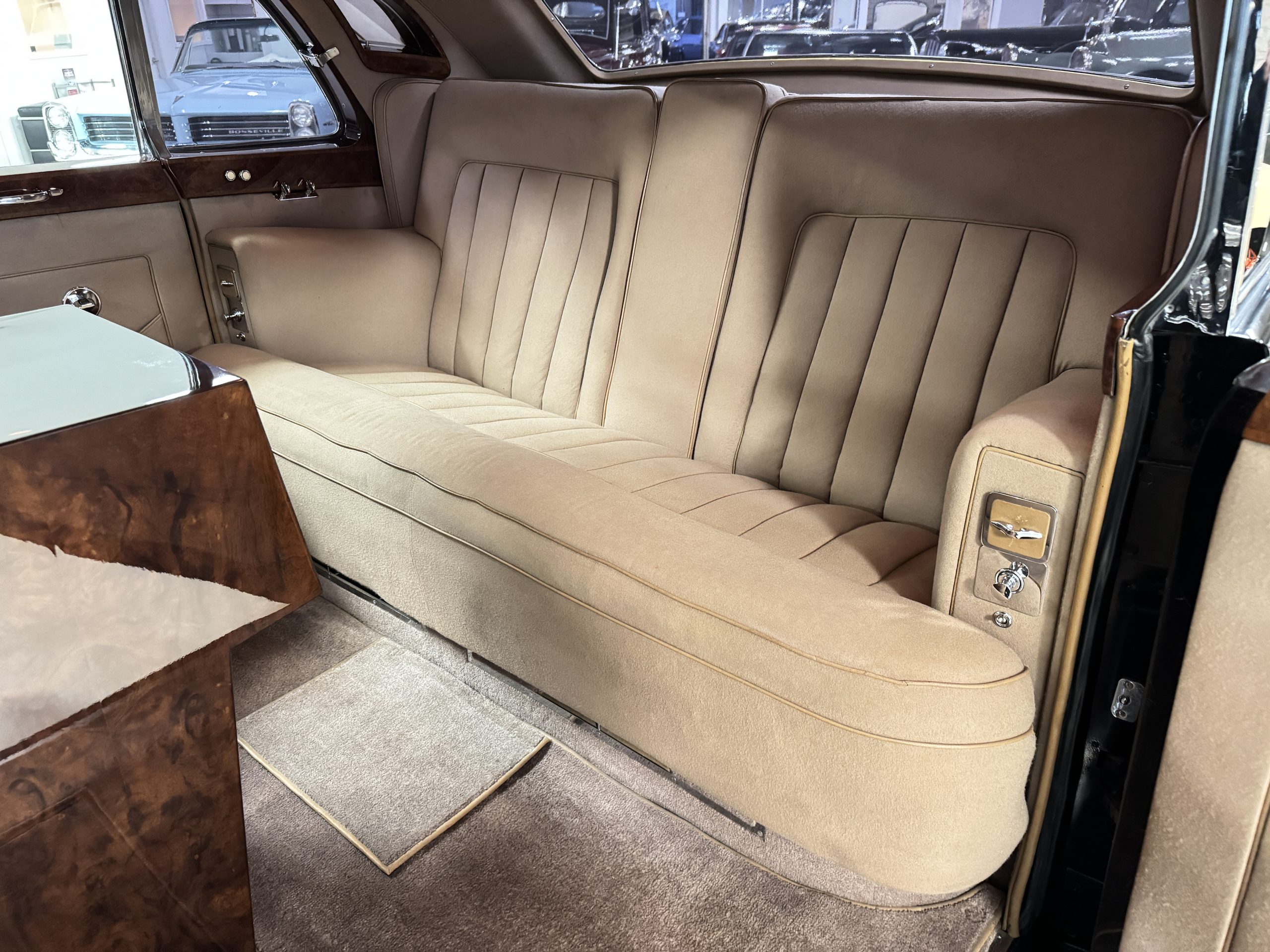 The interior is in overall beautiful condition.  All of the burl walnut trim has been painstakingly restored to showroom condition.  The chauffer’s compartment is finished in Black leather that is very soft and supple with normal creases with age.   The stereo has been updated with a more modern system.  The rear passenger compartment is all original tan wool broadcloth with complementary tan leather piping.  The upholstery is in excellent original condition with no soiling. The tan Wilton wool carpeting is also in very nice condition.  The center mirrored cocktail cabinet contains an original crystal decanter and two crystal glasses.  Above the cocktail cabinet is a separate compartment holding the Television.  Twin reading lamps, twin vanities and a Seth clock complete the amenities.  James Young coachbuilt Rolls-Royces always exhibit the most extraordinary book matched burlwood finishes.  This example, being built for their Earls Court exhibition, is just gorgeous.