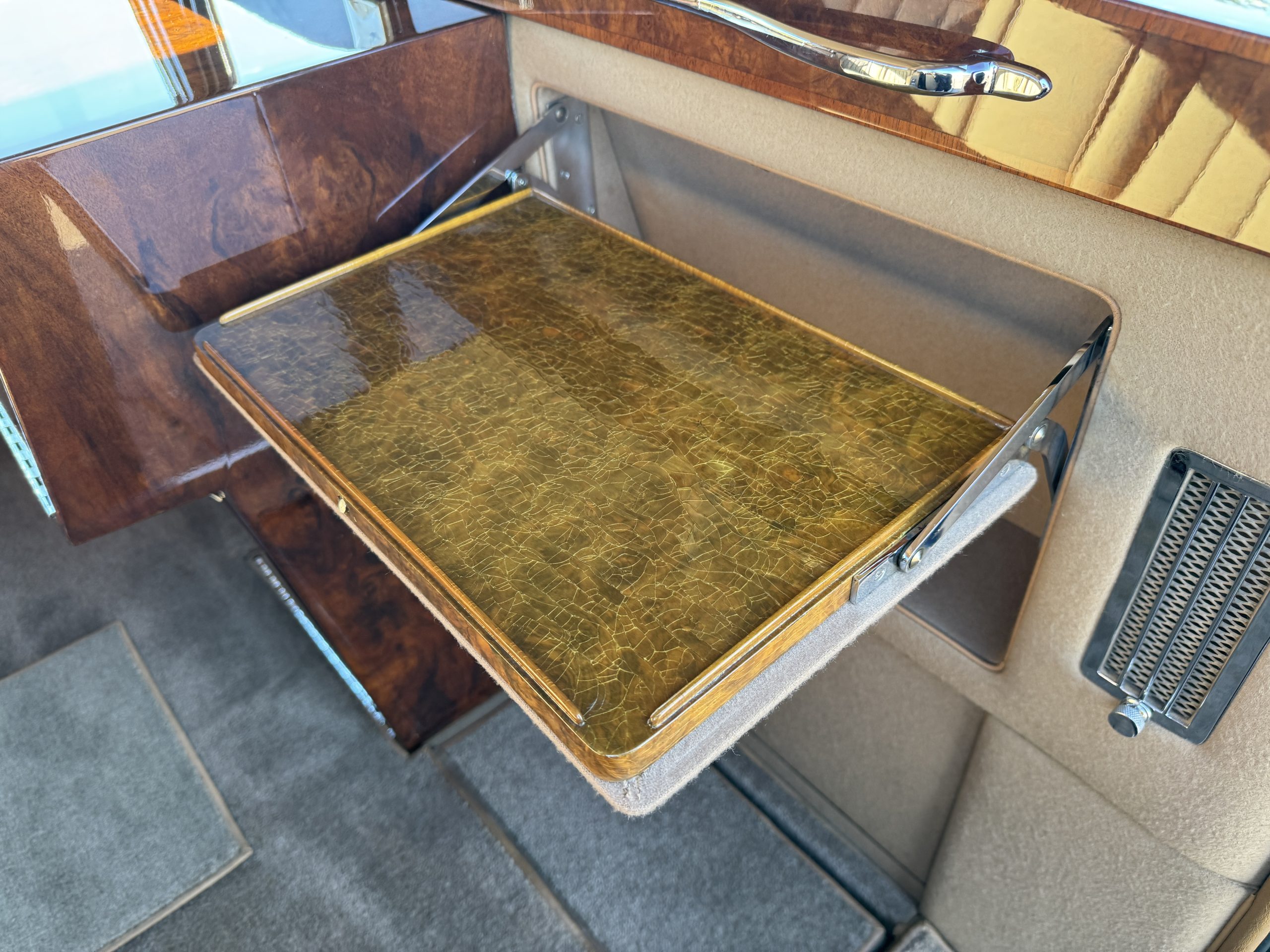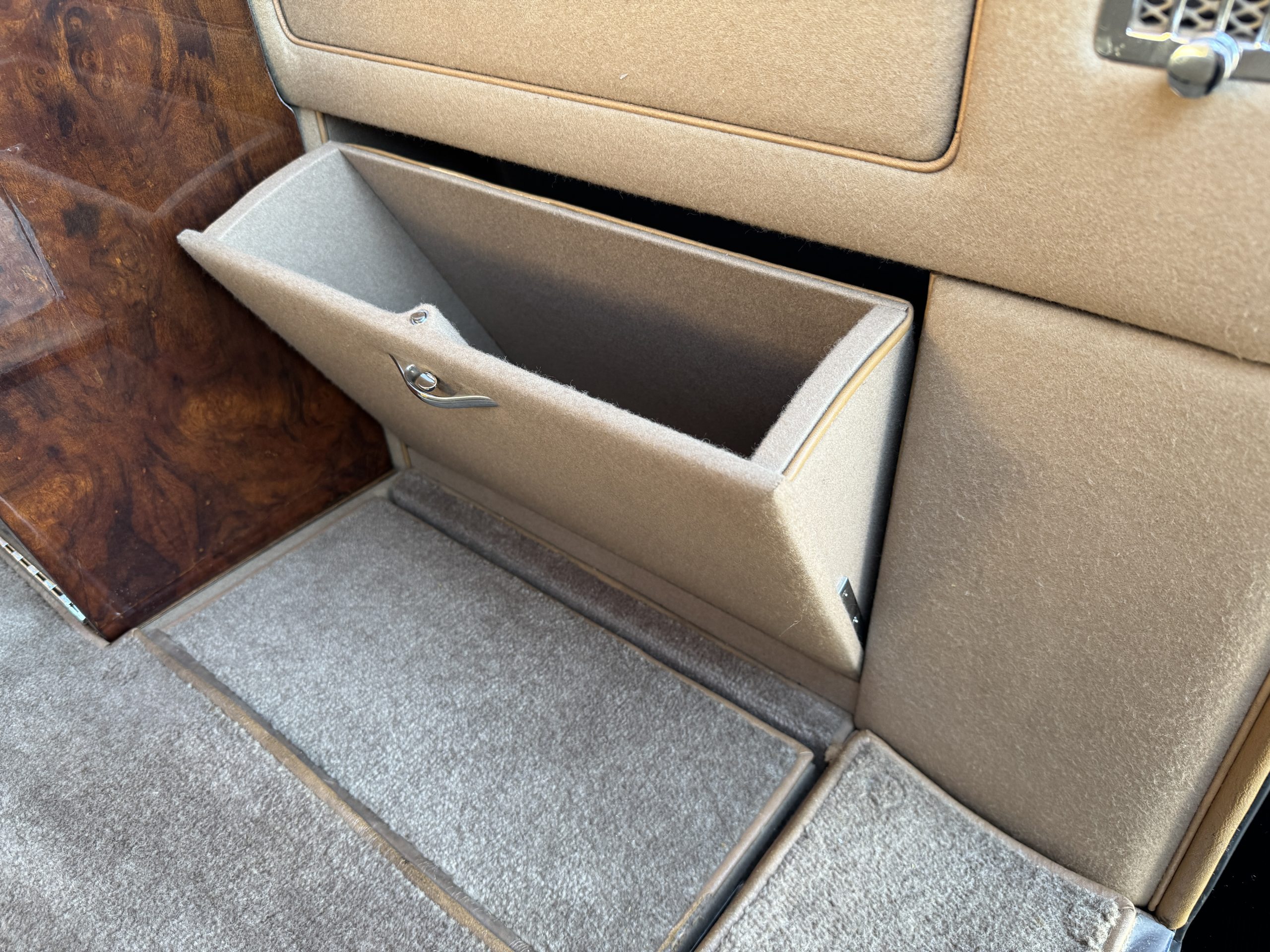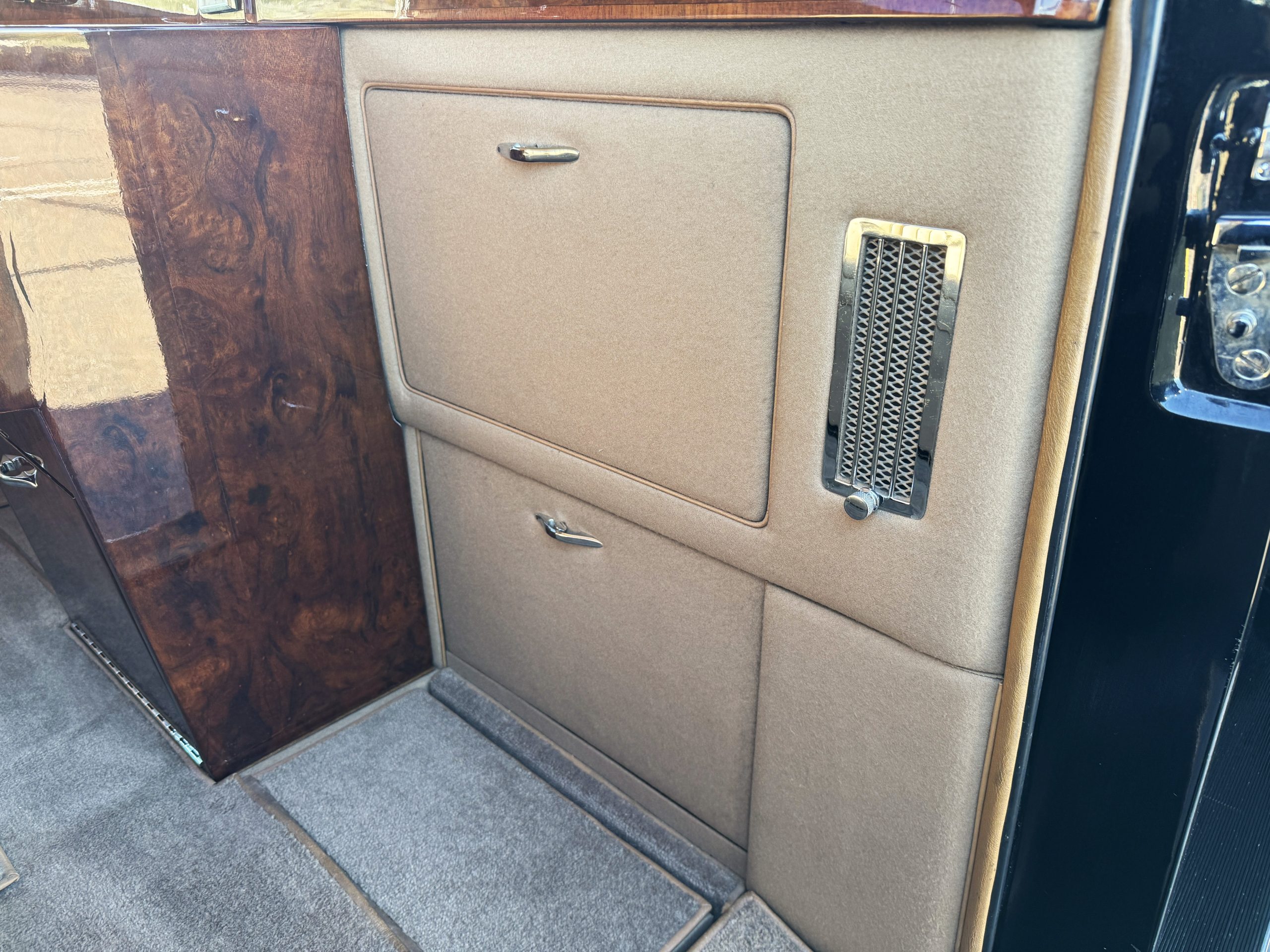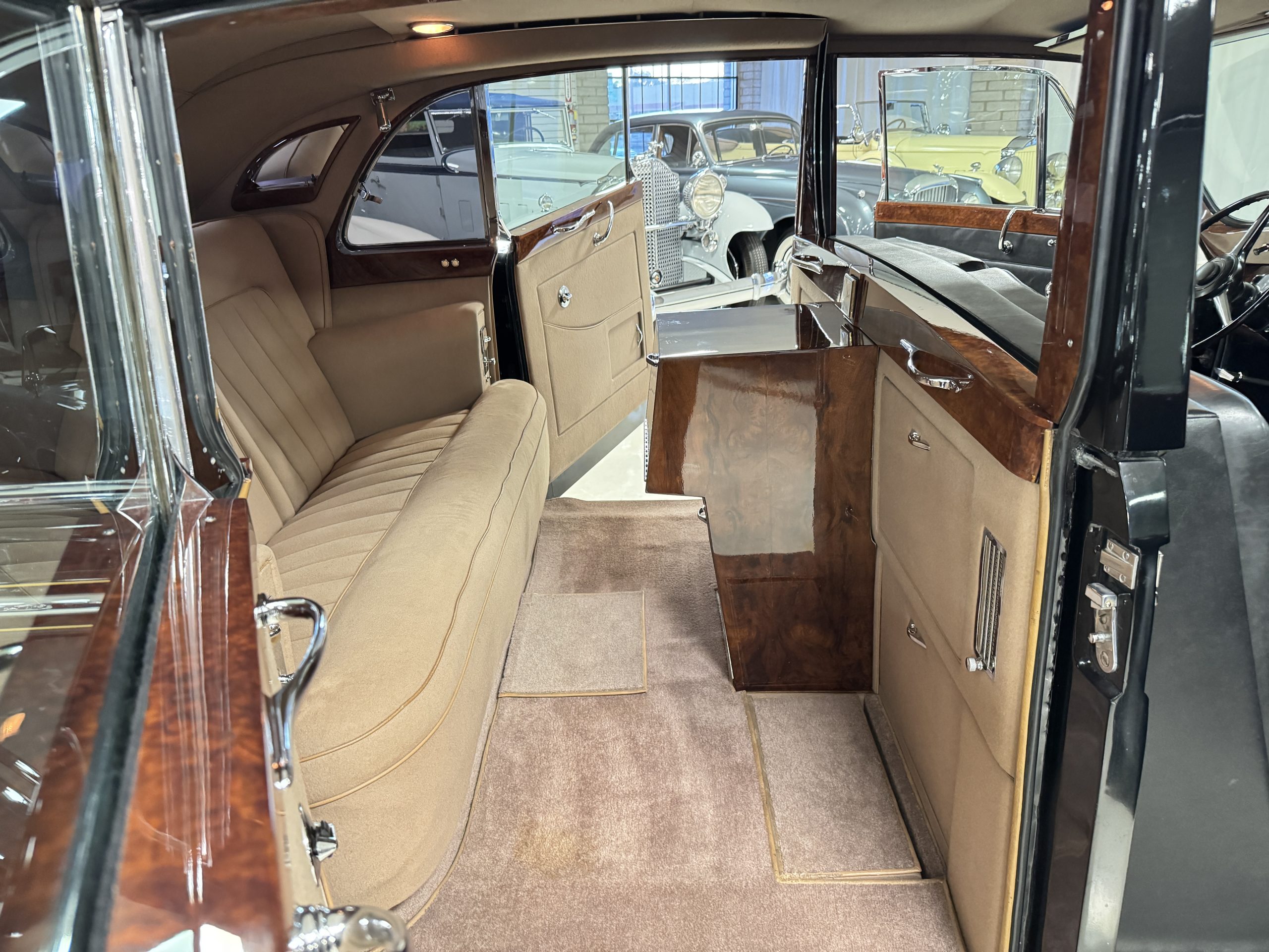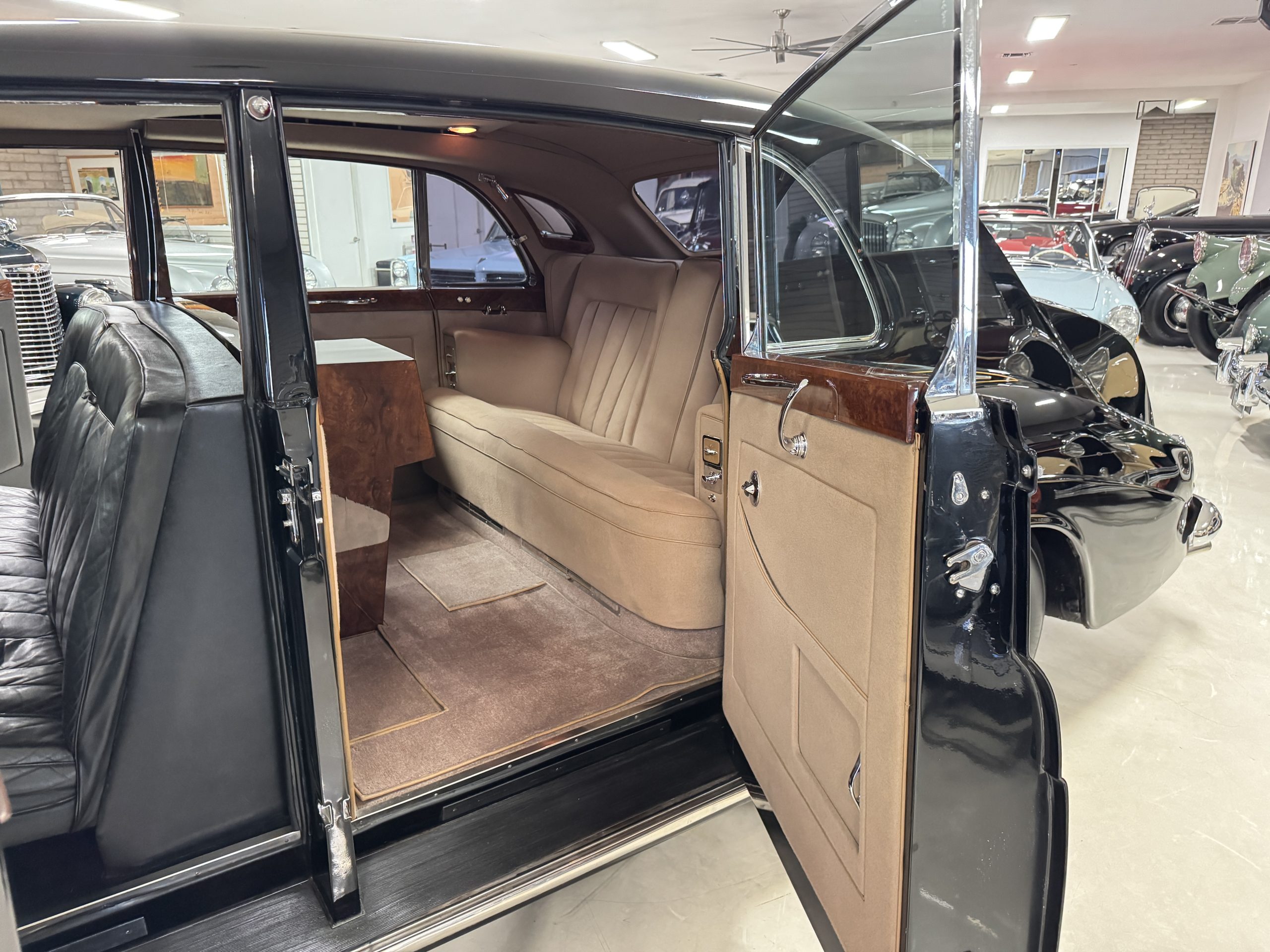 The interior is in overall beautiful condition.  All of the burl walnut trim has been painstakingly restored to showroom condition.  The chauffer’s compartment is finished in Black leather that is very soft and supple with normal creases with age.   The stereo has been updated with a more modern system.  The rear passenger compartment is all original tan wool broadcloth with complementary tan leather piping.  The upholstery is in excellent original condition with no soiling. The tan Wilton wool carpeting is also in very nice condition.  The center mirrored cocktail cabinet contains an original crystal decanter and two crystal glasses.  Above the cocktail cabinet is a separate compartment holding the Television.  Twin reading lamps, twin vanities and a Seth clock complete the amenities.  James Young coachbuilt Rolls-Royces always exhibit the most extraordinary book matched burlwood finishes.  This example, being built for their Earls Court exhibition, is just gorgeous.