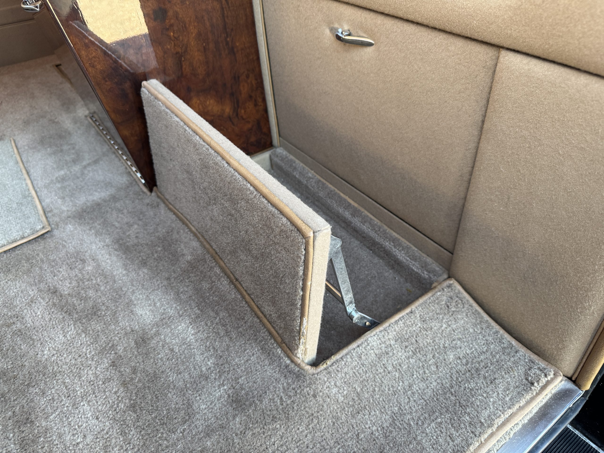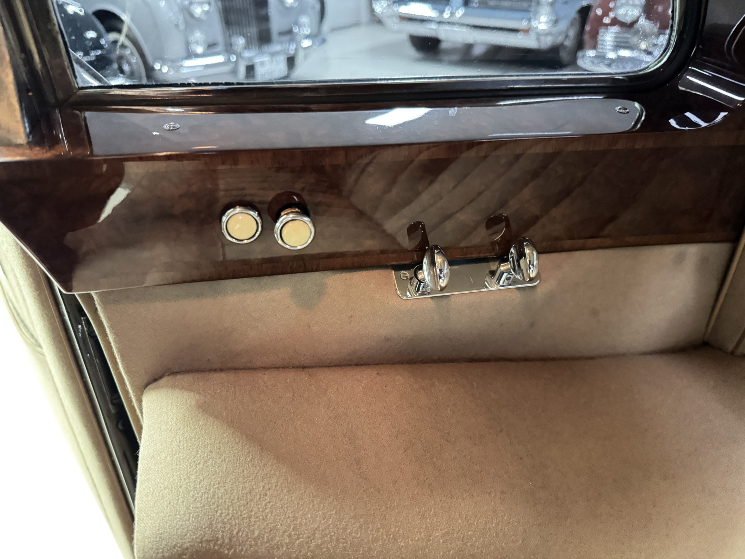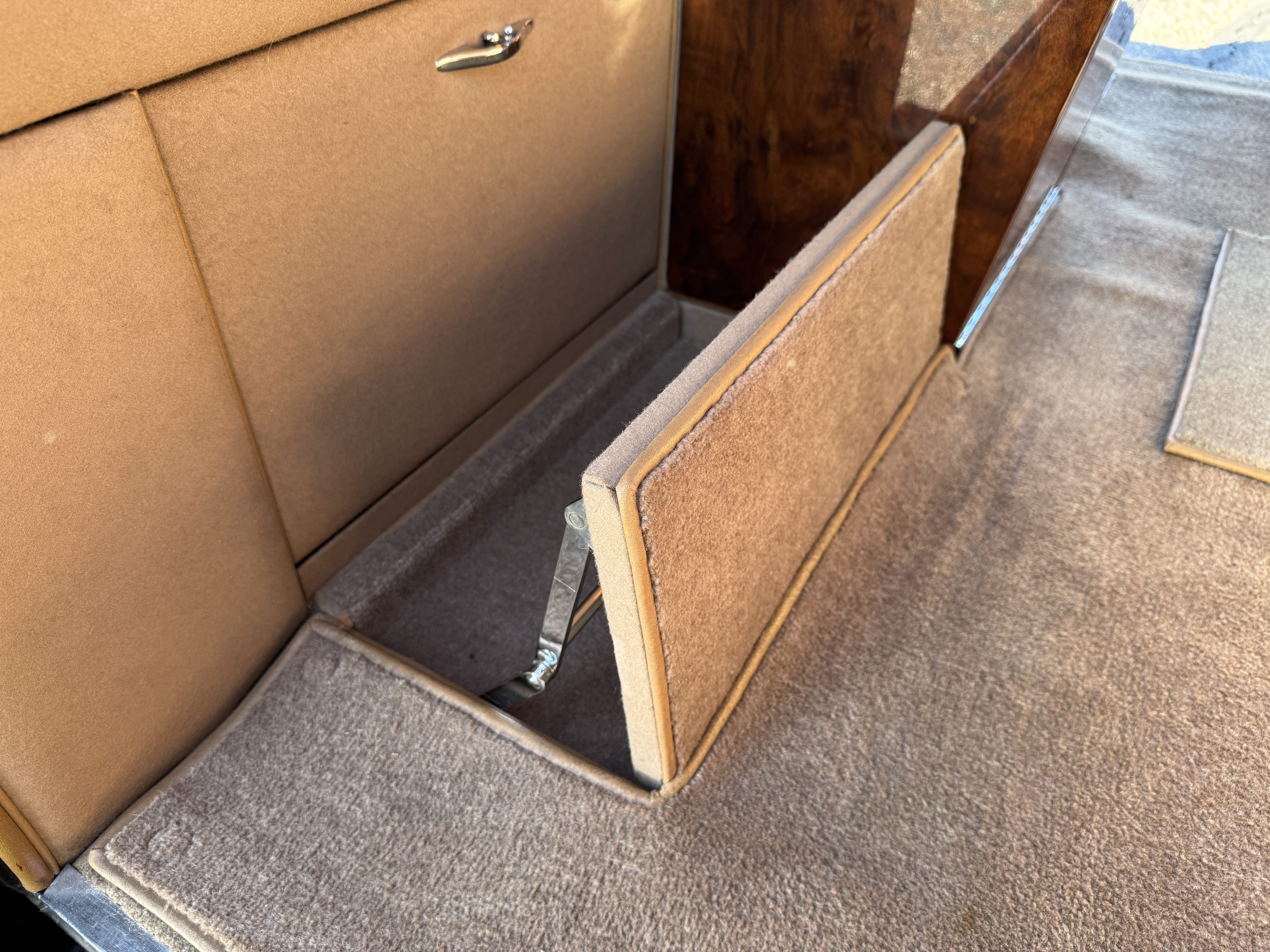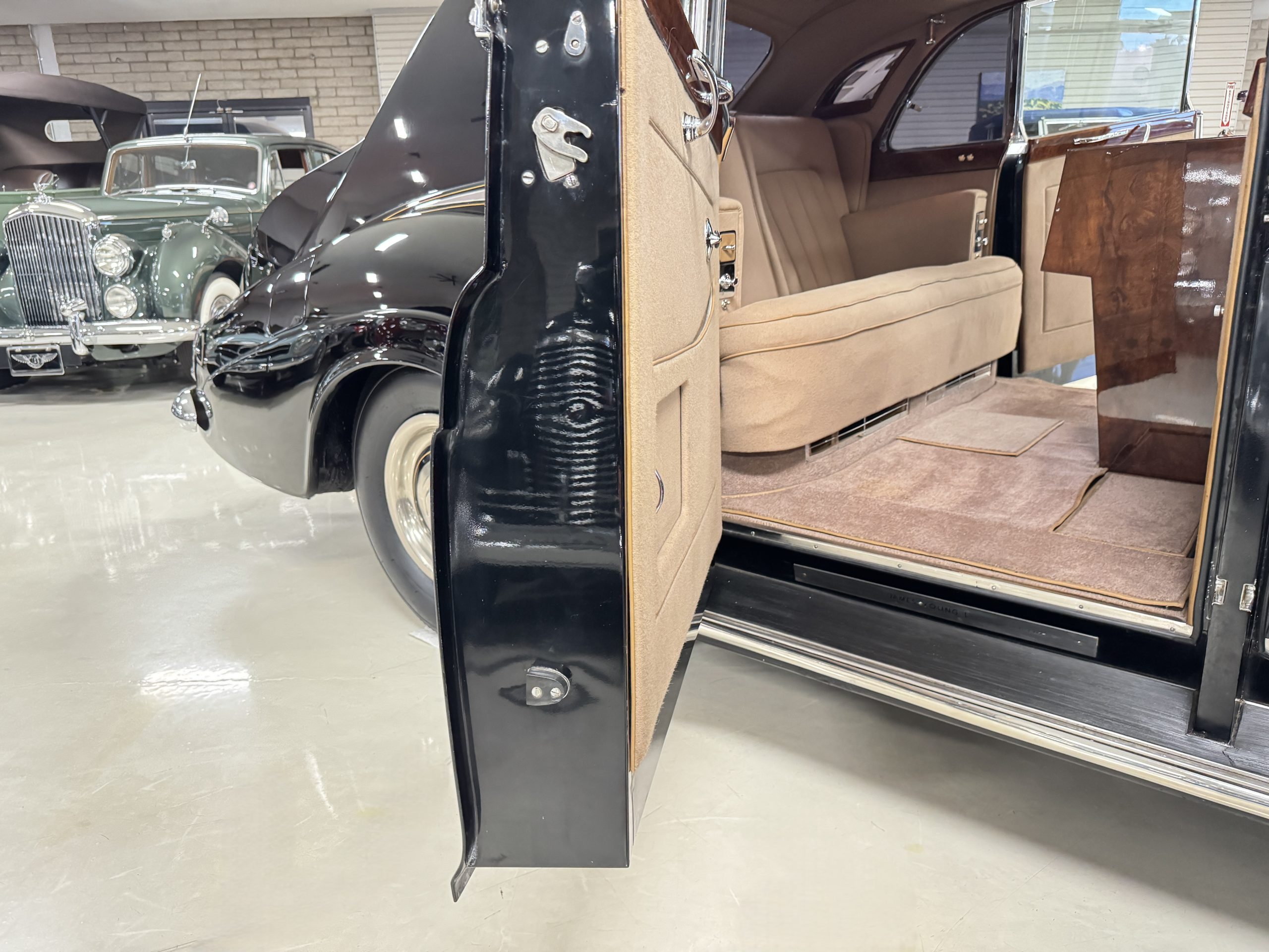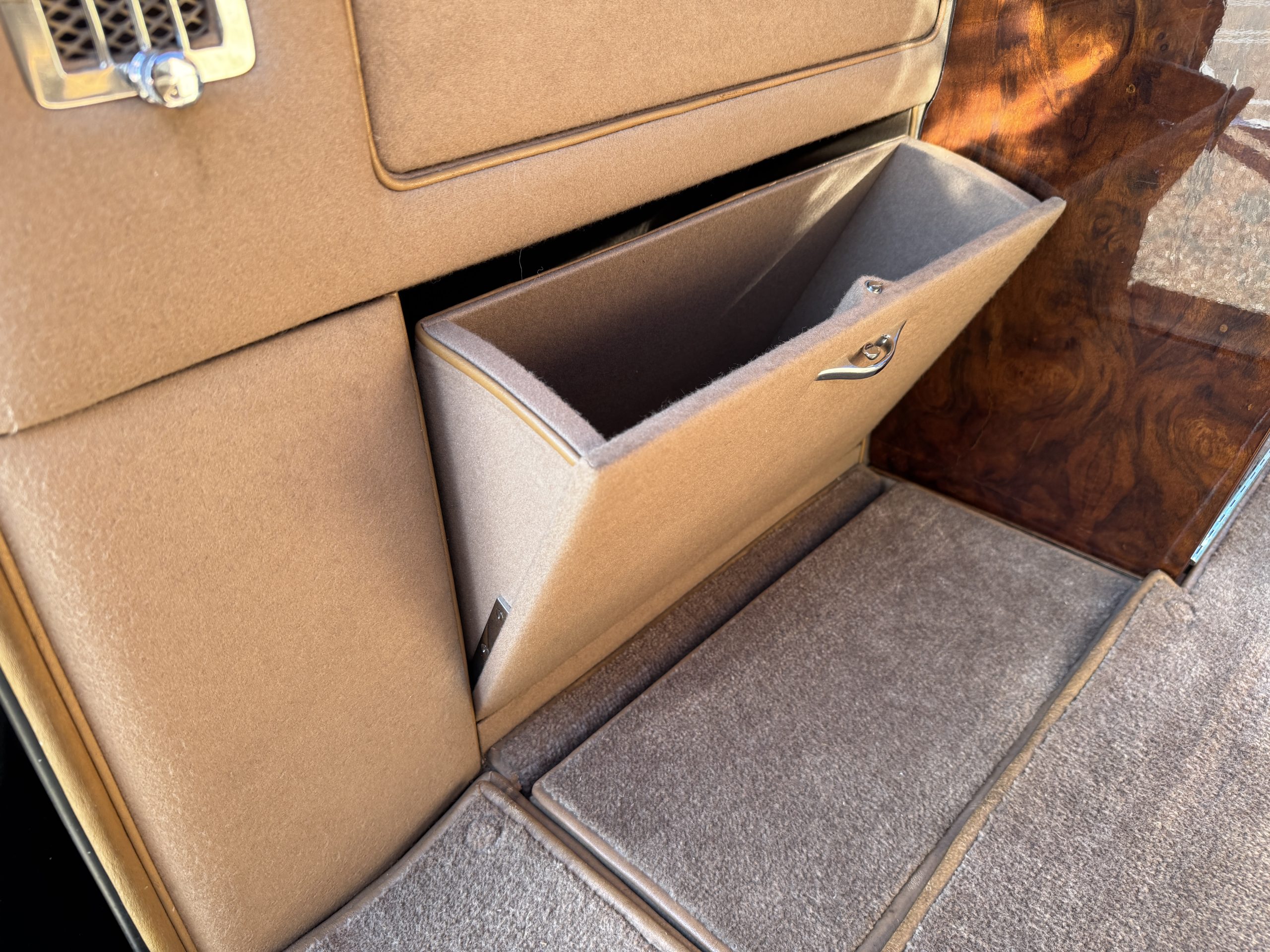 The interior is in overall beautiful condition.  All of the burl walnut trim has been painstakingly restored to showroom condition.  The chauffer’s compartment is finished in Black leather that is very soft and supple with normal creases with age.   The stereo has been updated with a more modern system.  The rear passenger compartment is all original tan wool broadcloth with complementary tan leather piping.  The upholstery is in excellent original condition with no soiling. The tan Wilton wool carpeting is also in very nice condition.  The center mirrored cocktail cabinet contains an original crystal decanter and two crystal glasses.  Above the cocktail cabinet is a separate compartment holding the Television.  Twin reading lamps, twin vanities and a Seth clock complete the amenities.  James Young coachbuilt Rolls-Royces always exhibit the most extraordinary book matched burlwood finishes.  This example, being built for their Earls Court exhibition, is just gorgeous.