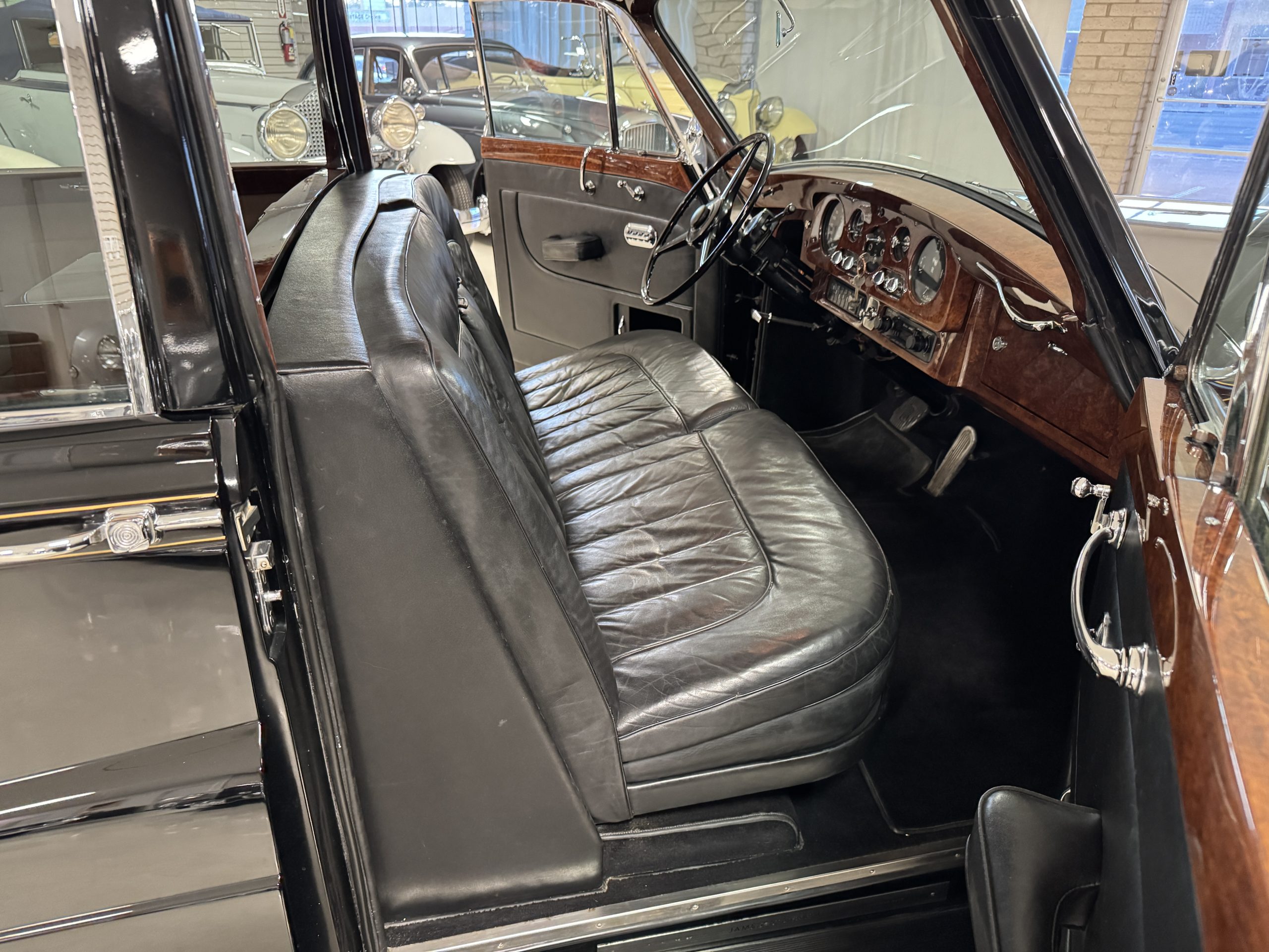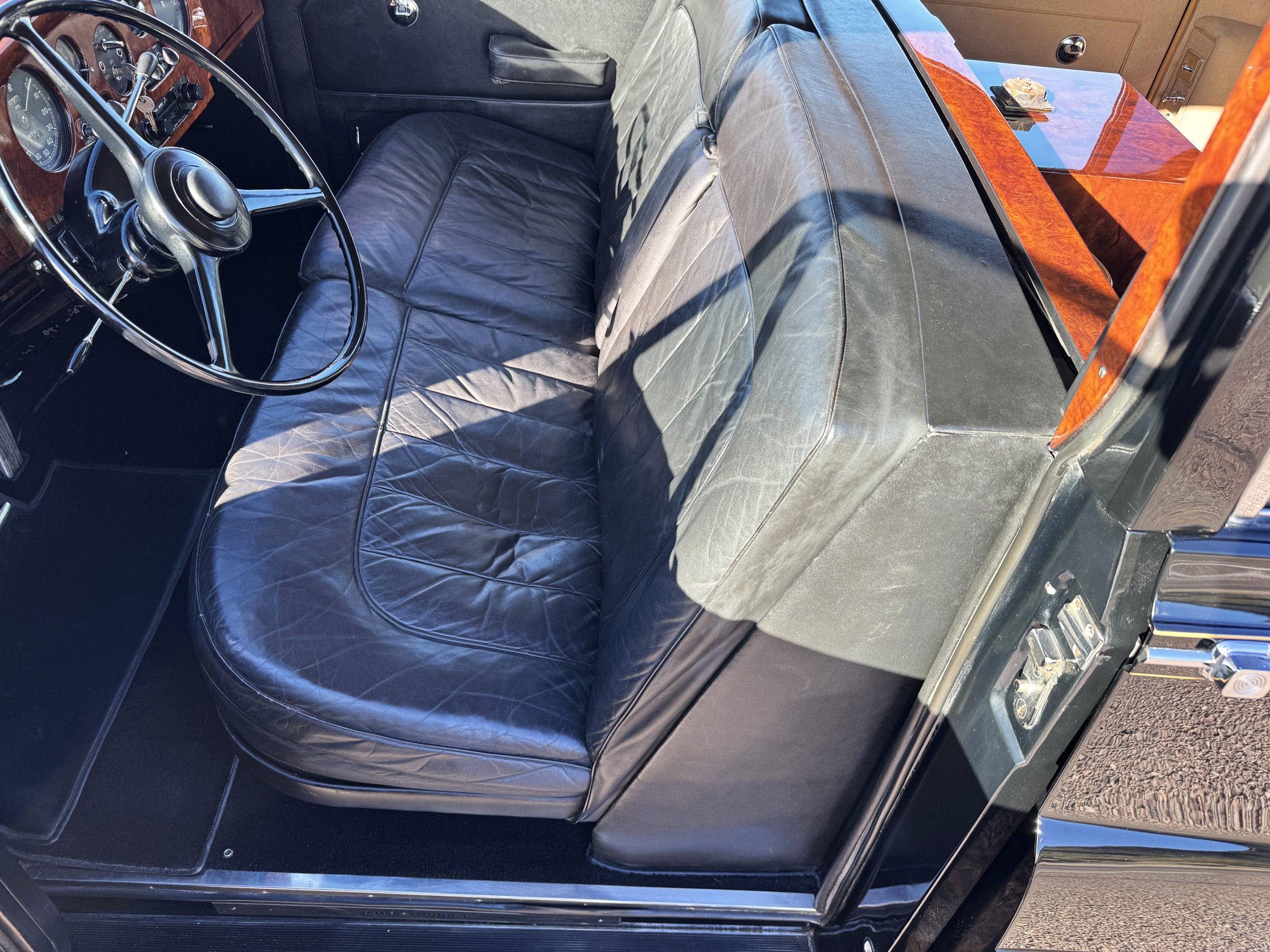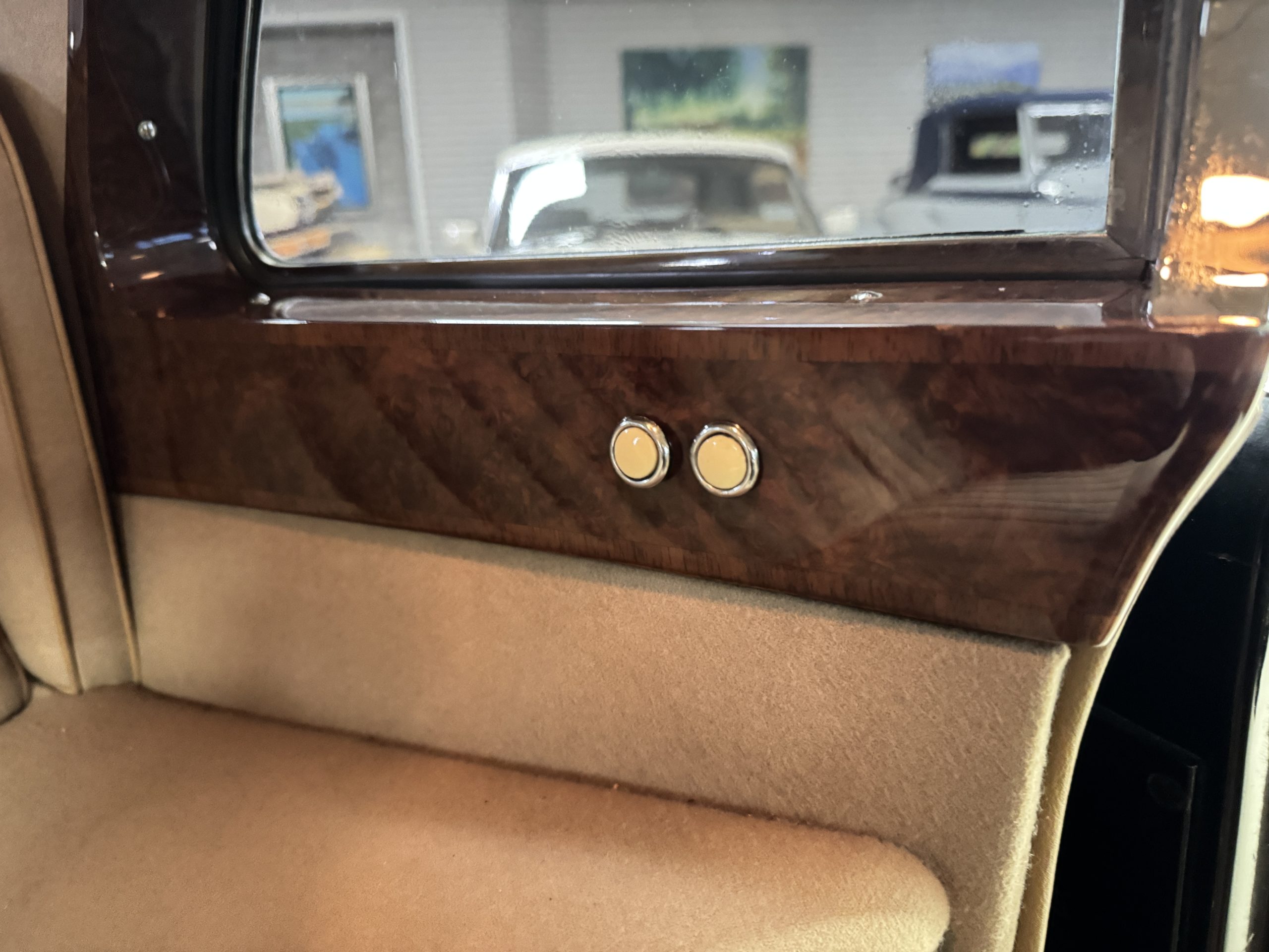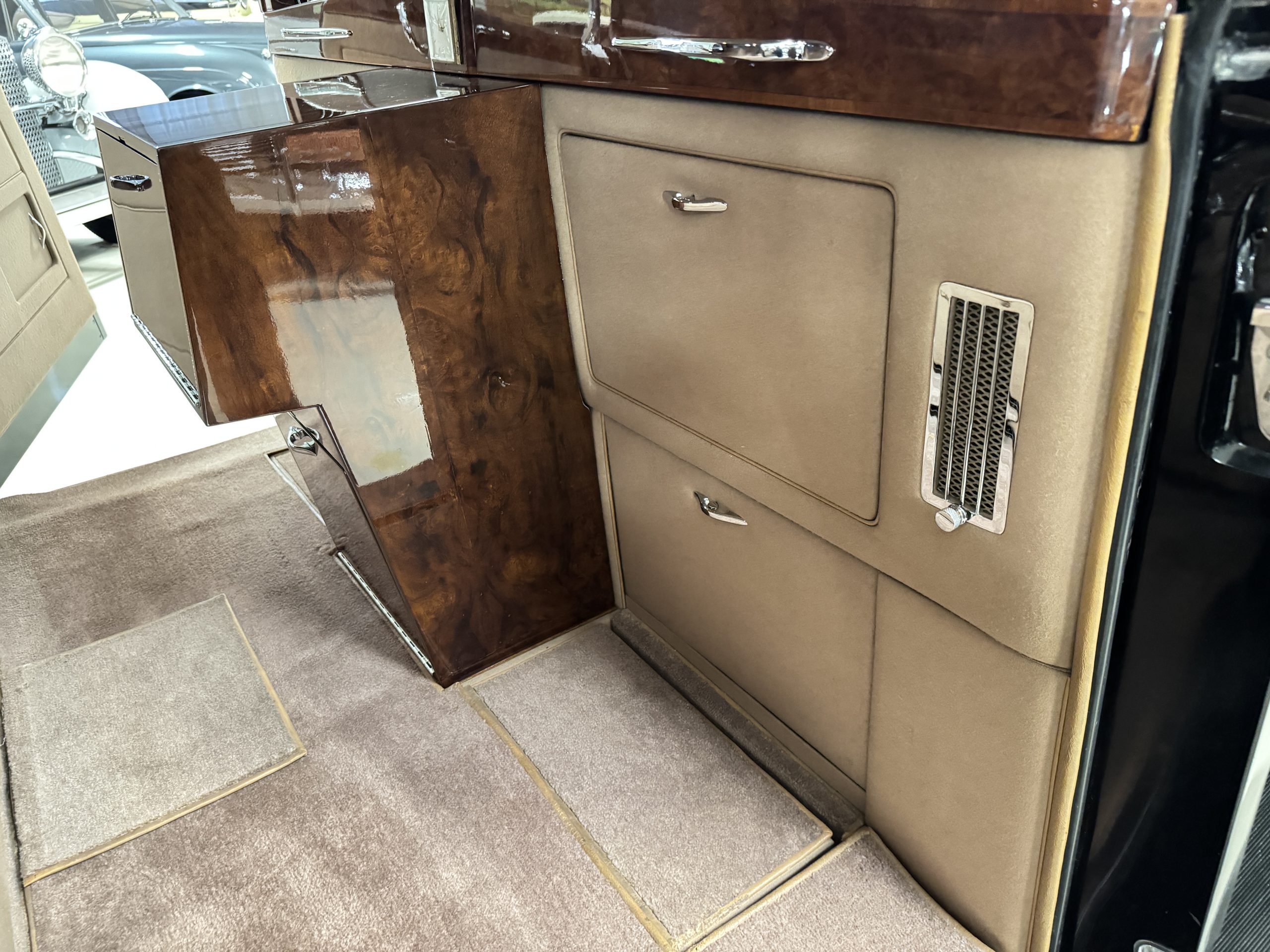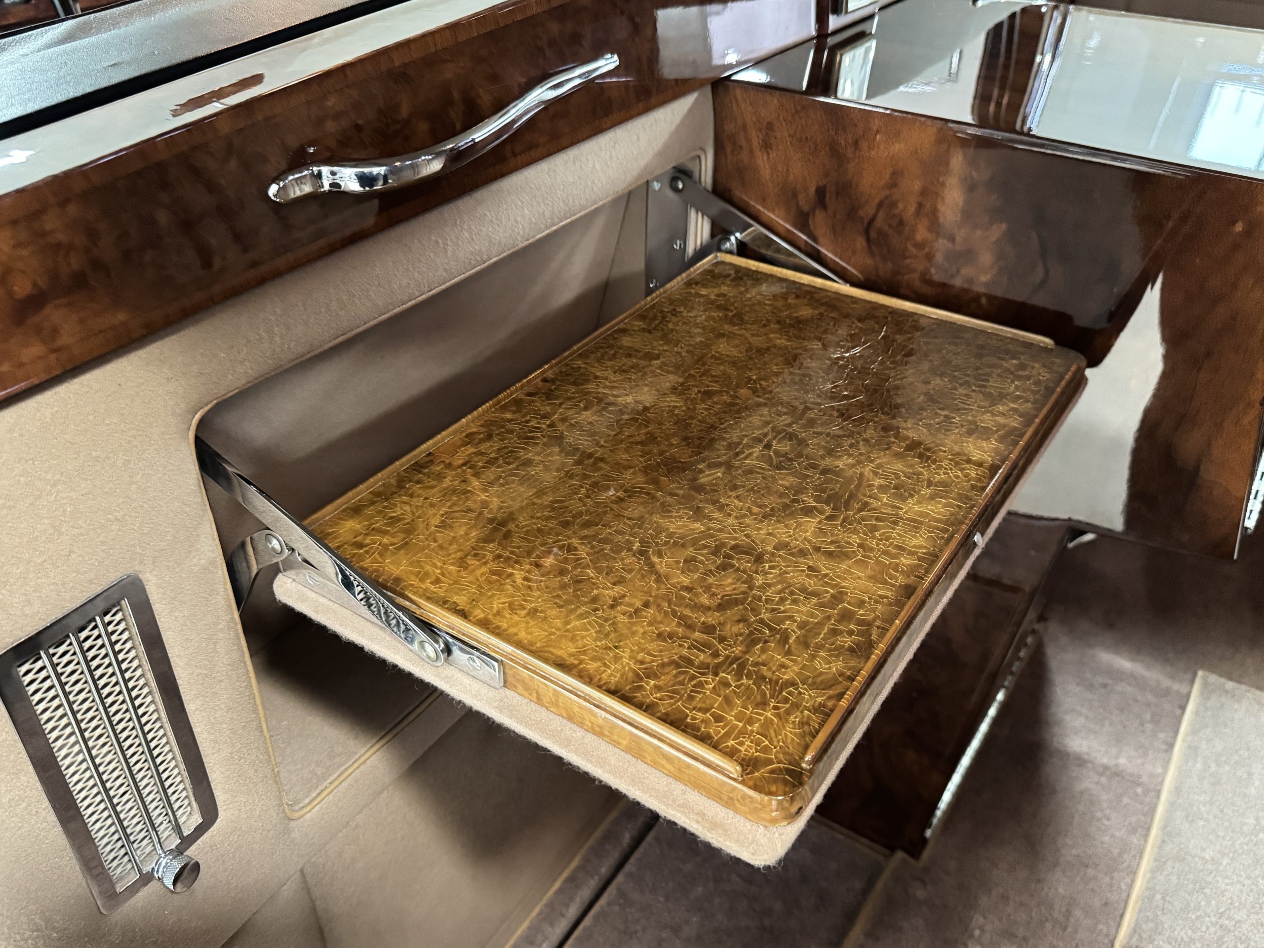 The interior is in overall beautiful condition.  All of the burl walnut trim has been painstakingly restored to showroom condition.  The chauffer’s compartment is finished in Black leather that is very soft and supple with normal creases with age.   The stereo has been updated with a more modern system.  The rear passenger compartment is all original tan wool broadcloth with complementary tan leather piping.  The upholstery is in excellent original condition with no soiling. The tan Wilton wool carpeting is also in very nice condition.  The center mirrored cocktail cabinet contains an original crystal decanter and two crystal glasses.  Above the cocktail cabinet is a separate compartment holding the Television.  Twin reading lamps, twin vanities and a Seth clock complete the amenities.  James Young coachbuilt Rolls-Royces always exhibit the most extraordinary book matched burlwood finishes.  This example, being built for their Earls Court exhibition, is just gorgeous.