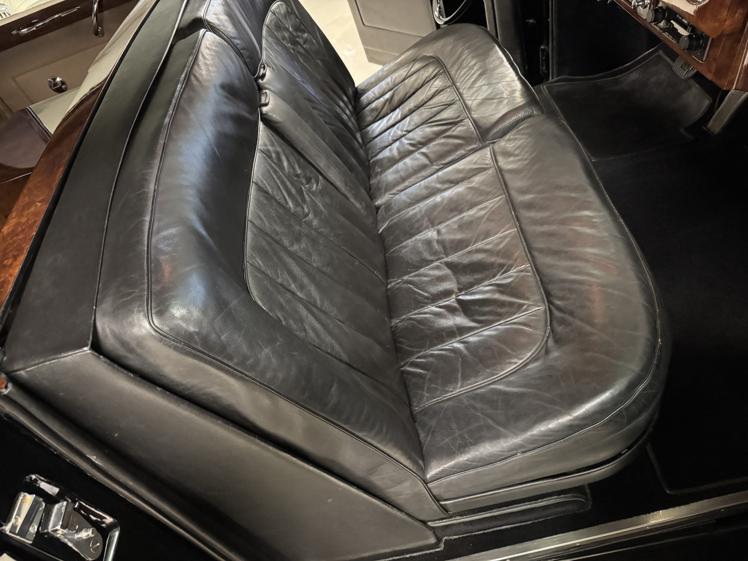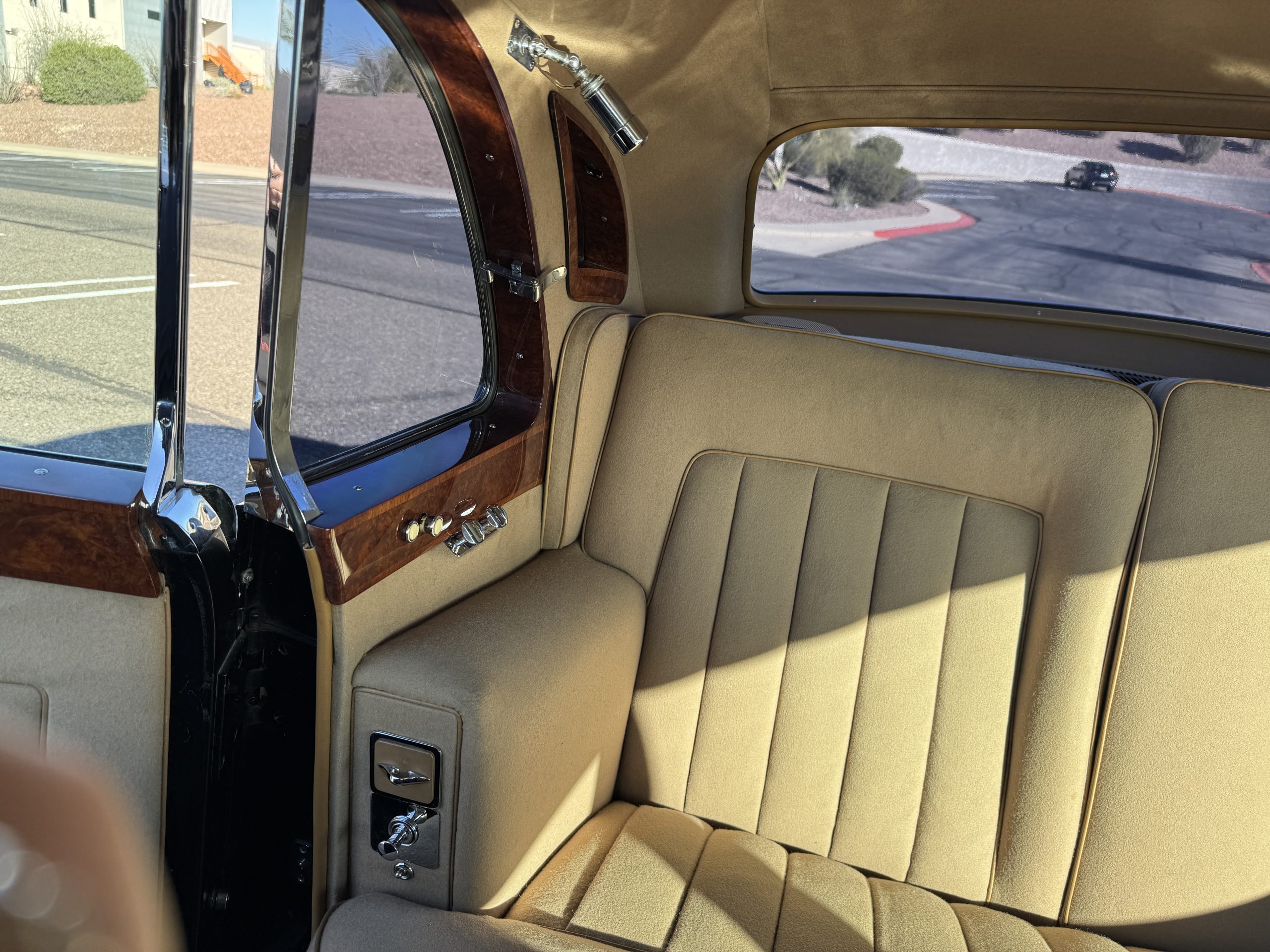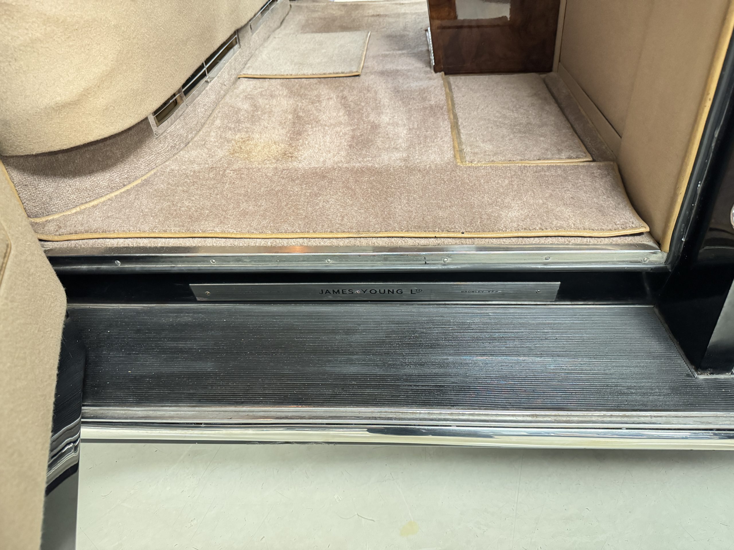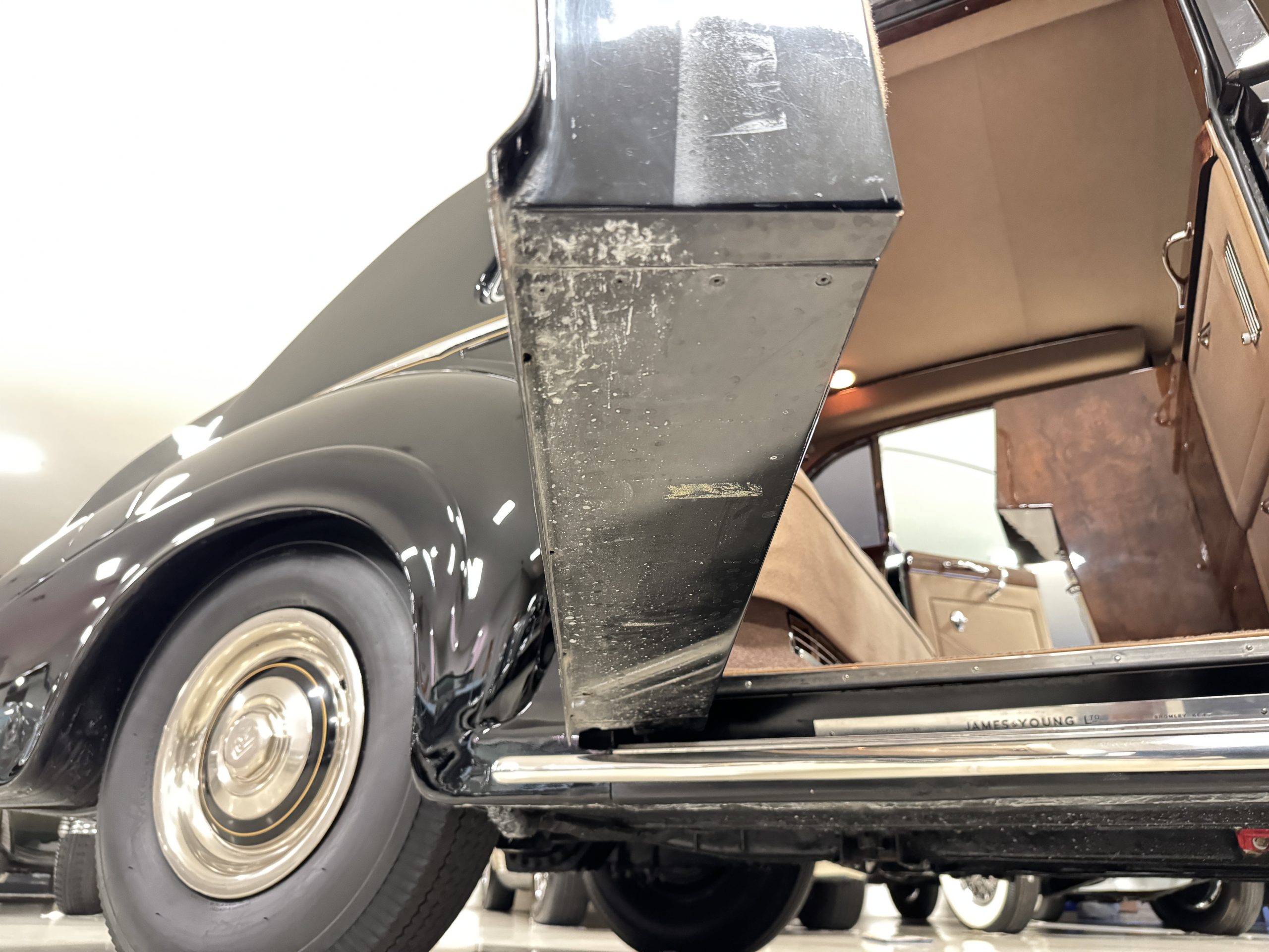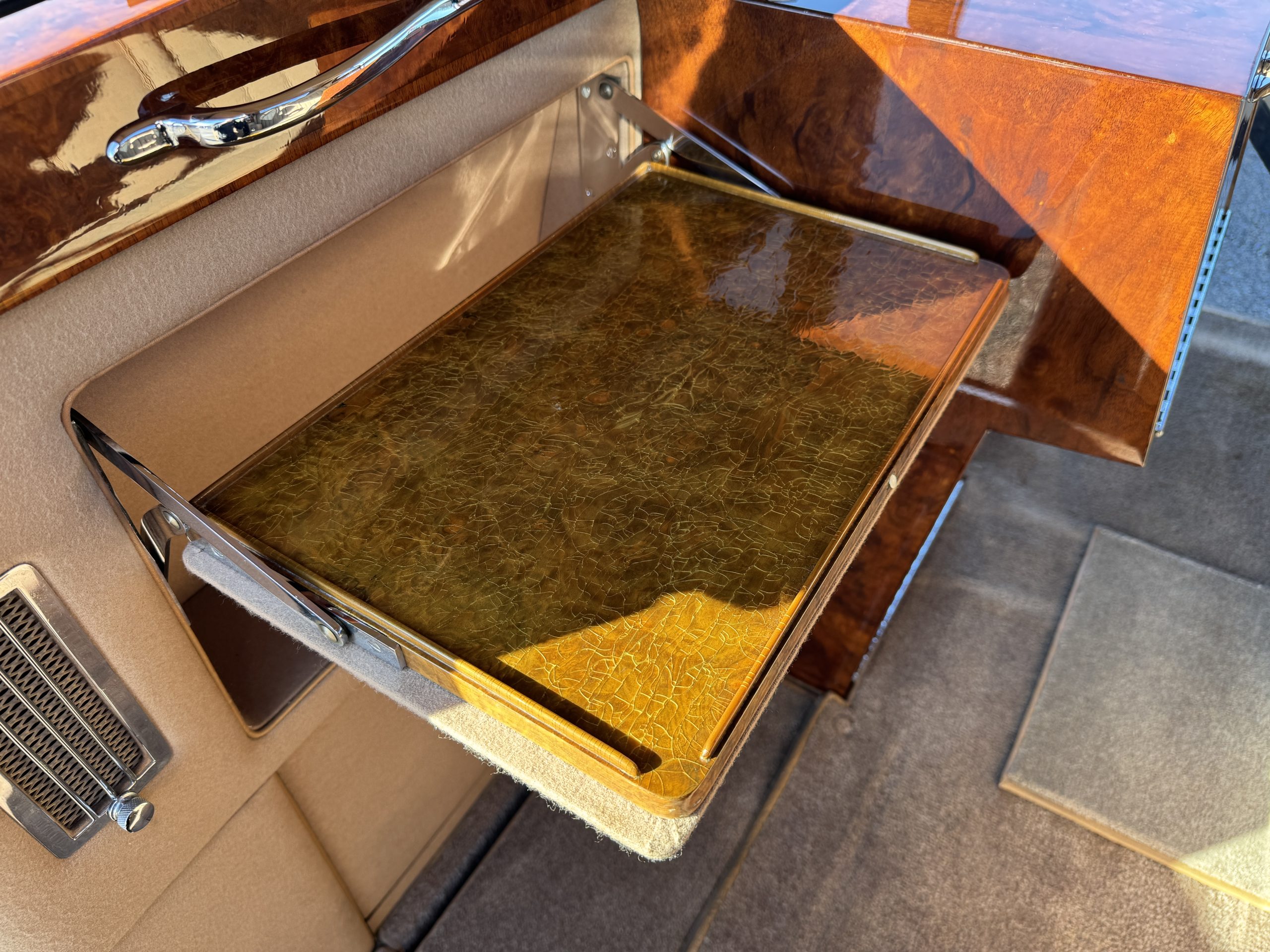 The interior is in overall beautiful condition.  All of the burl walnut trim has been painstakingly restored to showroom condition.  The chauffer’s compartment is finished in Black leather that is very soft and supple with normal creases with age.   The stereo has been updated with a more modern system.  The rear passenger compartment is all original tan wool broadcloth with complementary tan leather piping.  The upholstery is in excellent original condition with no soiling. The tan Wilton wool carpeting is also in very nice condition.  The center mirrored cocktail cabinet contains an original crystal decanter and two crystal glasses.  Above the cocktail cabinet is a separate compartment holding the Television.  Twin reading lamps, twin vanities and a Seth clock complete the amenities.  James Young coachbuilt Rolls-Royces always exhibit the most extraordinary book matched burlwood finishes.  This example, being built for their Earls Court exhibition, is just gorgeous.